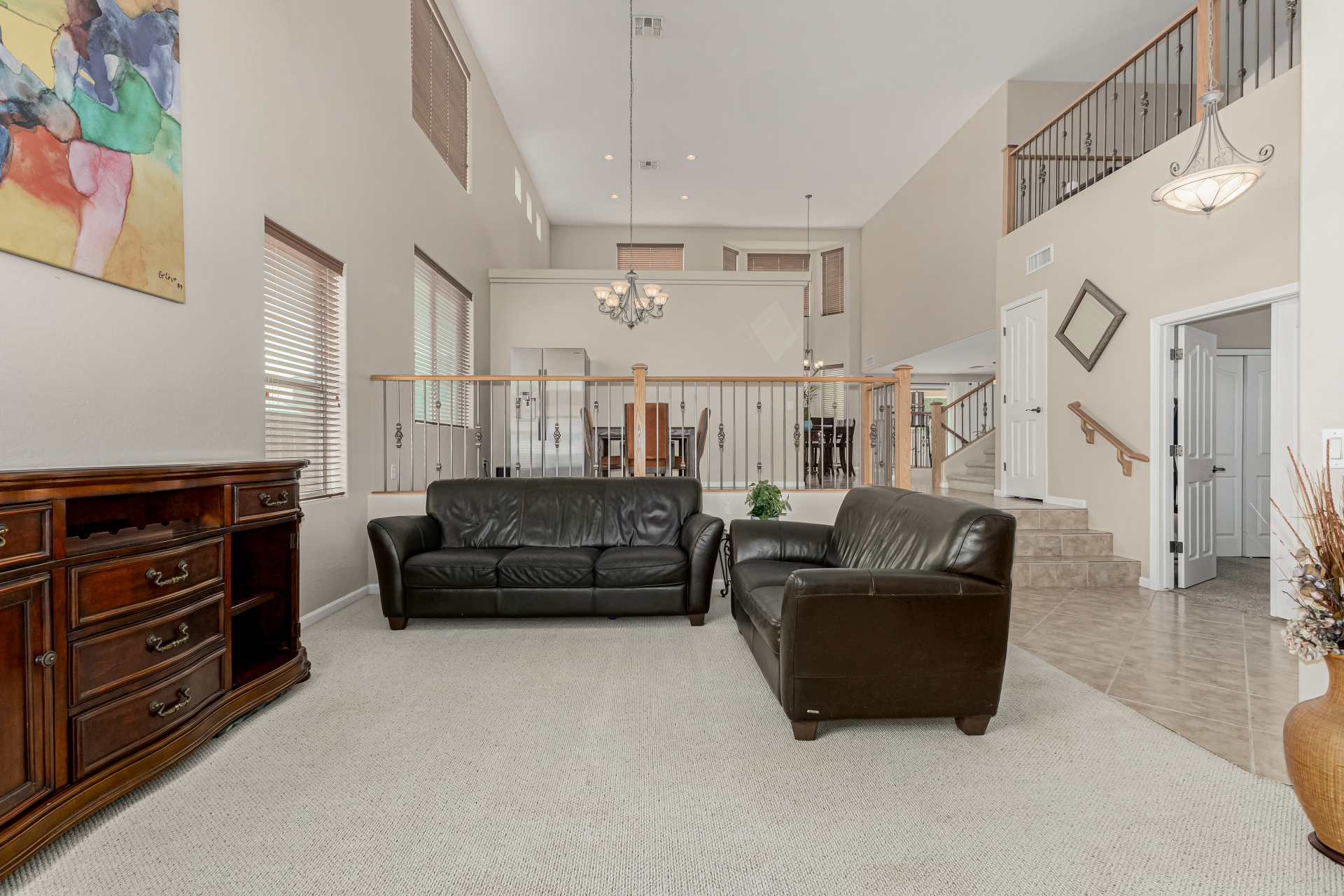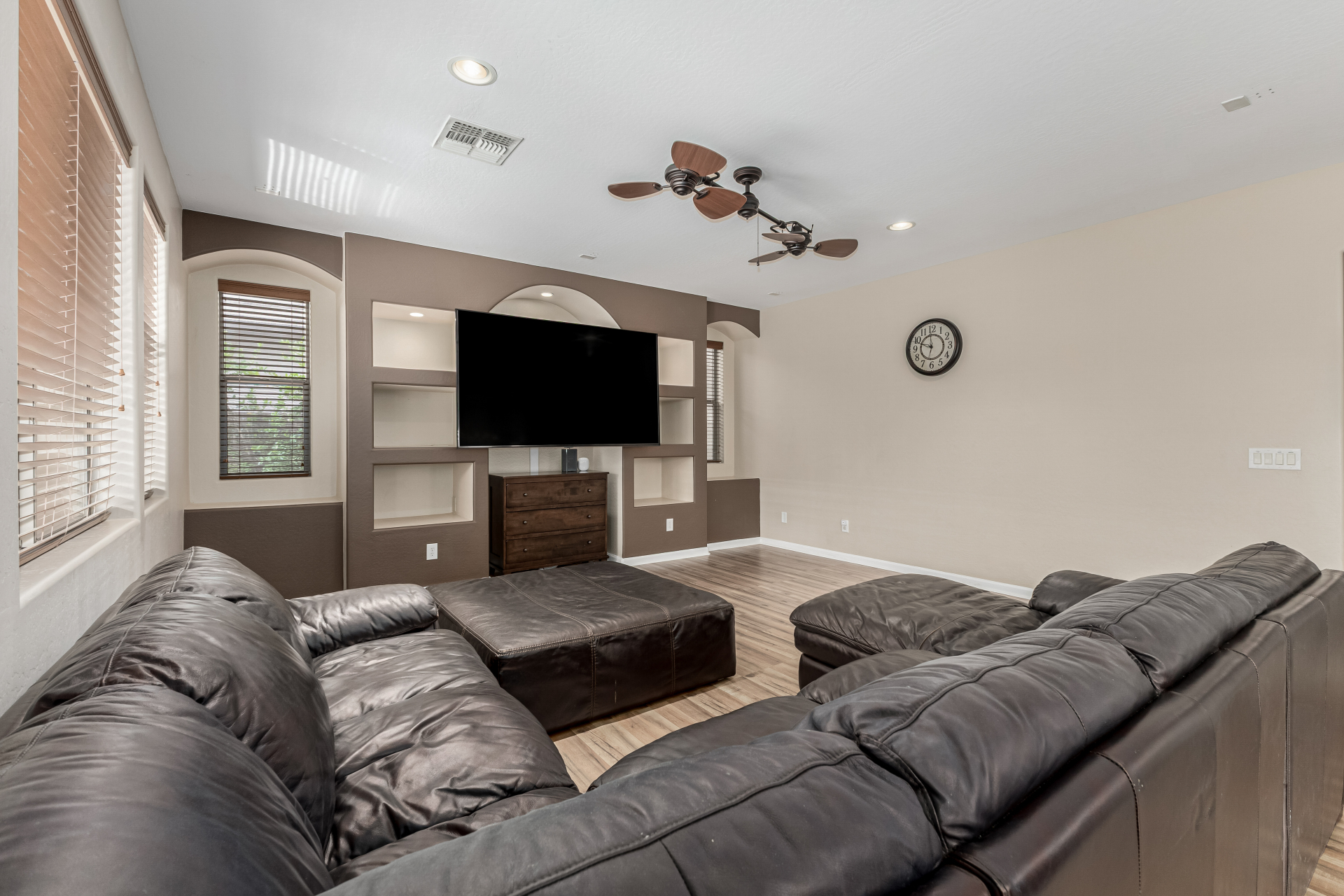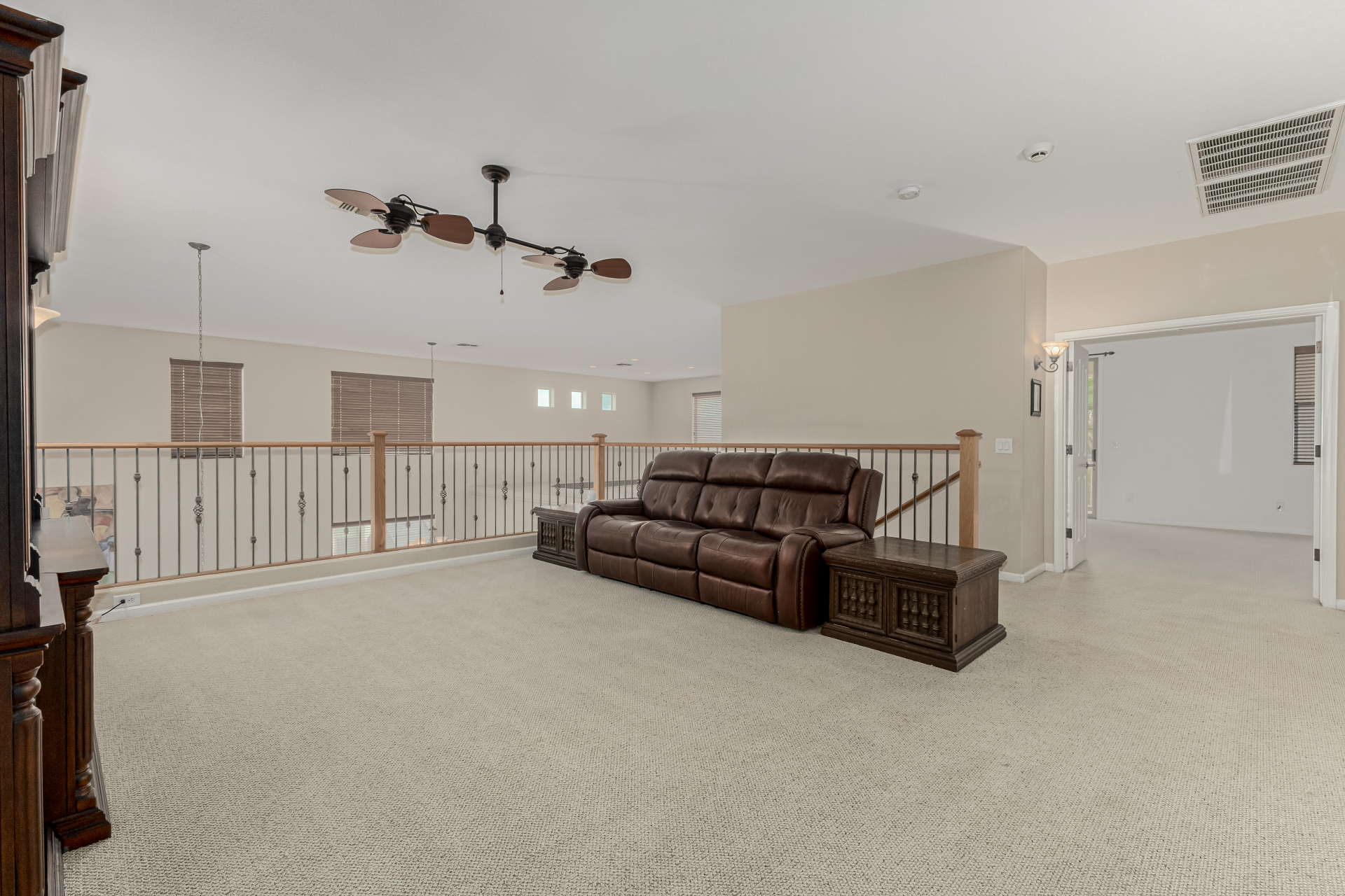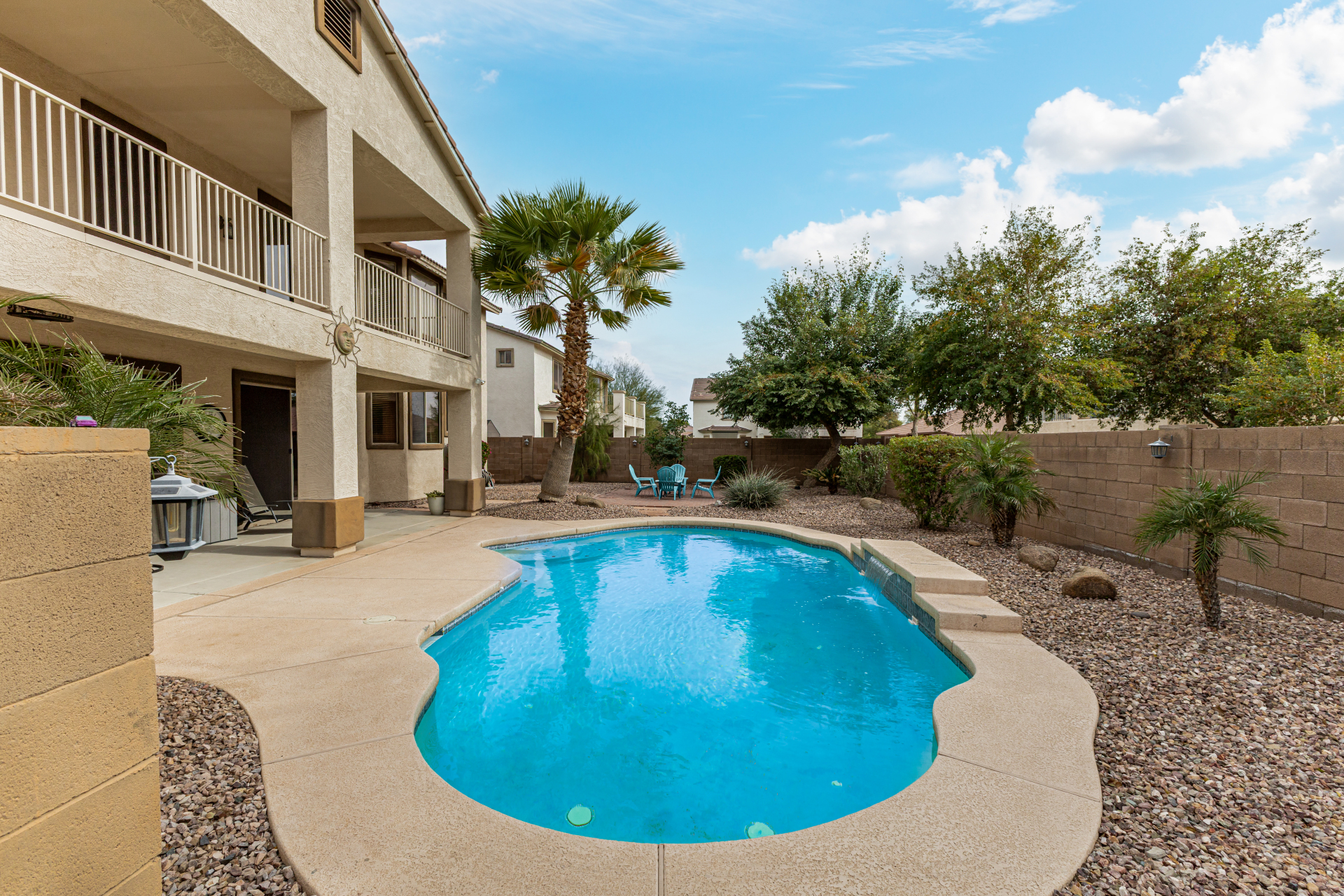 Own this stunning, spacious home w/ flexible living spaces Soaring ceilings welcome you into elegant formal living & dining areas, complemented by spacious loft w/dual fan & wrought-iron railing. Multiple indoor & outdoor living spaces include a huge Cvd front porch, mountain-view deck & Cvd patio +brick-paved backyard seating—perfect for entertaining. This versatile floor plan features 3 bedrms/2 baths plus loft UP & 2 bedrms +full bath down--ideal for in-laws & a home office. A Gourmet kitchen offers SS appls, gas range, granite C-tops+ backsplash, island, pantry, desk, bay wdw w/pool views all overlooking expansive Family Rm w/blt-in entertainment niche & wet bar. Luxurious mstr suite w/ private access to a mtn-view deck, spa-like bath w/jetted soaking tub, huge shower, dual sinks.