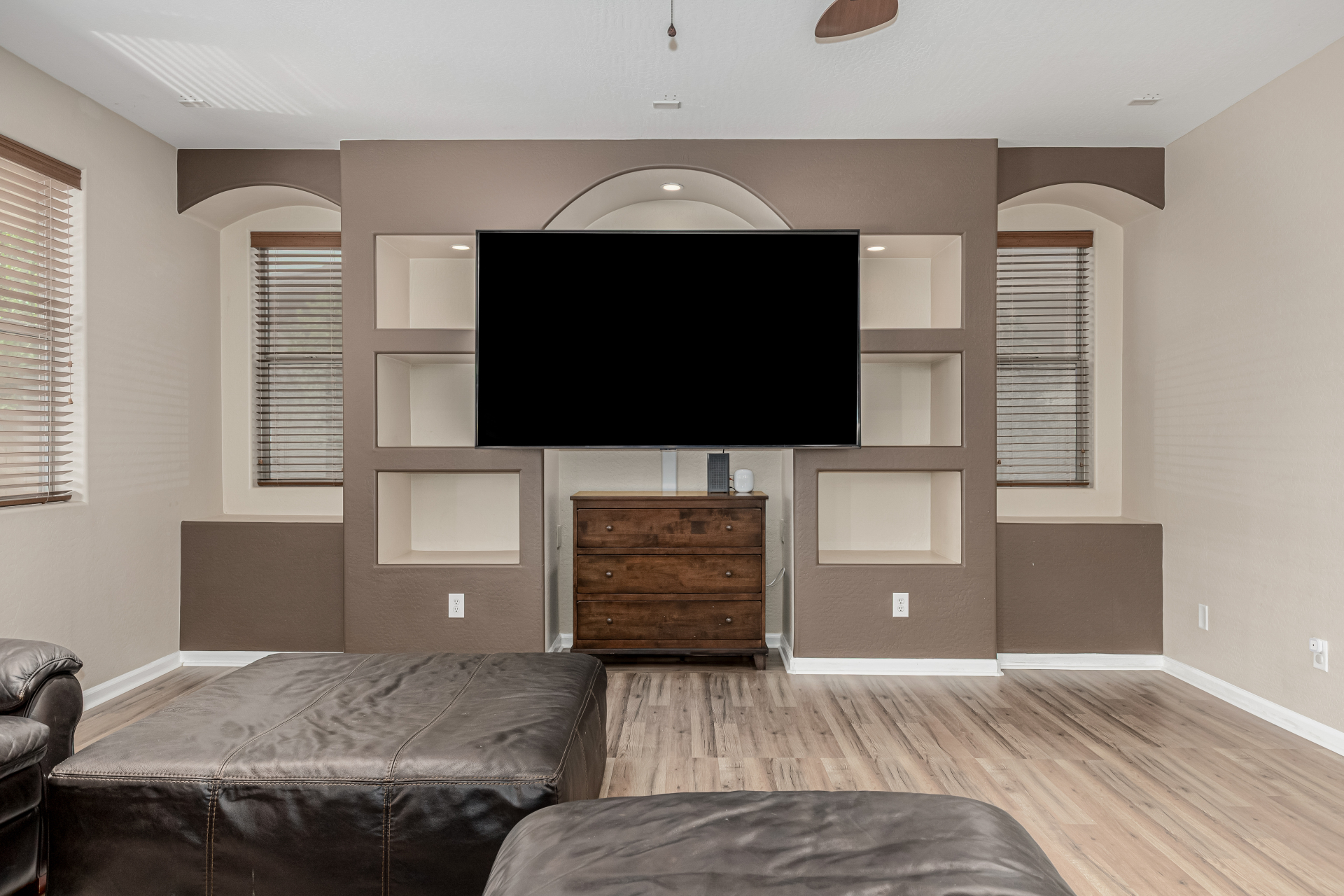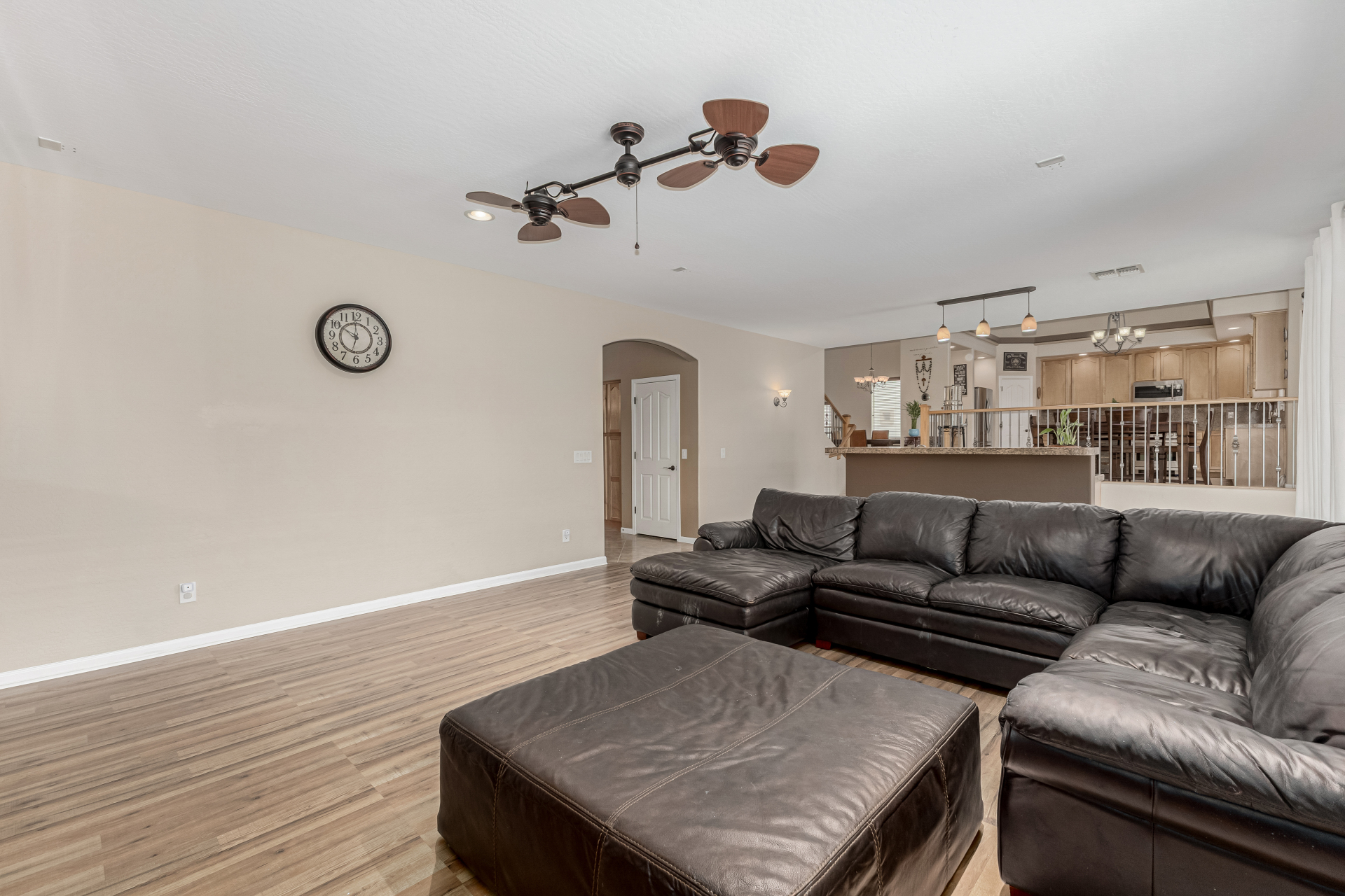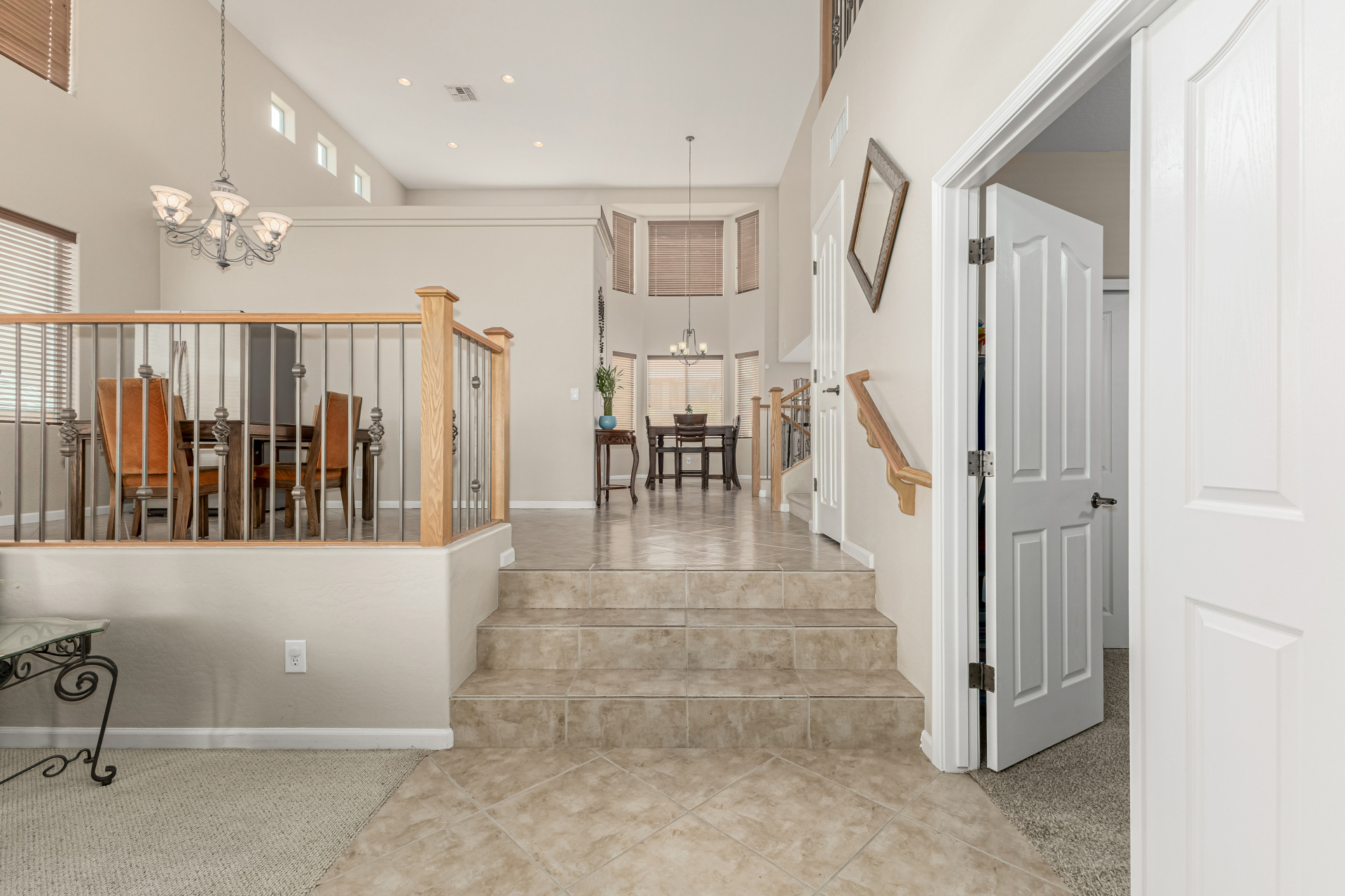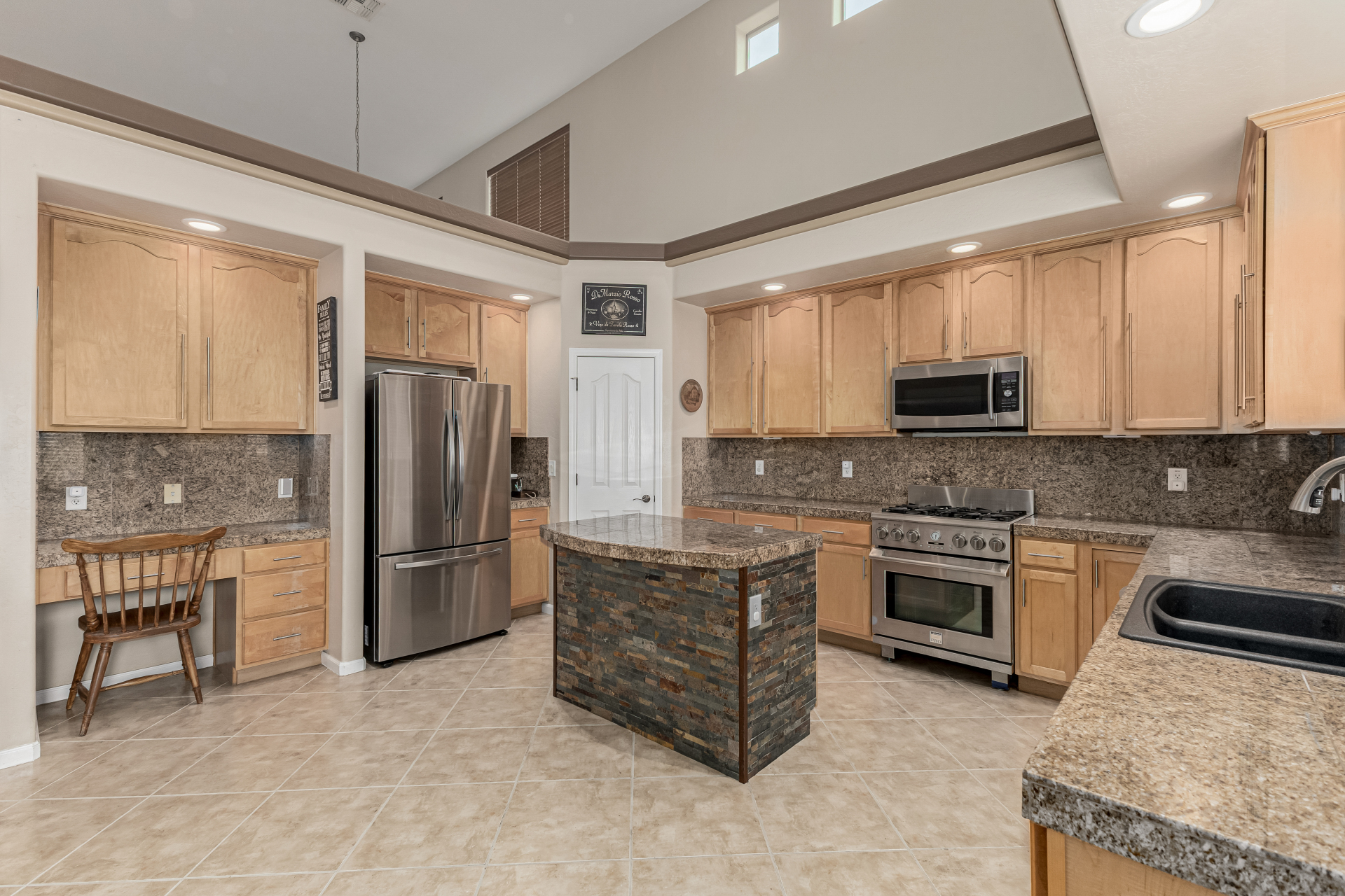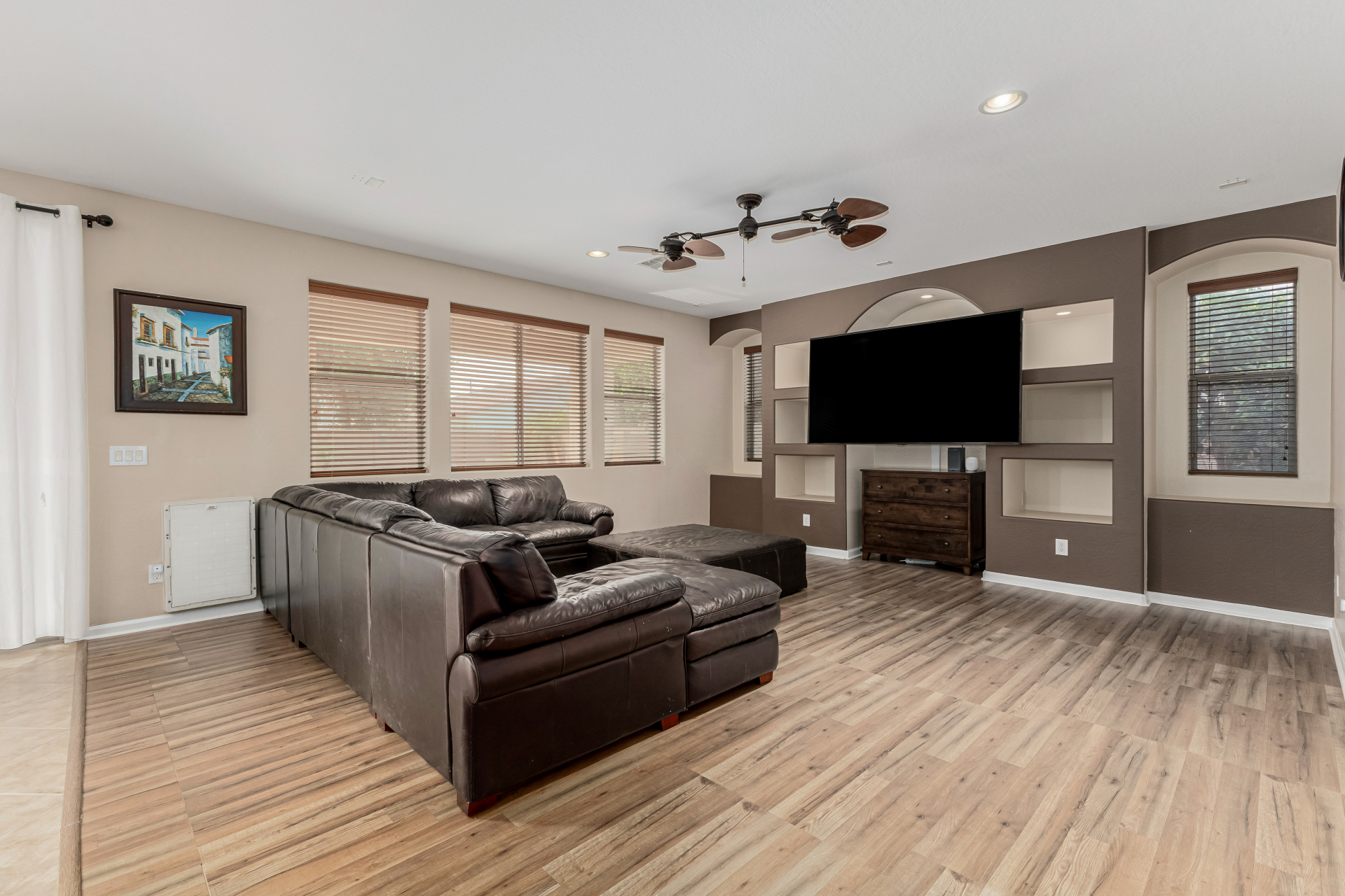 Own this stunning, spacious home w/ flexible living spaces Soaring ceilings welcome you into elegant formal living & dining areas, complemented by spacious loft w/dual fan & wrought-iron railing. Multiple indoor & outdoor living spaces include a huge Cvd front porch, mountain-view deck & Cvd patio +brick-paved backyard seating—perfect for entertaining. This versatile floor plan features 3 bedrms/2 baths plus loft UP & 2 bedrms +full bath down--ideal for in-laws & a home office. A Gourmet kitchen offers SS appls, gas range, granite C-tops+ backsplash, island, pantry, desk, bay wdw w/pool views all overlooking expansive Family Rm w/blt-in entertainment niche & wet bar. Luxurious mstr suite w/ private access to a mtn-view deck, spa-like bath w/jetted soaking tub, huge shower, dual sinks.