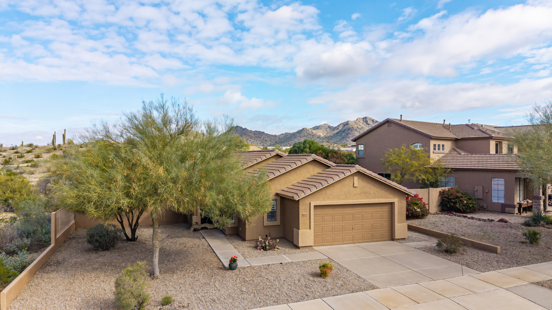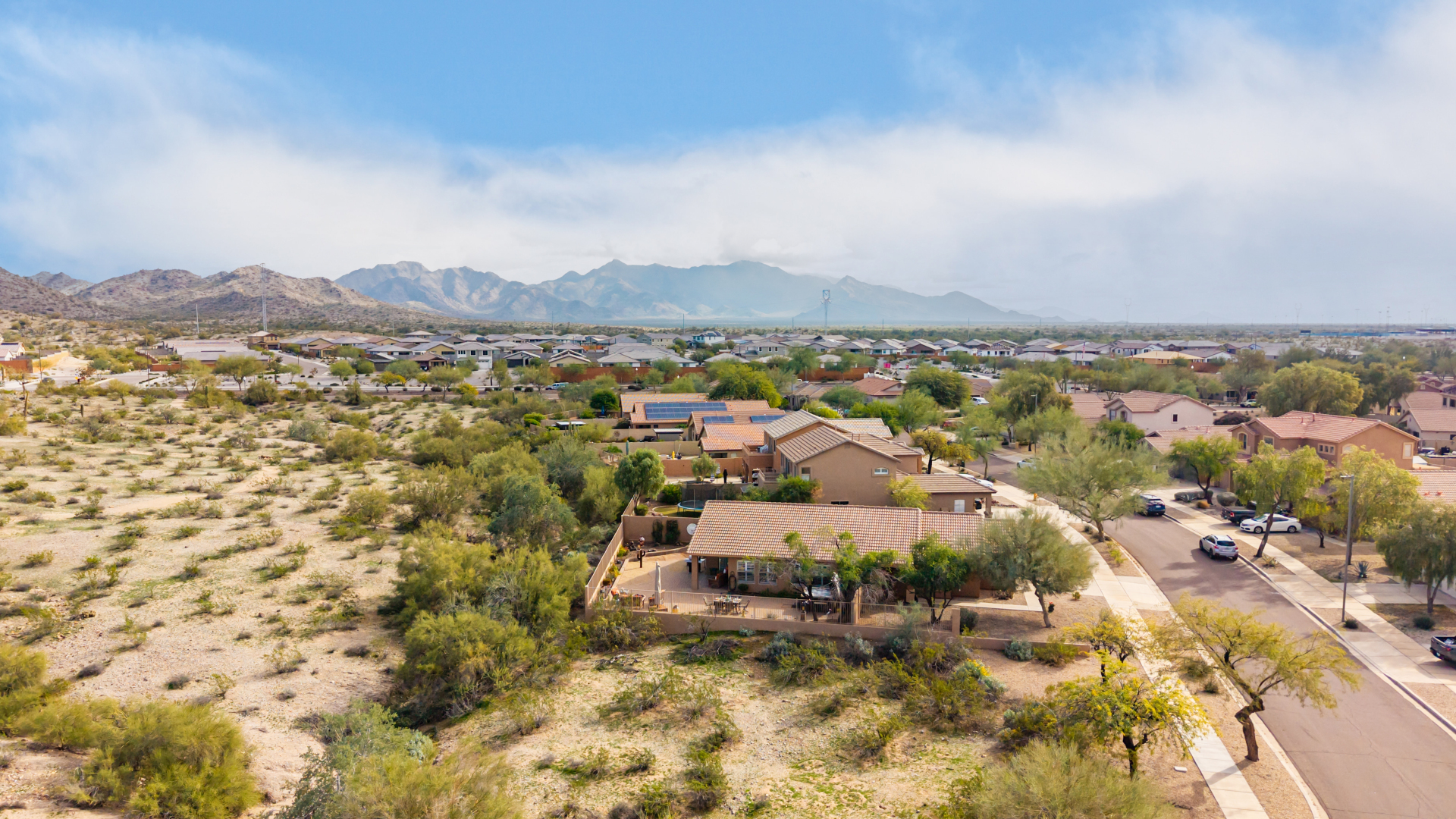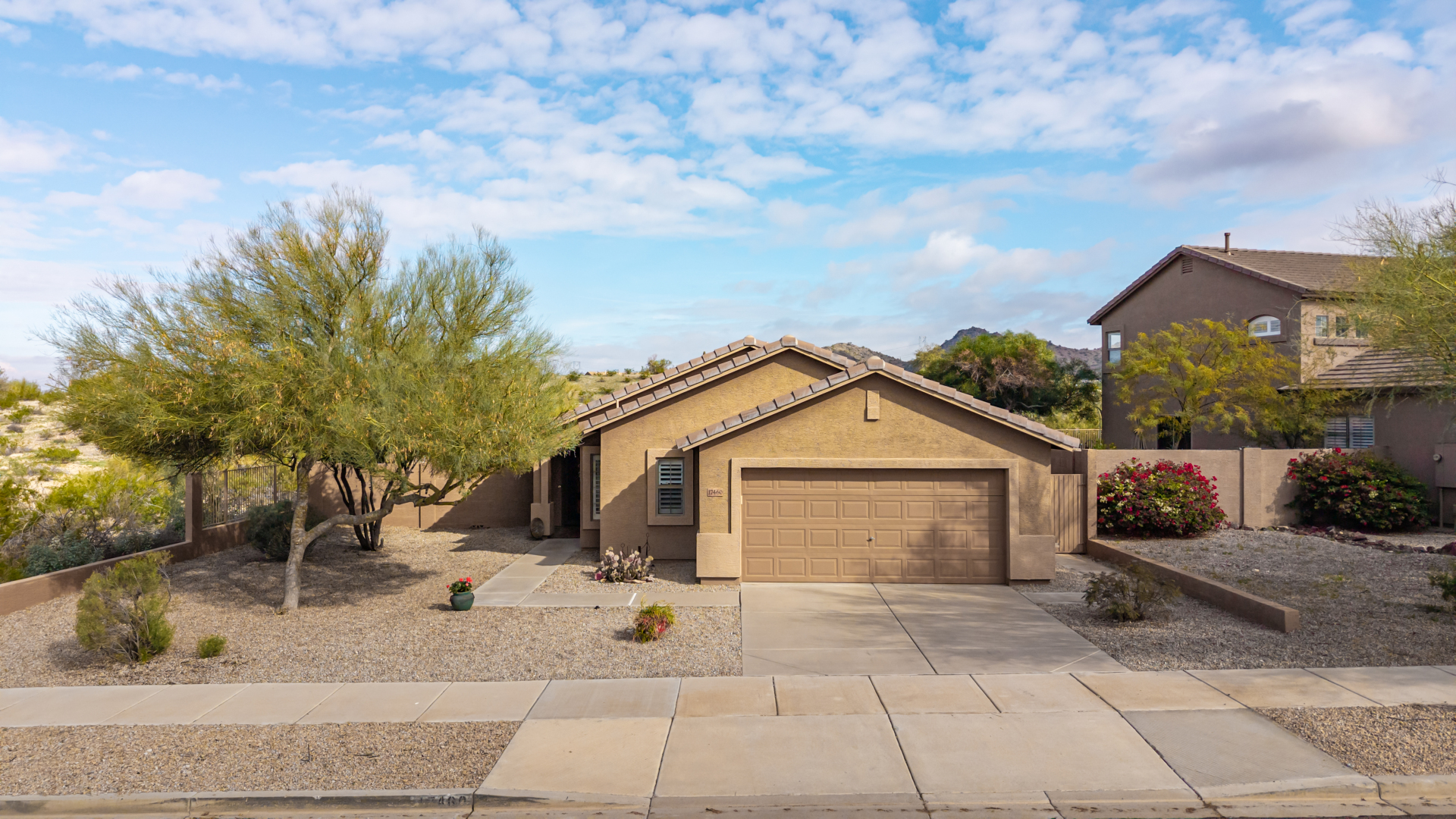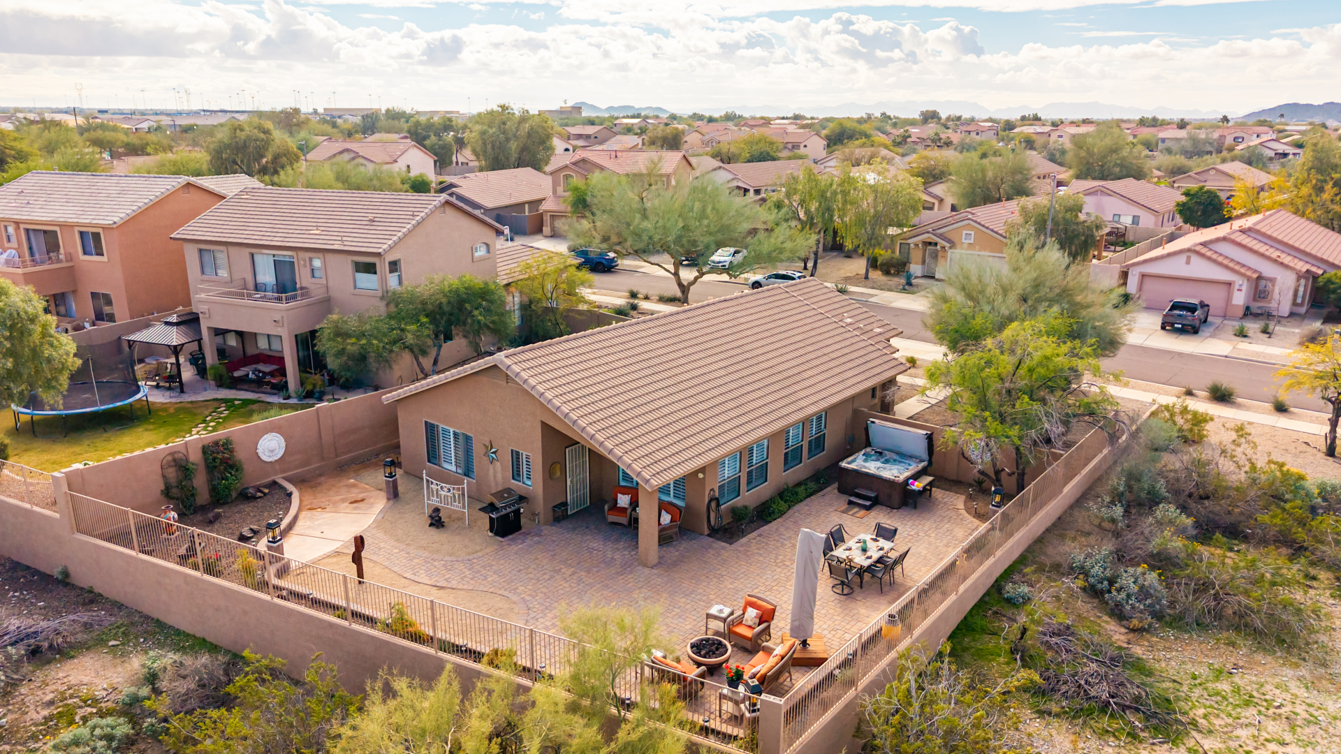 Nestled on a premier cul-de-sac lot, this private desert retreat showcases breathtaking Estrella Mountain views, view fencing, a tranquil wash backdrop & no neighbor on one side. The open great room floor plan features vaulted ceilings, plantation shutters & diagonal laid floor tile in all the right places. Chef central offers granite countertops, a breakfast bar, lots of light pine cabinetry & glass tile backsplash. An elegant owner's suite boasts an upgraded ensuite w/custom tile walk-in shower & dual vanity. Outside expansive paved patio space creates the ideal setting for entertaining, relaxing in the above ground spa & savoring the picturesque desert & mountain scenery Ahh! And this home can be turnkey if needed: all furniture & furnishings available via separate bill of sale.