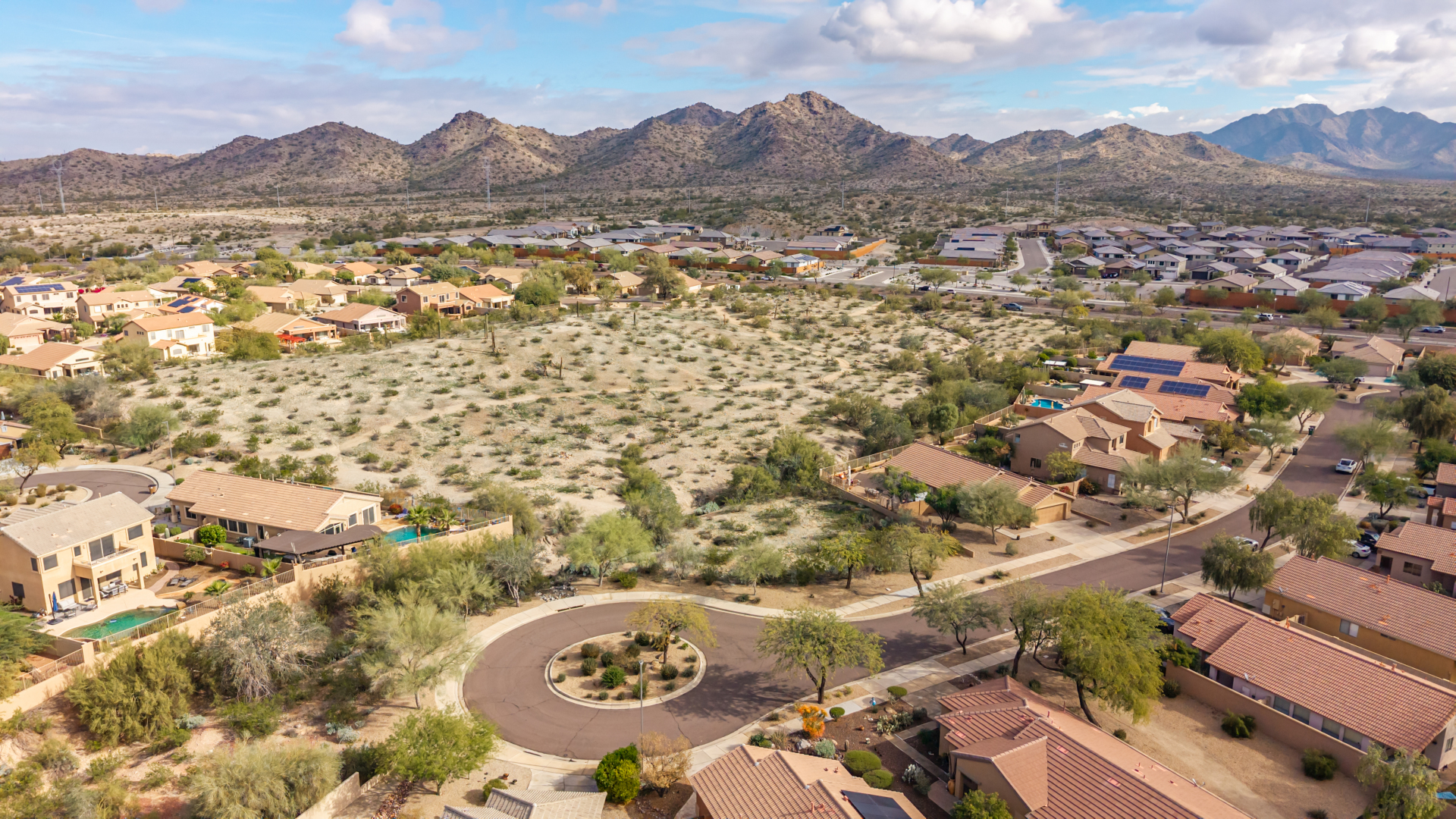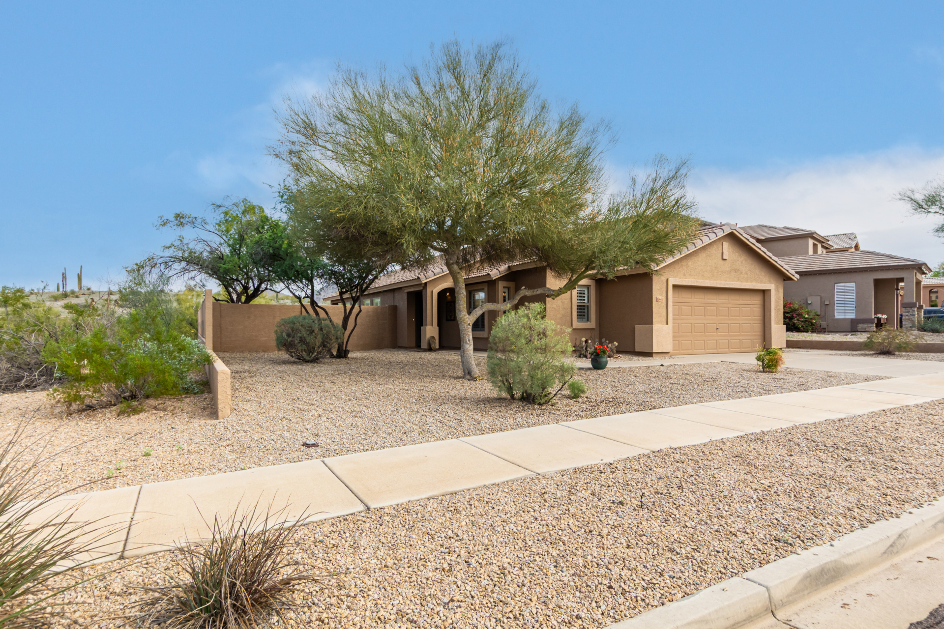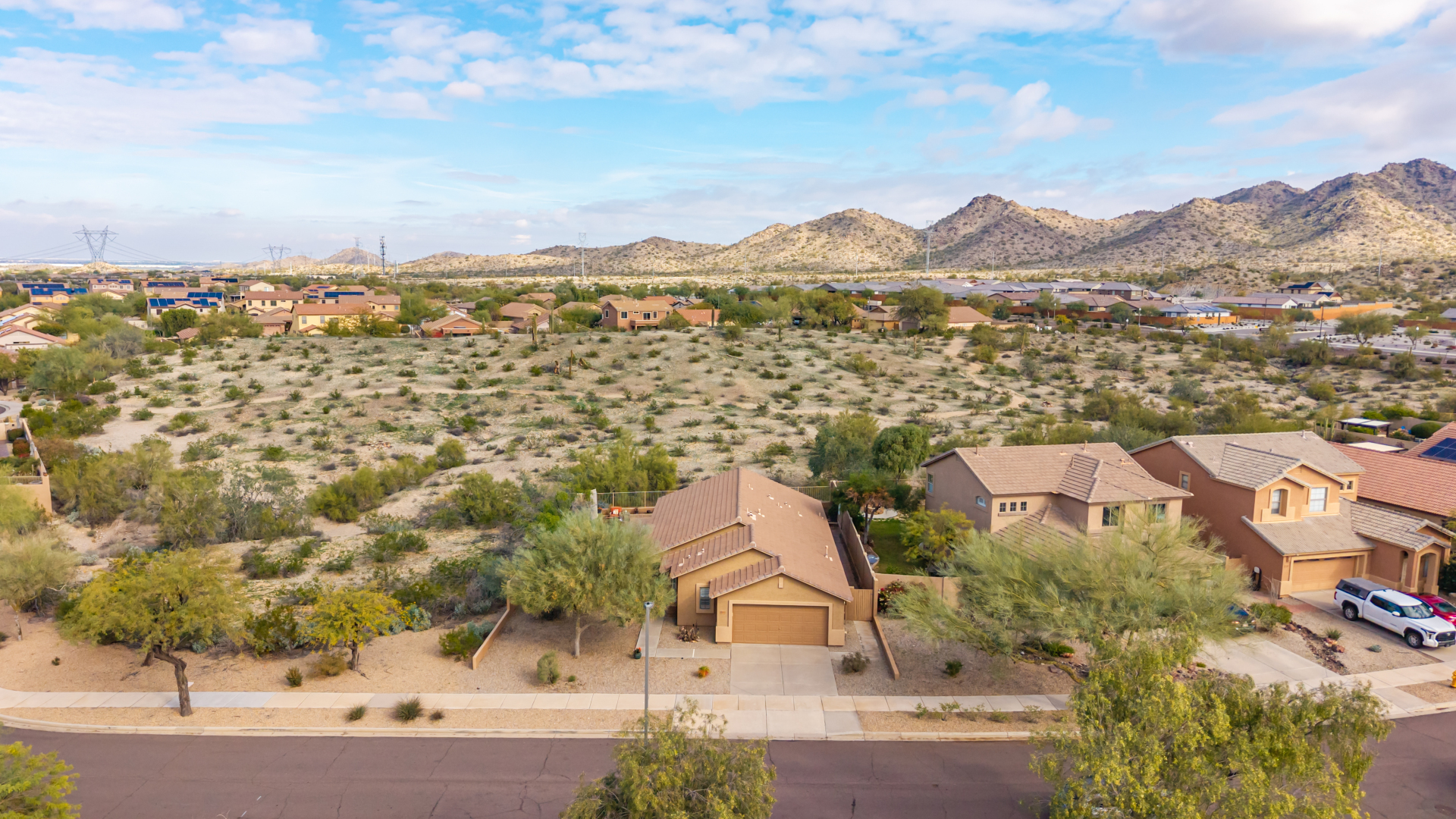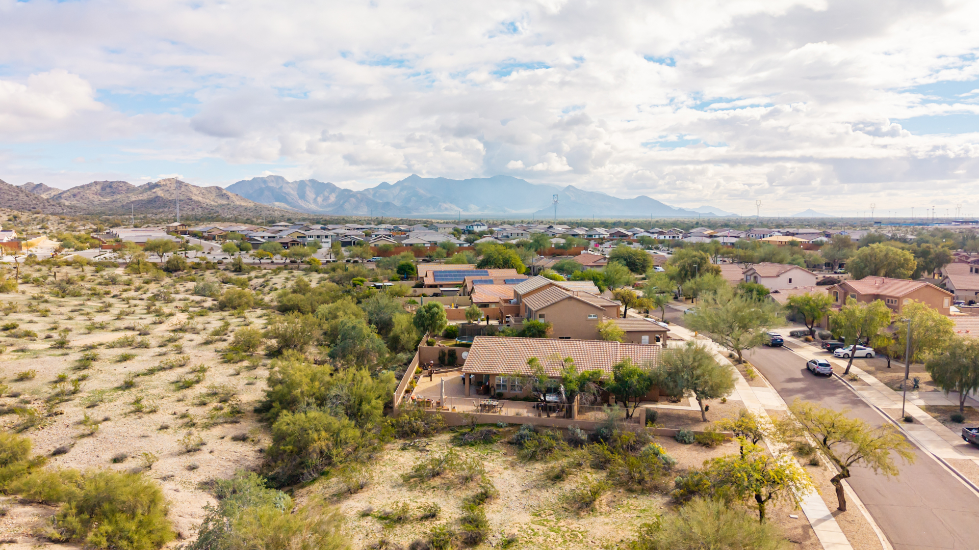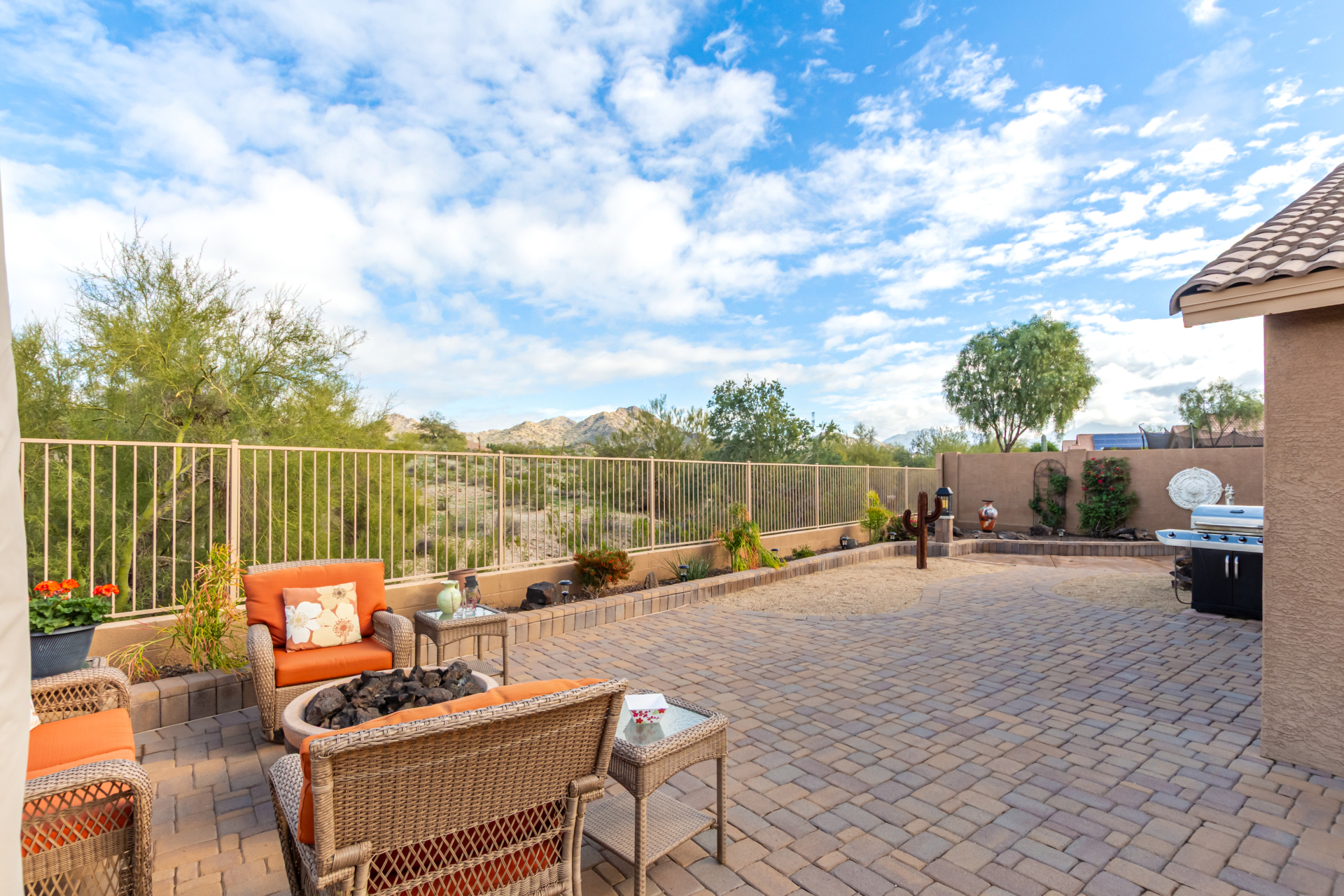 Nestled on a premier cul-de-sac lot, this private desert retreat showcases breathtaking Estrella Mountain views, view fencing, a tranquil wash backdrop & no neighbor on one side. The open great room floor plan features vaulted ceilings, plantation shutters & diagonal laid floor tile in all the right places. Chef central offers granite countertops, a breakfast bar, lots of light pine cabinetry & glass tile backsplash. An elegant owner's suite boasts an upgraded ensuite w/custom tile walk-in shower & dual vanity. Outside expansive paved patio space creates the ideal setting for entertaining, relaxing in the above ground spa & savoring the picturesque desert & mountain scenery Ahh! And this home can be turnkey if needed: all furniture & furnishings available via separate bill of sale.