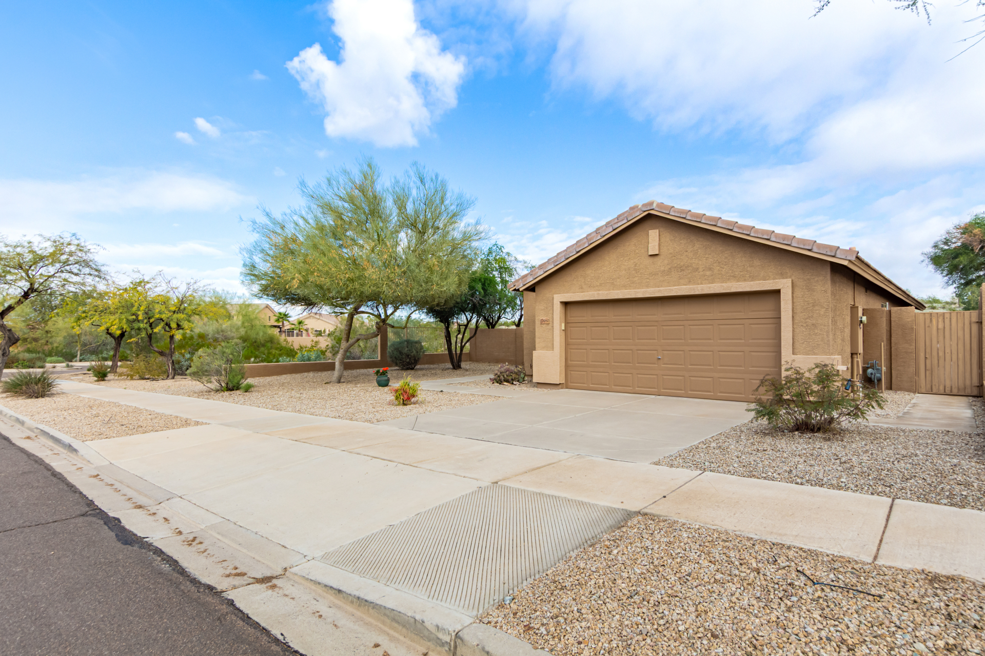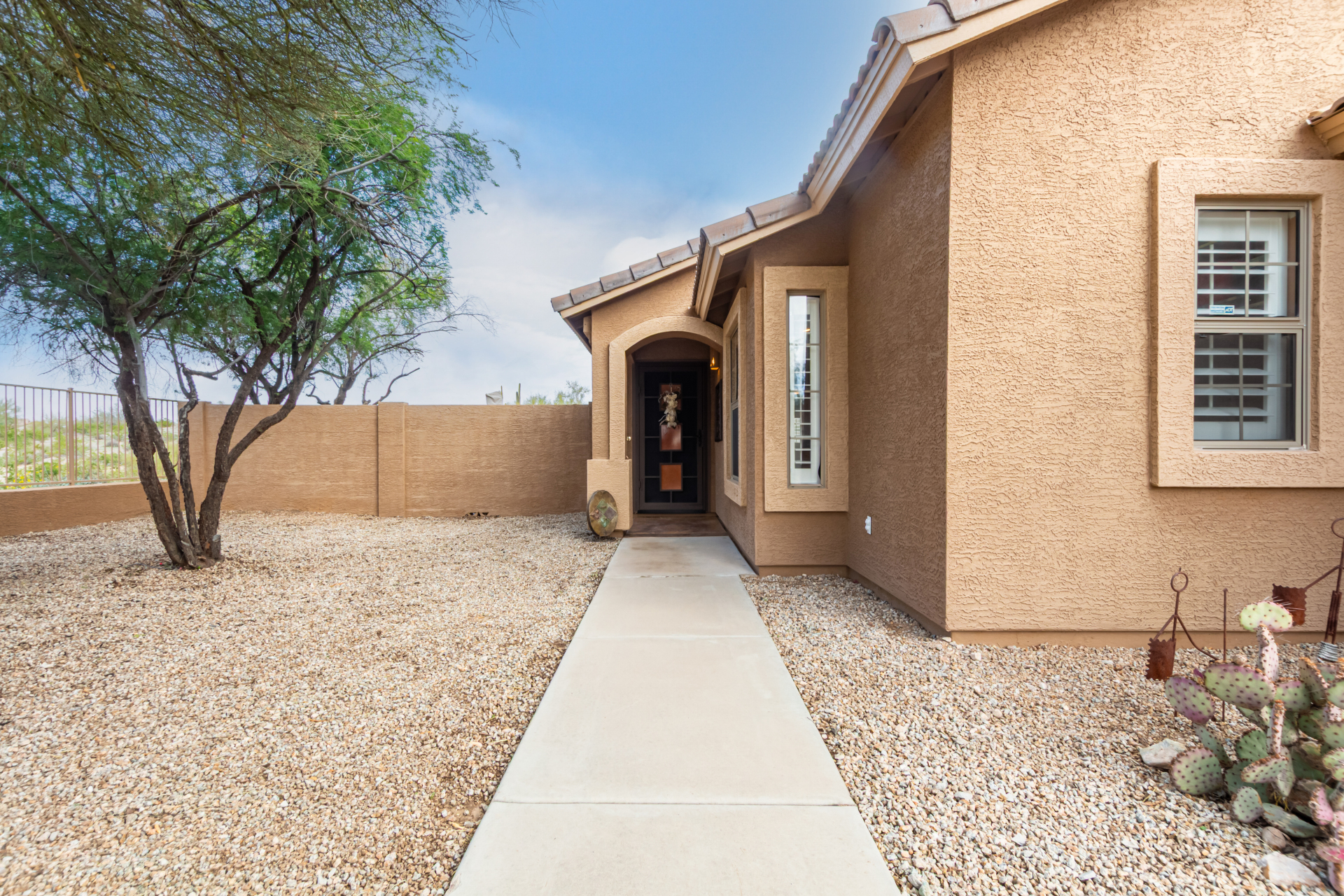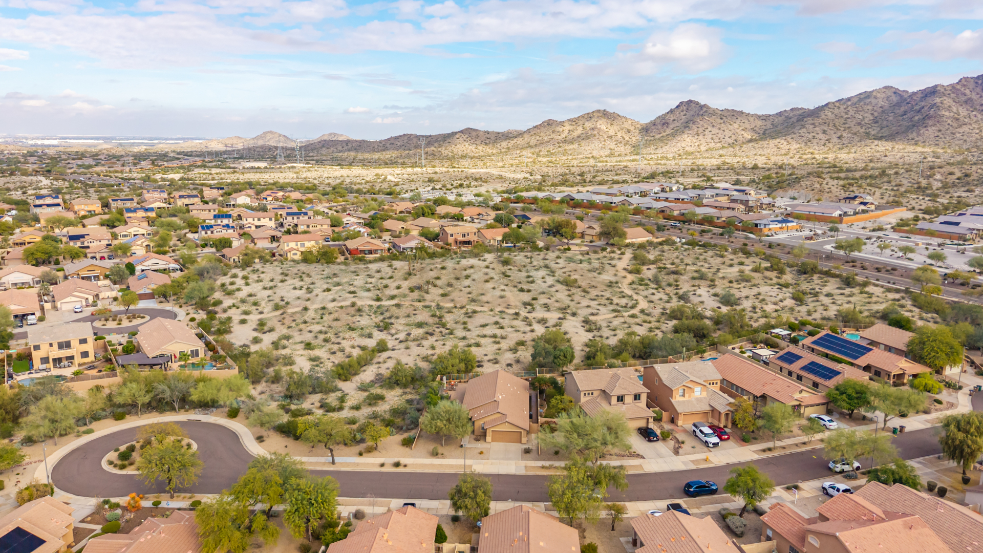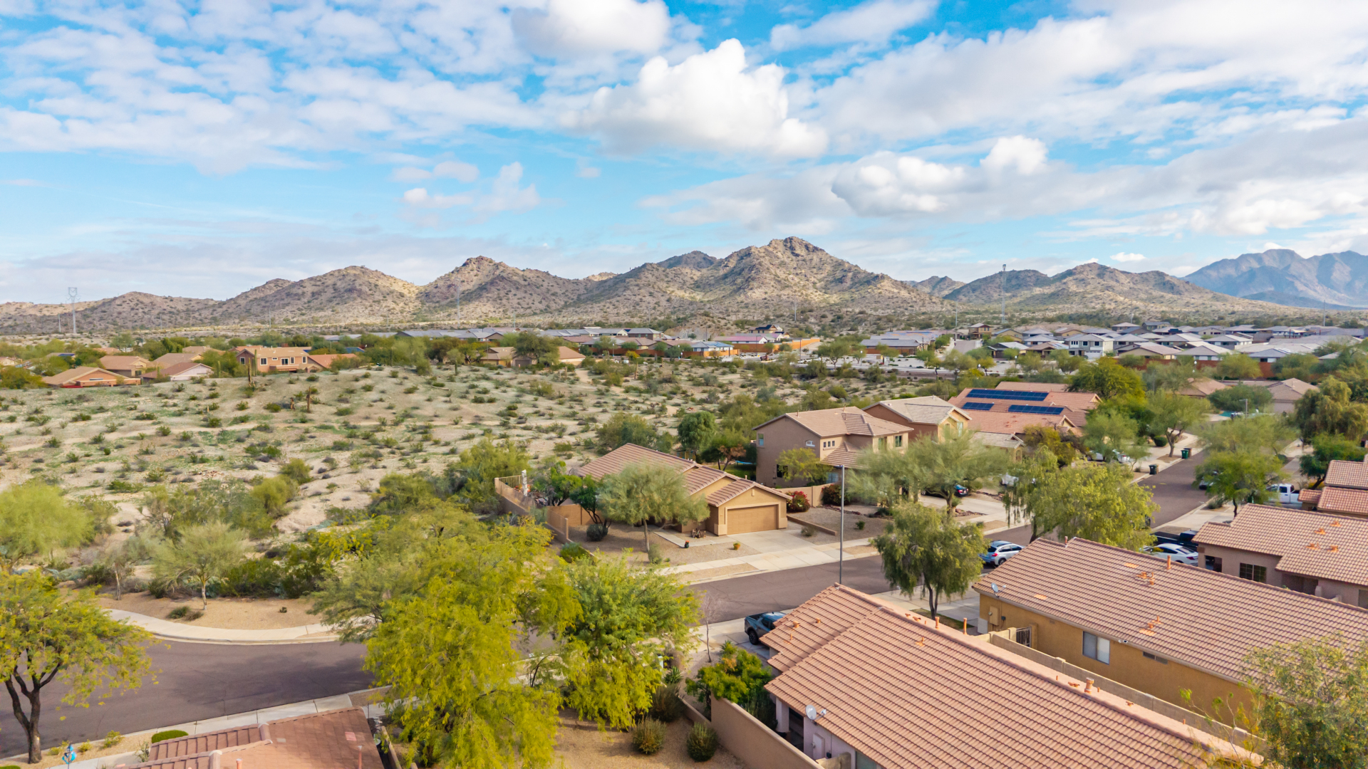 Nestled on a premier cul-de-sac lot, this private desert retreat showcases breathtaking Estrella Mountain views, view fencing, a tranquil wash backdrop & no neighbor on one side. The open great room floor plan features vaulted ceilings, plantation shutters & diagonal laid floor tile in all the right places. Chef central offers granite countertops, a breakfast bar, lots of light pine cabinetry & glass tile backsplash. An elegant owner's suite boasts an upgraded ensuite w/custom tile walk-in shower & dual vanity. Outside expansive paved patio space creates the ideal setting for entertaining, relaxing in the above ground spa & savoring the picturesque desert & mountain scenery Ahh! And this home can be turnkey if needed: all furniture & furnishings available via separate bill of sale.