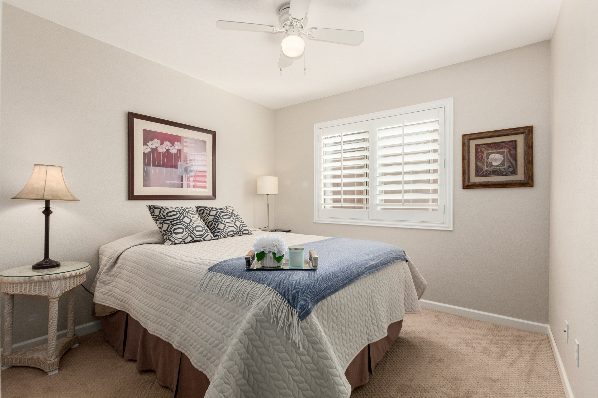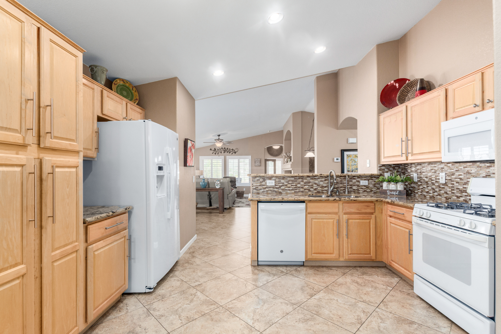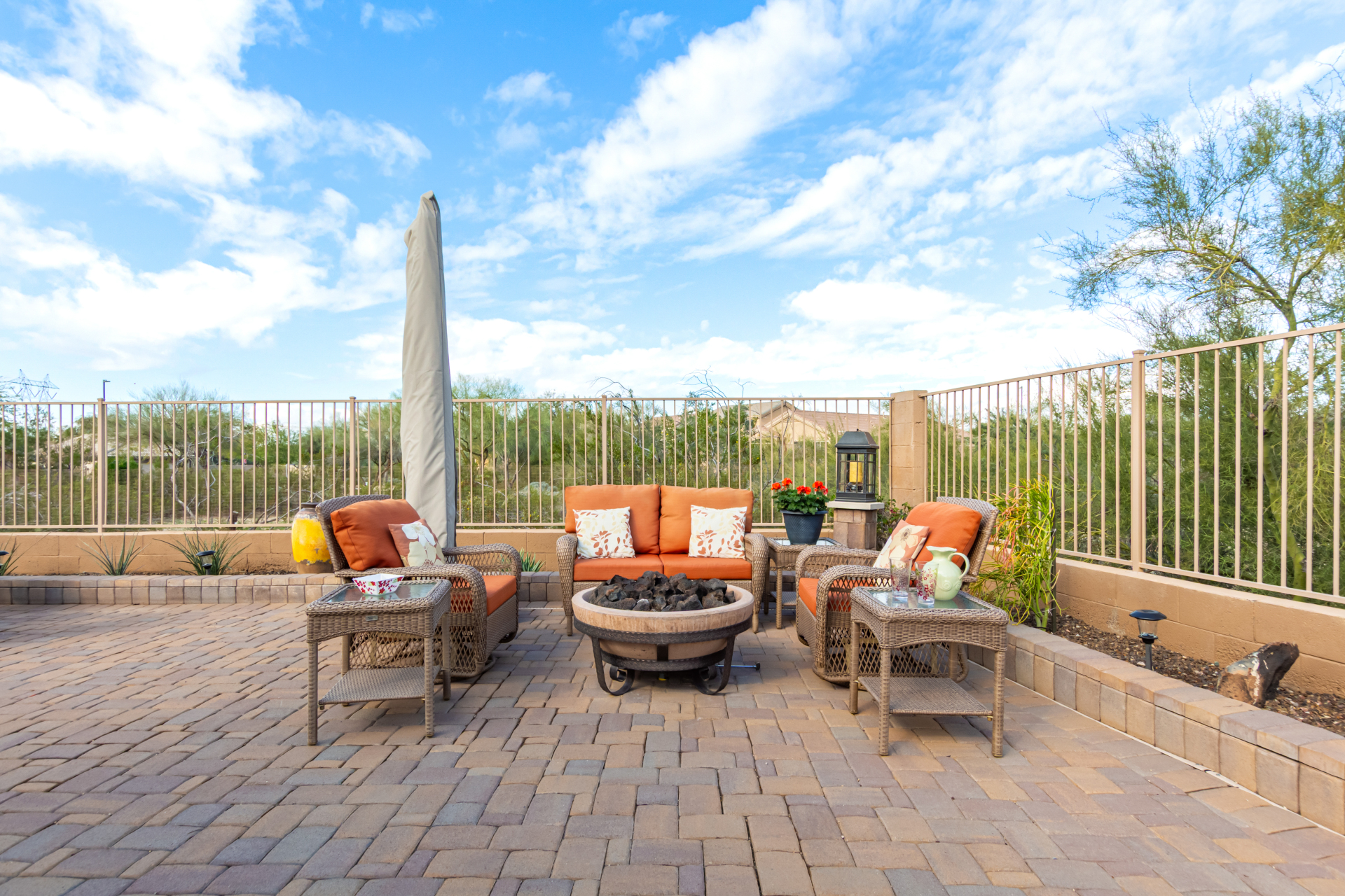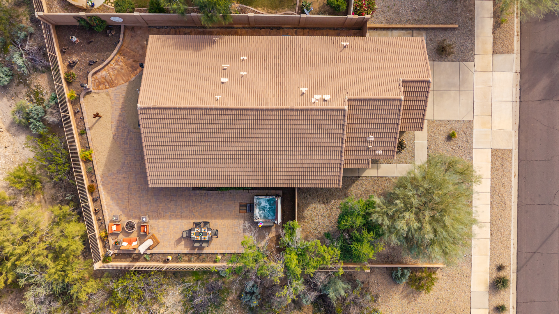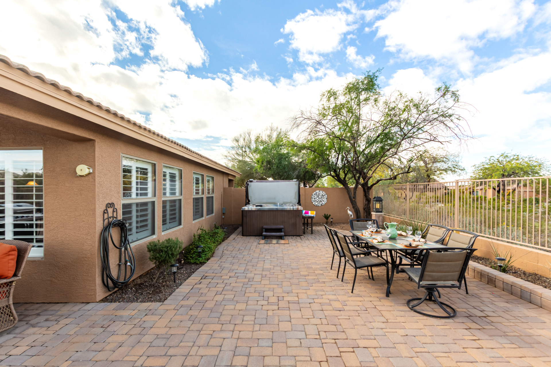 Nestled on a premier cul-de-sac lot, this private desert retreat showcases breathtaking Estrella Mountain views, view fencing, a tranquil wash backdrop & no neighbor on one side. The open great room floor plan features vaulted ceilings, plantation shutters & diagonal laid floor tile in all the right places. Chef central offers granite countertops, a breakfast bar, lots of light pine cabinetry & glass tile backsplash. An elegant owner's suite boasts an upgraded ensuite w/custom tile walk-in shower & dual vanity. Outside expansive paved patio space creates the ideal setting for entertaining, relaxing in the above ground spa & savoring the picturesque desert & mountain scenery Ahh! And this home can be turnkey if needed: all furniture & furnishings available via separate bill of sale.