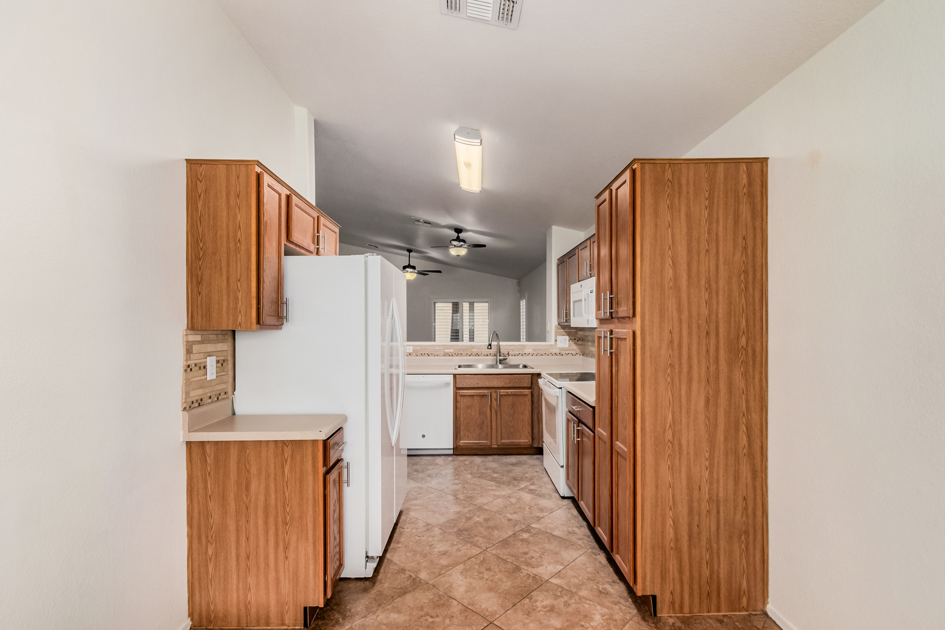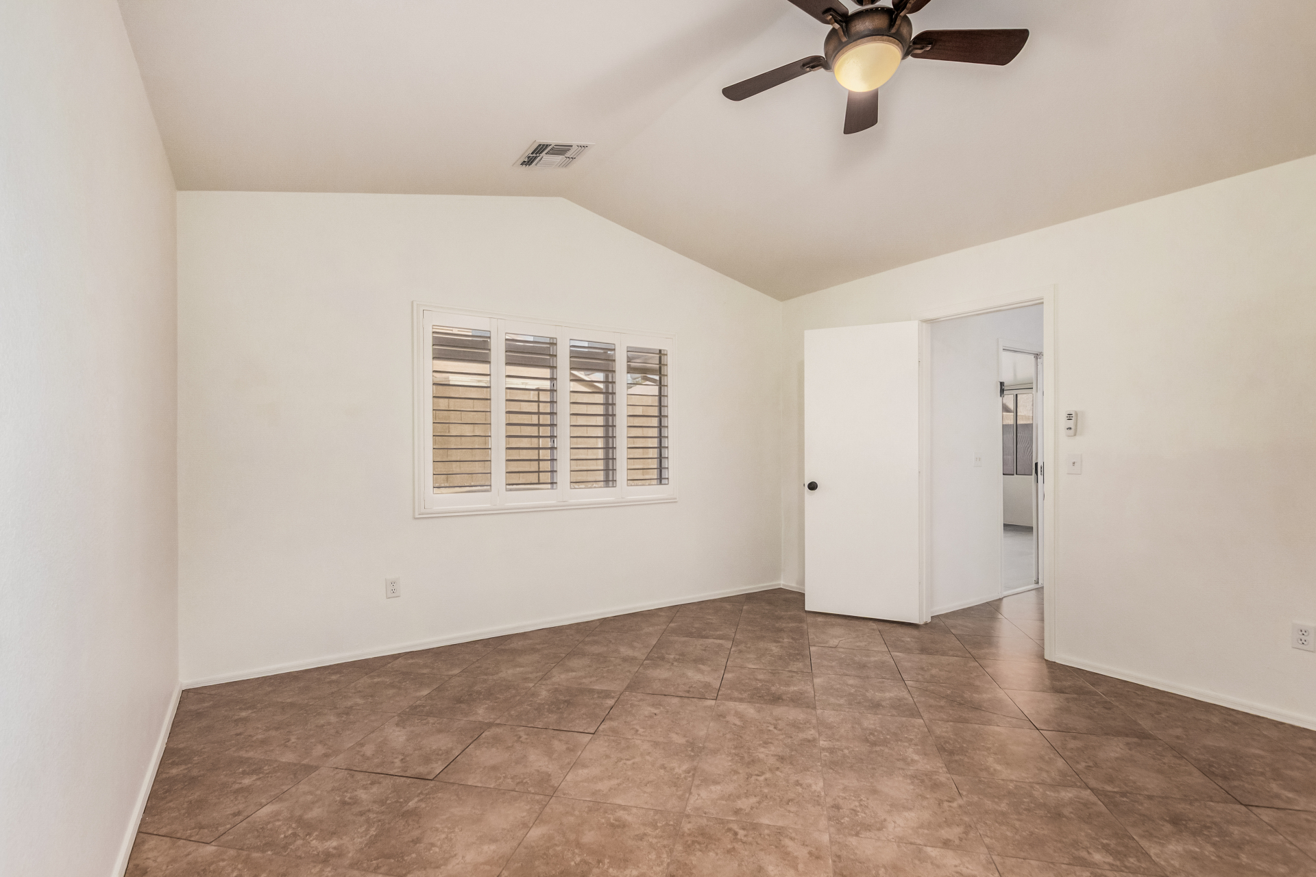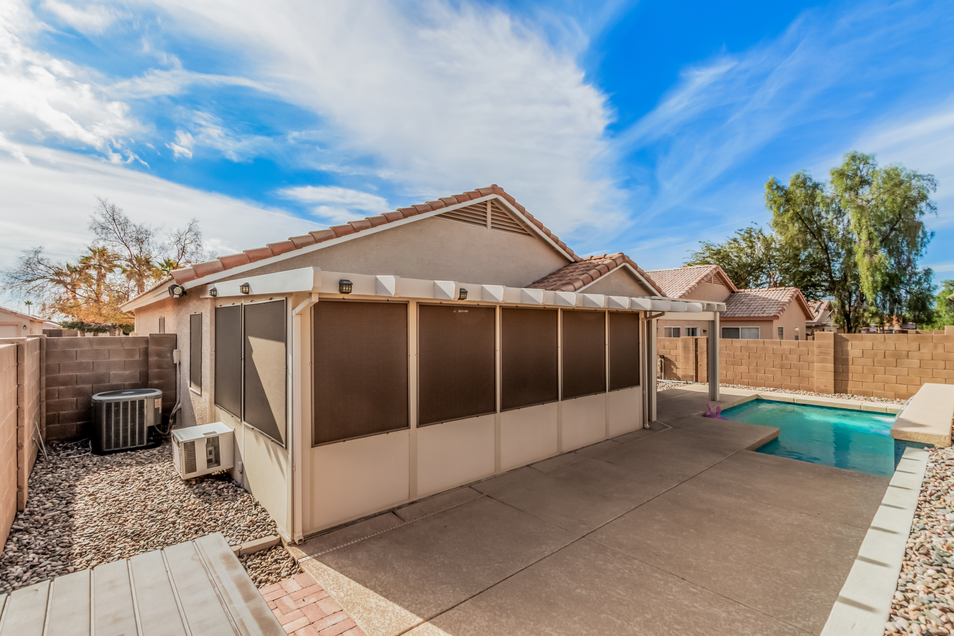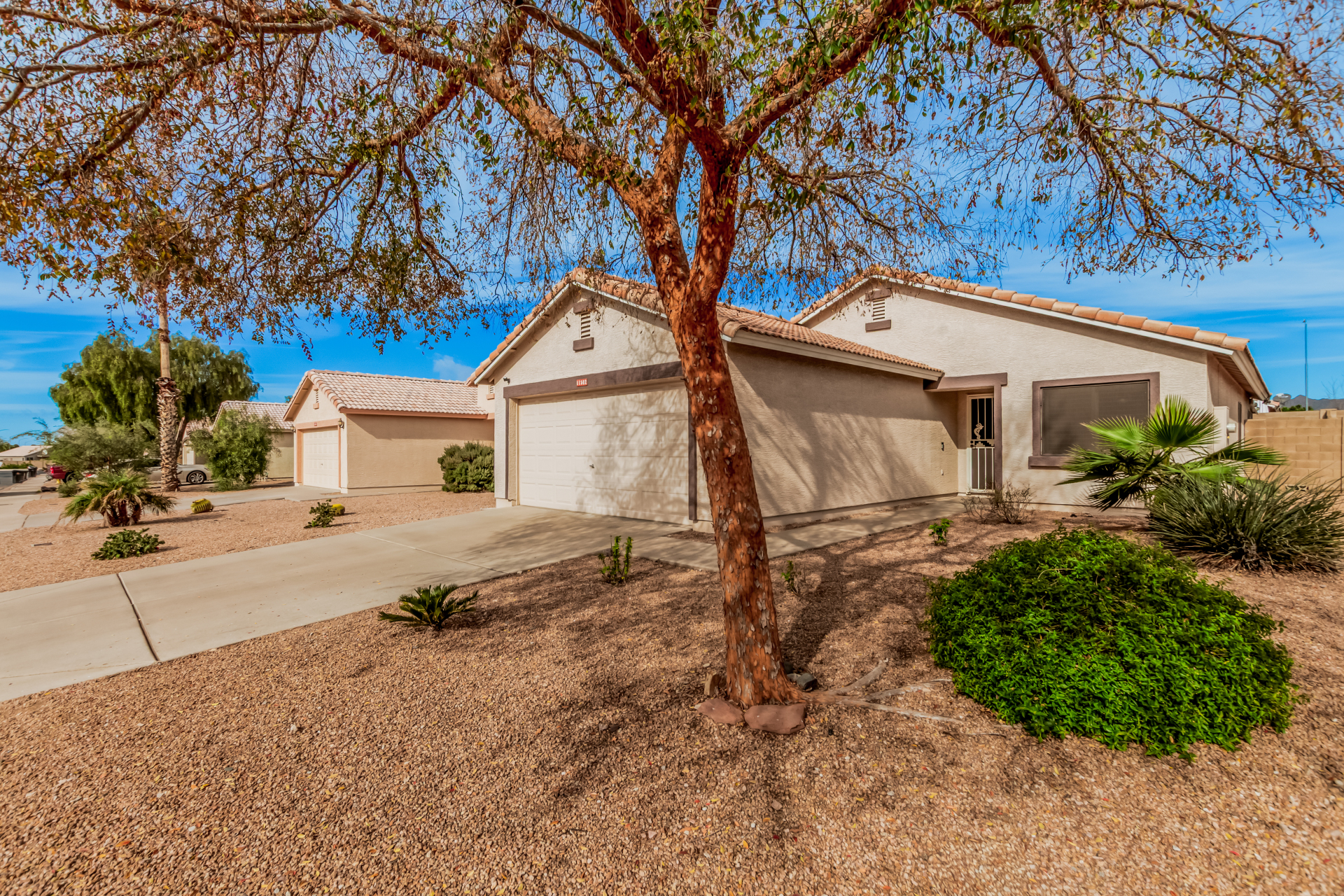 Fall in love with this charming single-level home in Meridian Hills! Inside, vaulted ceilings, tile floors, plantation shutters, and a warm, inviting living room create a space that instantly feels like home. The kitchen is ready for everyday living and entertaining, featuring matching appliances, wood cabinetry, a tile backsplash, and a convenient breakfast bar. Unwind in the main bedroom complete with a walk-in closet and private bathroom. Enjoy peaceful mornings or relaxing afternoons in the Arizona room, then head outside to the backyard with a patio and sparkling pool perfect for soaking up the Arizona lifestyle. The garage offers handy attached cabinets for extra storage. This home truly has it all. Come see it and fall in love!