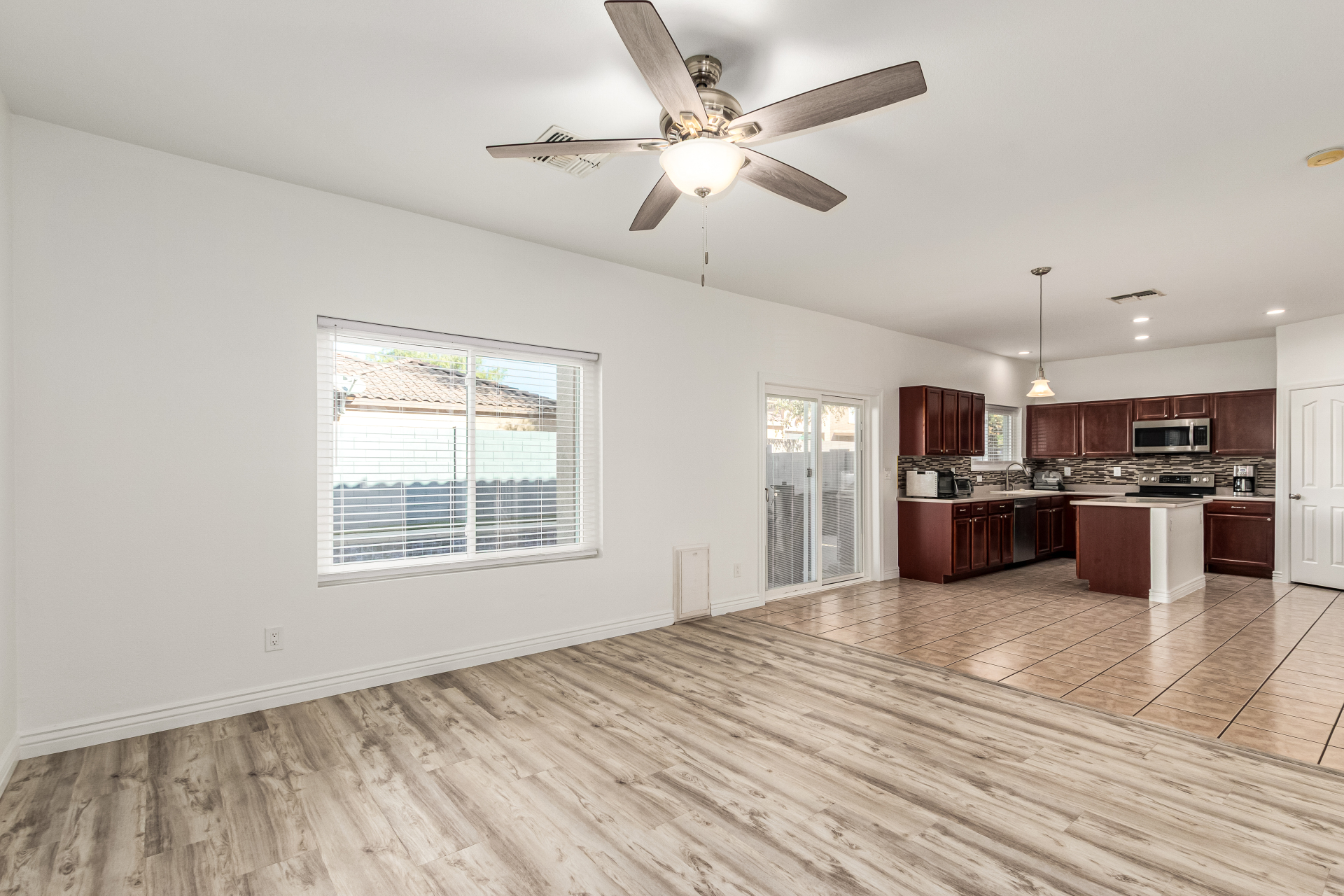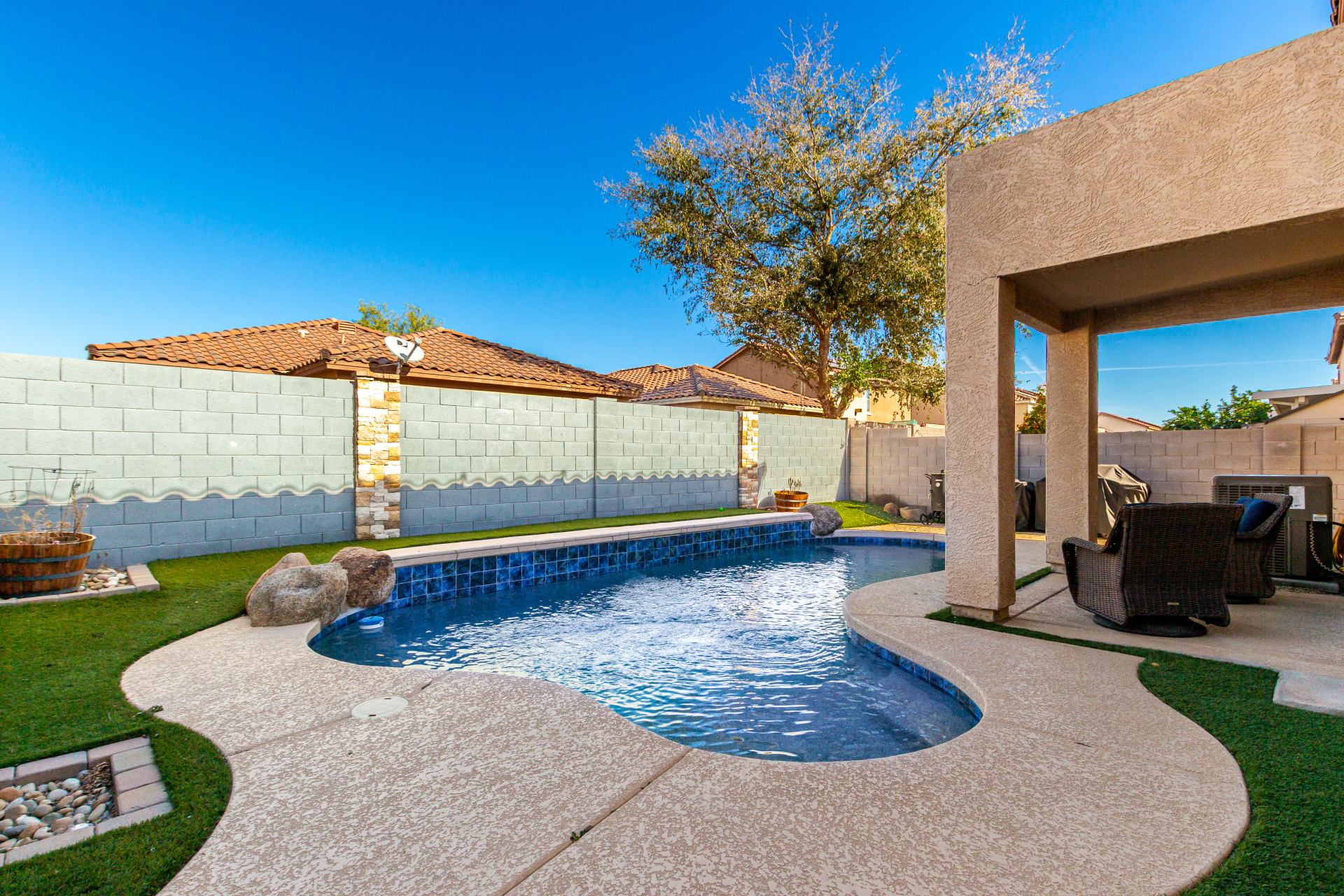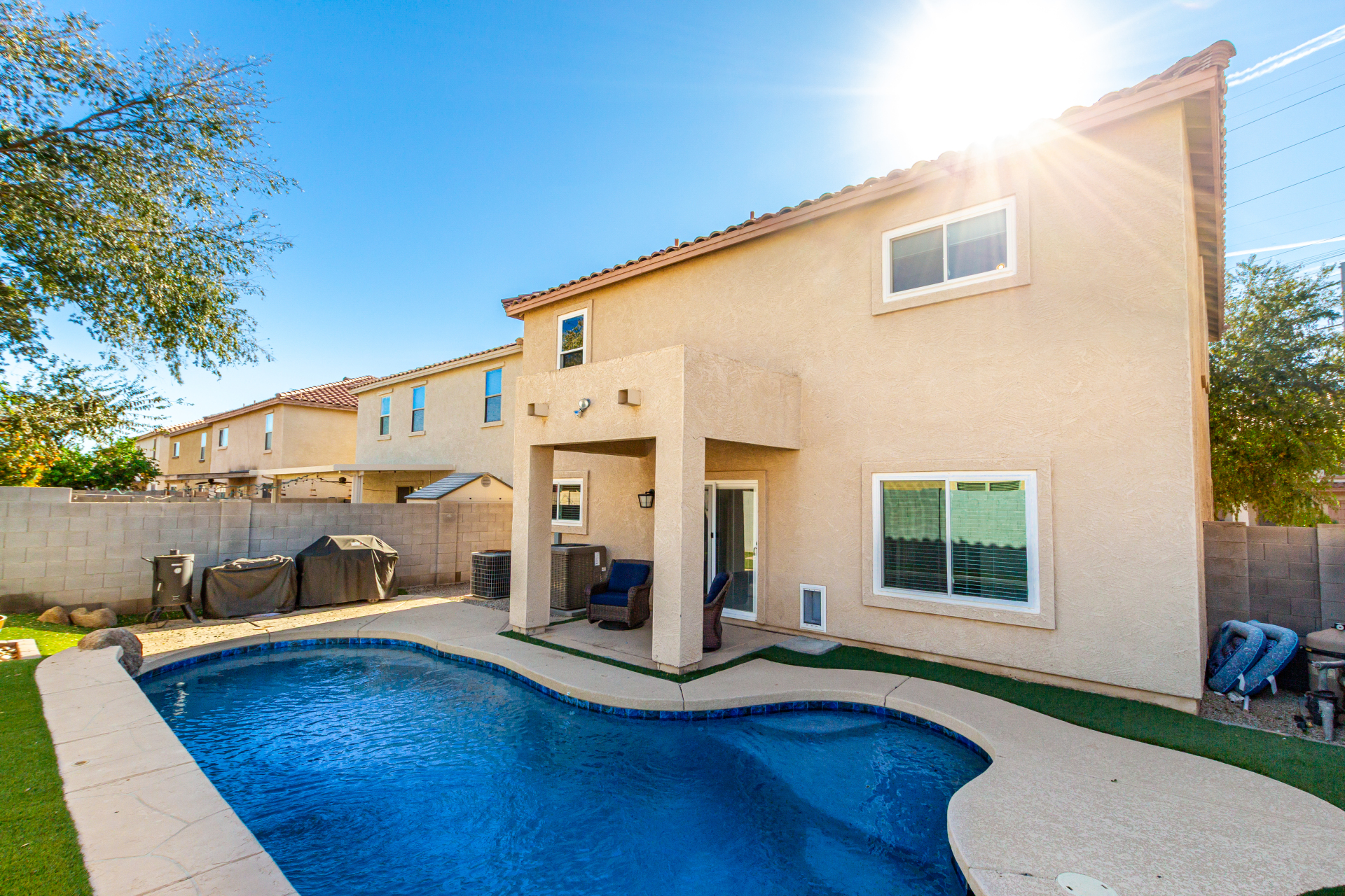 Fantastic opportunity to own this two-story home in the Arizona Skyline Community! Fall in love with the large living & dining room, along with the seamlessly flowing great room. Design touches like a blend of wood-look & tile flooring, custom paint, tons of natural light, and ceiling fans enhance every space. Fabulous kitchen offers a pantry, SS appliances, mosaic tile backsplash, plenty of cabinetry, recessed lighting, solid surface counters, and a center island. Continue upstairs to find a cozy loft ideal for a reading nook. Discover a large main bedroom, which provides an ensuite with dual sinks and a walk-in closet. Don't miss the serene backyard complete with a covered patio and a sparkling pool, perfect for year-round enjoyment & entertaining. This gem won't last long. Hurry!