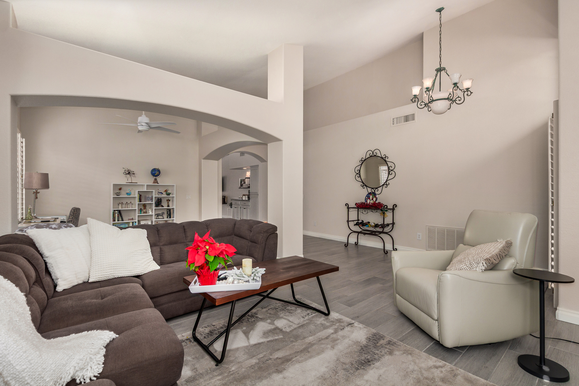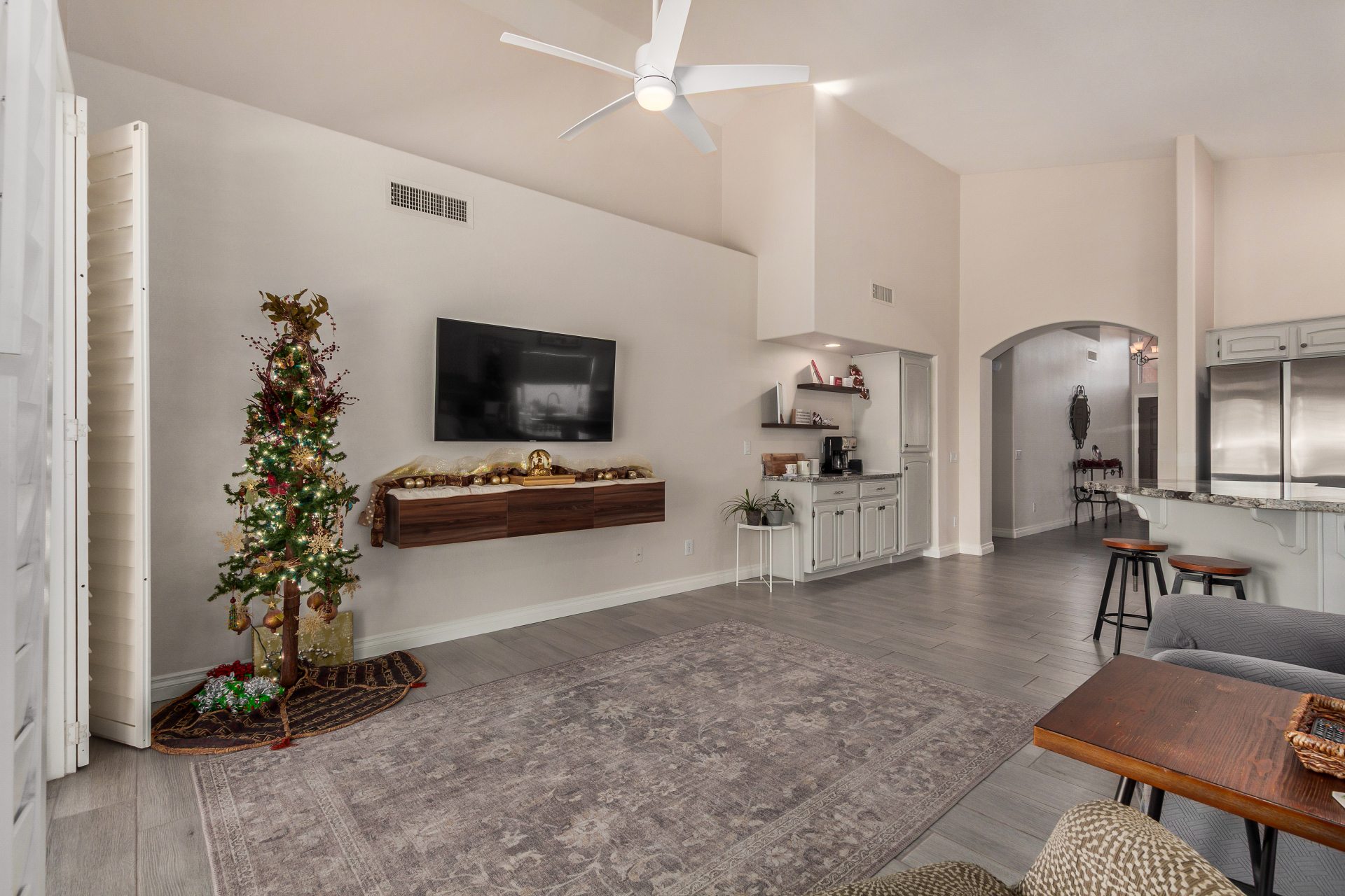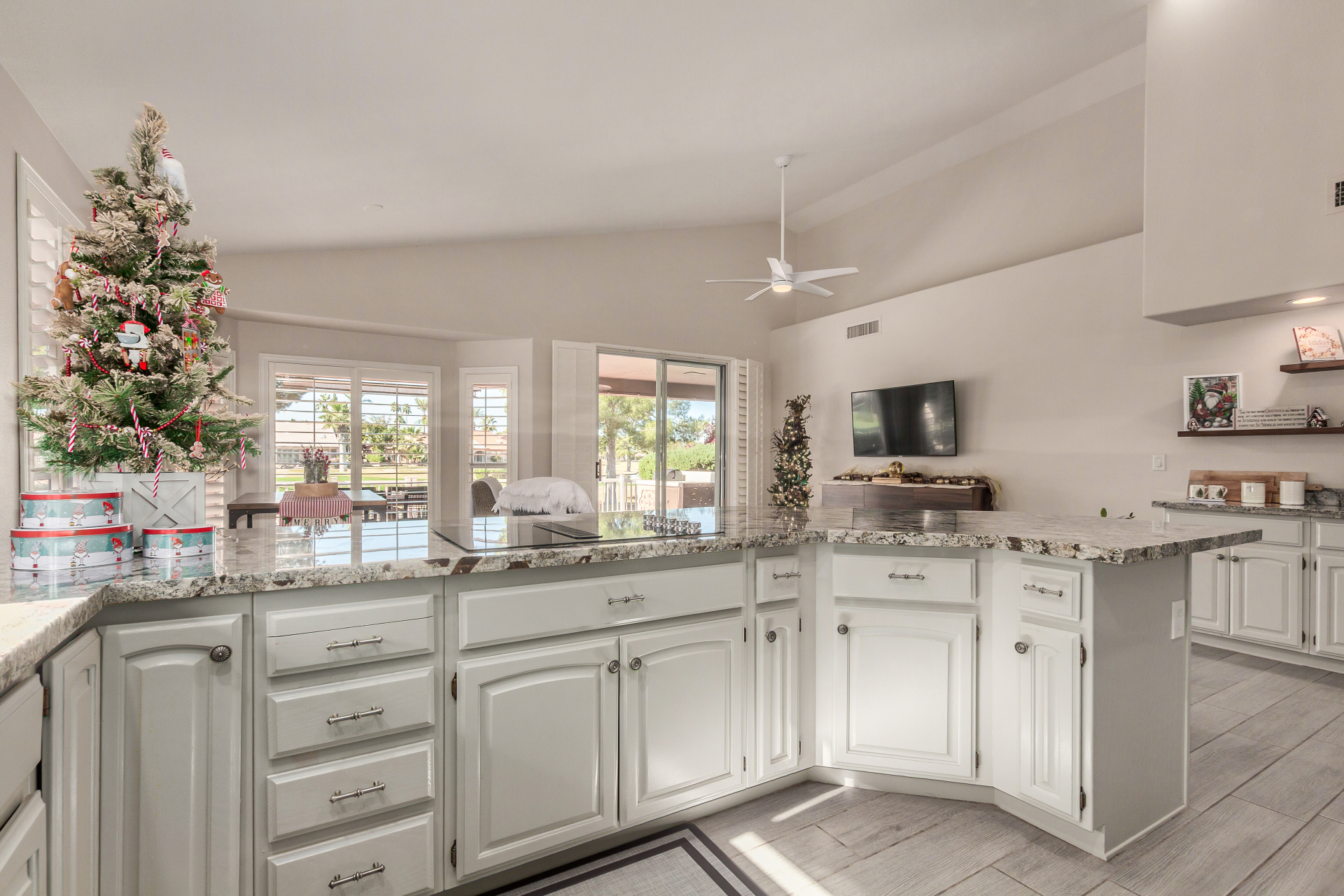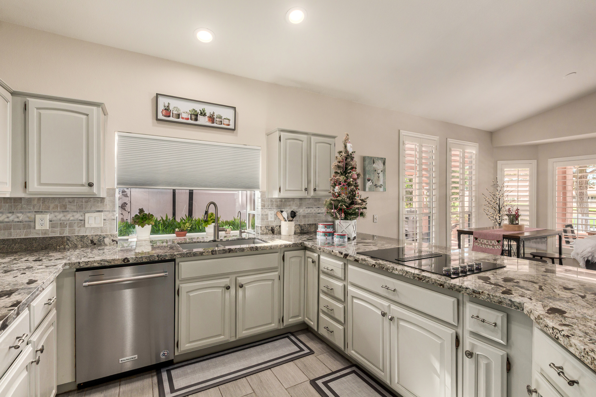 Beautifully maintained 2-bedroom home with a 3-car garage radiates style and comfort at every turn! Perfect for everyday living and entertaining, this light-filled home features an airy living and dining area anchored by a stunning floor-to-ceiling stone fireplace, plus a spacious great room bathed in natural light. Wood-look tile flooring, soaring vaulted ceilings, neutral tones, and plantation shutters are features you'll love. Recent upgrades include all-new interior paint, a new refrigerator, new garage doors, new garage door openers, and a roof replaced just two years ago. The spotless kitchen showcases ample cabinetry with crown molding, stainless steel appliances, a tile backsplash, granite countertops, and recessed lighting that brightens every corner.