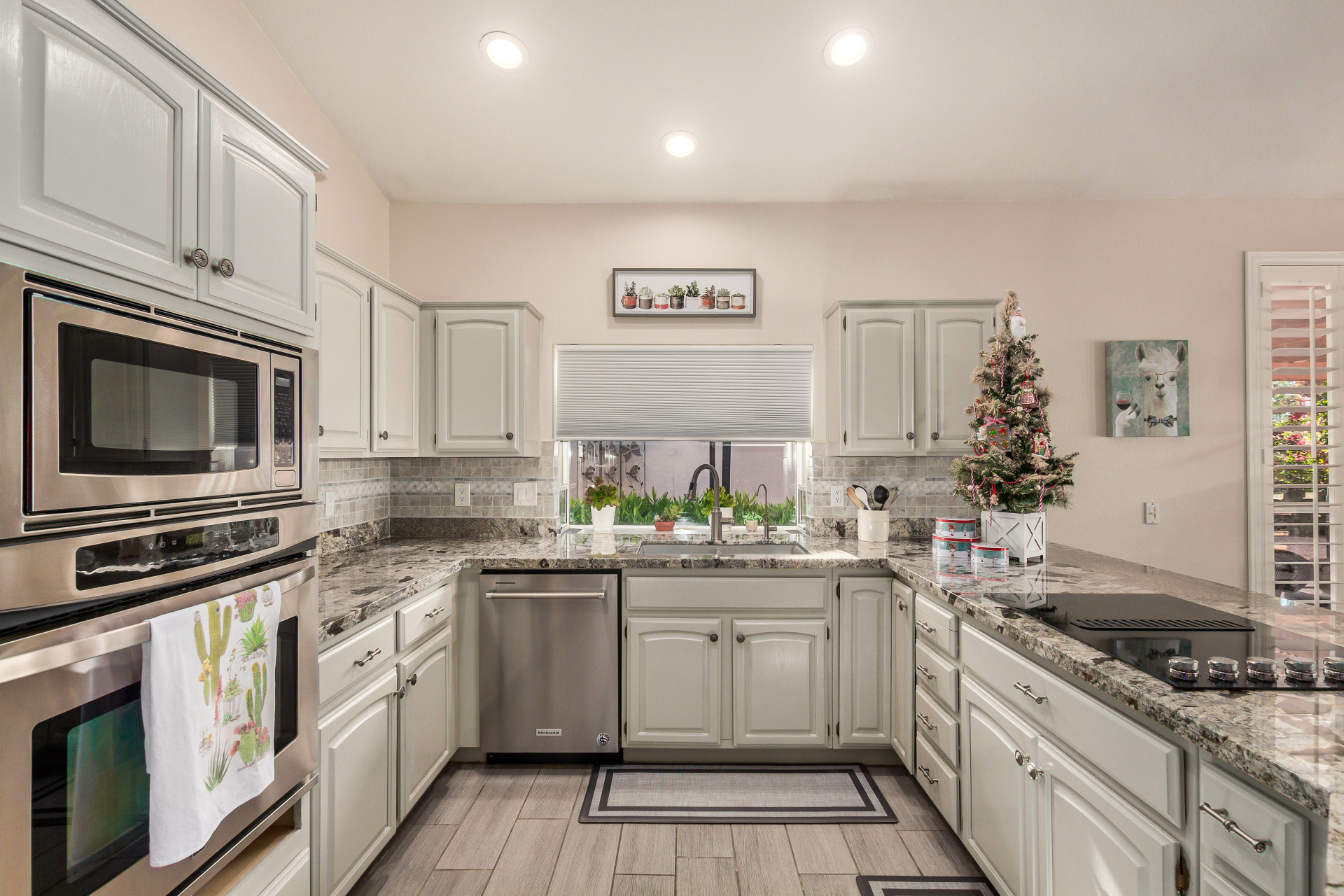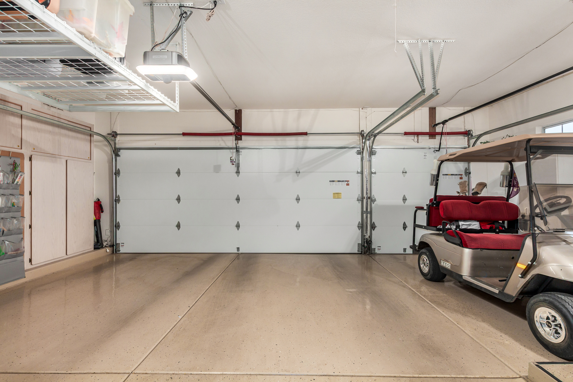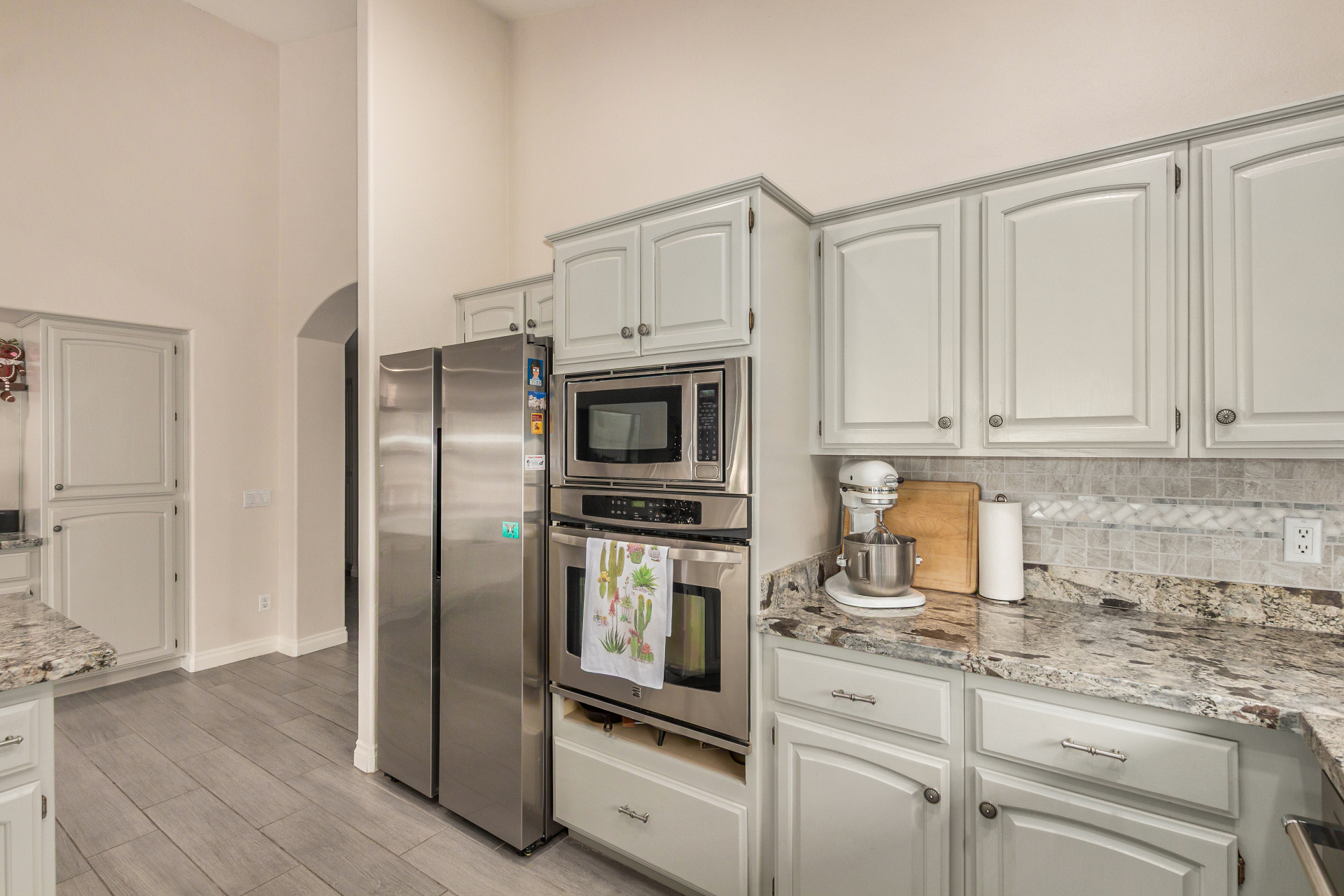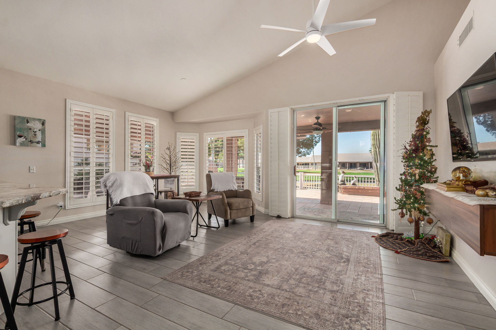 Beautifully maintained 2-bedroom home with a 3-car garage radiates style and comfort at every turn! Perfect for everyday living and entertaining, this light-filled home features an airy living and dining area anchored by a stunning floor-to-ceiling stone fireplace, plus a spacious great room bathed in natural light. Wood-look tile flooring, soaring vaulted ceilings, neutral tones, and plantation shutters are features you'll love. Recent upgrades include all-new interior paint, a new refrigerator, new garage doors, new garage door openers, and a roof replaced just two years ago. The spotless kitchen showcases ample cabinetry with crown molding, stainless steel appliances, a tile backsplash, granite countertops, and recessed lighting that brightens every corner.
