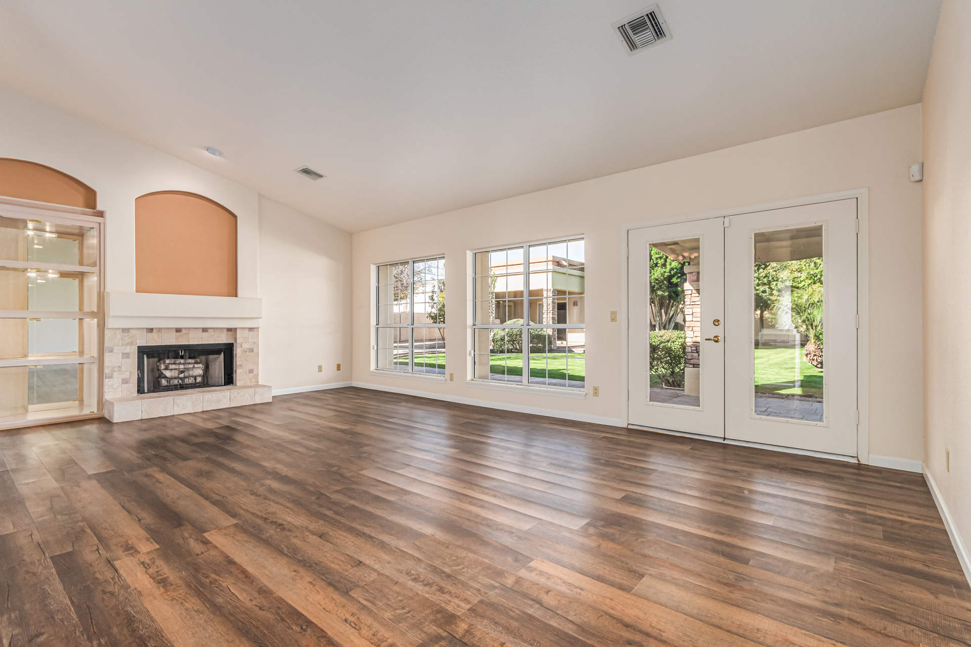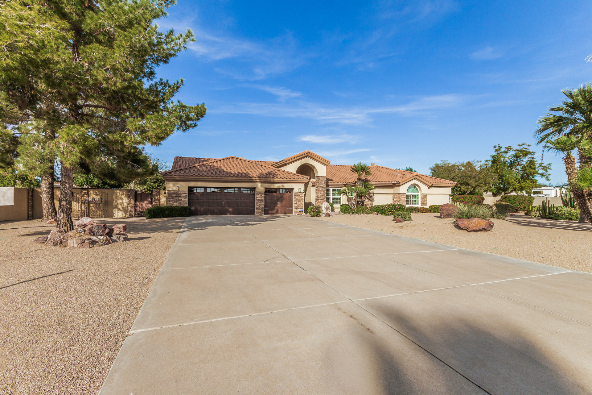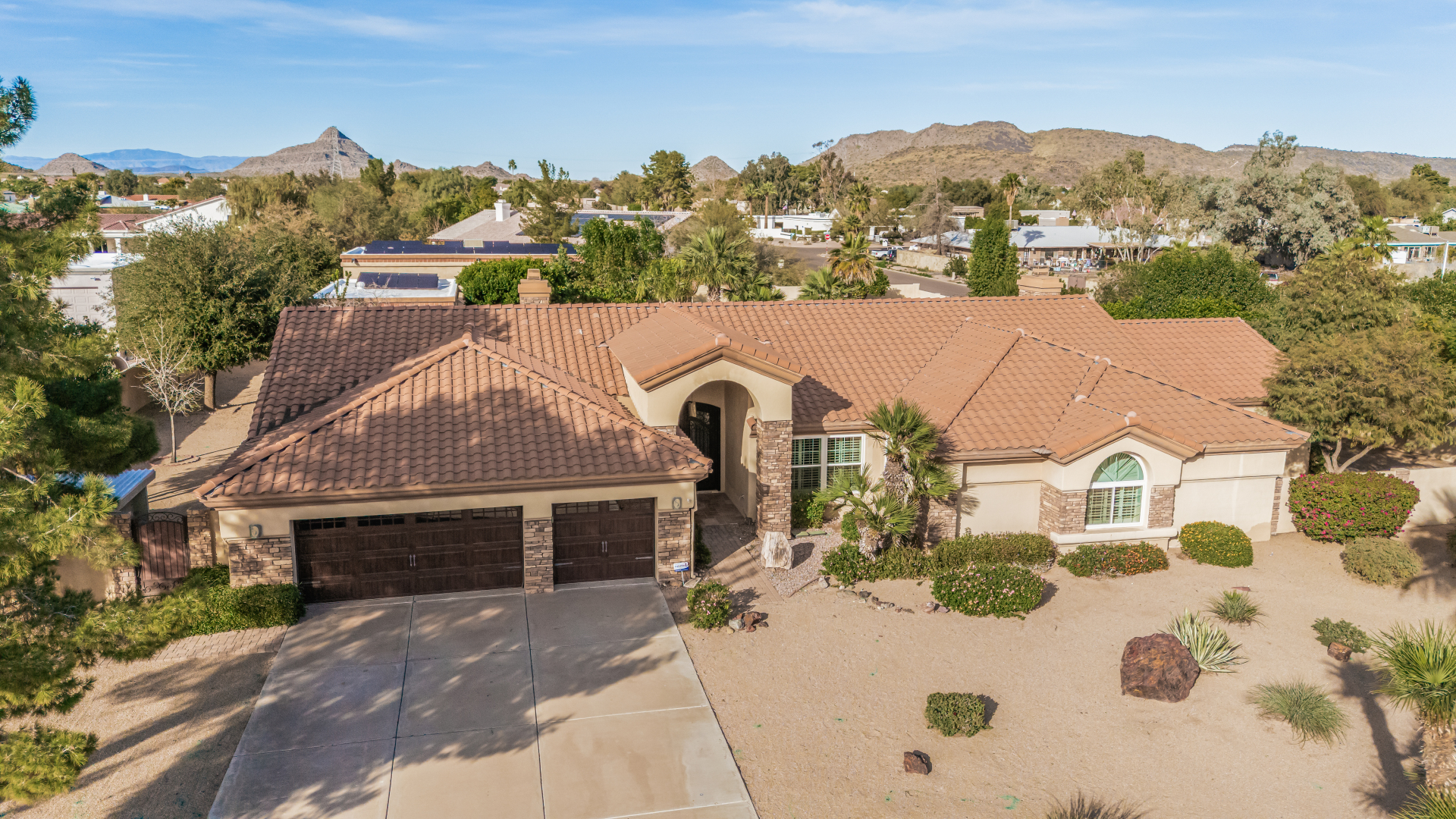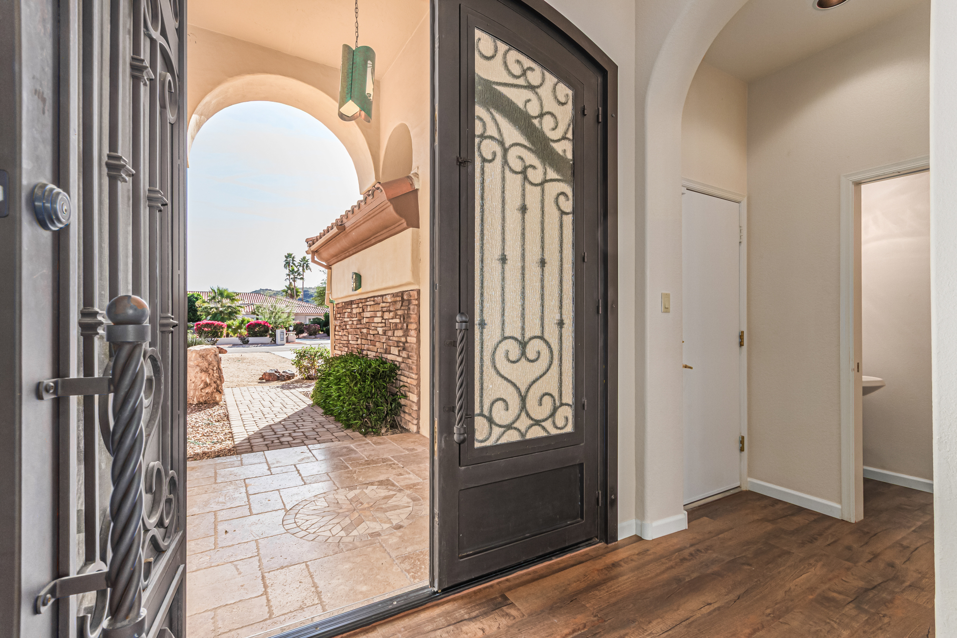 Impressive corner lot residence! Great curb appeal with a stone-accented façade, low-care desert landscaping, & extra-long driveway leading to a 3-car garage w/built-in cabinetry are just the beginning. An ironwork entry door & classic Roman pillars create a grand first impression! The main residence spans approximately 3,800 square feet, complemented by a detached 540-square-foot casita—ideal for guests or multigenerational living. Inside, wood flooring, neutral paint, plantation shutters, & vaulted ceilings enhance the refined atmosphere. You'll love the powder room, stylish dry bar, & elegant formal dining room. The living & family rooms, each with its own fireplace, are perfect for entertainment. Discover surround sound speakers in the family room!