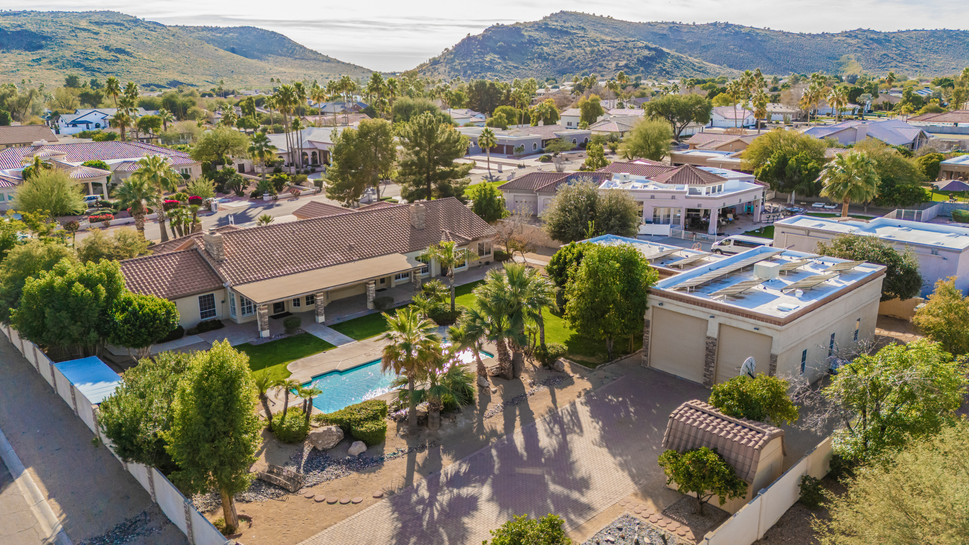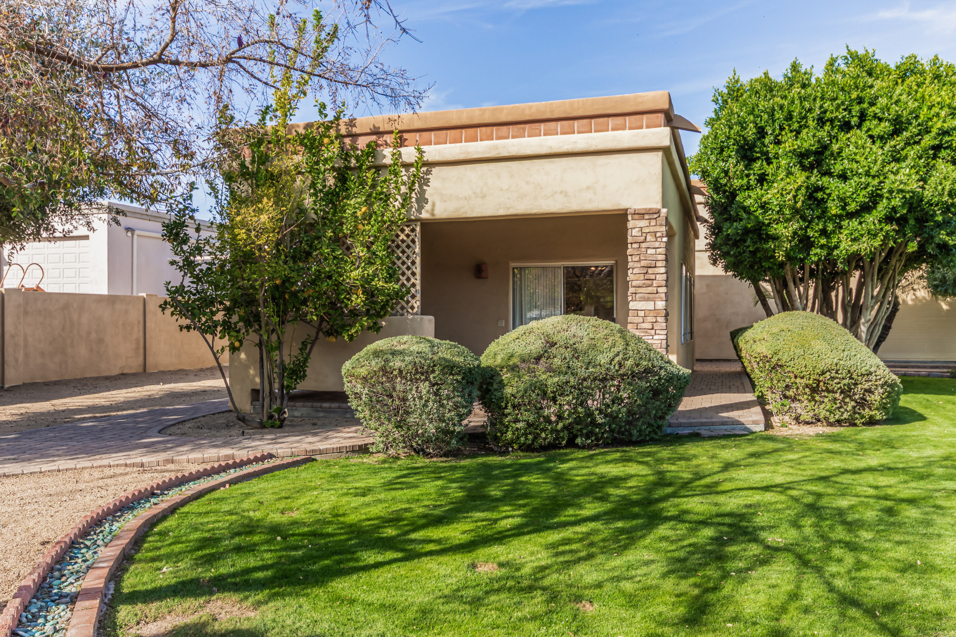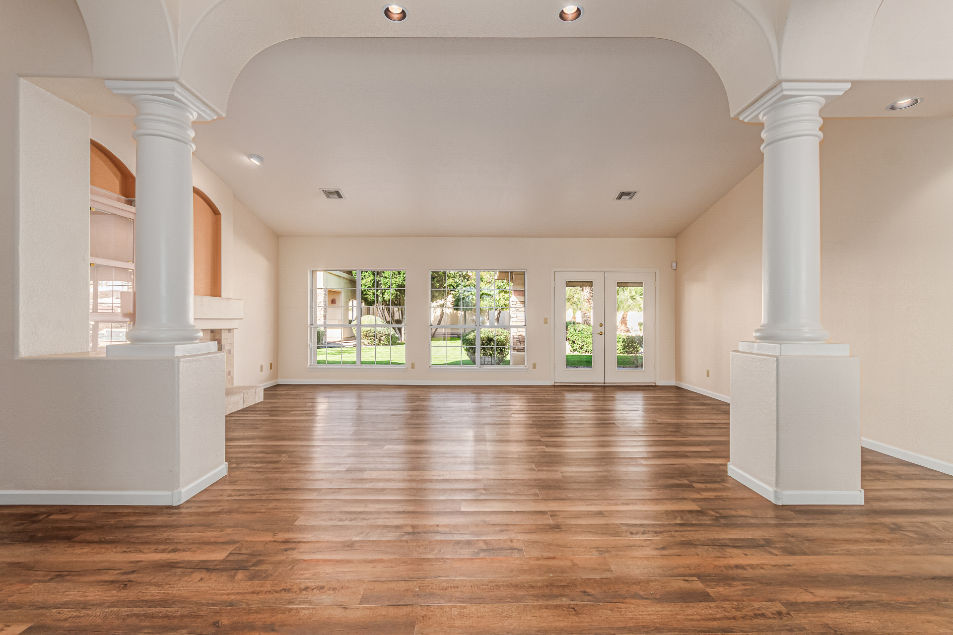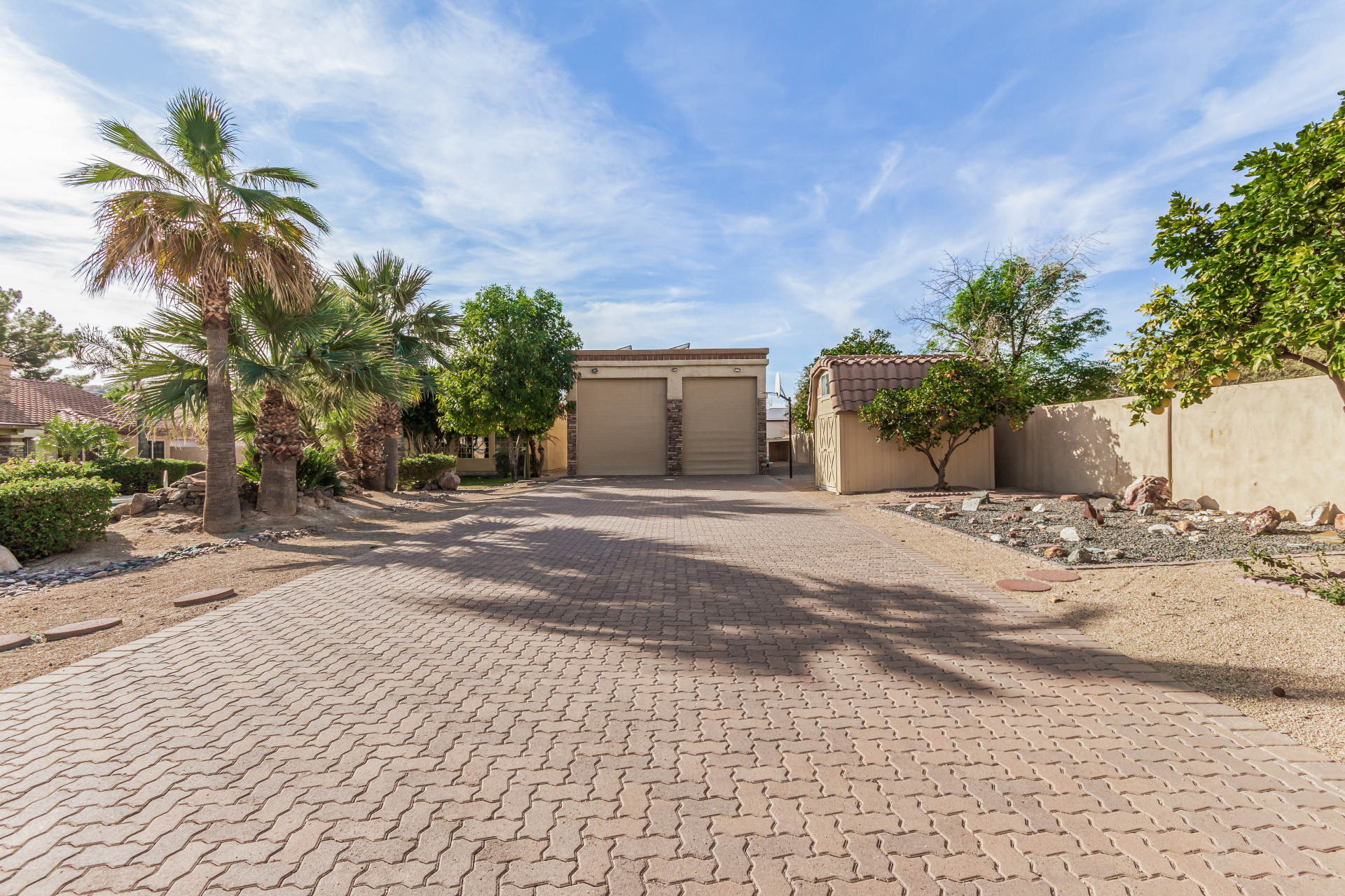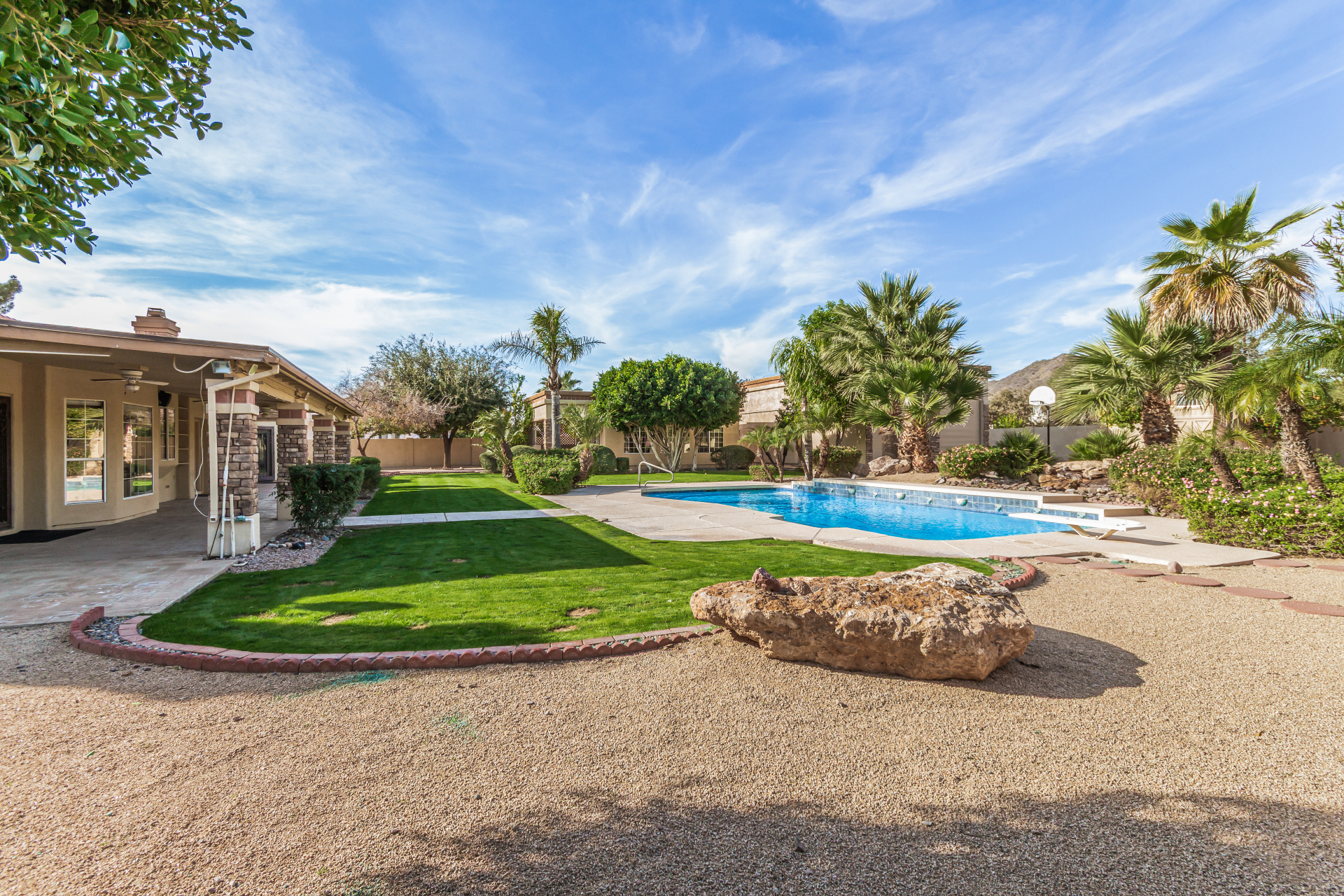 Impressive corner lot residence! Great curb appeal with a stone-accented façade, low-care desert landscaping, & extra-long driveway leading to a 3-car garage w/built-in cabinetry are just the beginning. An ironwork entry door & classic Roman pillars create a grand first impression! The main residence spans approximately 3,800 square feet, complemented by a detached 540-square-foot casita—ideal for guests or multigenerational living. Inside, wood flooring, neutral paint, plantation shutters, & vaulted ceilings enhance the refined atmosphere. You'll love the powder room, stylish dry bar, & elegant formal dining room. The living & family rooms, each with its own fireplace, are perfect for entertainment. Discover surround sound speakers in the family room!