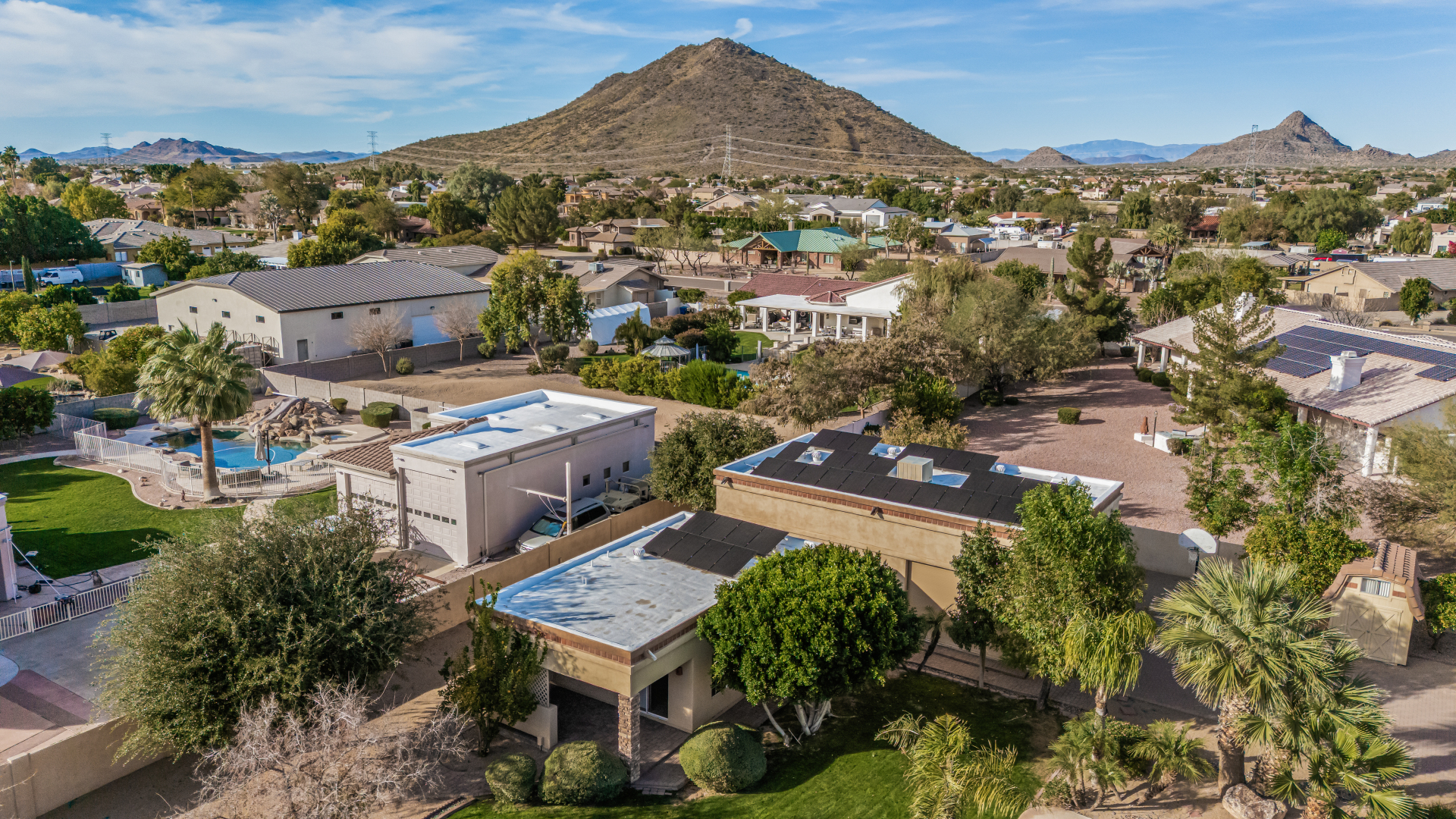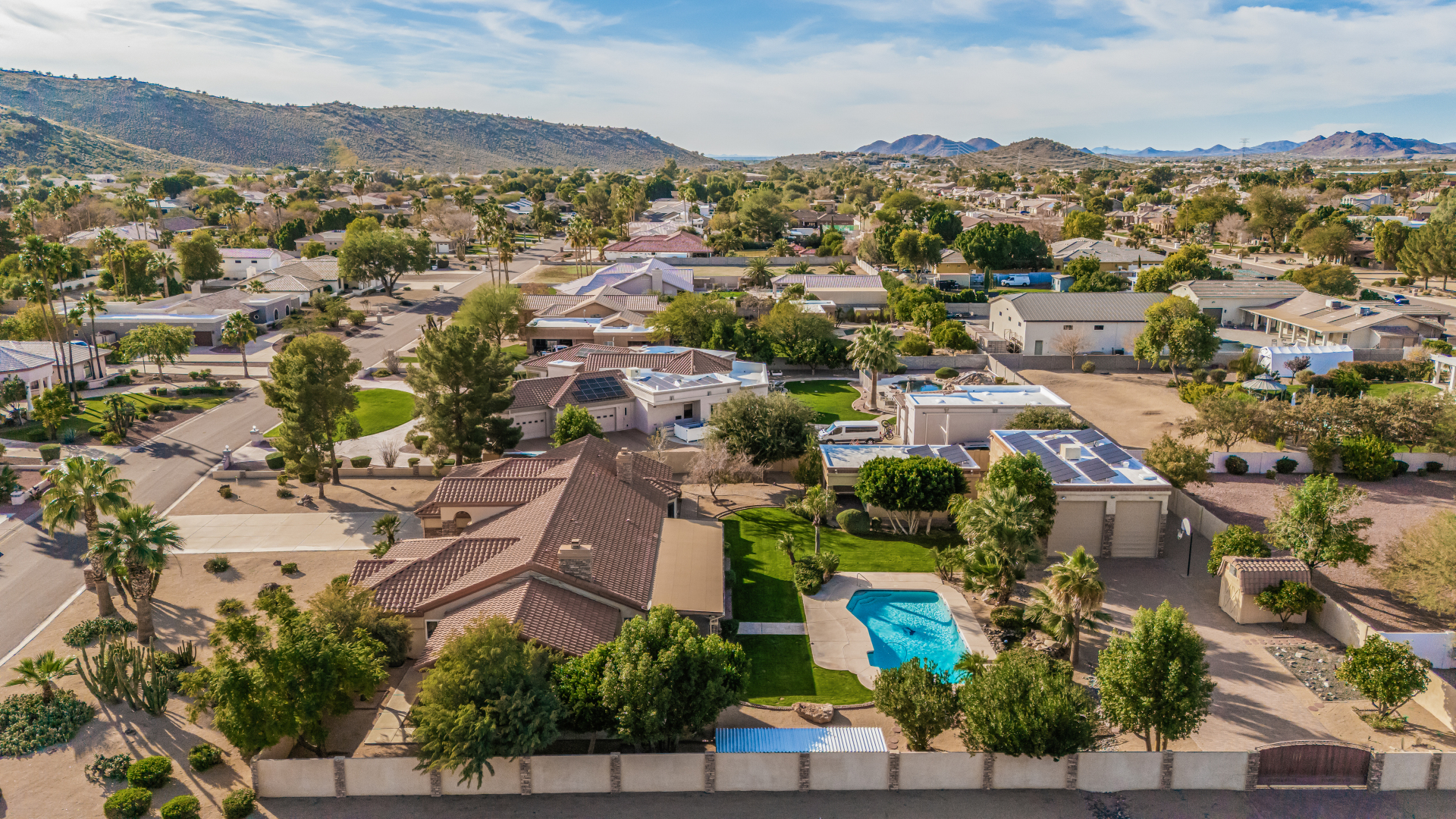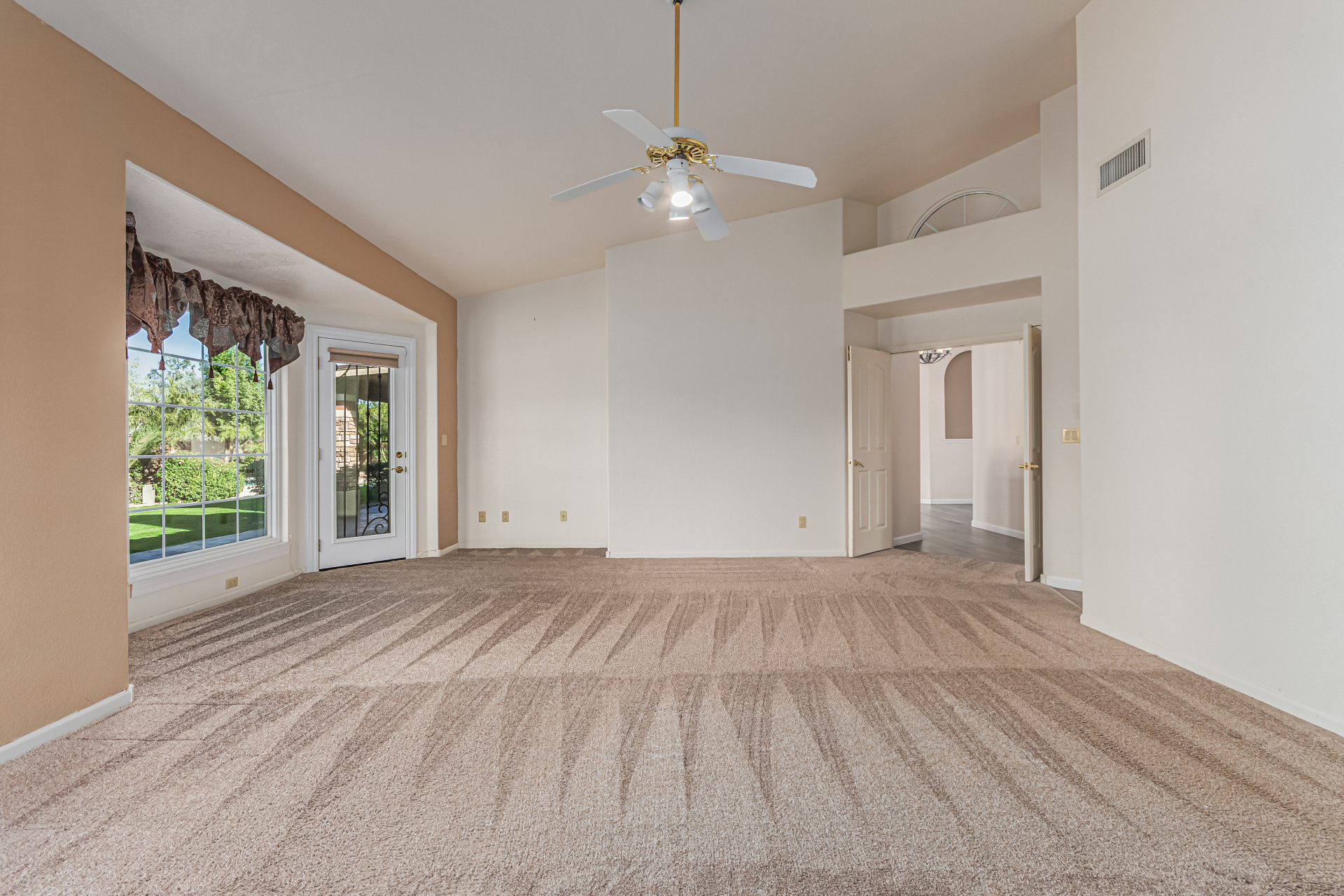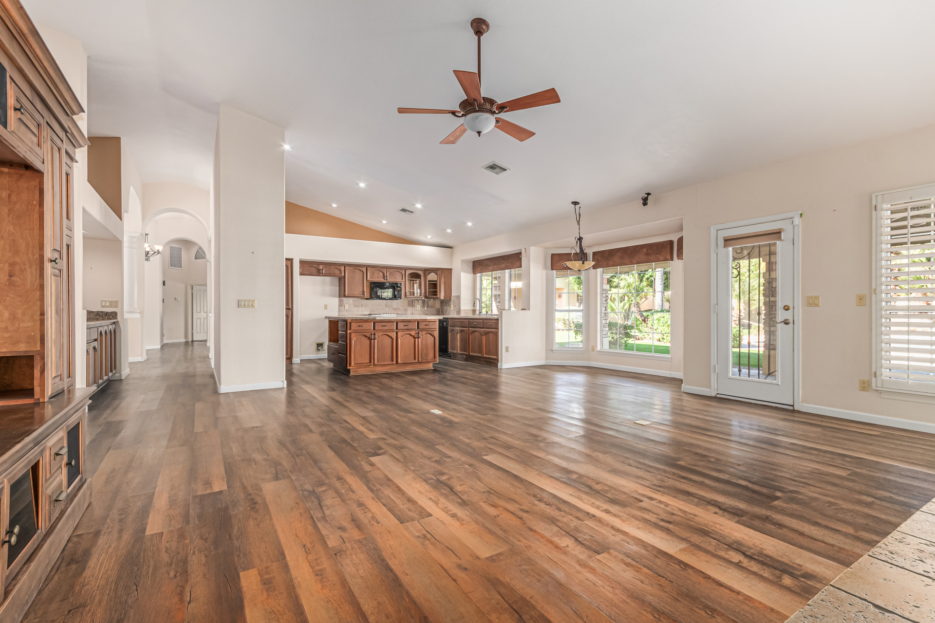 Impressive corner lot residence! Great curb appeal with a stone-accented façade, low-care desert landscaping, & extra-long driveway leading to a 3-car garage w/built-in cabinetry are just the beginning. An ironwork entry door & classic Roman pillars create a grand first impression! The main residence spans approximately 3,800 square feet, complemented by a detached 540-square-foot casita—ideal for guests or multigenerational living. Inside, wood flooring, neutral paint, plantation shutters, & vaulted ceilings enhance the refined atmosphere. You'll love the powder room, stylish dry bar, & elegant formal dining room. The living & family rooms, each with its own fireplace, are perfect for entertainment. Discover surround sound speakers in the family room!