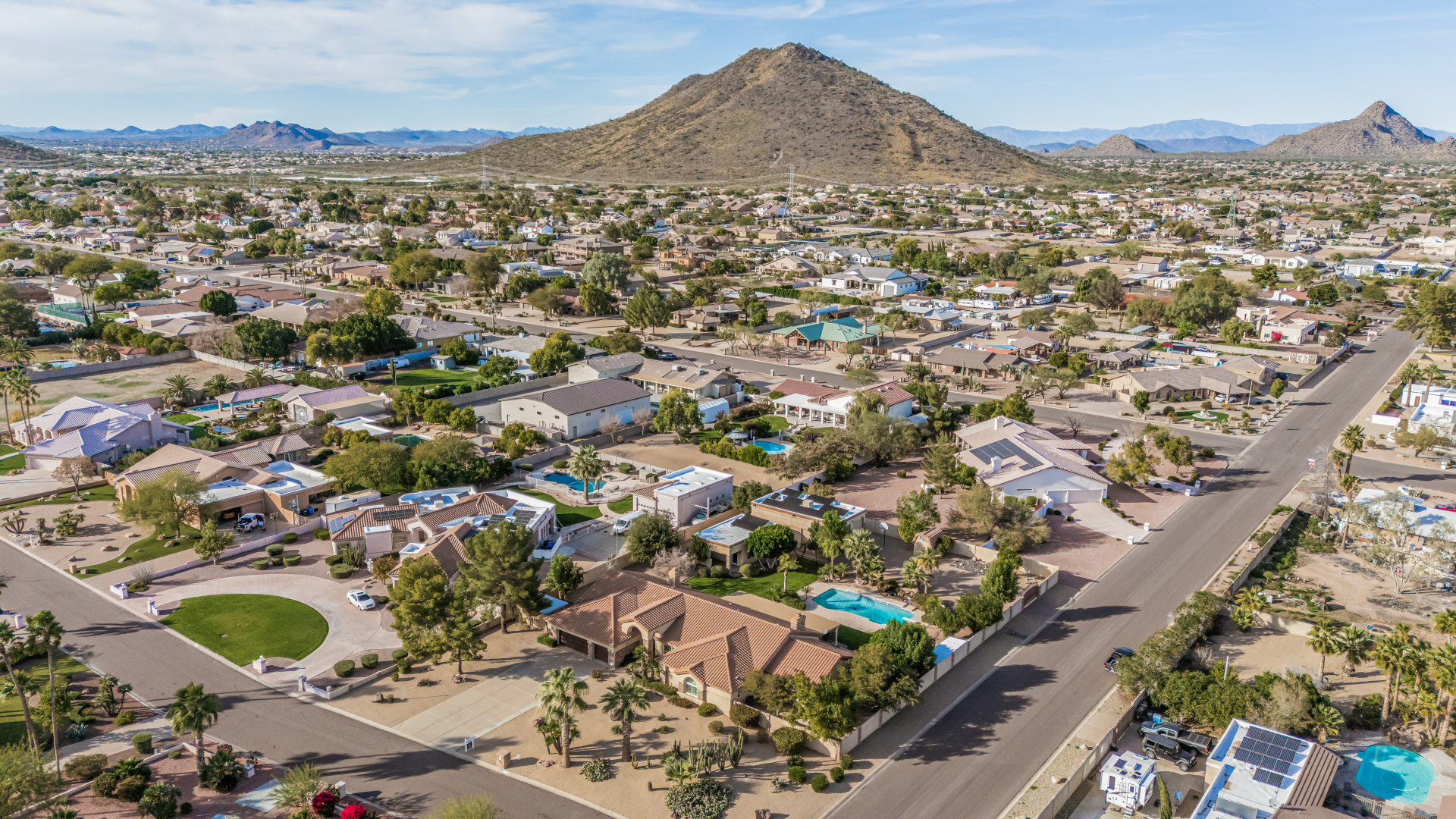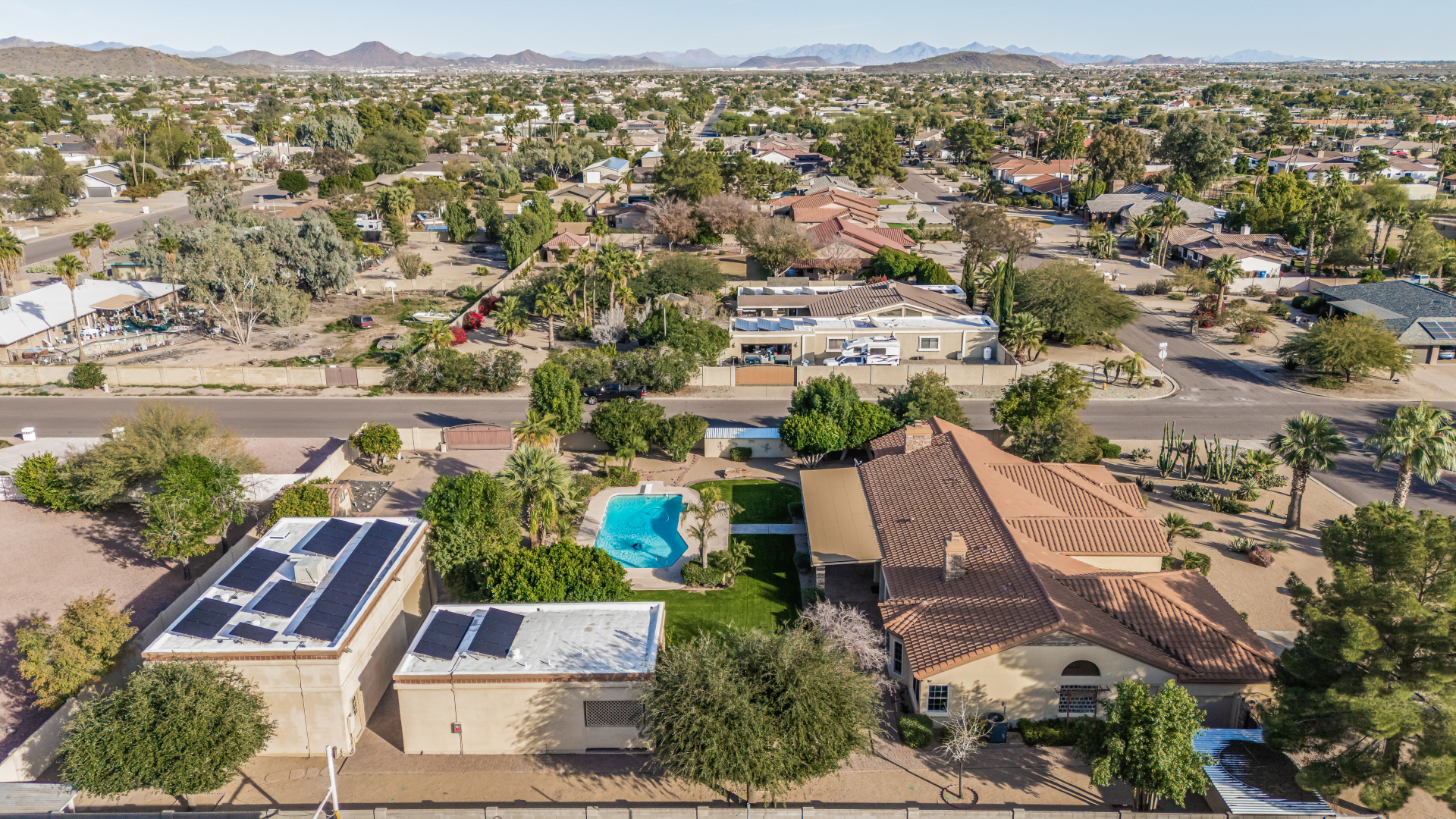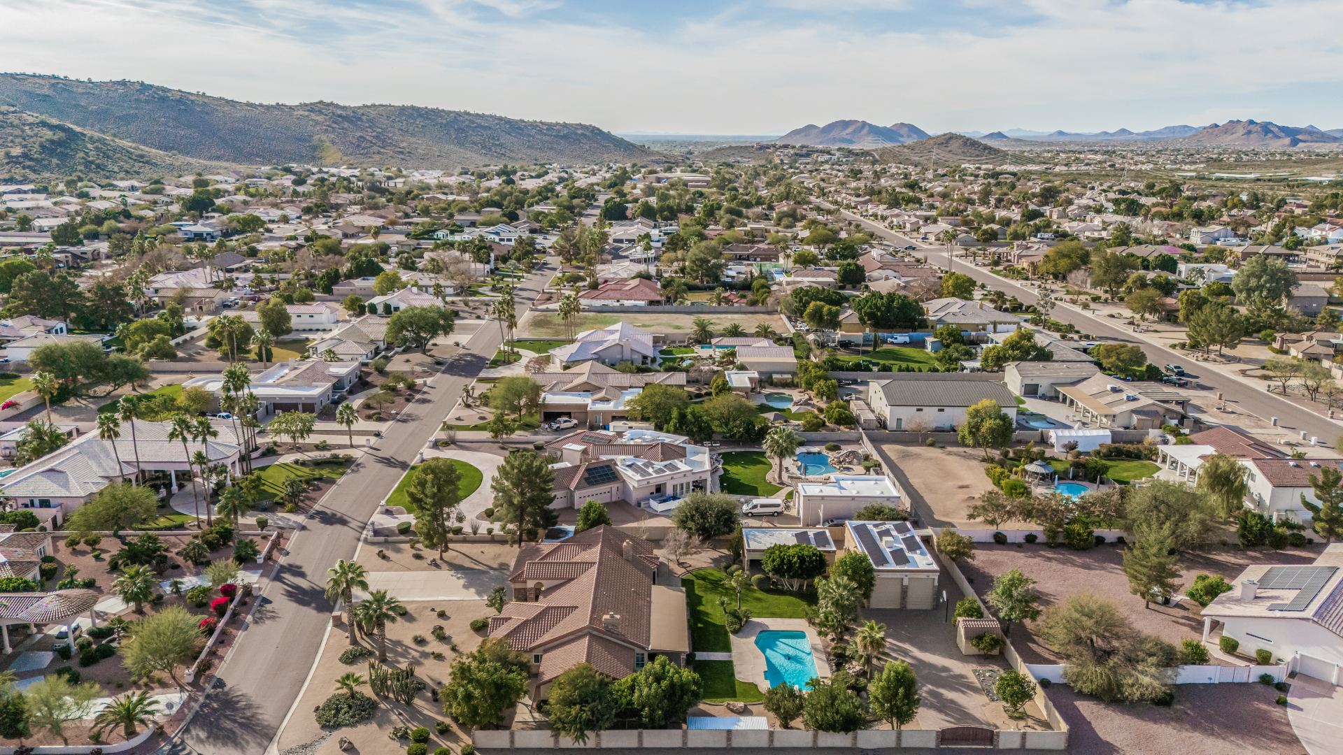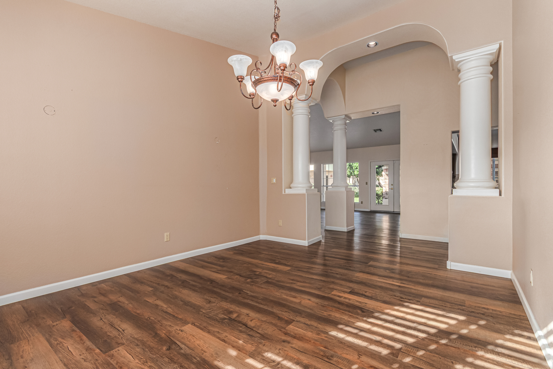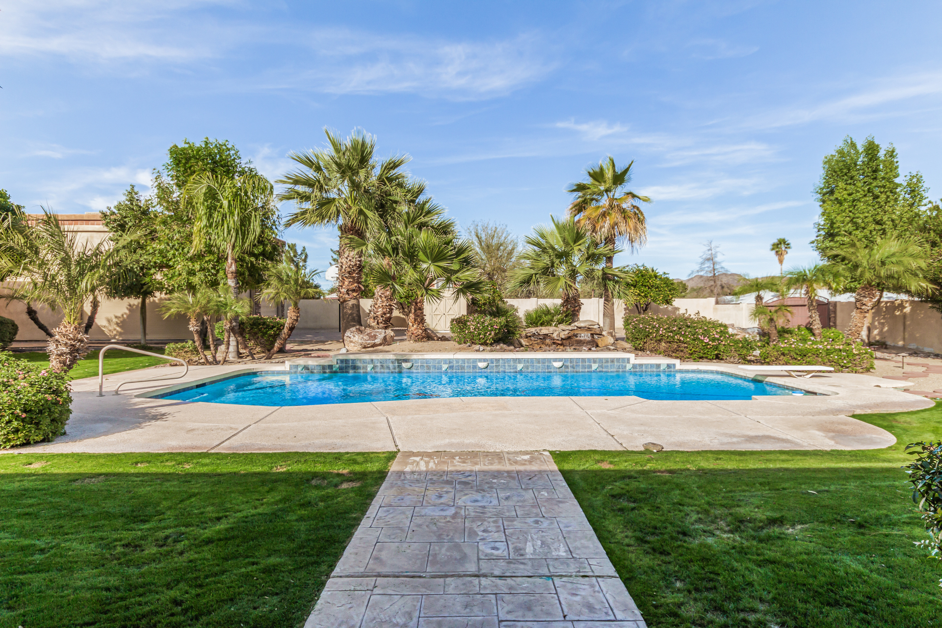 Impressive corner lot residence! Great curb appeal with a stone-accented façade, low-care desert landscaping, & extra-long driveway leading to a 3-car garage w/built-in cabinetry are just the beginning. An ironwork entry door & classic Roman pillars create a grand first impression! The main residence spans approximately 3,800 square feet, complemented by a detached 540-square-foot casita—ideal for guests or multigenerational living. Inside, wood flooring, neutral paint, plantation shutters, & vaulted ceilings enhance the refined atmosphere. You'll love the powder room, stylish dry bar, & elegant formal dining room. The living & family rooms, each with its own fireplace, are perfect for entertainment. Discover surround sound speakers in the family room!