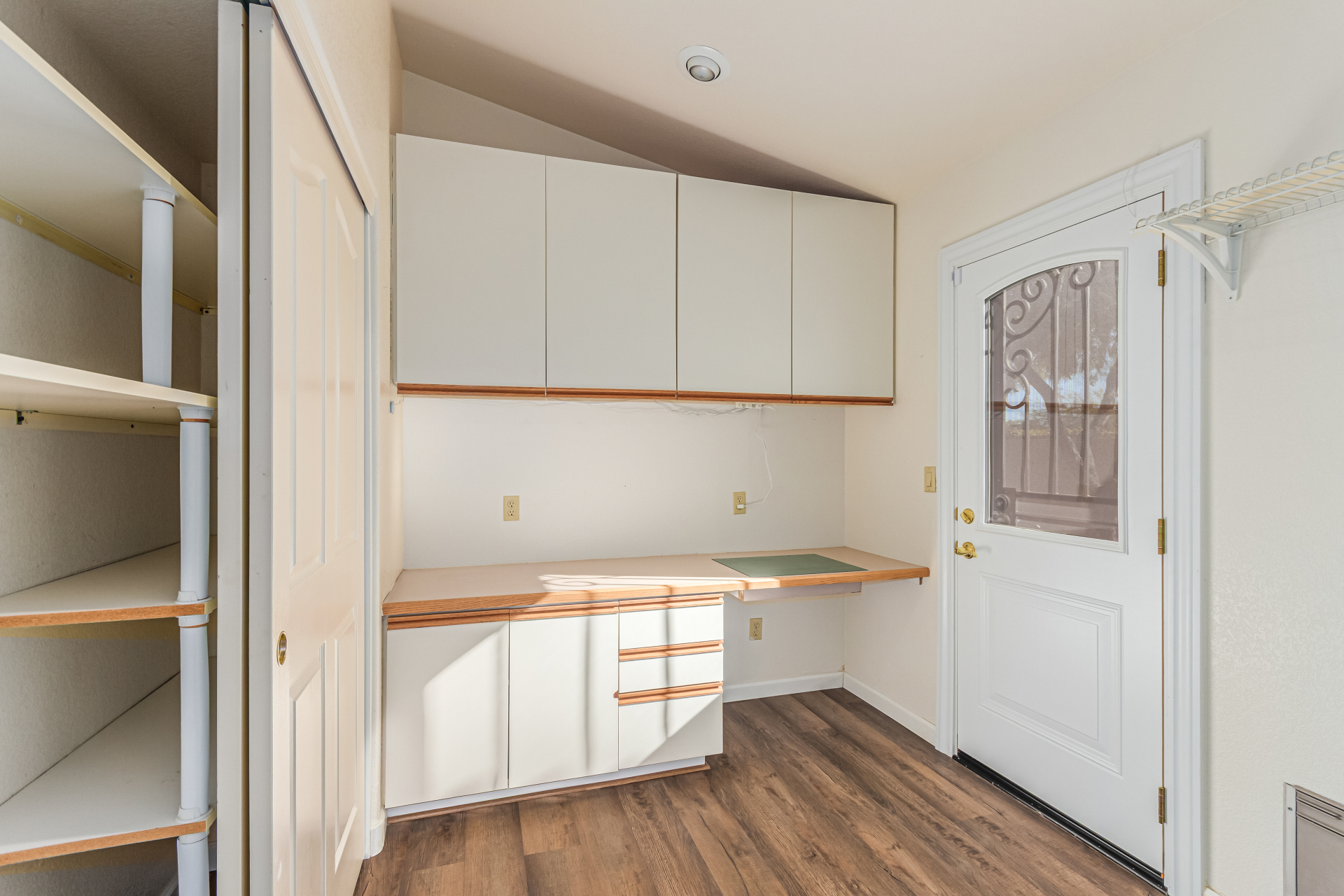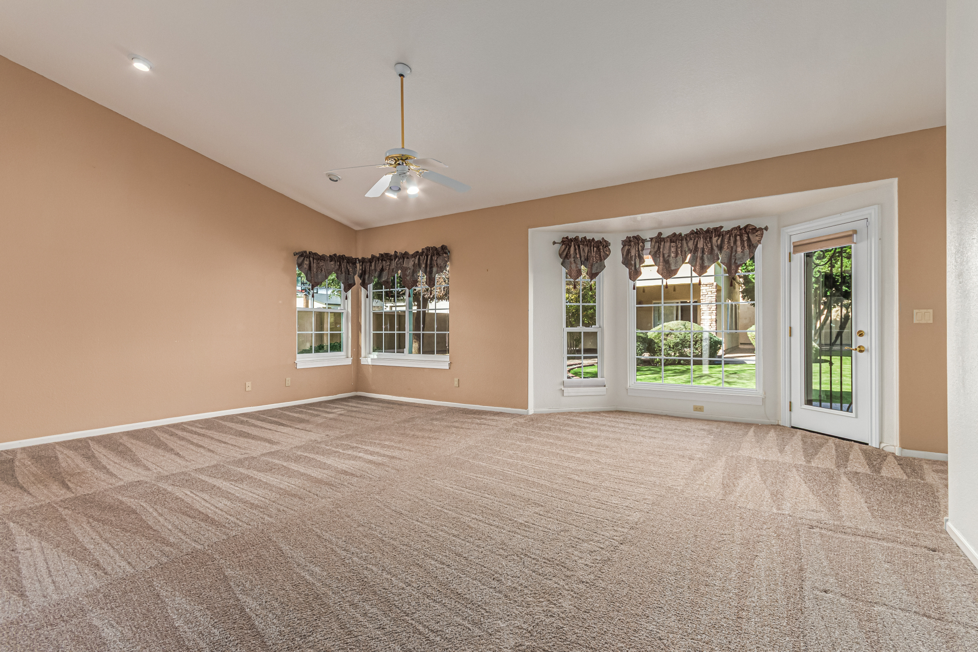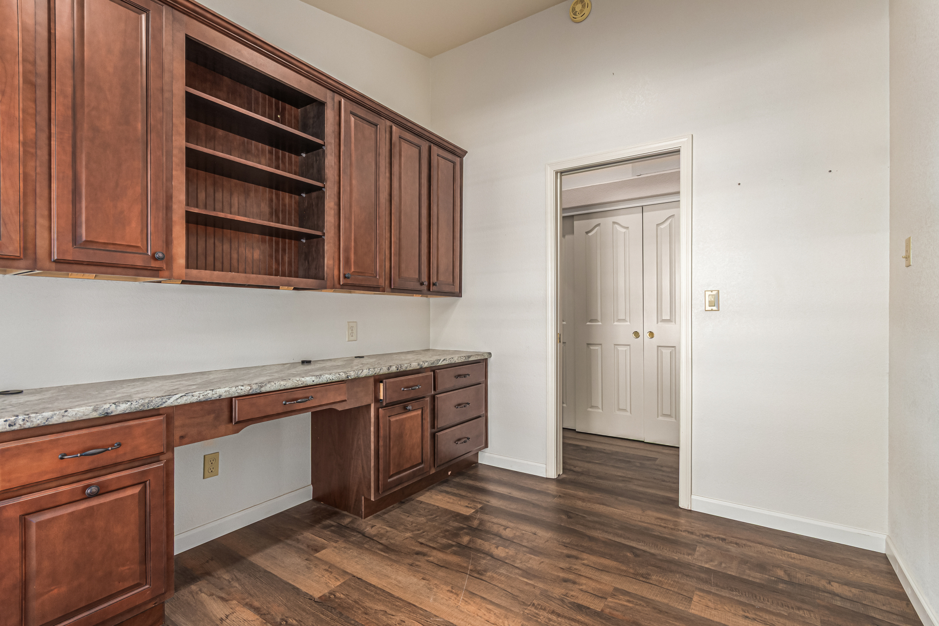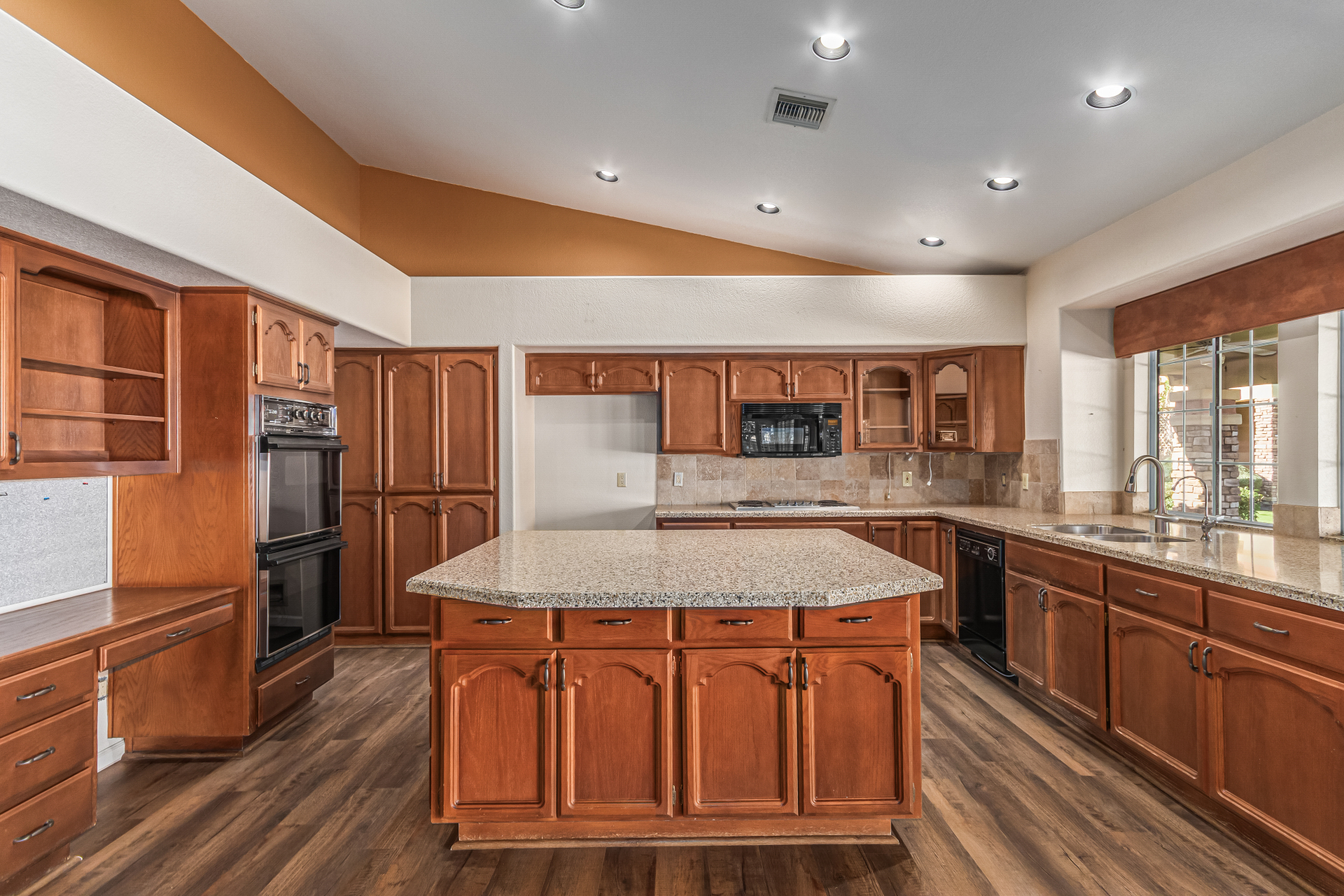 Impressive corner lot residence! Great curb appeal with a stone-accented façade, low-care desert landscaping, & extra-long driveway leading to a 3-car garage w/built-in cabinetry are just the beginning. An ironwork entry door & classic Roman pillars create a grand first impression! The main residence spans approximately 3,800 square feet, complemented by a detached 540-square-foot casita—ideal for guests or multigenerational living. Inside, wood flooring, neutral paint, plantation shutters, & vaulted ceilings enhance the refined atmosphere. You'll love the powder room, stylish dry bar, & elegant formal dining room. The living & family rooms, each with its own fireplace, are perfect for entertainment. Discover surround sound speakers in the family room!