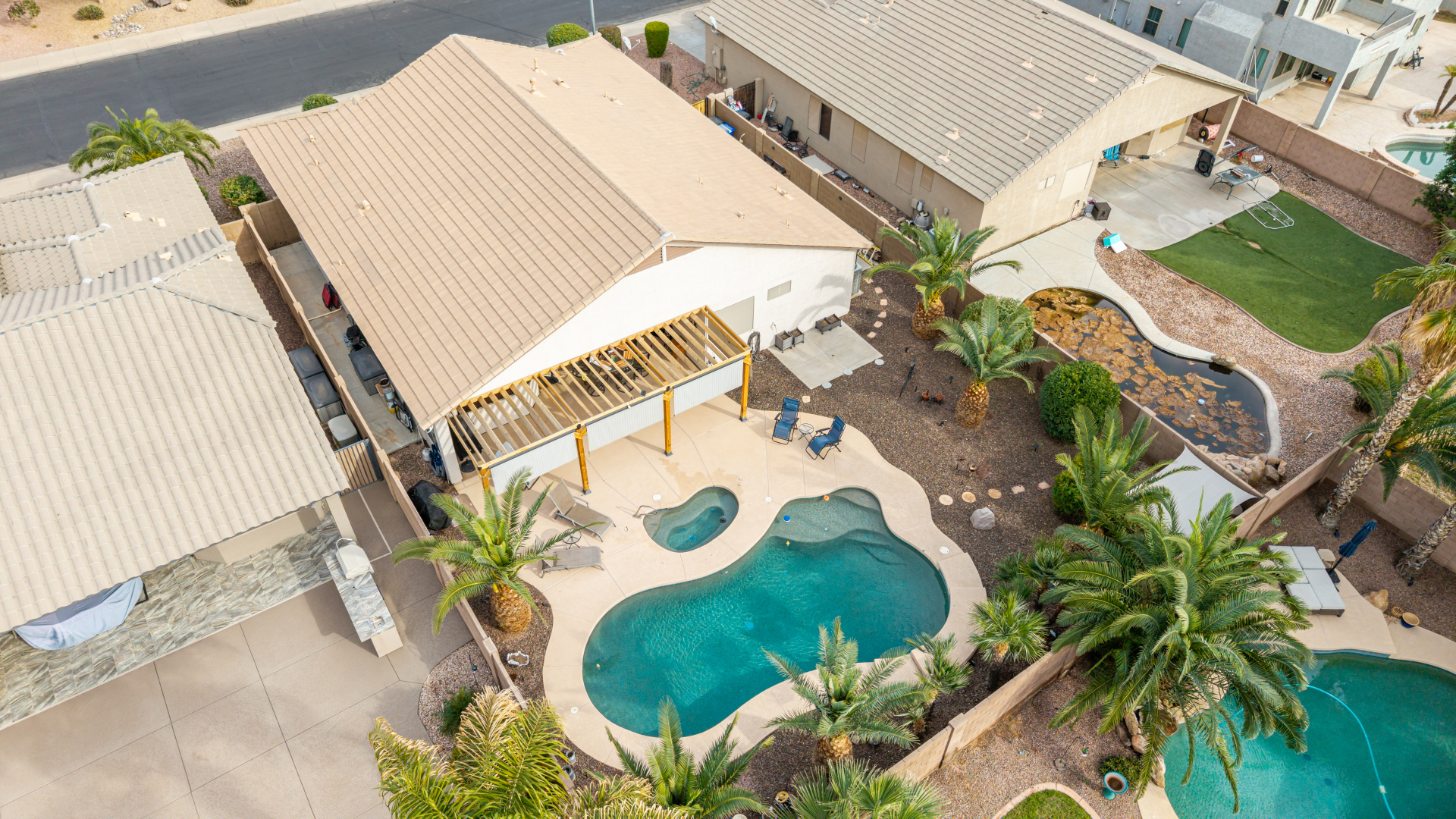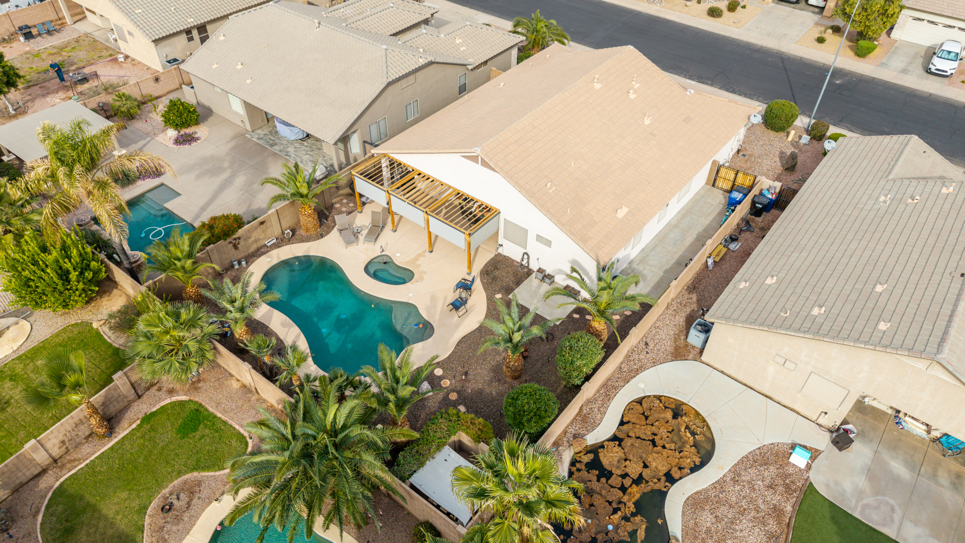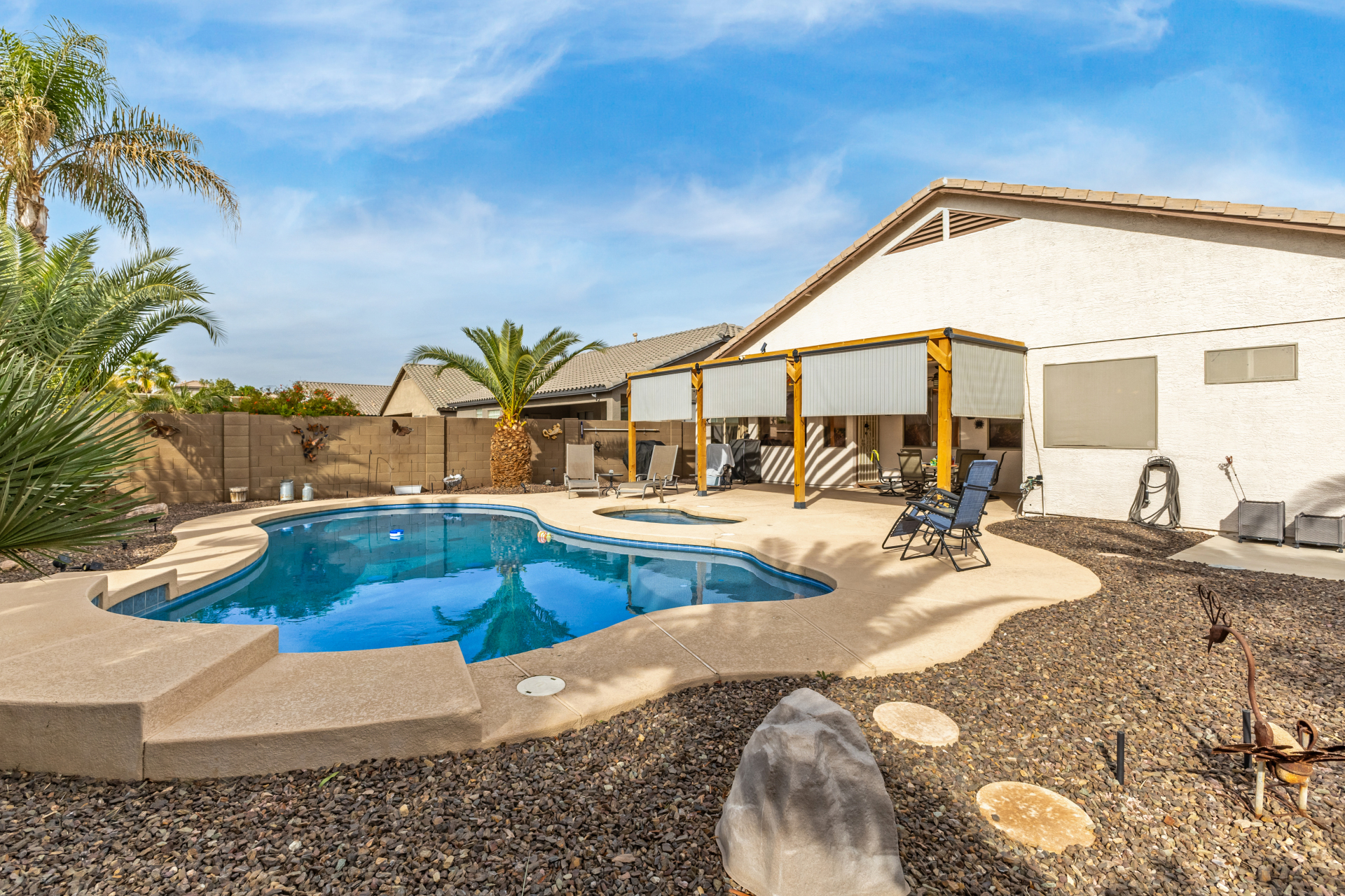 Charming 3-bedroom home with pool! Explore the bright & inviting layout, showcasing tile flooring, plenty of natural light, and a soothing palette that creates a cozy ambiance throughout. The well-appointed kitchen features staggered cabinets with crown molding, spacious counters, SS appliances, and an island, for those quick meals and casual conversations. Get a good night's rest in the primary retreat, offering a closet and a full bathroom with double sinks. You'll love the extra living space with a bonus room and a den-create your ideal home office or creative area! Out back, your oasis awaits, complete with a covered patio with an attached pergola, perfect for weekend grills and peaceful evenings, a relaxing spa, and a sparkling pool for a refreshing time! You don't want to miss it!