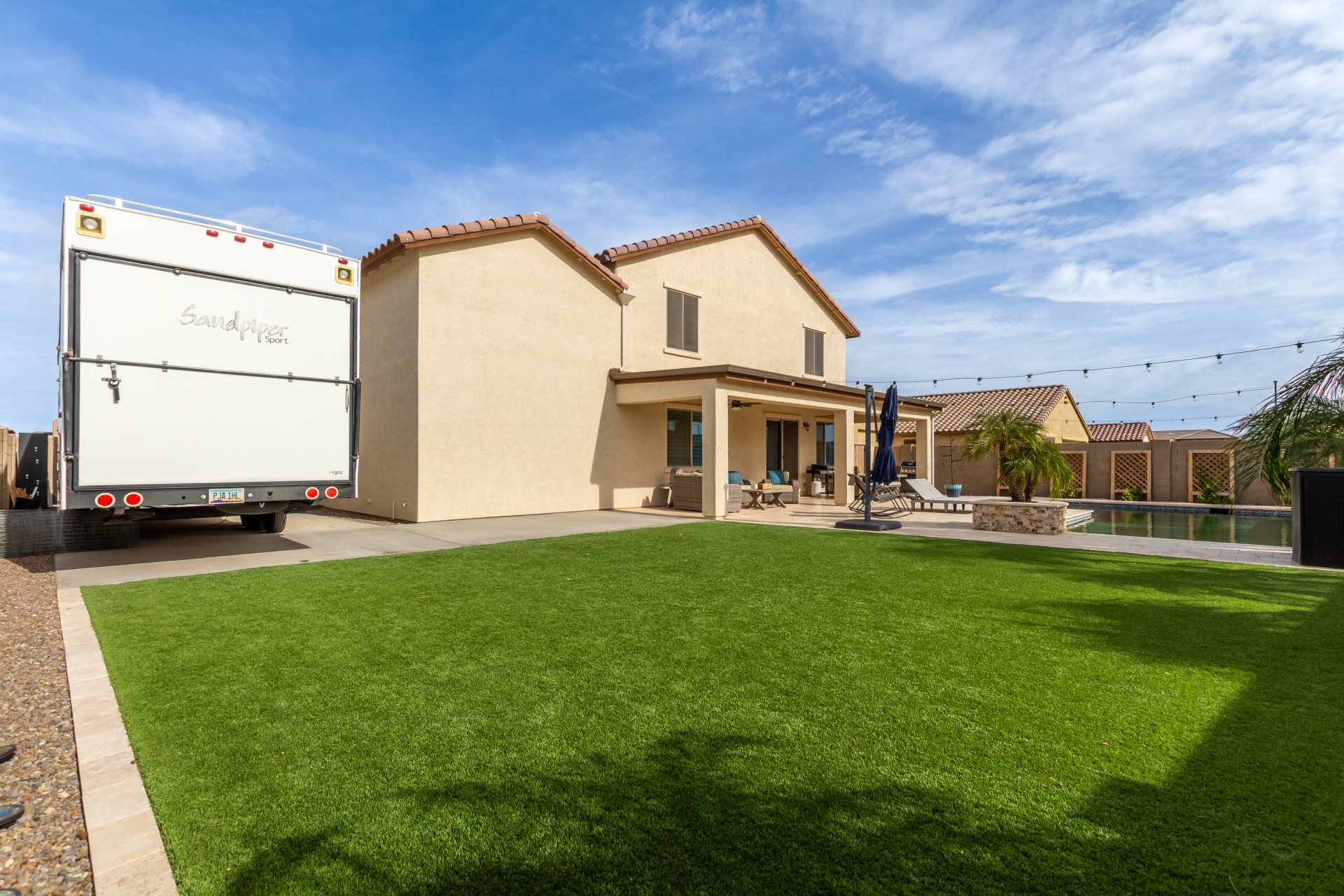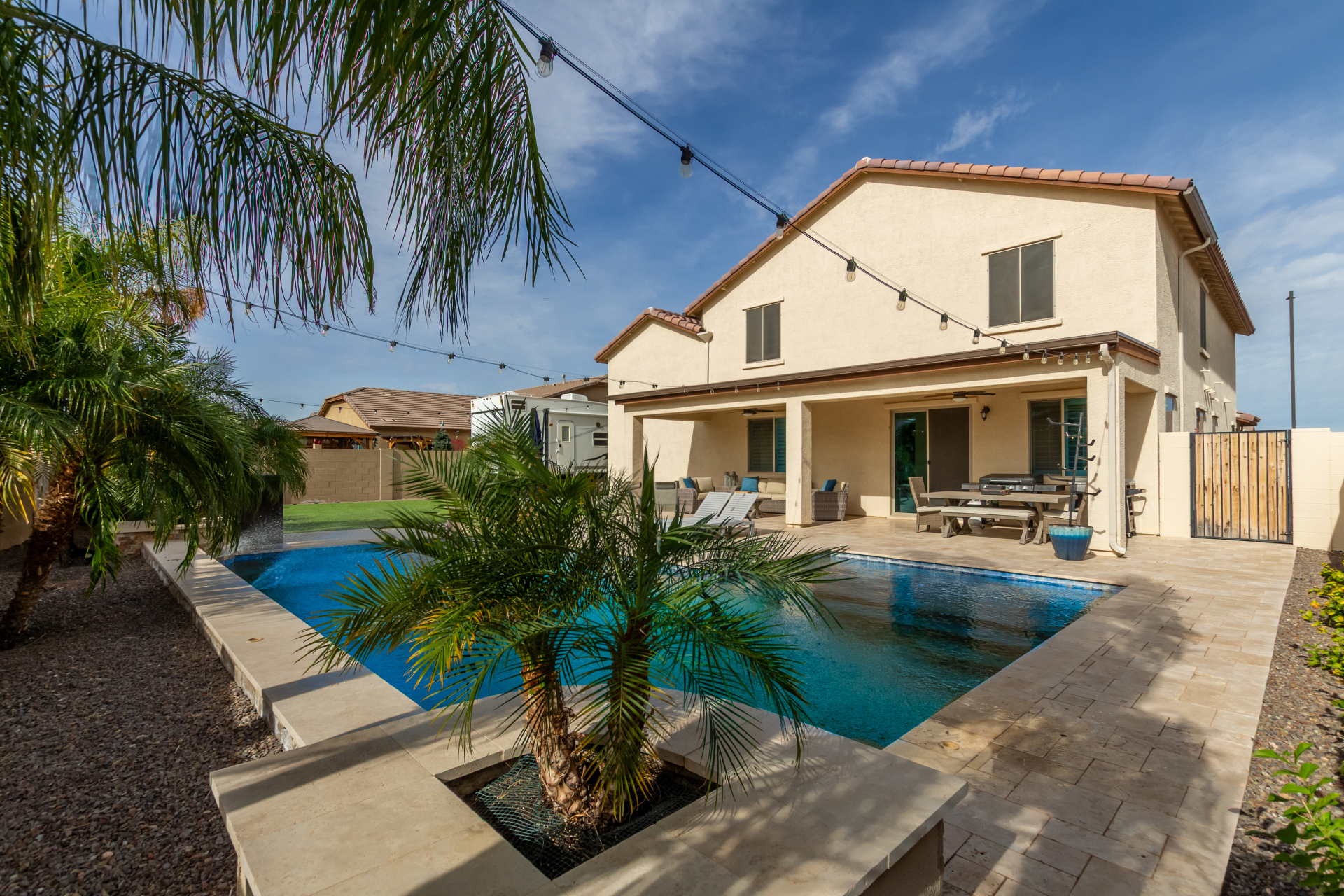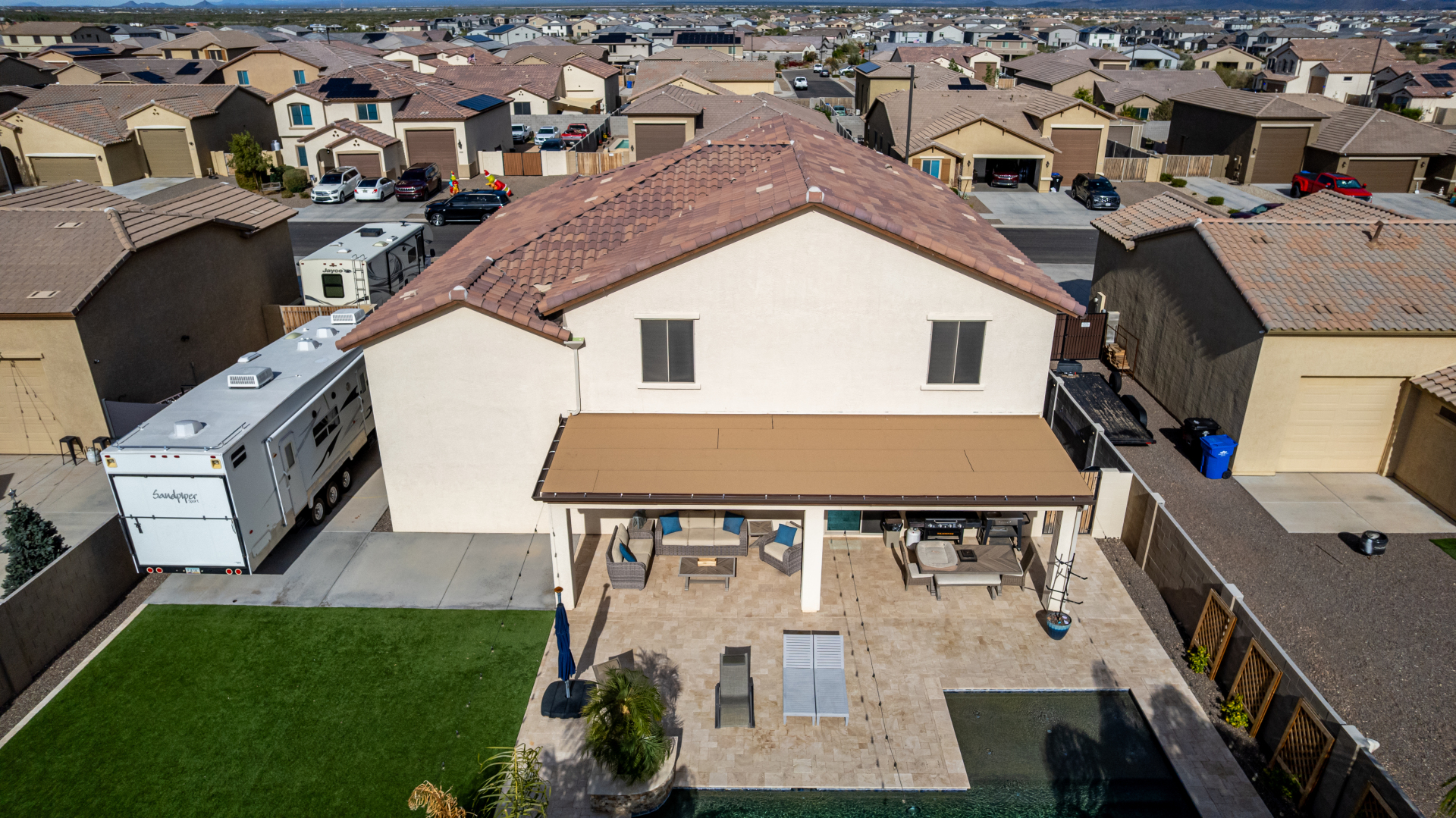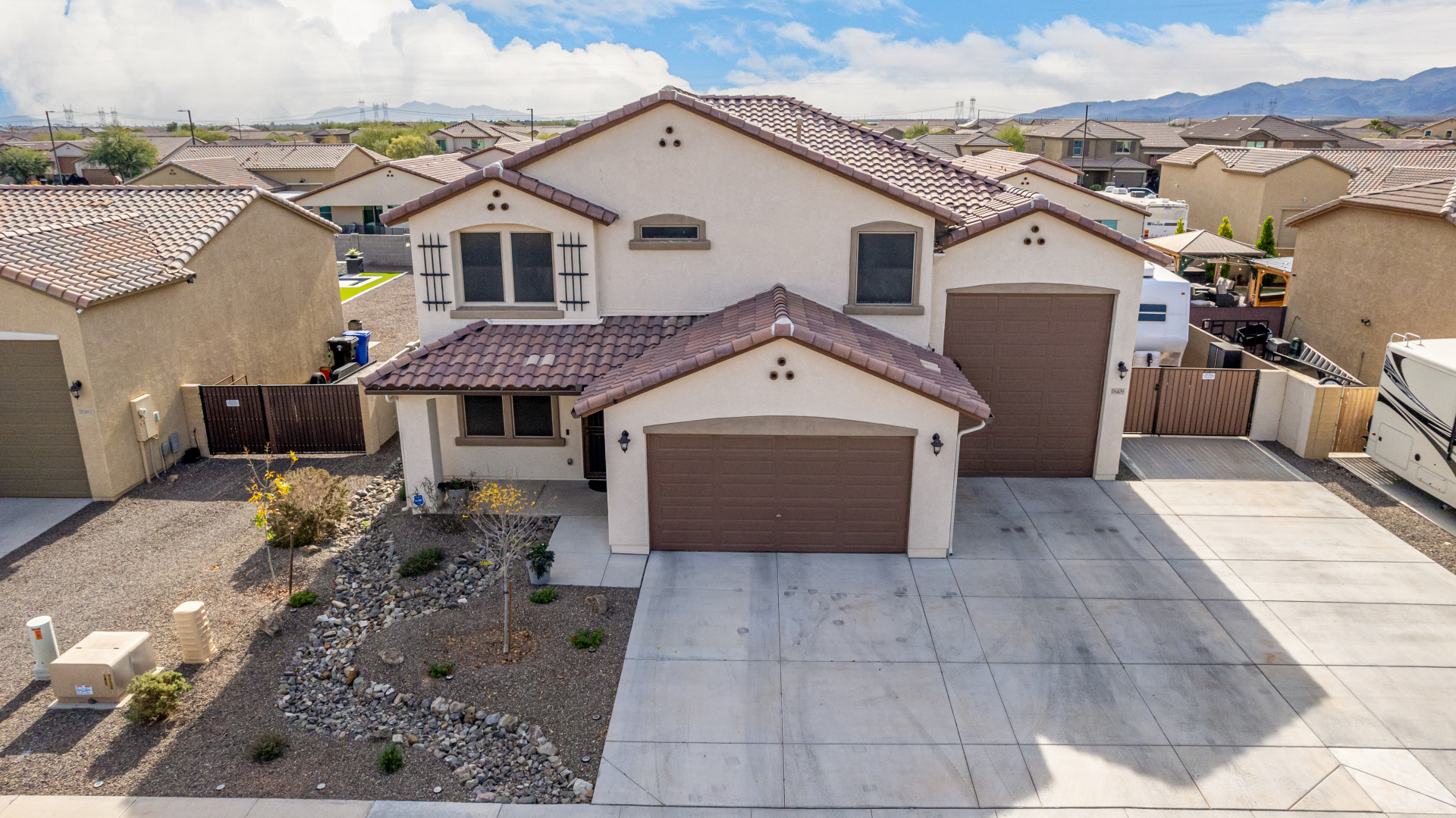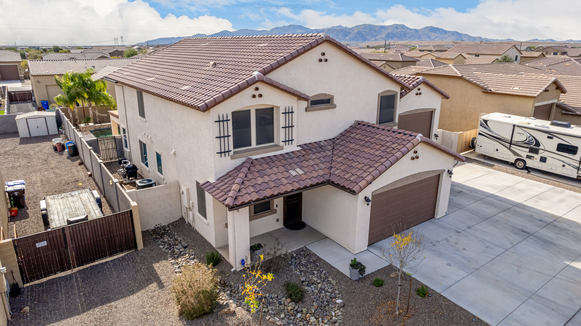 Enjoy luxury living in this exceptional 5BR, 3.5BA home designed for both comfort and functionality. The main level features the primary suite, offering convenience and privacy. Upstairs offers 4BR, all w/walk-in closets and a spacious loft for extra hang-out space. The backyard is ideal for entertaining, featuring a pebble sheen pool with a Baja deck, travertine decking, a covered patio, and low-maintenance synthetic turf. A standout feature is the 14.5' x 47.5' RV garage w/16-foot ceilings, partially insulated, and dual mini-split systems and an attached two-car garage with built-in cabinets and epoxy flooring. Other highlights include upgraded vinyl flooring, shutters, sun screens, and enhanced baseboards throughout. There are too many features to note- schedule your showing today!