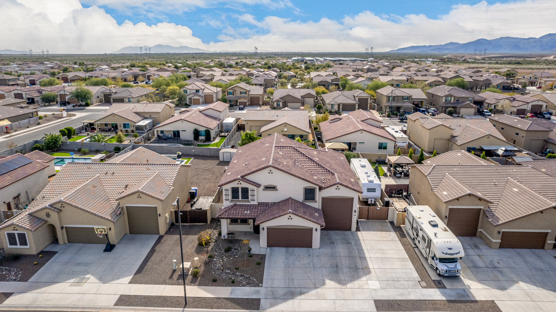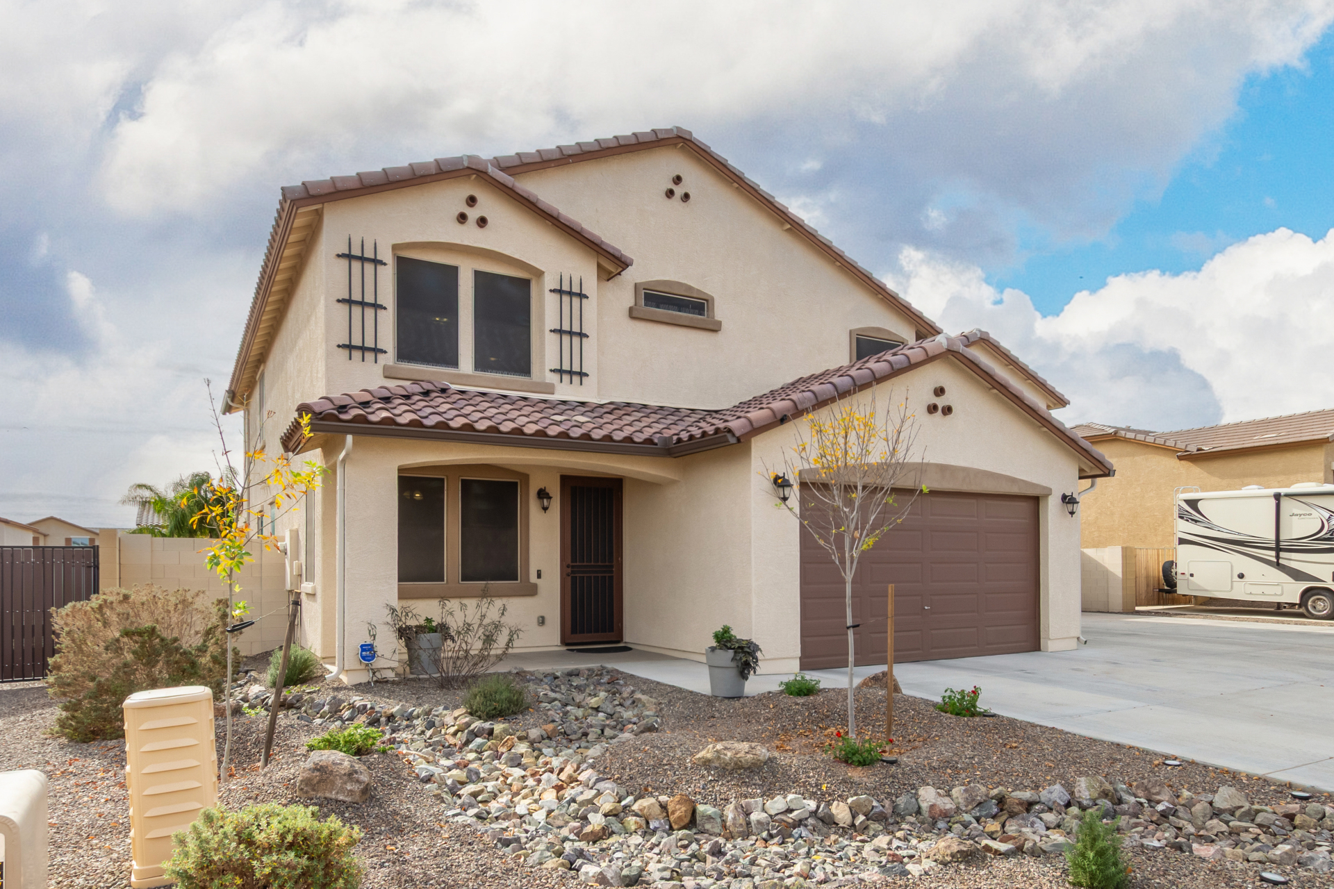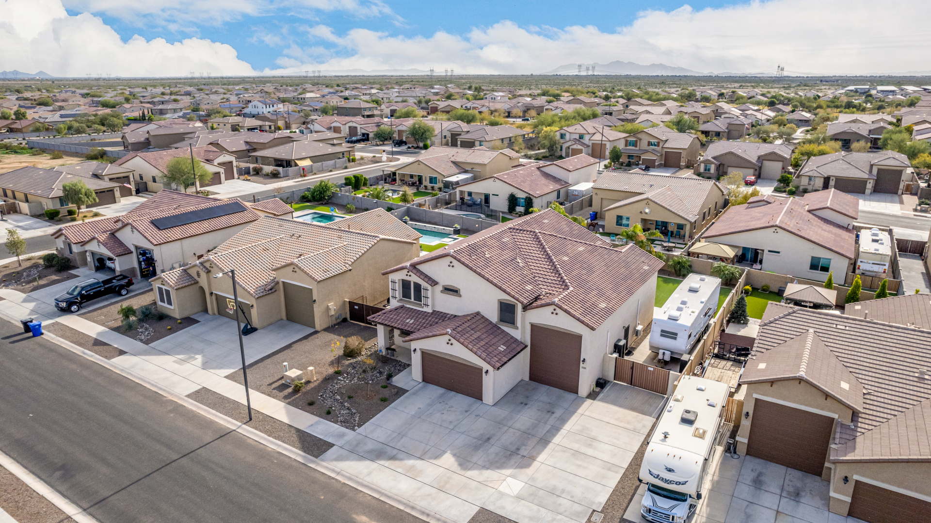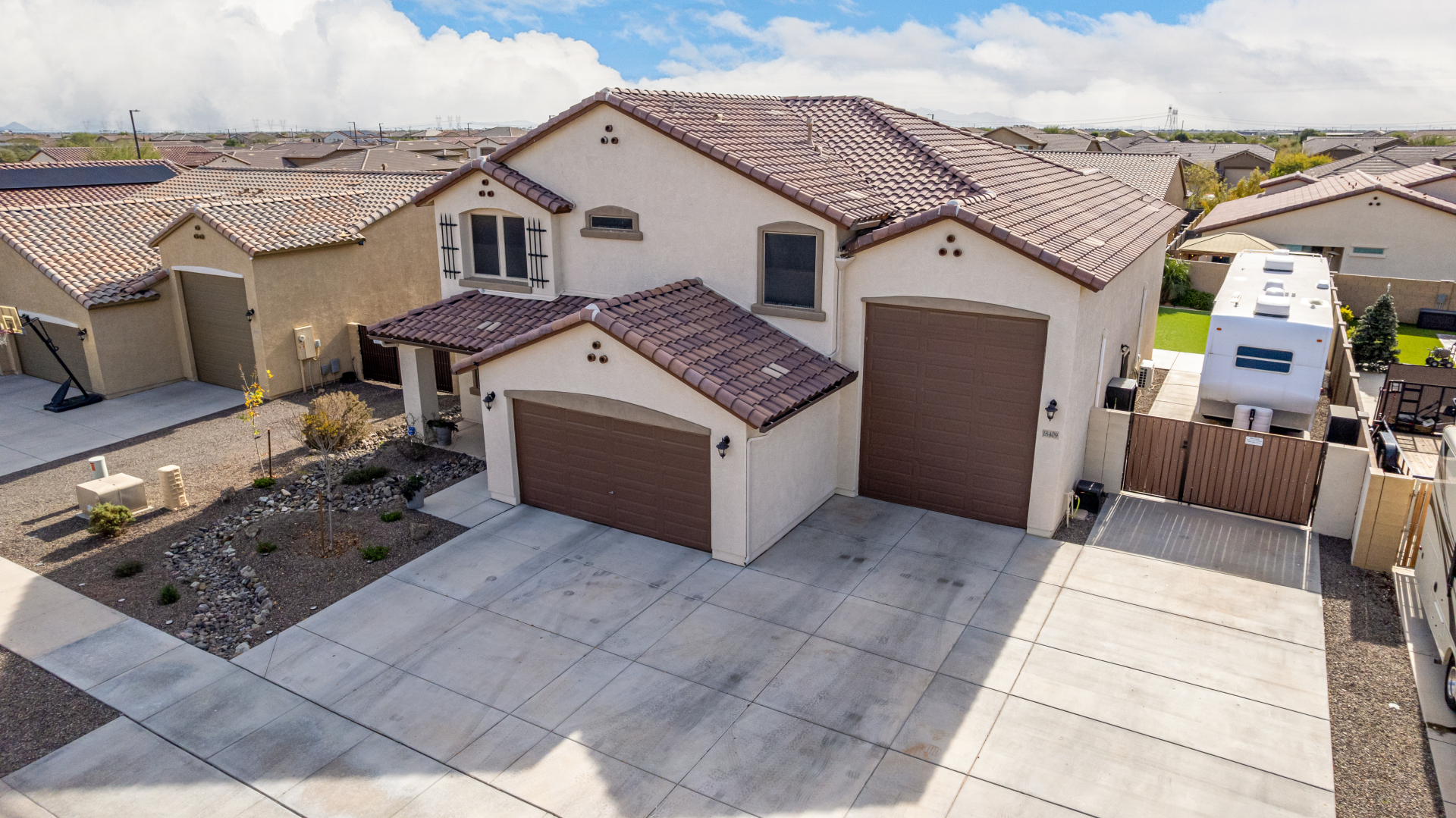 Enjoy luxury living in this exceptional 5BR, 3.5BA home designed for both comfort and functionality. The main level features the primary suite, offering convenience and privacy. Upstairs offers 4BR, all w/walk-in closets and a spacious loft for extra hang-out space. The backyard is ideal for entertaining, featuring a pebble sheen pool with a Baja deck, travertine decking, a covered patio, and low-maintenance synthetic turf. A standout feature is the 14.5' x 47.5' RV garage w/16-foot ceilings, partially insulated, and dual mini-split systems and an attached two-car garage with built-in cabinets and epoxy flooring. Other highlights include upgraded vinyl flooring, shutters, sun screens, and enhanced baseboards throughout. There are too many features to note- schedule your showing today!