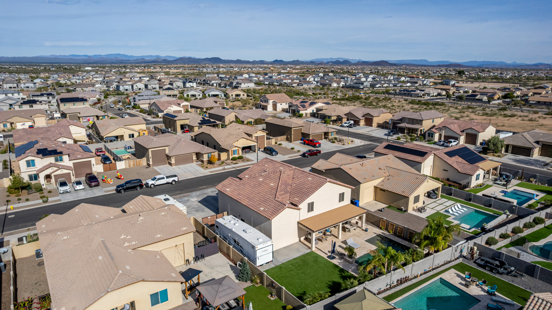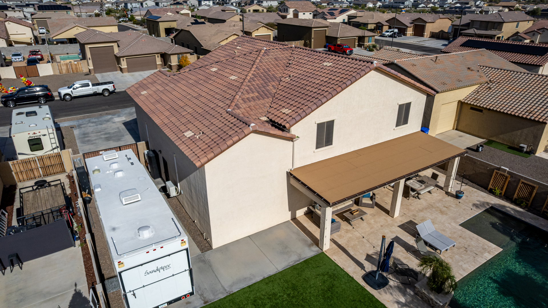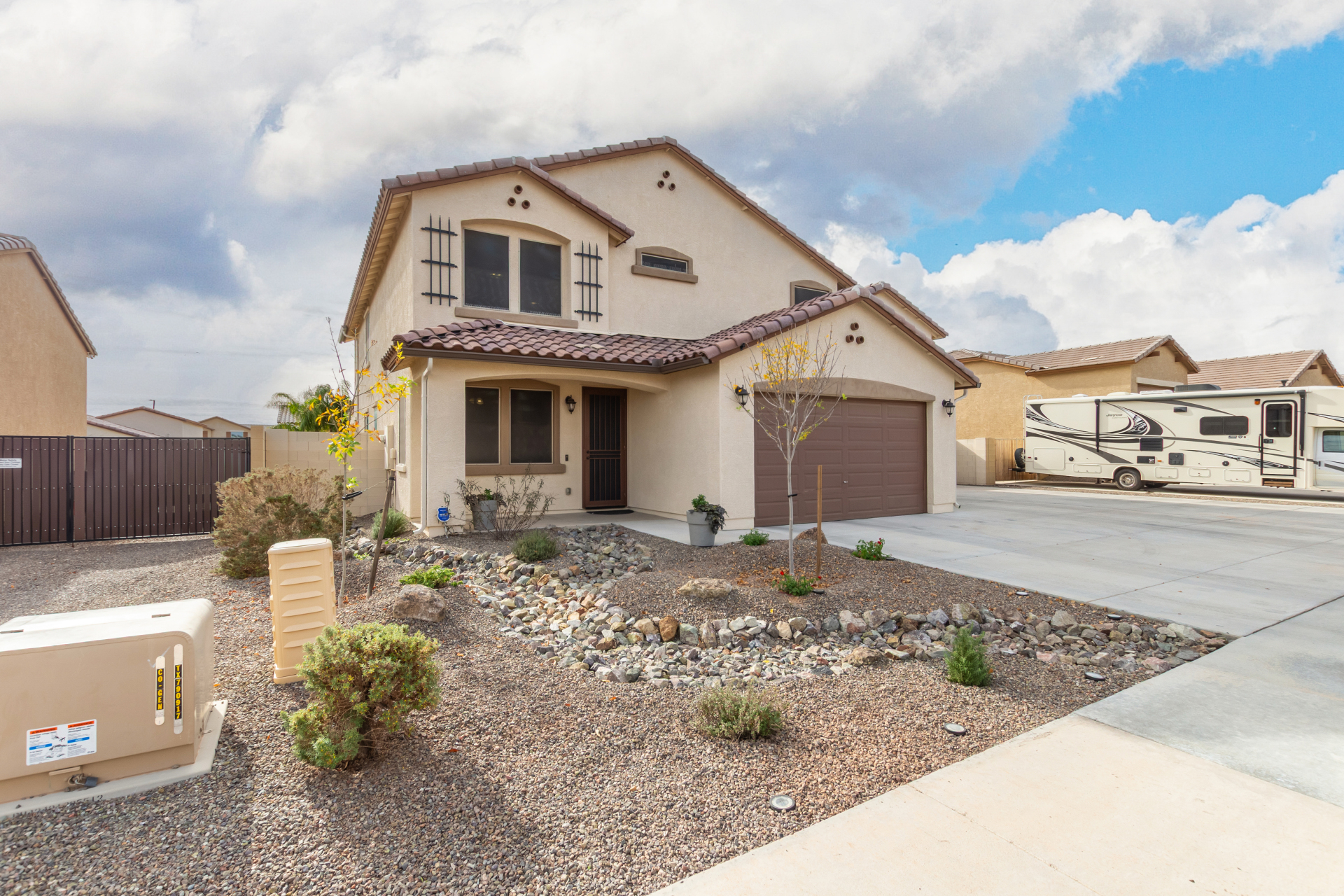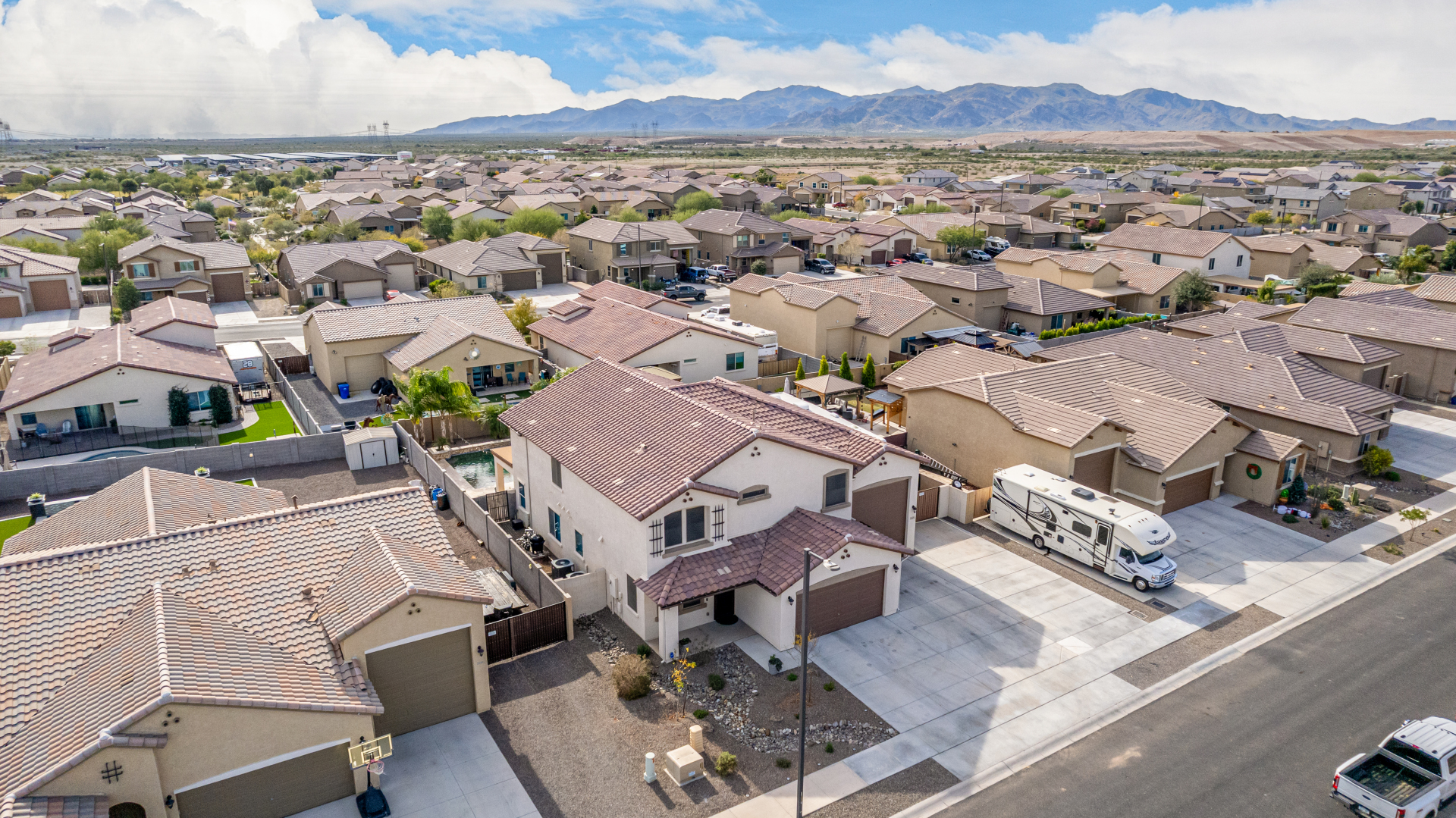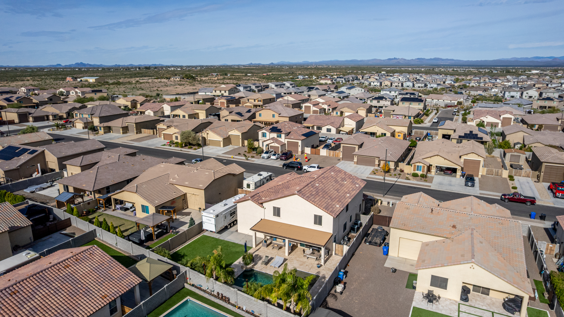 Enjoy luxury living in this exceptional 5BR, 3.5BA home designed for both comfort and functionality. The main level features the primary suite, offering convenience and privacy. Upstairs offers 4BR, all w/walk-in closets and a spacious loft for extra hang-out space. The backyard is ideal for entertaining, featuring a pebble sheen pool with a Baja deck, travertine decking, a covered patio, and low-maintenance synthetic turf. A standout feature is the 14.5' x 47.5' RV garage w/16-foot ceilings, partially insulated, and dual mini-split systems and an attached two-car garage with built-in cabinets and epoxy flooring. Other highlights include upgraded vinyl flooring, shutters, sun screens, and enhanced baseboards throughout. There are too many features to note- schedule your showing today!