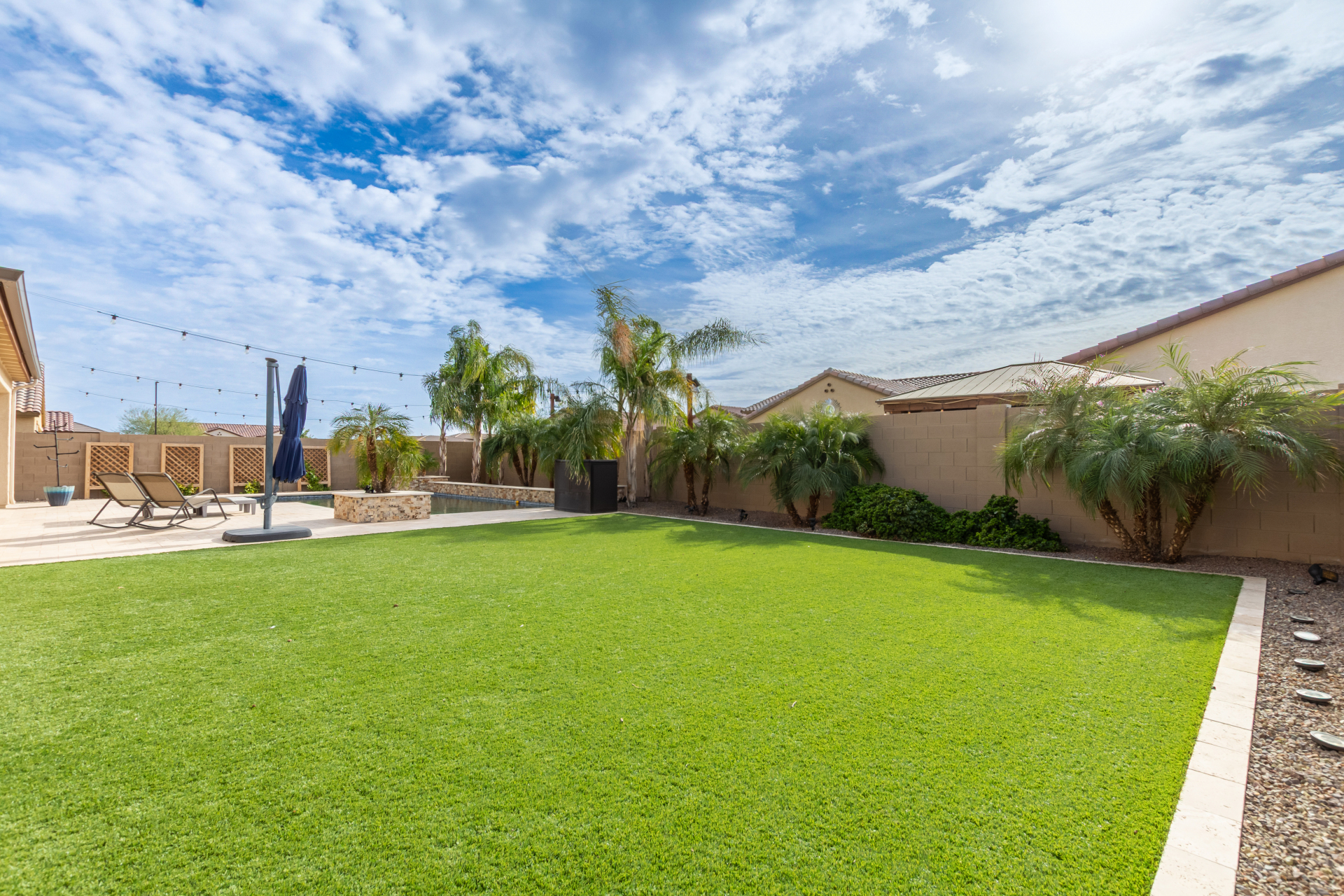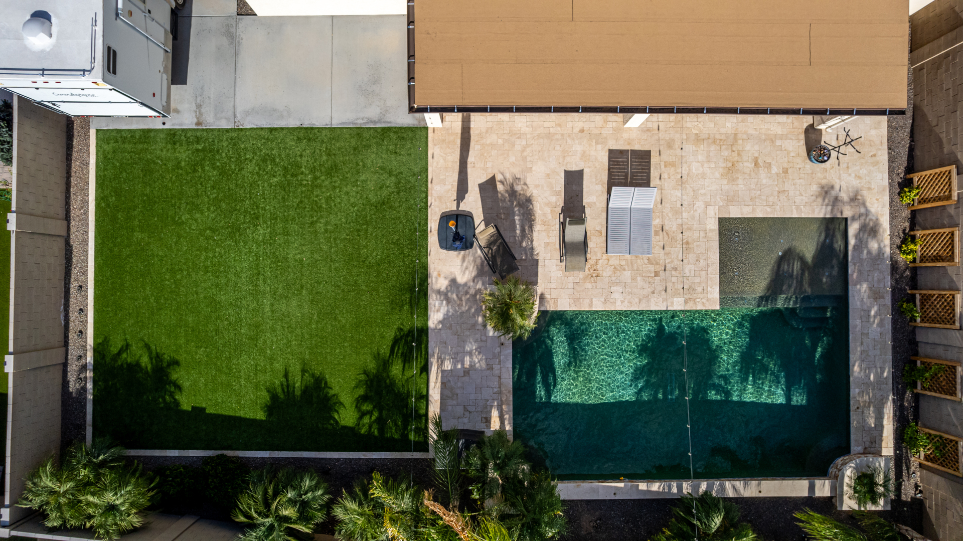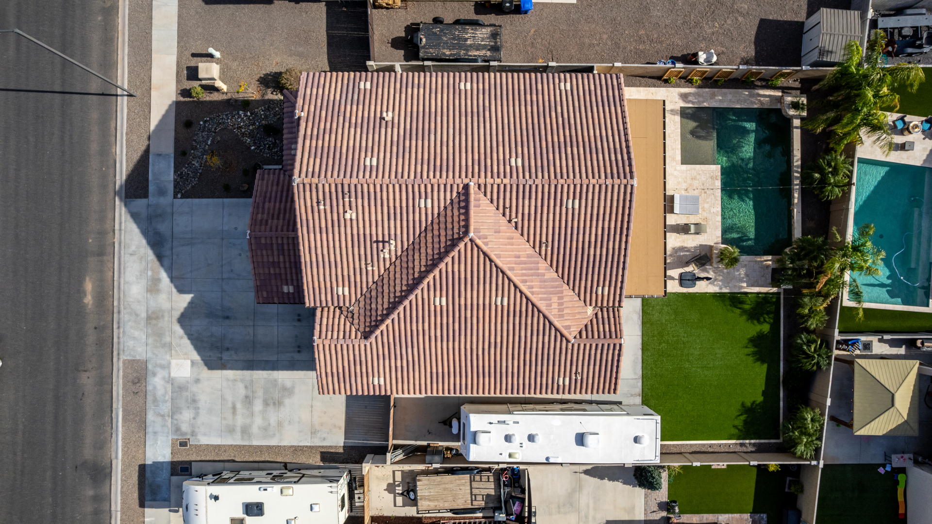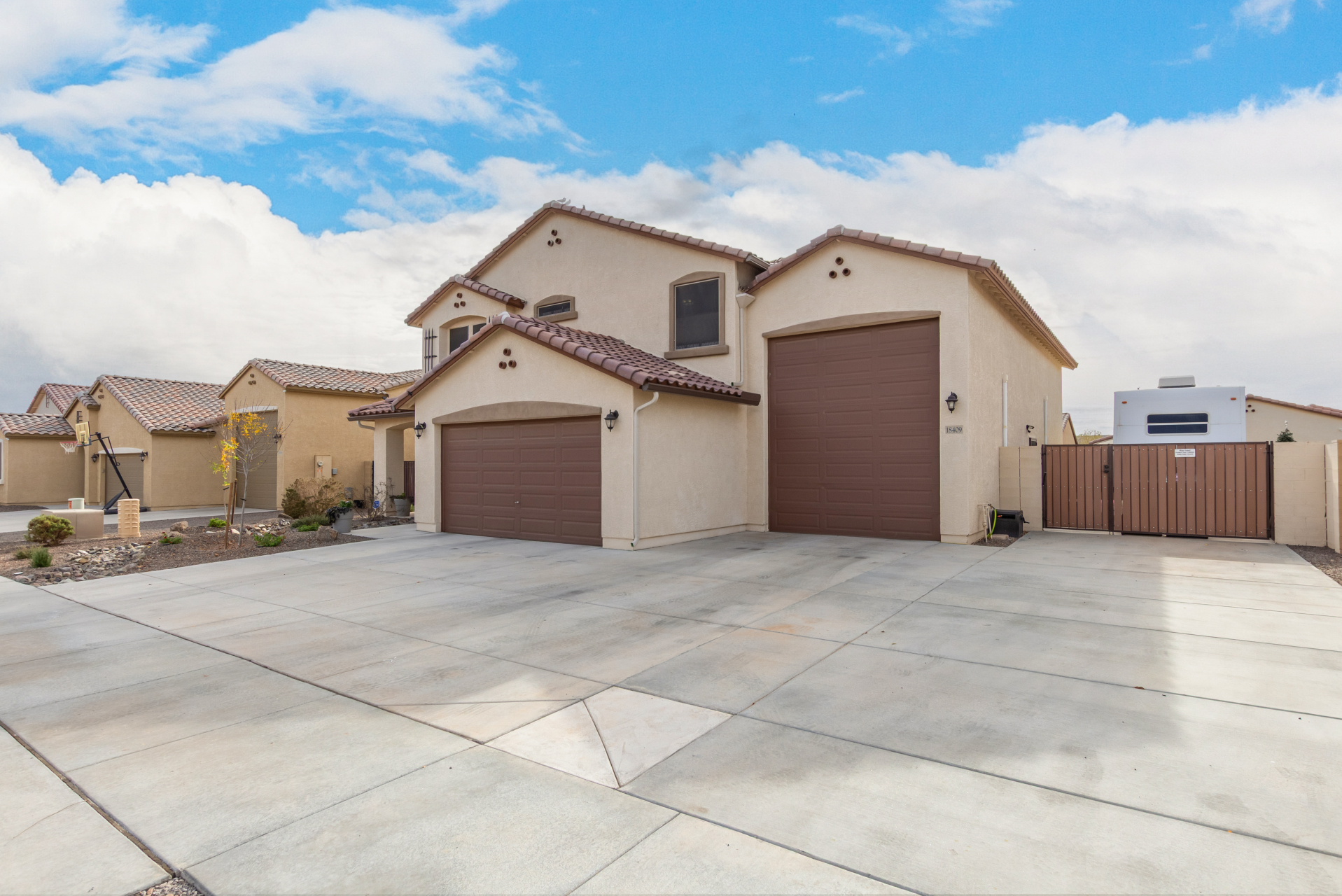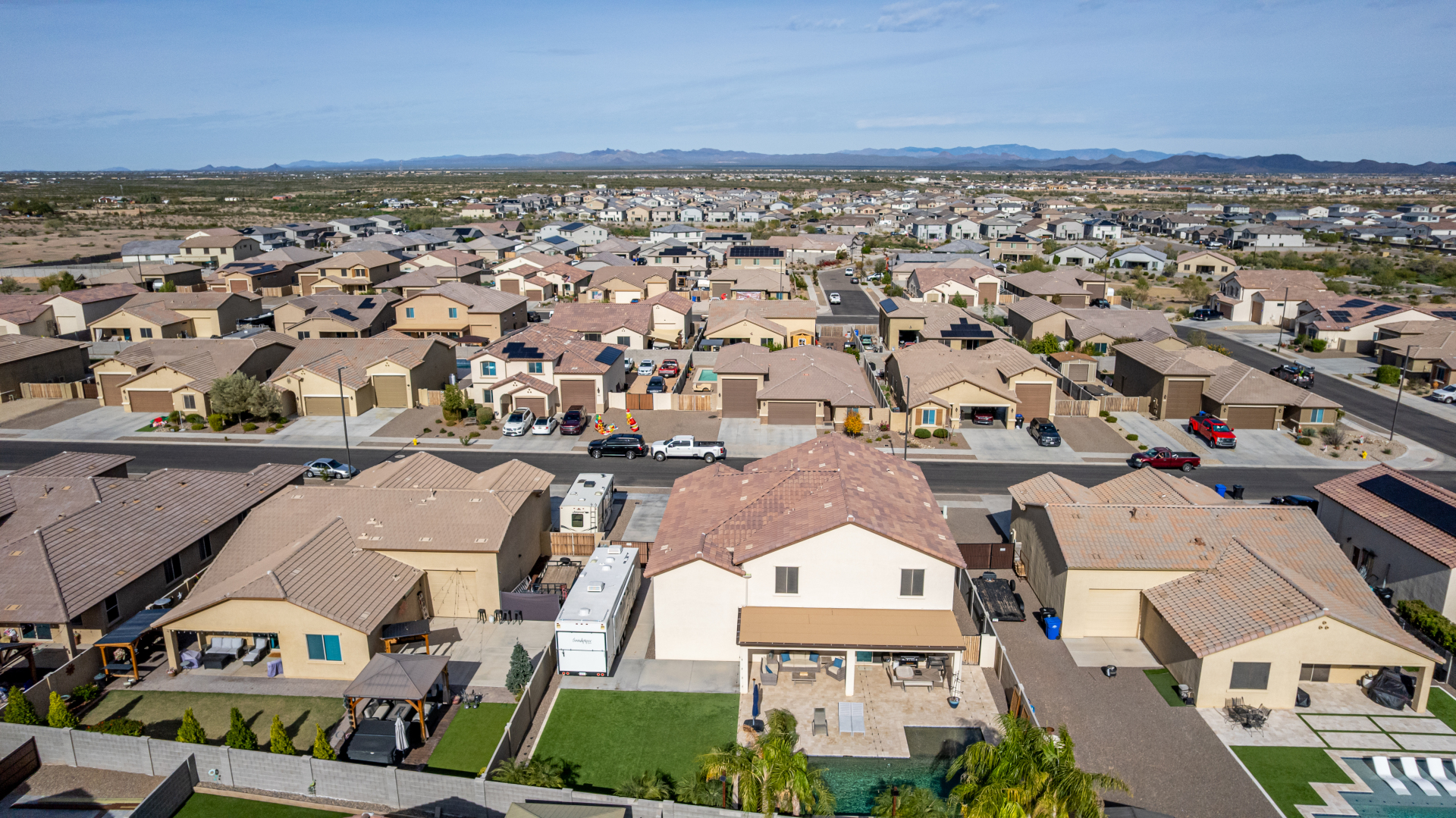 Enjoy luxury living in this exceptional 5BR, 3.5BA home designed for both comfort and functionality. The main level features the primary suite, offering convenience and privacy. Upstairs offers 4BR, all w/walk-in closets and a spacious loft for extra hang-out space. The backyard is ideal for entertaining, featuring a pebble sheen pool with a Baja deck, travertine decking, a covered patio, and low-maintenance synthetic turf. A standout feature is the 14.5' x 47.5' RV garage w/16-foot ceilings, partially insulated, and dual mini-split systems and an attached two-car garage with built-in cabinets and epoxy flooring. Other highlights include upgraded vinyl flooring, shutters, sun screens, and enhanced baseboards throughout. There are too many features to note- schedule your showing today!