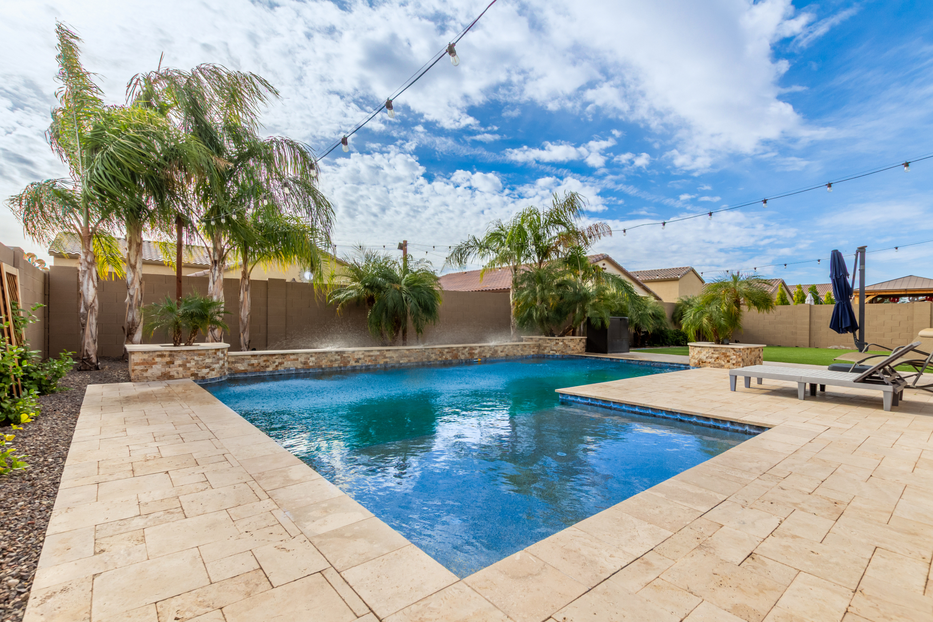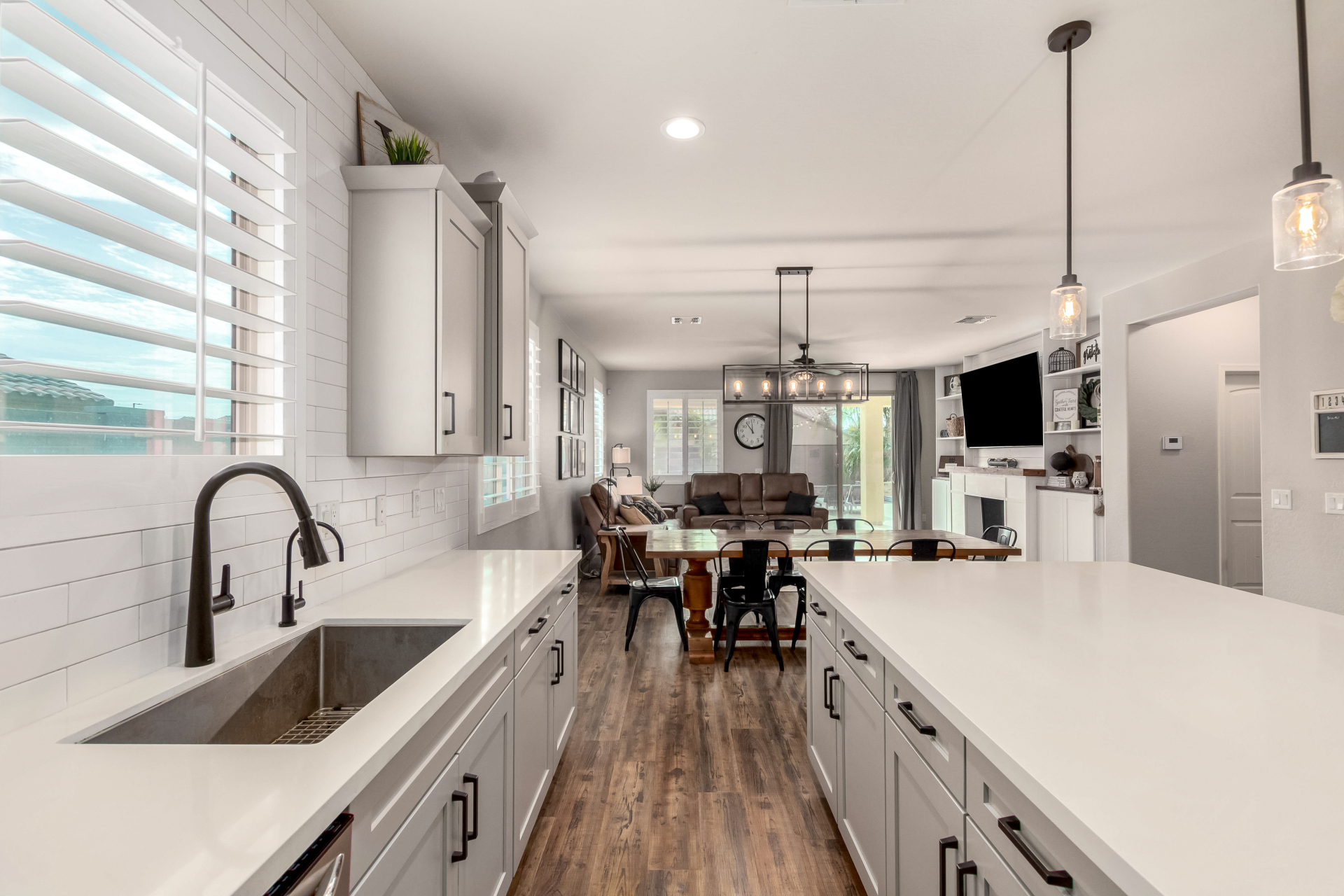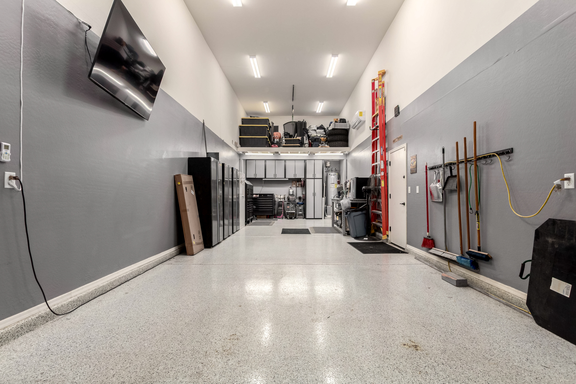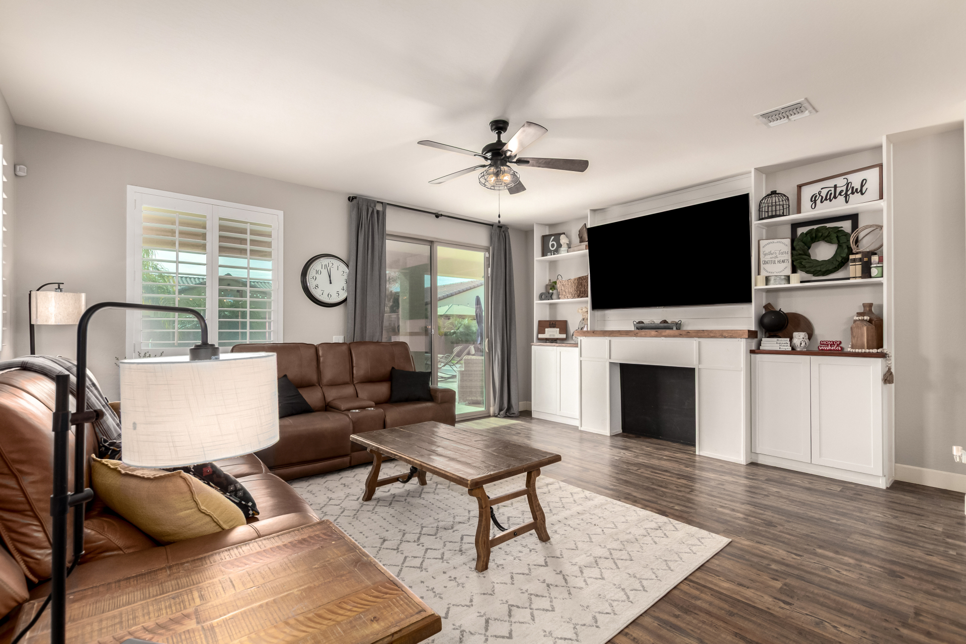 Enjoy luxury living in this exceptional 5BR, 3.5BA home designed for both comfort and functionality. The main level features the primary suite, offering convenience and privacy. Upstairs offers 4BR, all w/walk-in closets and a spacious loft for extra hang-out space. The backyard is ideal for entertaining, featuring a pebble sheen pool with a Baja deck, travertine decking, a covered patio, and low-maintenance synthetic turf. A standout feature is the 14.5' x 47.5' RV garage w/16-foot ceilings, partially insulated, and dual mini-split systems and an attached two-car garage with built-in cabinets and epoxy flooring. Other highlights include upgraded vinyl flooring, shutters, sun screens, and enhanced baseboards throughout. There are too many features to note- schedule your showing today!