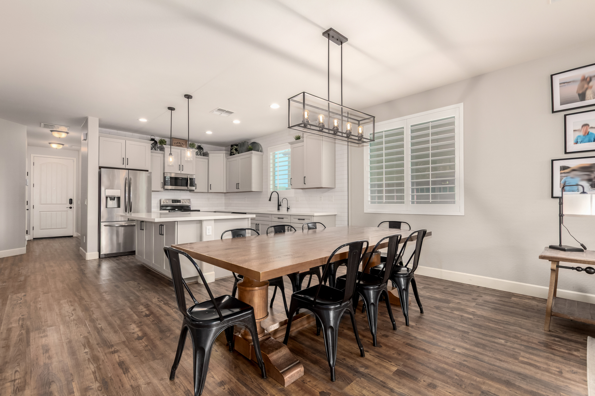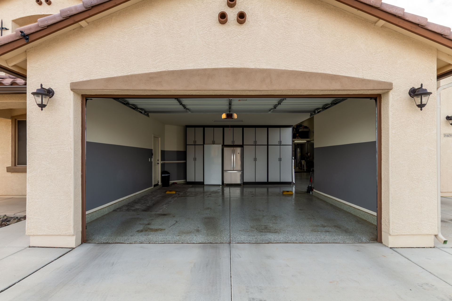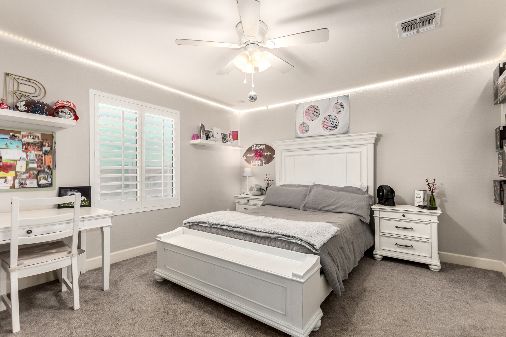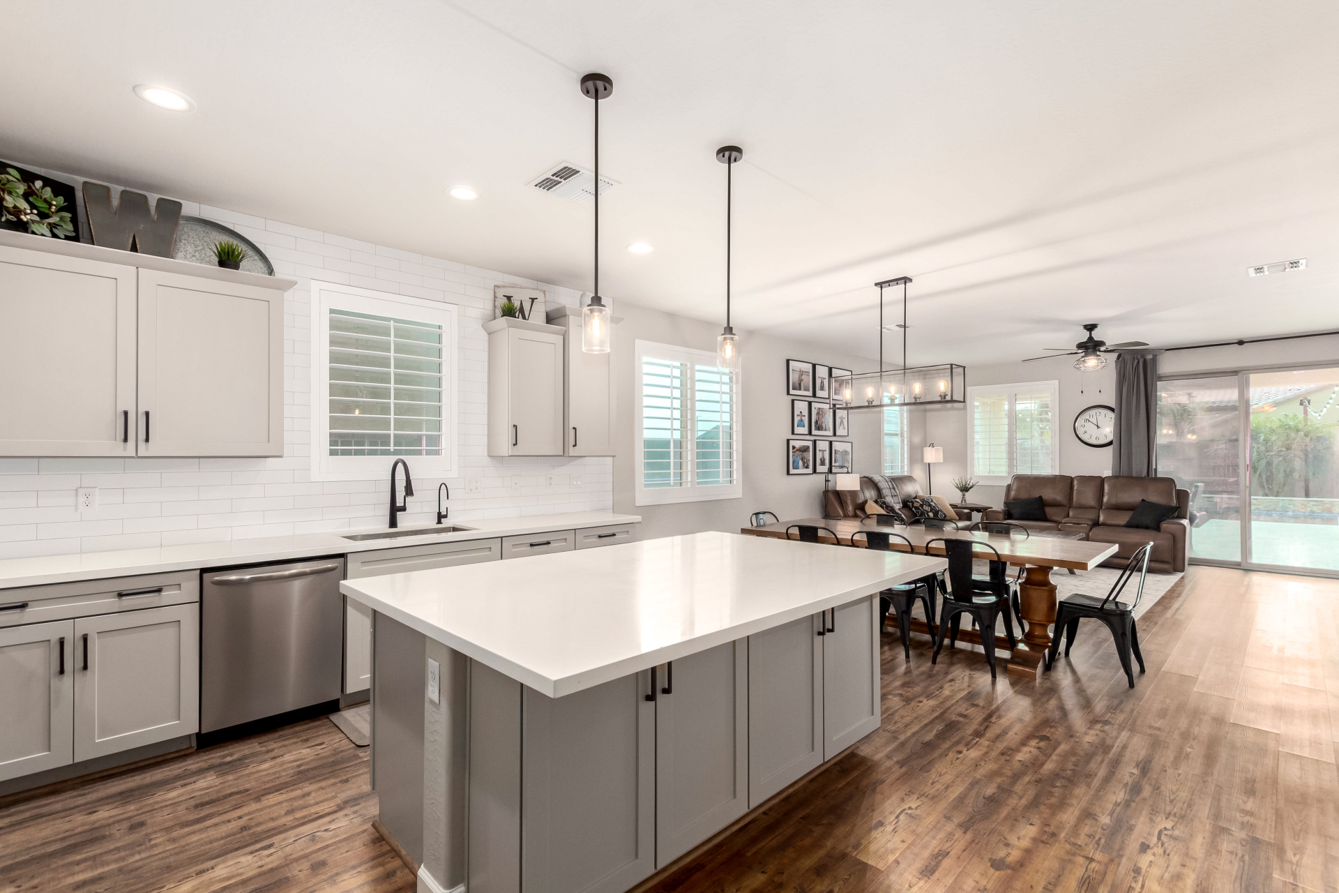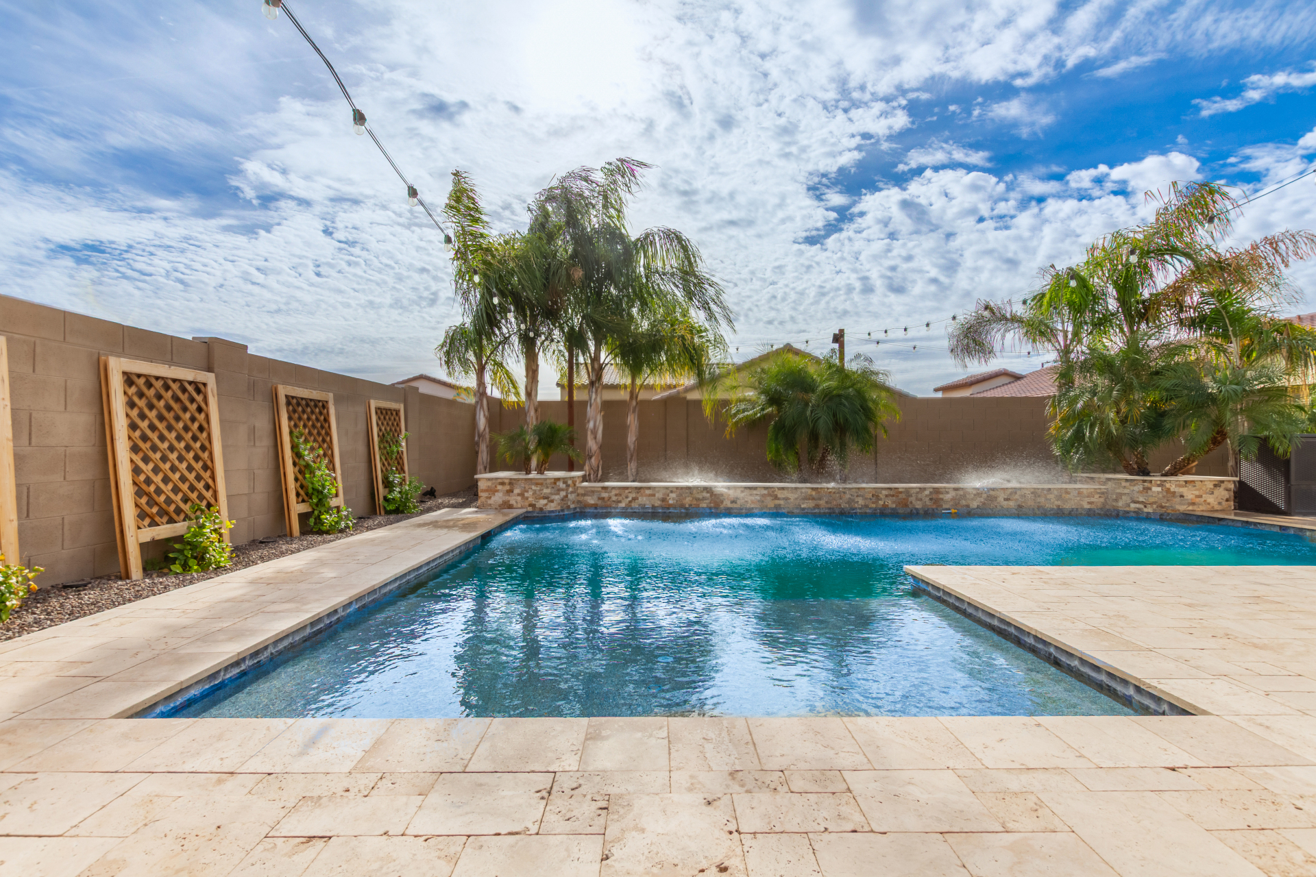 Enjoy luxury living in this exceptional 5BR, 3.5BA home designed for both comfort and functionality. The main level features the primary suite, offering convenience and privacy. Upstairs offers 4BR, all w/walk-in closets and a spacious loft for extra hang-out space. The backyard is ideal for entertaining, featuring a pebble sheen pool with a Baja deck, travertine decking, a covered patio, and low-maintenance synthetic turf. A standout feature is the 14.5' x 47.5' RV garage w/16-foot ceilings, partially insulated, and dual mini-split systems and an attached two-car garage with built-in cabinets and epoxy flooring. Other highlights include upgraded vinyl flooring, shutters, sun screens, and enhanced baseboards throughout. There are too many features to note- schedule your showing today!