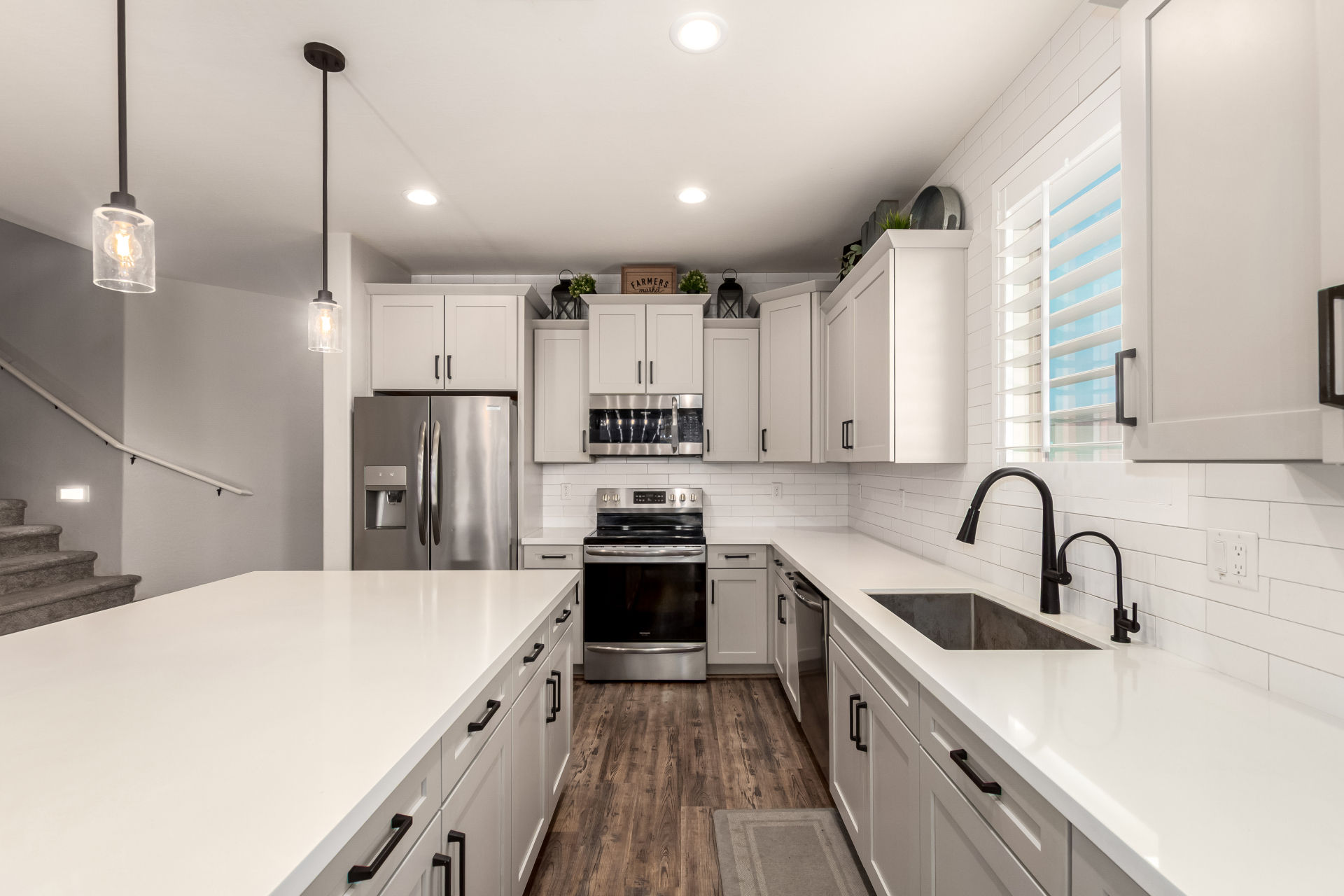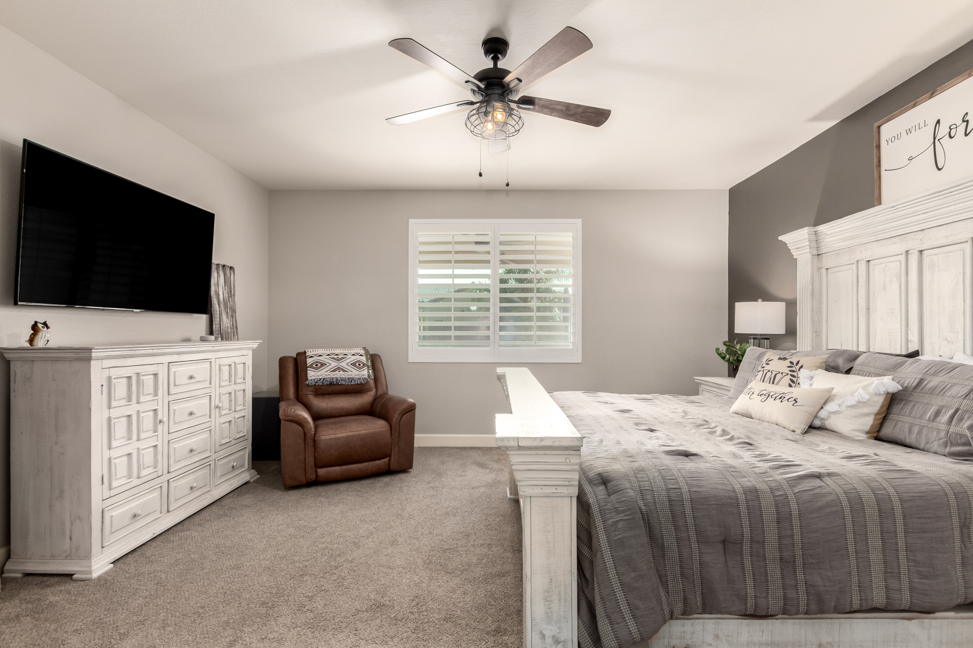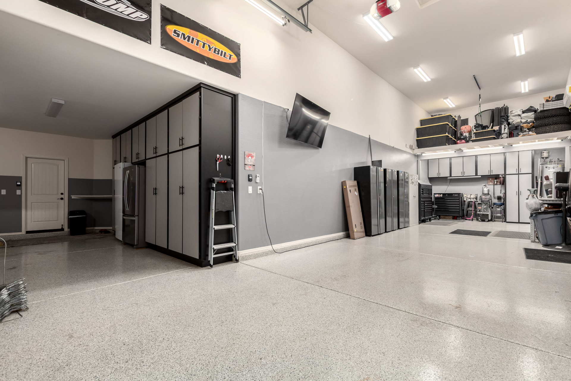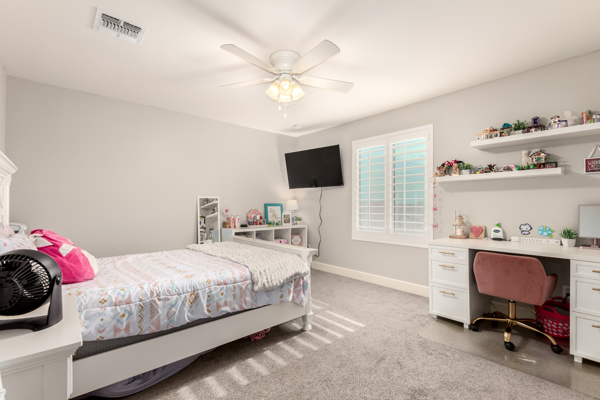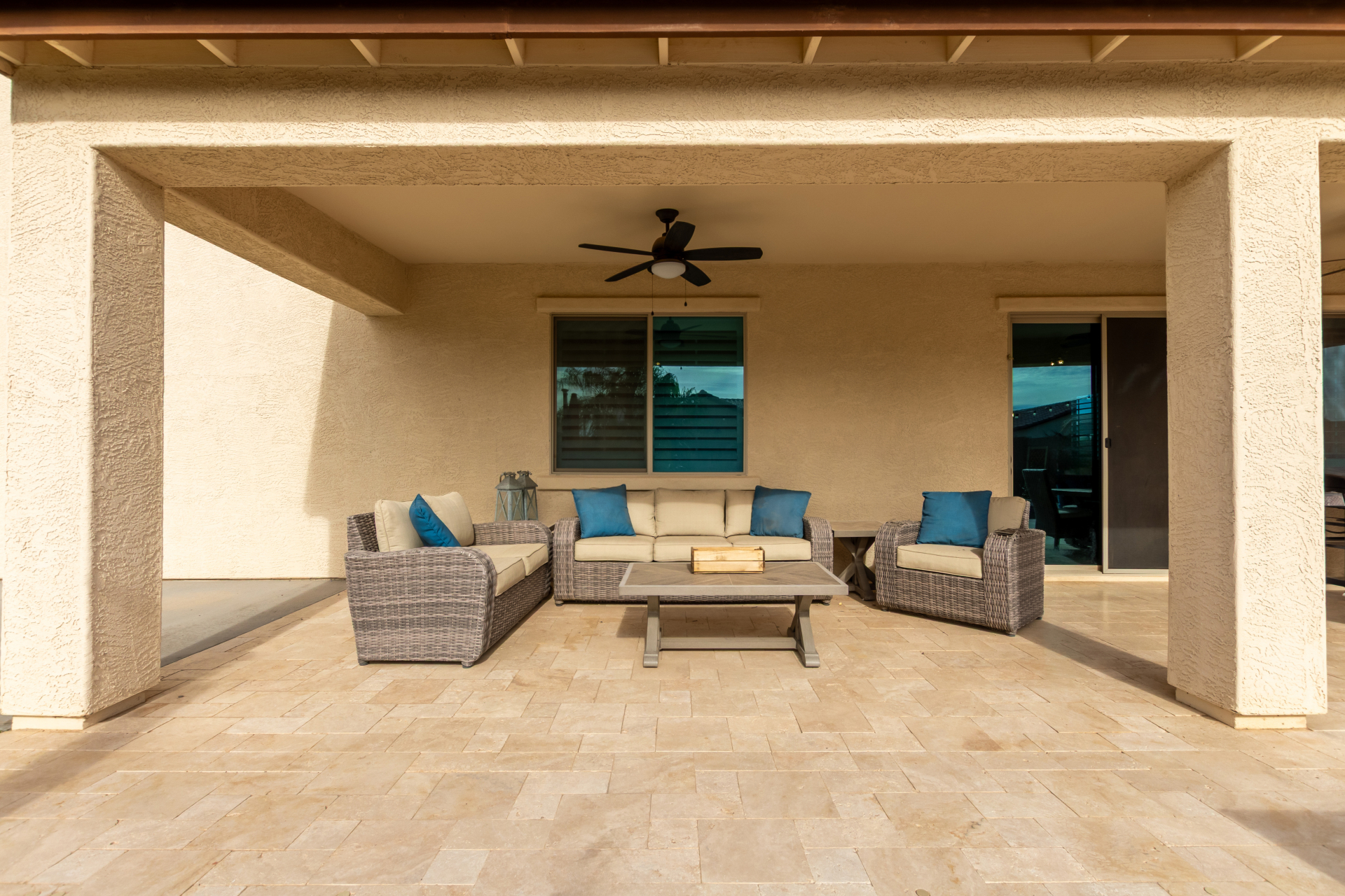 Enjoy luxury living in this exceptional 5BR, 3.5BA home designed for both comfort and functionality. The main level features the primary suite, offering convenience and privacy. Upstairs offers 4BR, all w/walk-in closets and a spacious loft for extra hang-out space. The backyard is ideal for entertaining, featuring a pebble sheen pool with a Baja deck, travertine decking, a covered patio, and low-maintenance synthetic turf. A standout feature is the 14.5' x 47.5' RV garage w/16-foot ceilings, partially insulated, and dual mini-split systems and an attached two-car garage with built-in cabinets and epoxy flooring. Other highlights include upgraded vinyl flooring, shutters, sun screens, and enhanced baseboards throughout. There are too many features to note- schedule your showing today!