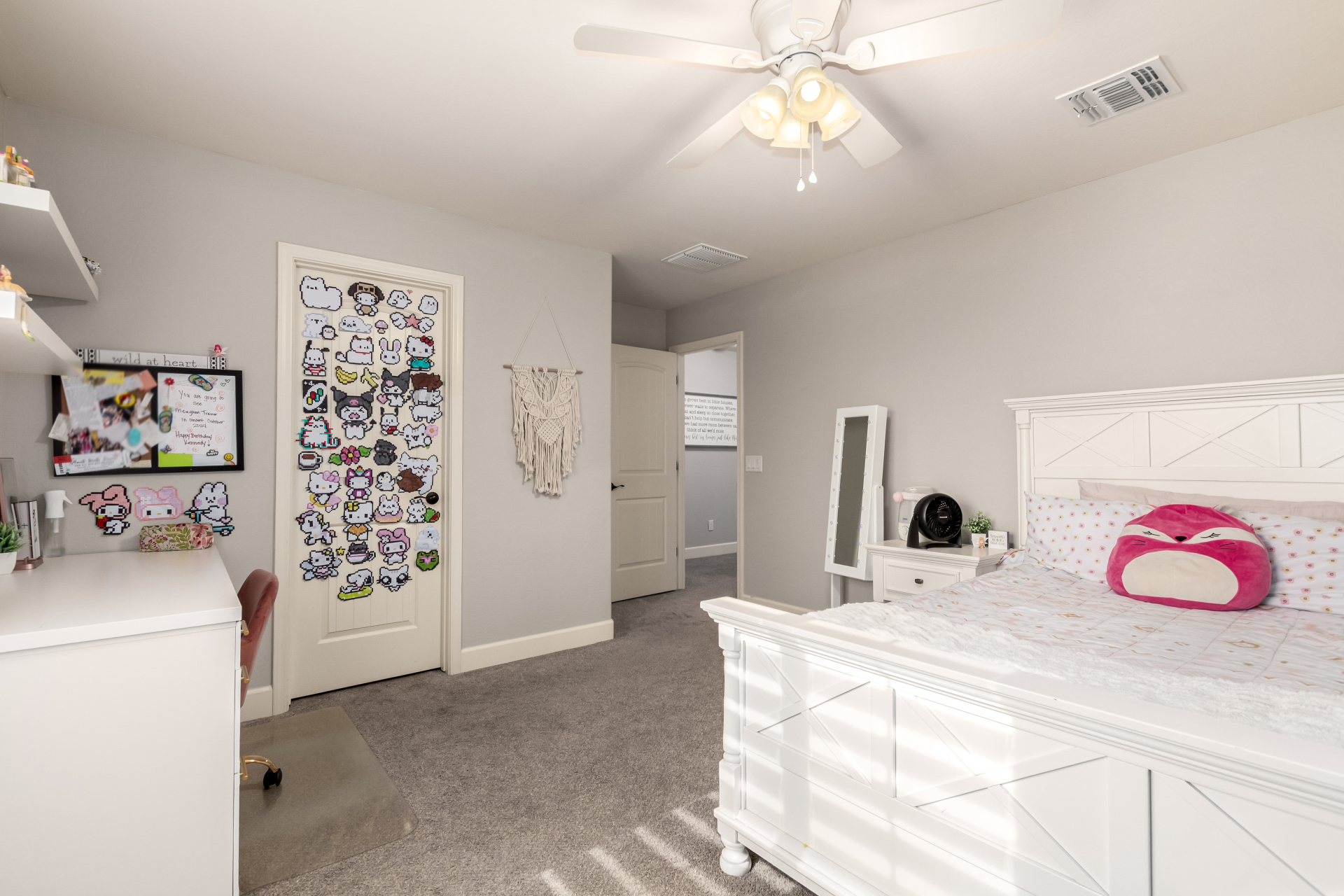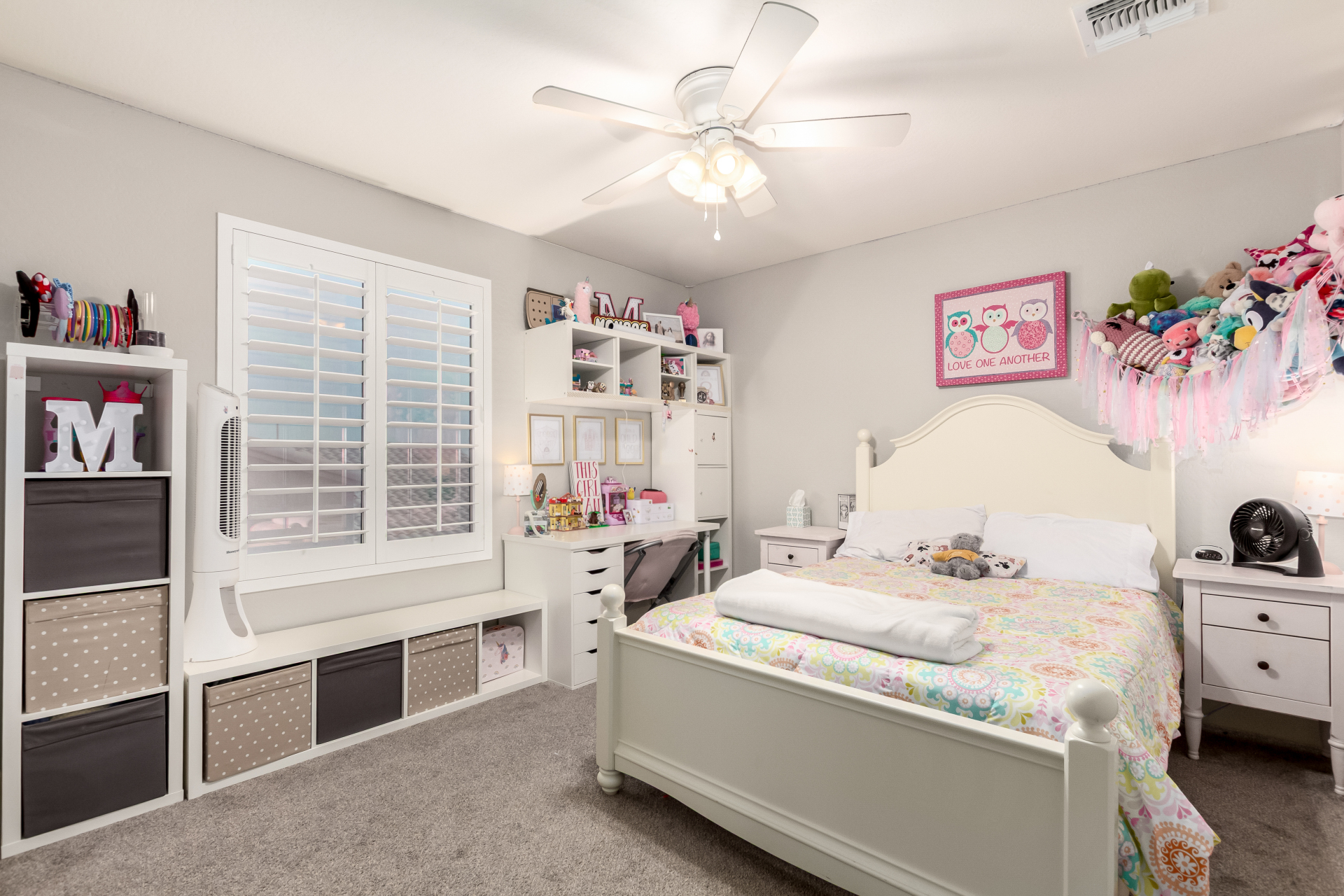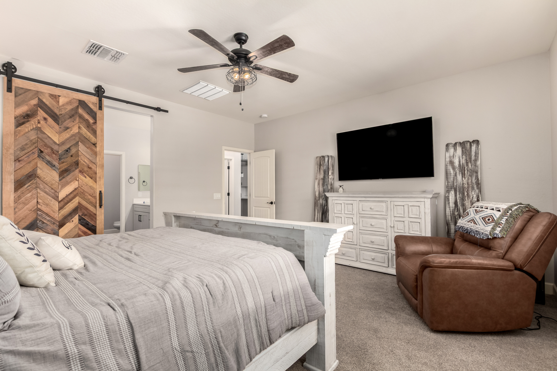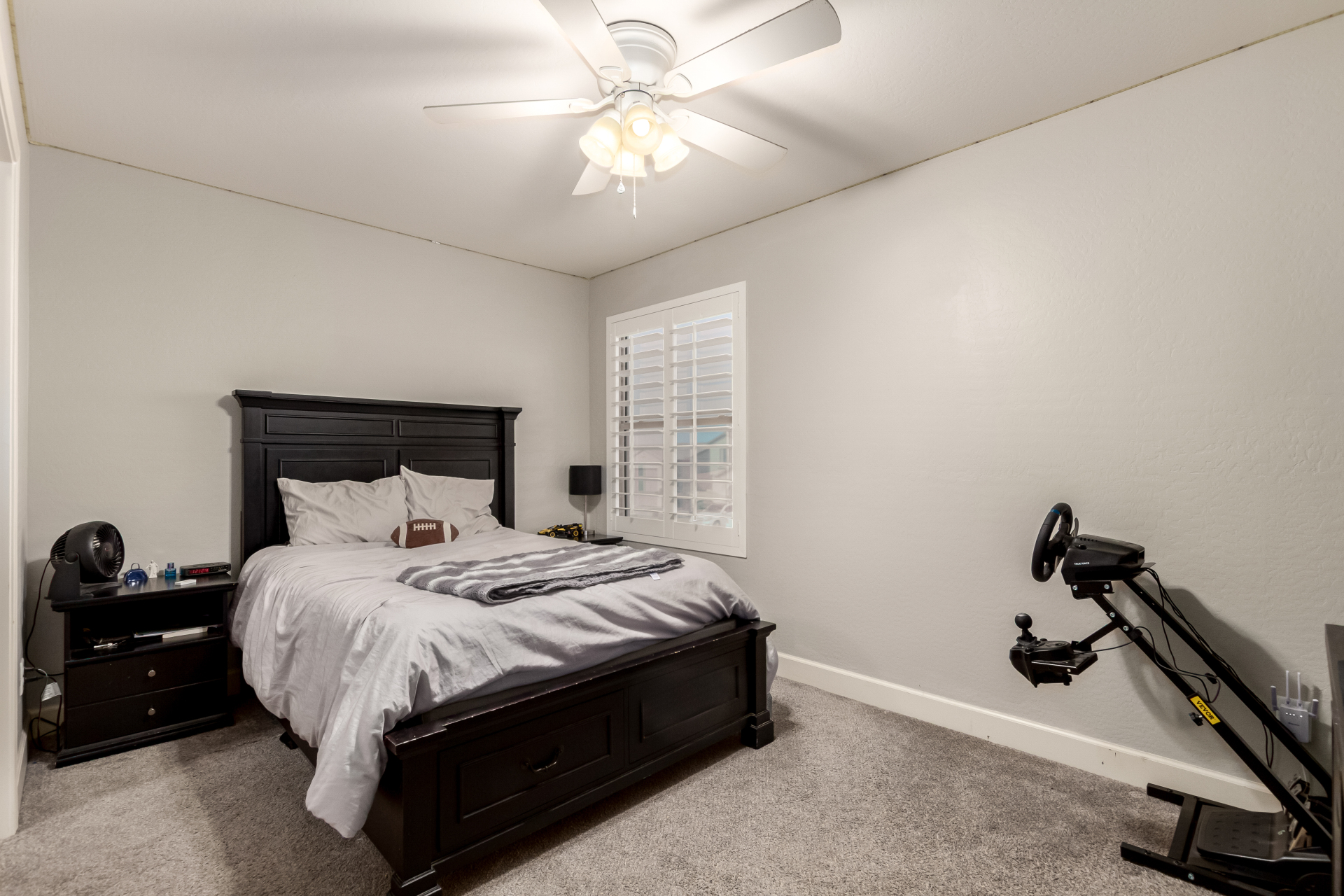 Enjoy luxury living in this exceptional 5BR, 3.5BA home designed for both comfort and functionality. The main level features the primary suite, offering convenience and privacy. Upstairs offers 4BR, all w/walk-in closets and a spacious loft for extra hang-out space. The backyard is ideal for entertaining, featuring a pebble sheen pool with a Baja deck, travertine decking, a covered patio, and low-maintenance synthetic turf. A standout feature is the 14.5' x 47.5' RV garage w/16-foot ceilings, partially insulated, and dual mini-split systems and an attached two-car garage with built-in cabinets and epoxy flooring. Other highlights include upgraded vinyl flooring, shutters, sun screens, and enhanced baseboards throughout. There are too many features to note- schedule your showing today!