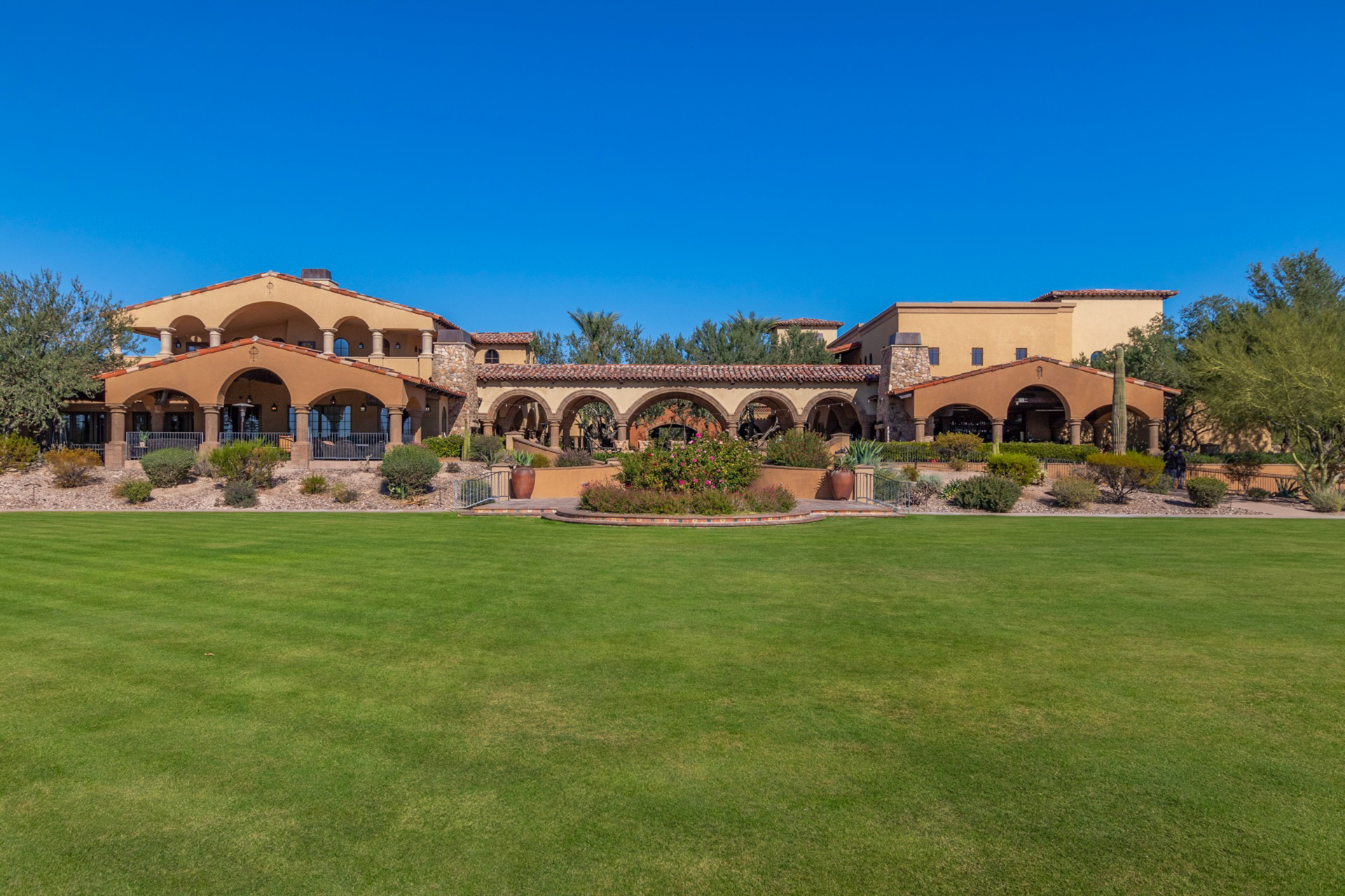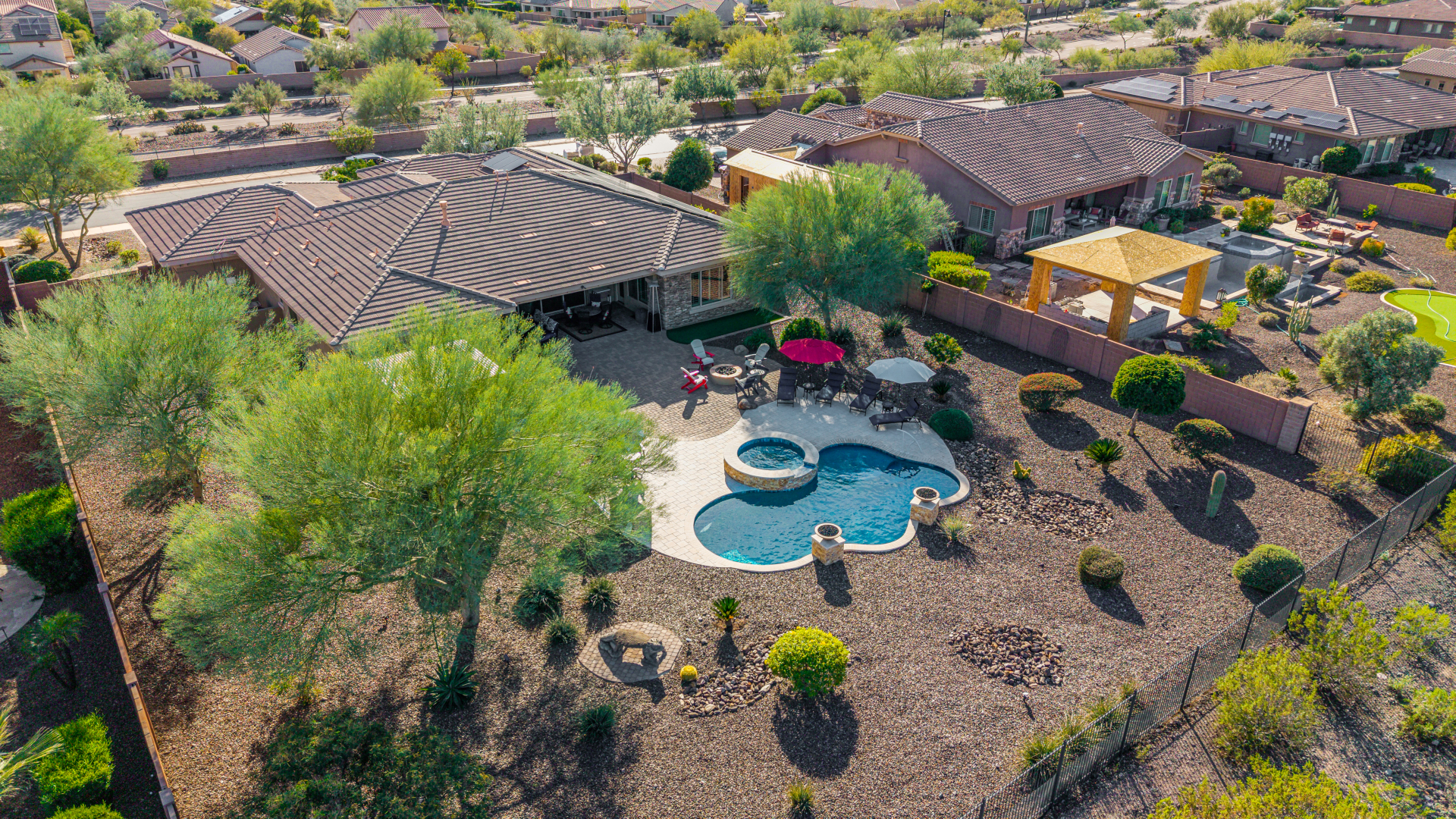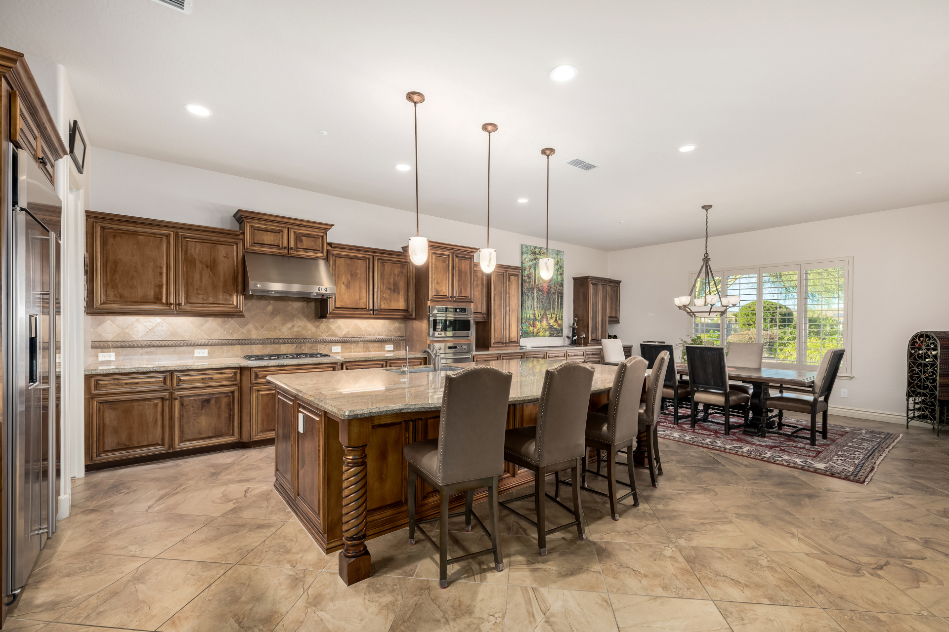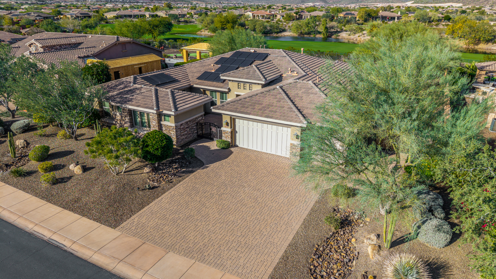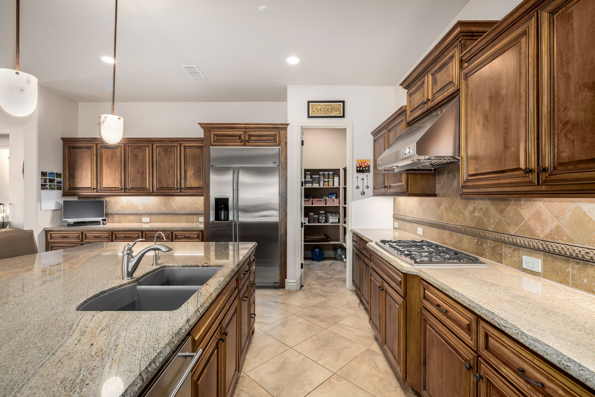 Perched on one of the larger lots overlooking the 4th fairway, this exceptional residence captures breathtaking golf course views and timeless Tuscan-inspired elegance. Beyond the private iron gate, a charming front courtyard welcomes you, featuring a 230 square foot bonus room, perfect for a private office, media room, studio or custom retreat tailored to your lifestyle. The main residence spans 3,358 square feet of thoughtfully designed living space, showcasing superior craftsmanship throughout. The kitchen is a true centerpiece, with a massive granite island and breakfast bar, buffet countertop, upgraded cabinetry with custom pull-out shelving, gas cooktop, built-in refrigerator and a spacious eat-in area ideal for both everyday living and entertaining.
