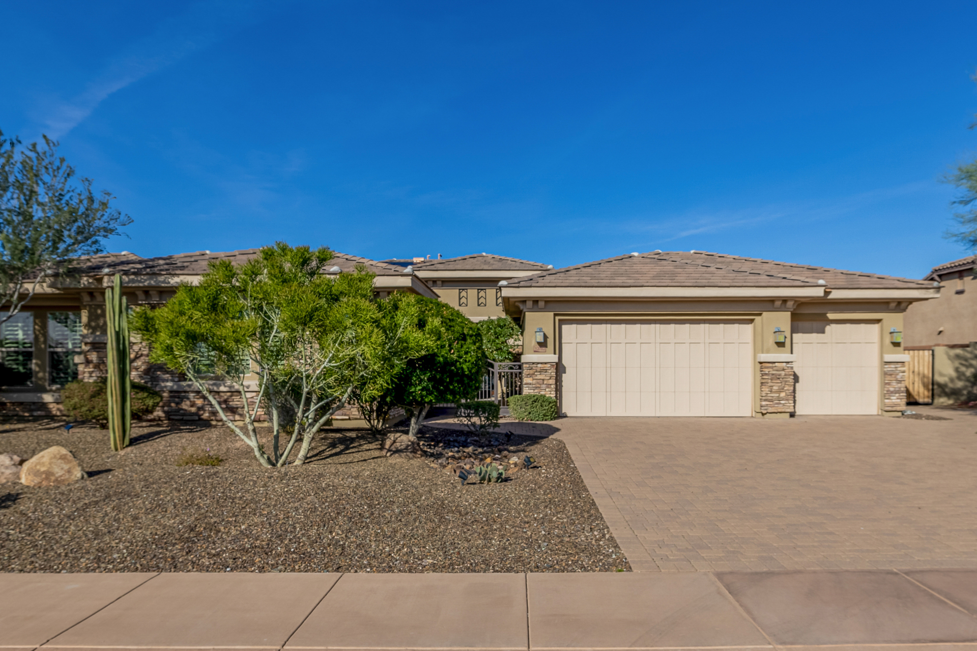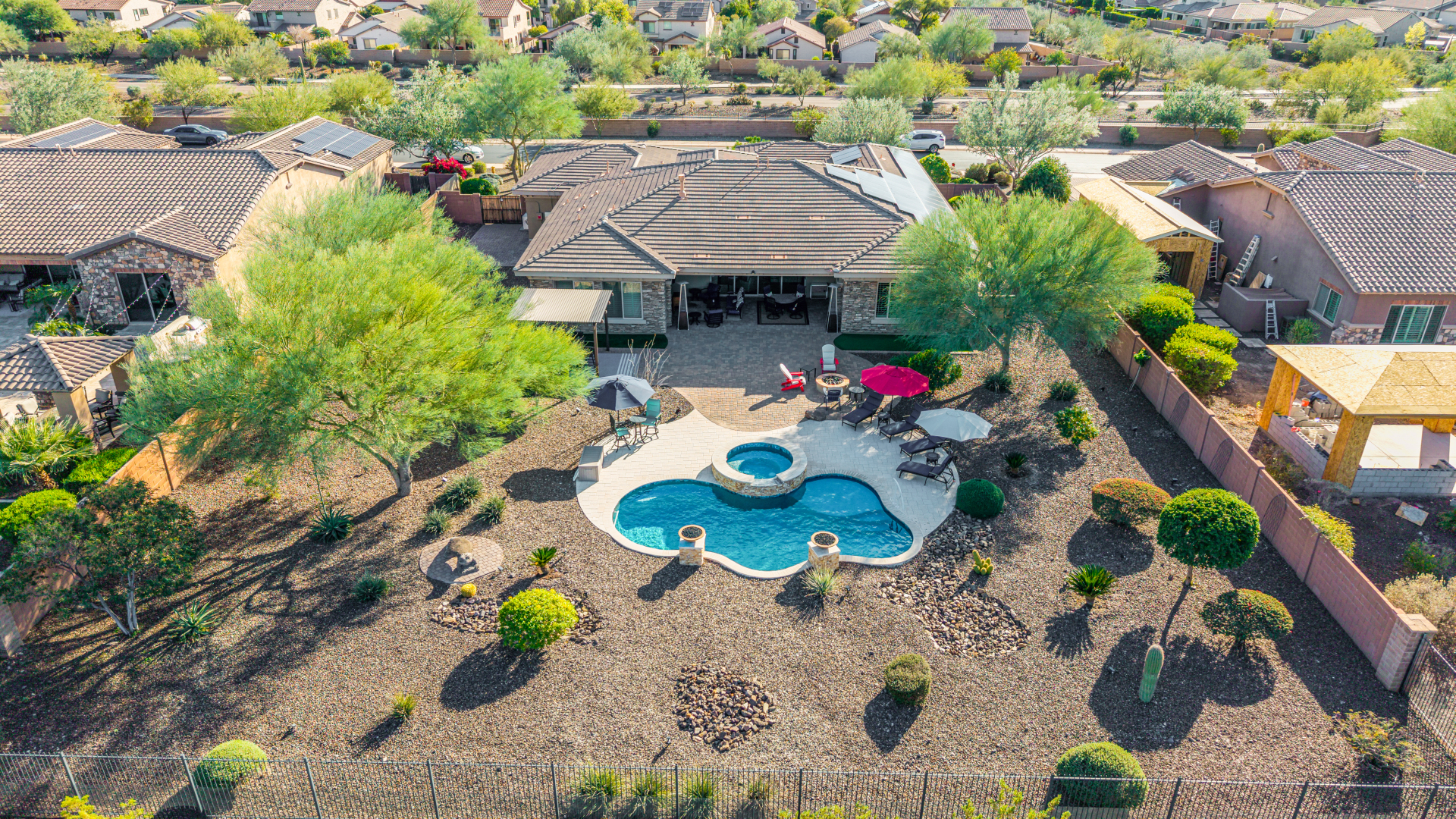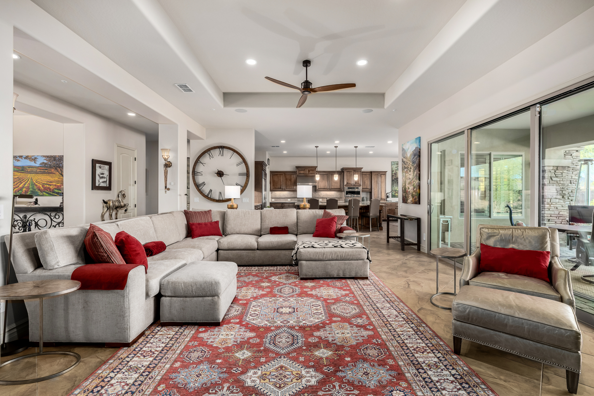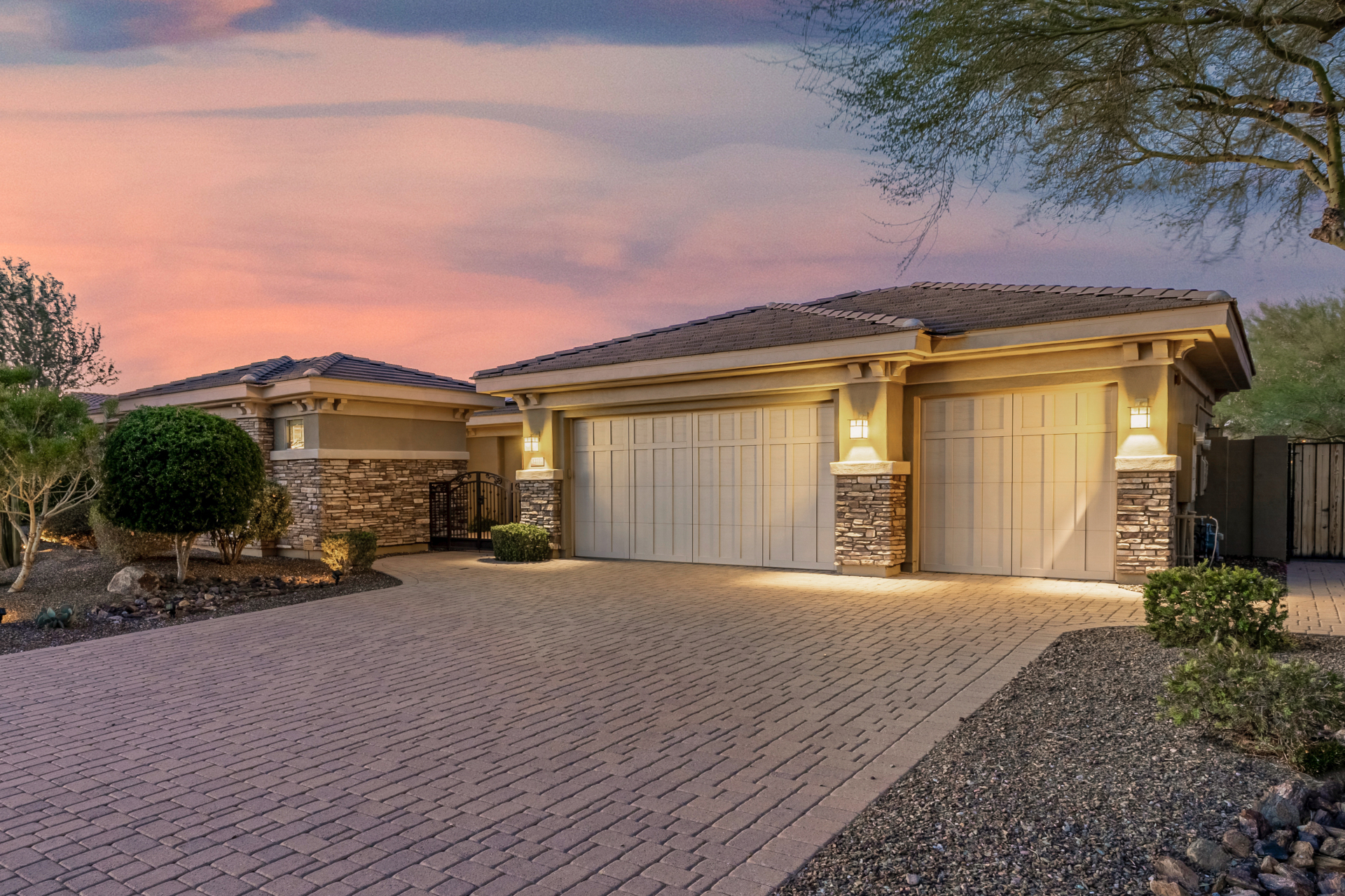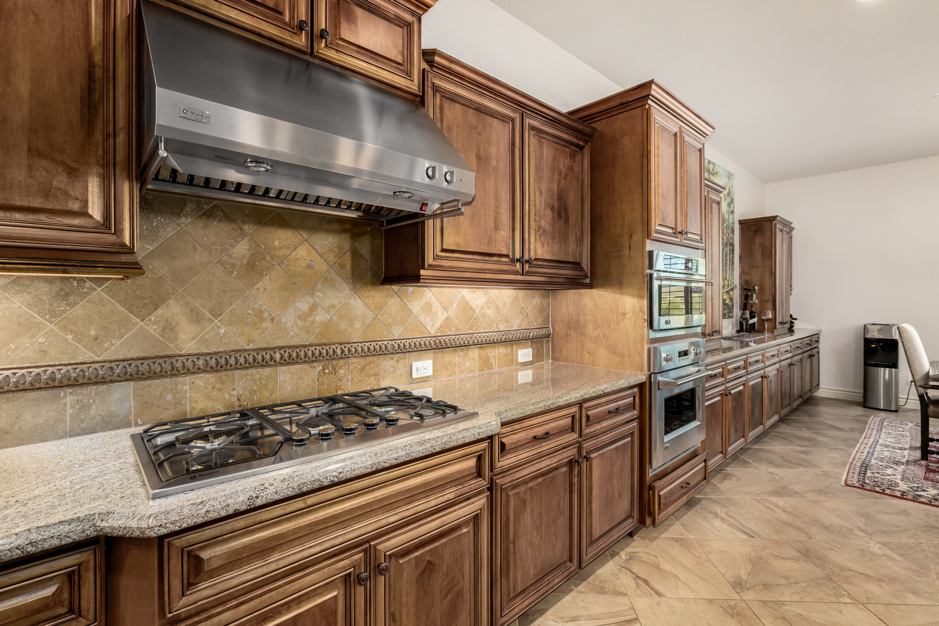 Perched on one of the larger lots overlooking the 4th fairway, this exceptional residence captures breathtaking golf course views and timeless Tuscan-inspired elegance. Beyond the private iron gate, a charming front courtyard welcomes you, featuring a 230 square foot bonus room, perfect for a private office, media room, studio or custom retreat tailored to your lifestyle. The main residence spans 3,358 square feet of thoughtfully designed living space, showcasing superior craftsmanship throughout. The kitchen is a true centerpiece, with a massive granite island and breakfast bar, buffet countertop, upgraded cabinetry with custom pull-out shelving, gas cooktop, built-in refrigerator and a spacious eat-in area ideal for both everyday living and entertaining.