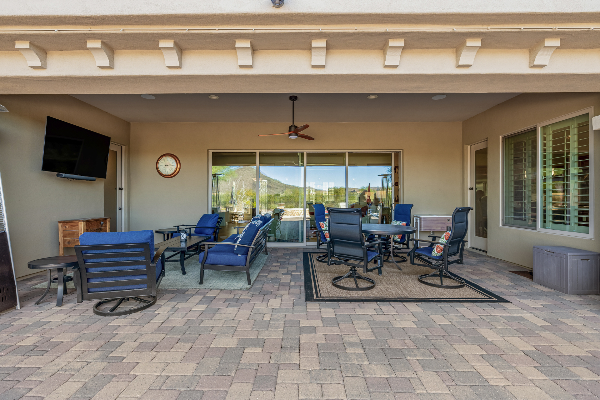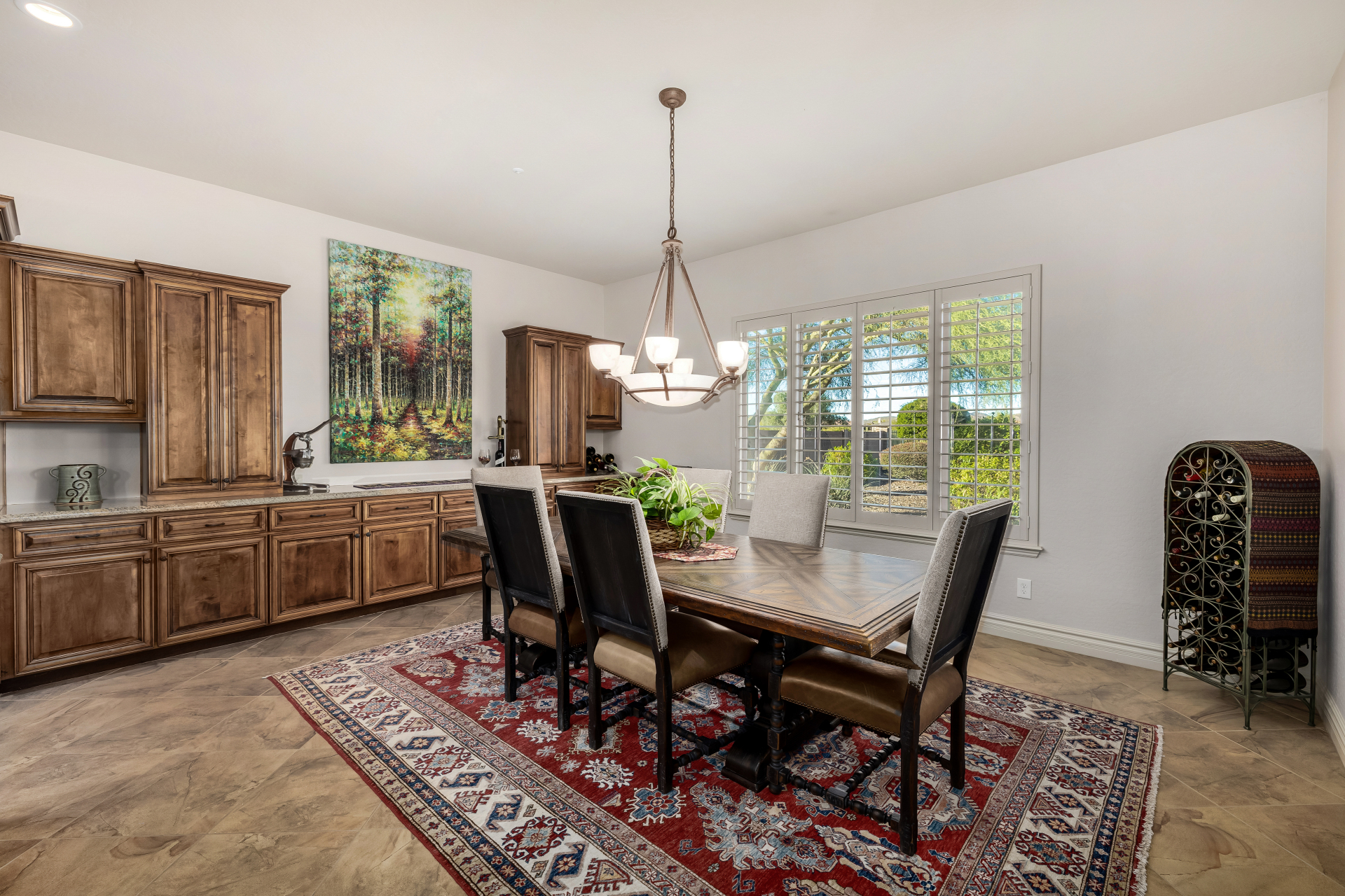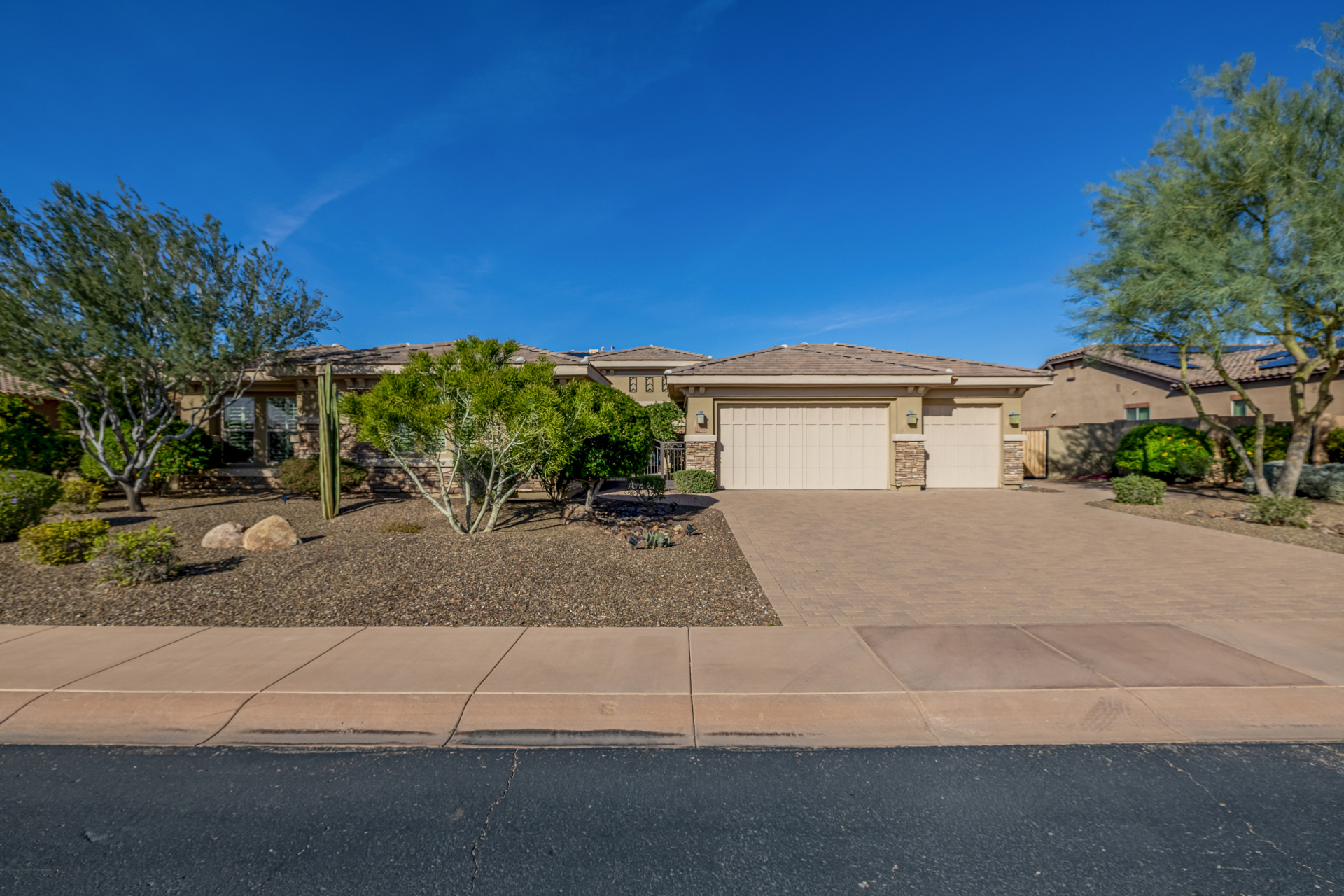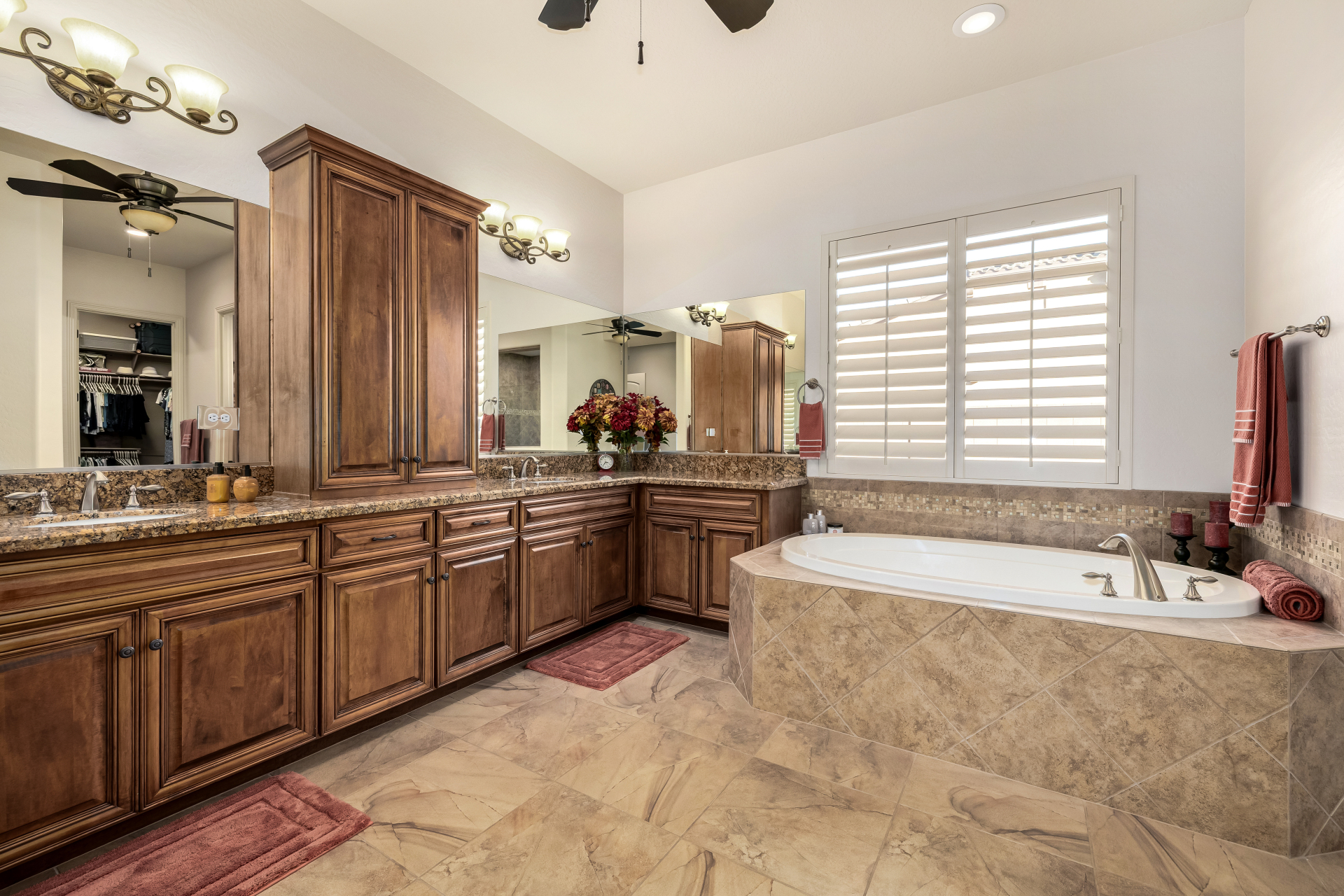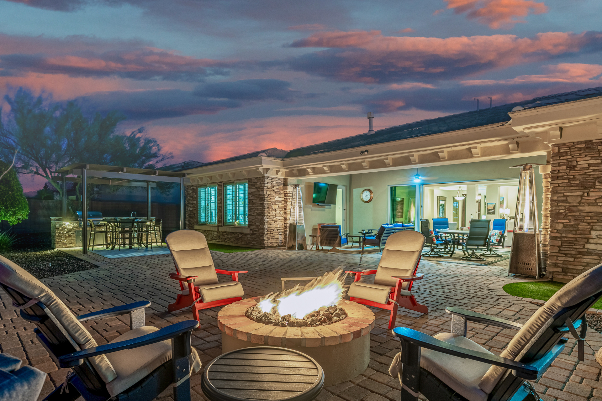 Perched on one of the larger lots overlooking the 4th fairway, this exceptional residence captures breathtaking golf course views and timeless Tuscan-inspired elegance. Beyond the private iron gate, a charming front courtyard welcomes you, featuring a 230 square foot bonus room, perfect for a private office, media room, studio or custom retreat tailored to your lifestyle. The main residence spans 3,358 square feet of thoughtfully designed living space, showcasing superior craftsmanship throughout. The kitchen is a true centerpiece, with a massive granite island and breakfast bar, buffet countertop, upgraded cabinetry with custom pull-out shelving, gas cooktop, built-in refrigerator and a spacious eat-in area ideal for both everyday living and entertaining.