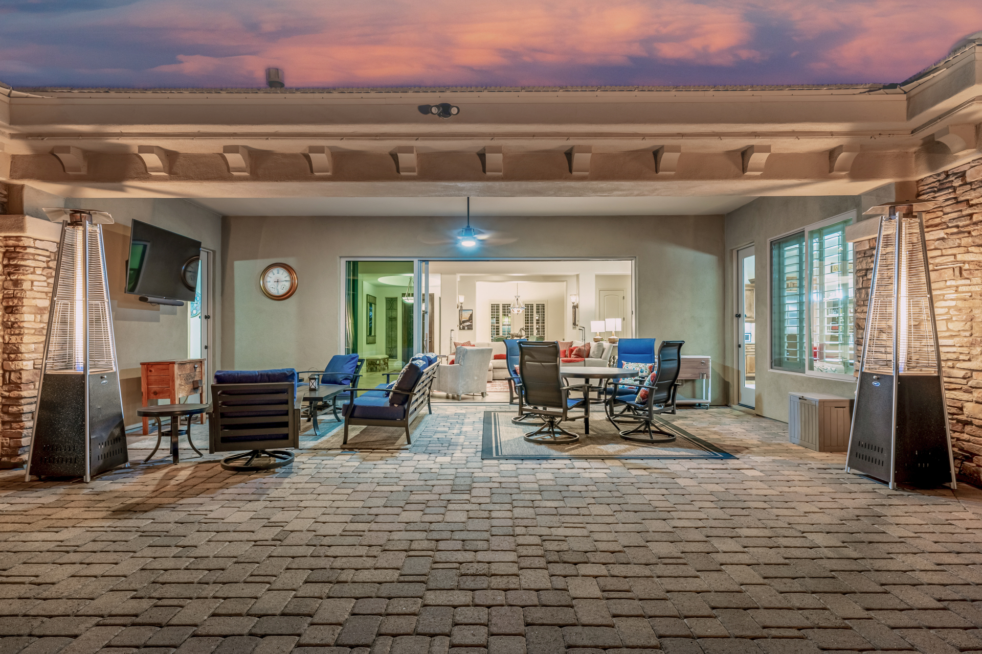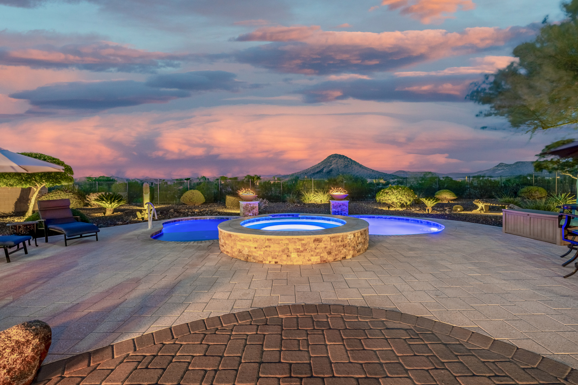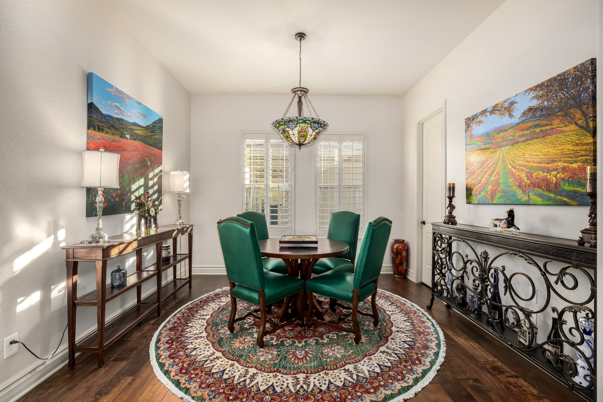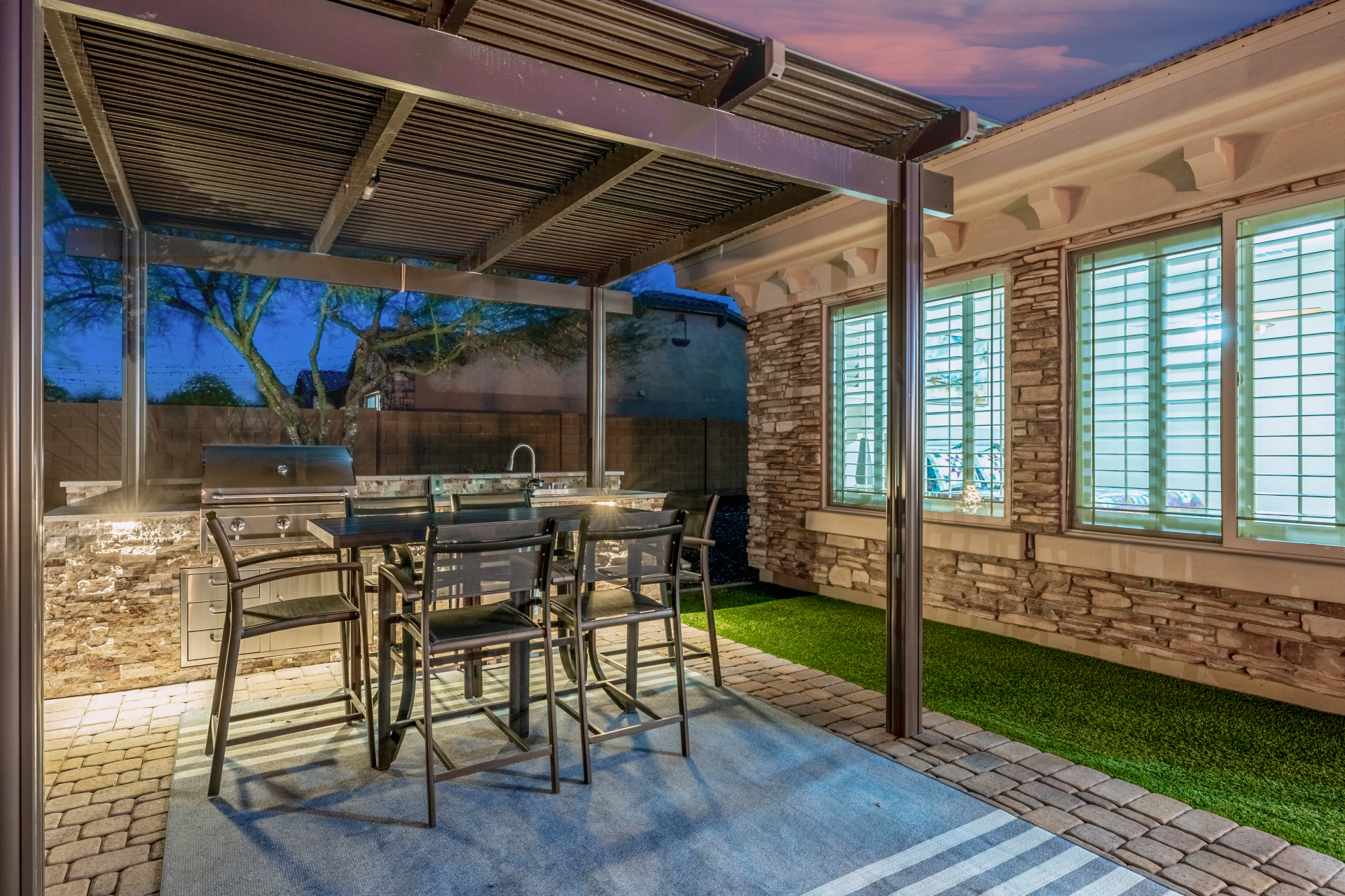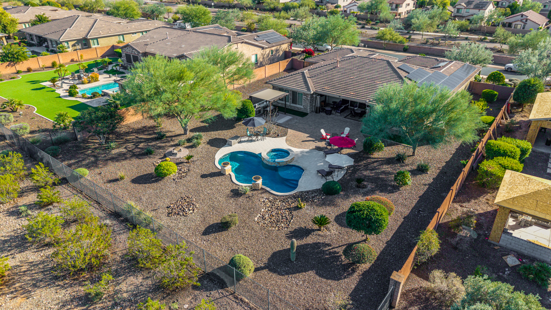 Perched on one of the larger lots overlooking the 4th fairway, this exceptional residence captures breathtaking golf course views and timeless Tuscan-inspired elegance. Beyond the private iron gate, a charming front courtyard welcomes you, featuring a 230 square foot bonus room, perfect for a private office, media room, studio or custom retreat tailored to your lifestyle. The main residence spans 3,358 square feet of thoughtfully designed living space, showcasing superior craftsmanship throughout. The kitchen is a true centerpiece, with a massive granite island and breakfast bar, buffet countertop, upgraded cabinetry with custom pull-out shelving, gas cooktop, built-in refrigerator and a spacious eat-in area ideal for both everyday living and entertaining.