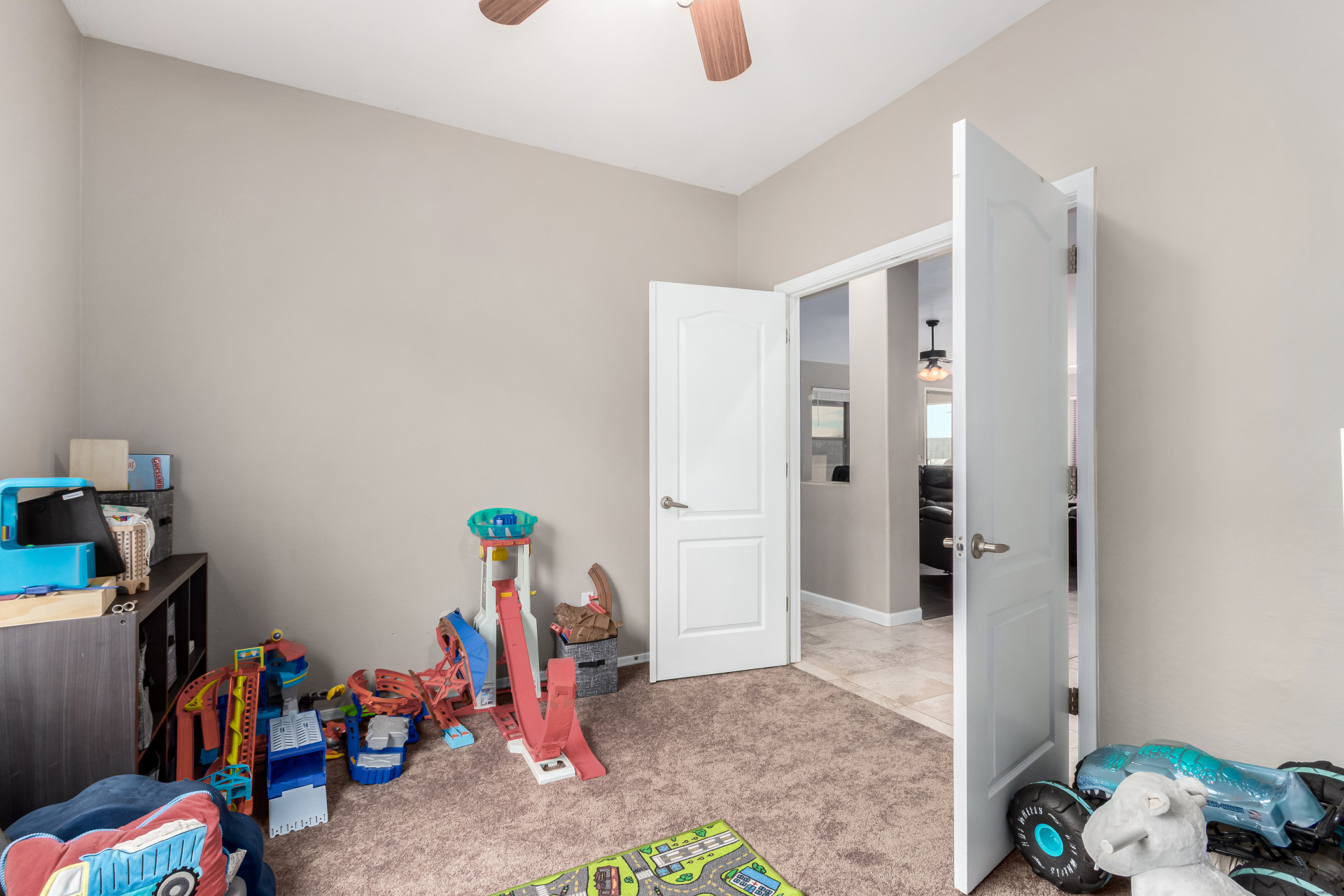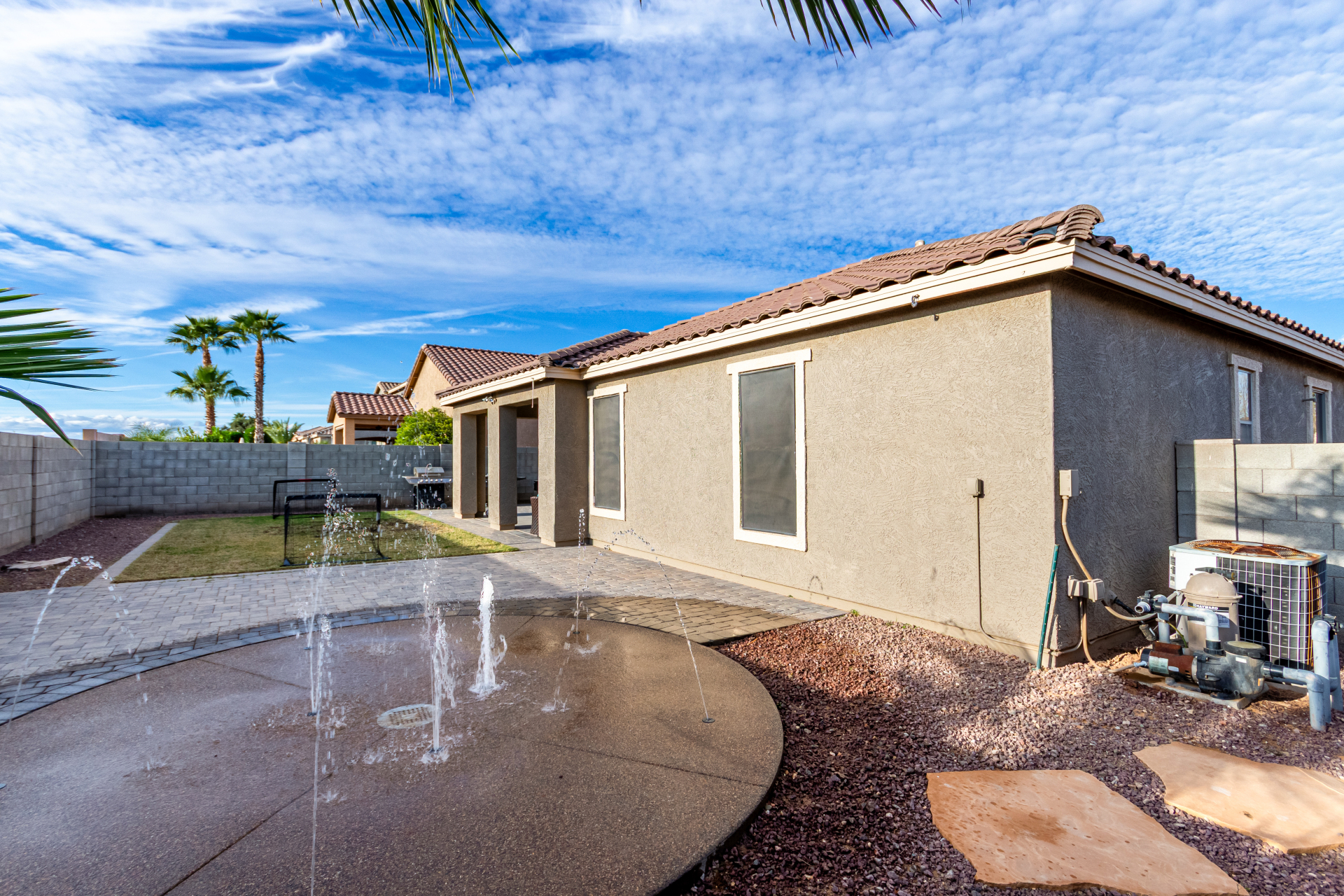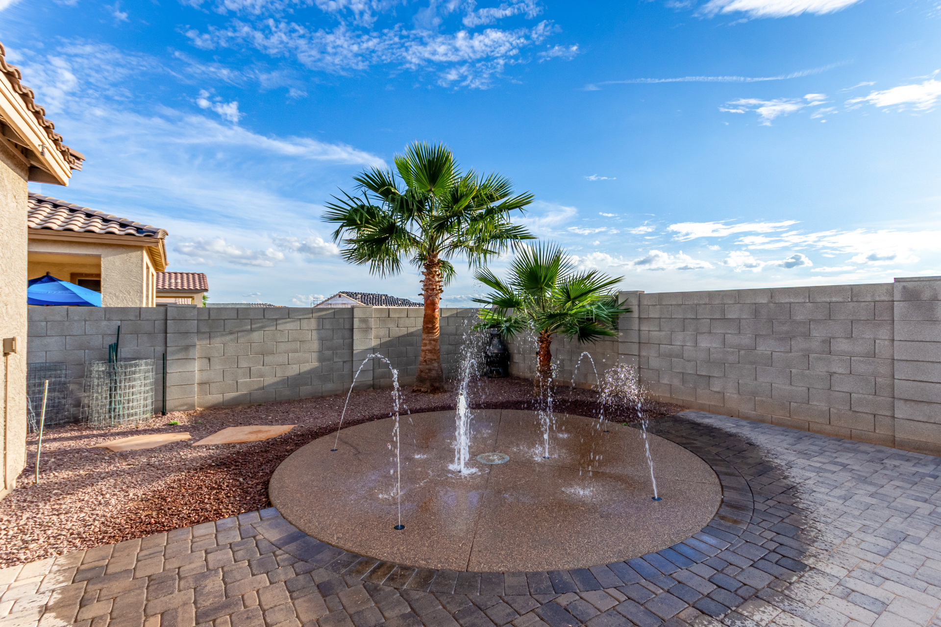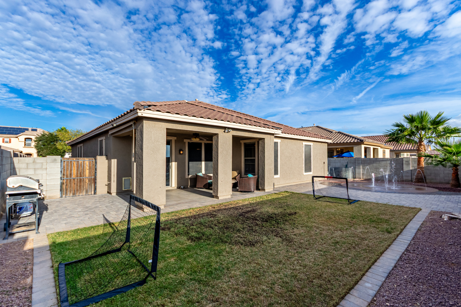 Welcome to this adorable home with an open floor plan, perfectly situated in a growing and desirable area of Surprise. Filled with natural light and finished in soft, neutral tones, this home offers three bedrooms plus a versatile office or playroom, along with formal living and dining spaces ideal for everyday living and entertaining. The heart of the home features a spacious kitchen with a large island and breakfast bar, granite countertops, gas stovetop, double ovens, and an eat-in area. Enjoy peace of mind with brand new carpet, new blinds, and a recently painted interior and exterior. A 10 ft. RV gate and rare 2.5 car garage provides extra room for storage and toys. Step outside to a backyard designed for Arizona living, complete with a large covered patio, a grassy area and a refreshing splash pad, perfect for cooling off during warm summer days.