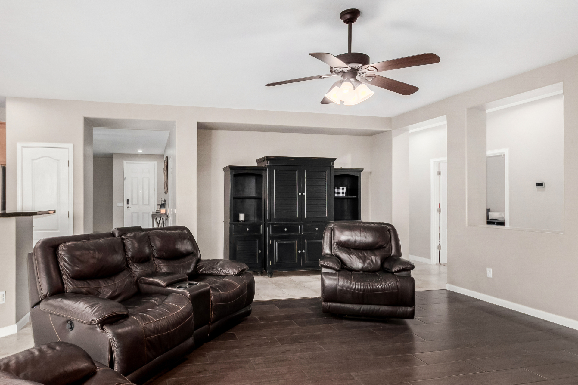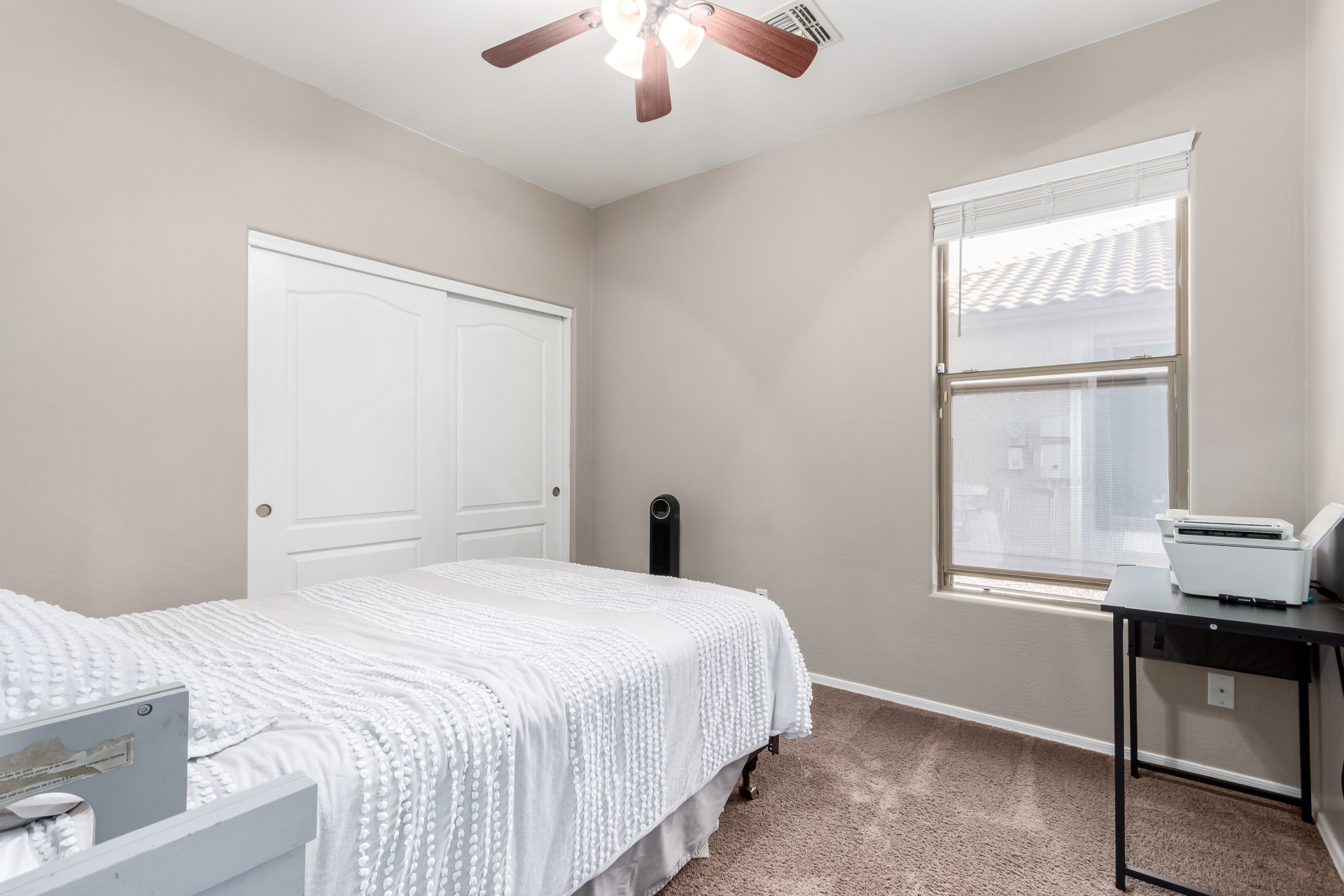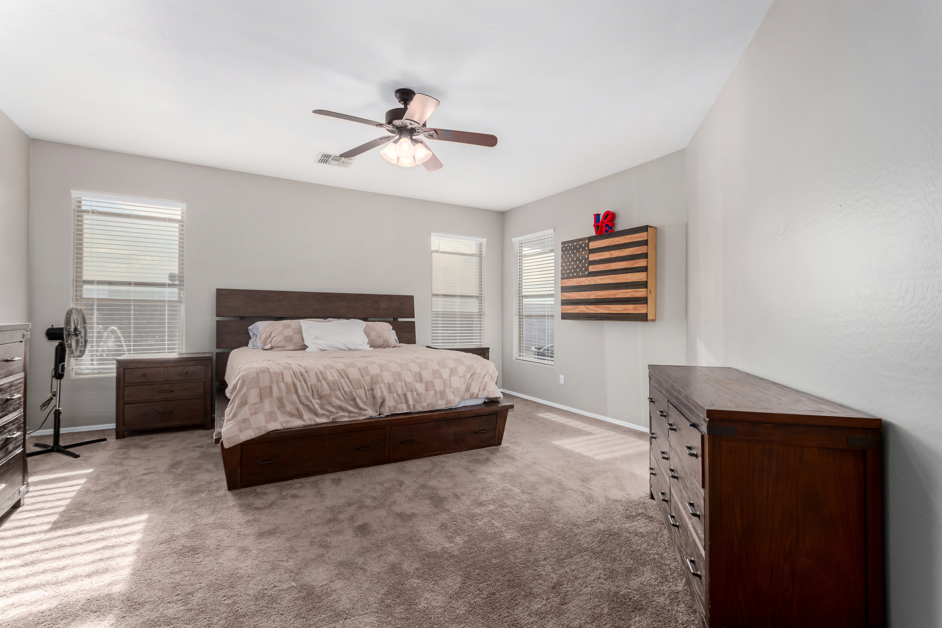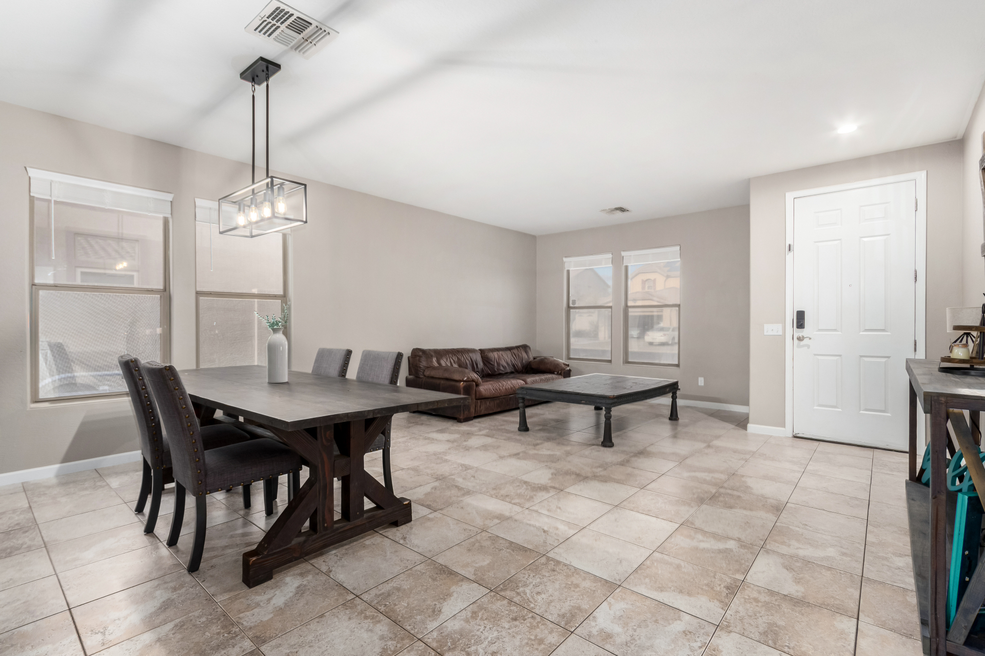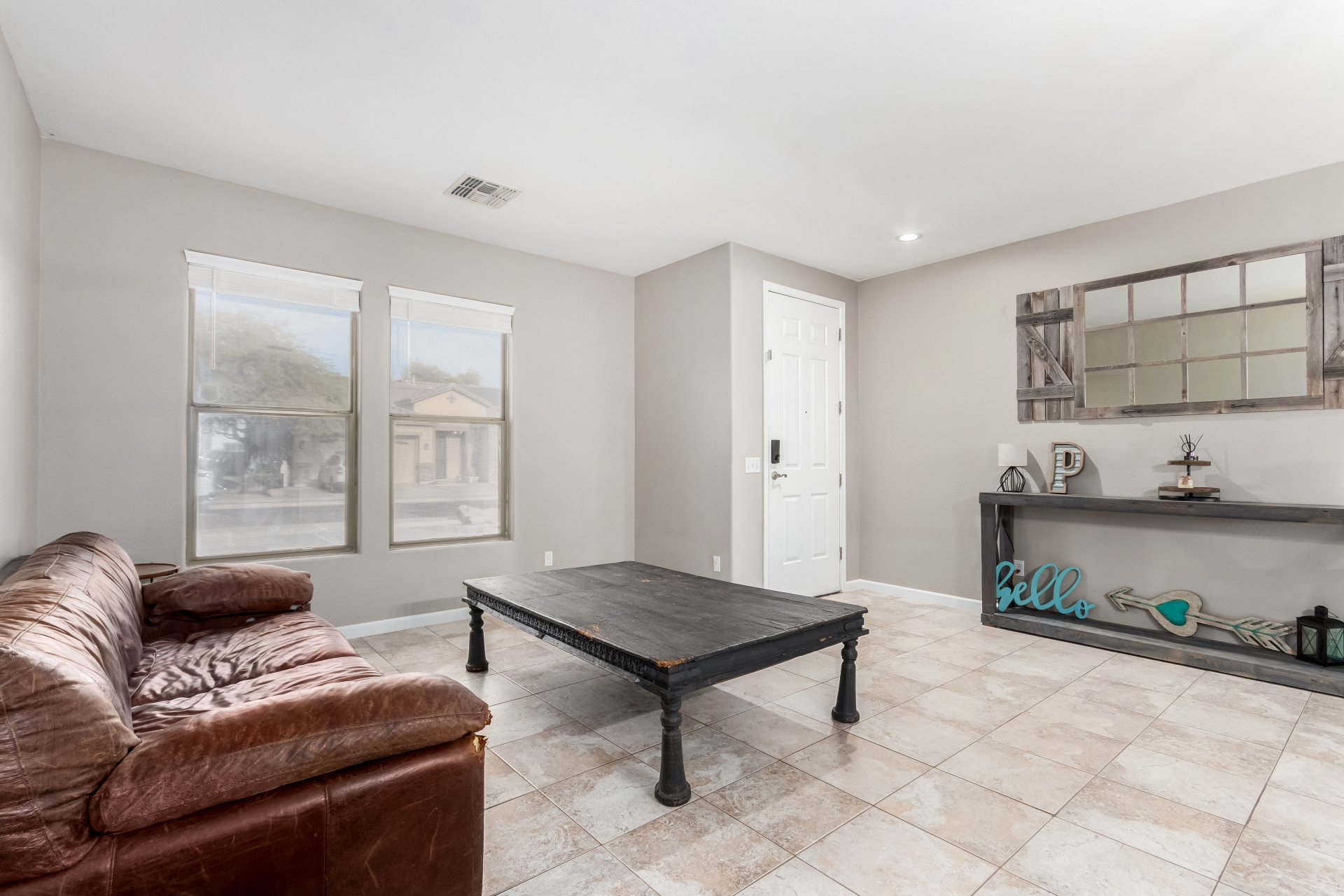 Welcome to this adorable home with an open floor plan, perfectly situated in a growing and desirable area of Surprise. Filled with natural light and finished in soft, neutral tones, this home offers three bedrooms plus a versatile office or playroom, along with formal living and dining spaces ideal for everyday living and entertaining. The heart of the home features a spacious kitchen with a large island and breakfast bar, granite countertops, gas stovetop, double ovens, and an eat-in area. Enjoy peace of mind with brand new carpet, new blinds, and a recently painted interior and exterior. A 10 ft. RV gate and rare 2.5 car garage provides extra room for storage and toys. Step outside to a backyard designed for Arizona living, complete with a large covered patio, a grassy area and a refreshing splash pad, perfect for cooling off during warm summer days.