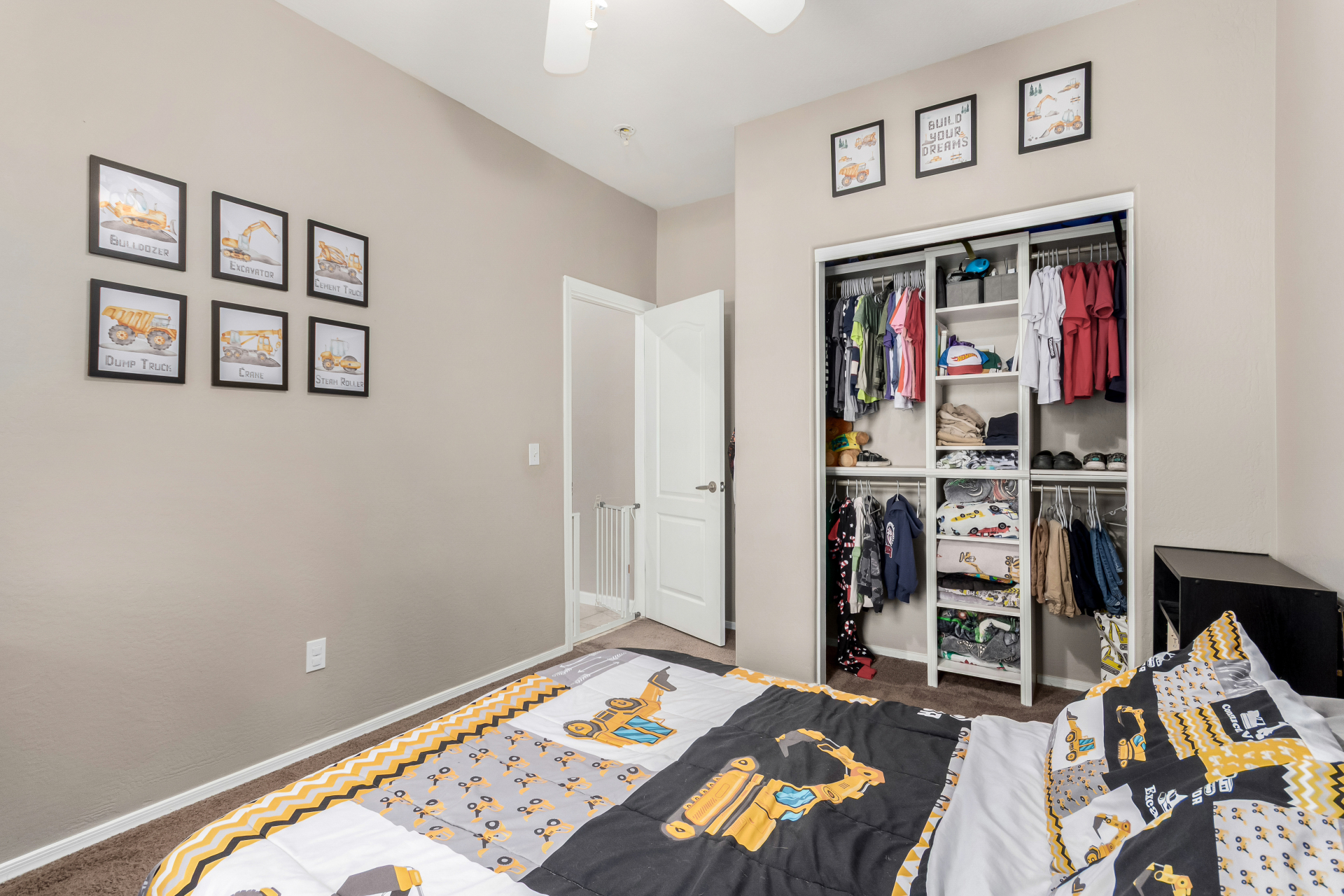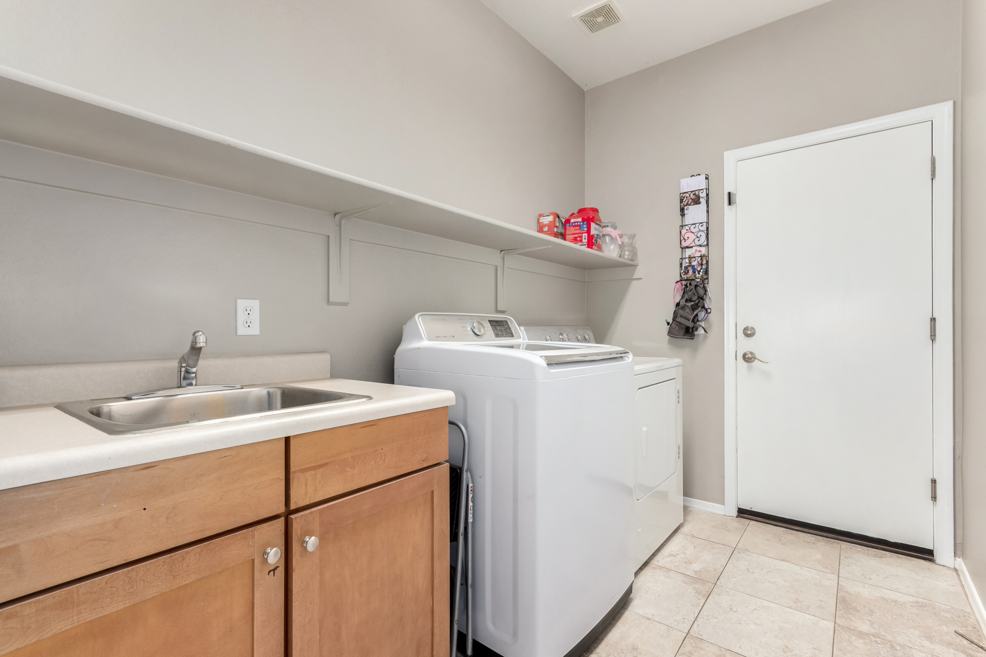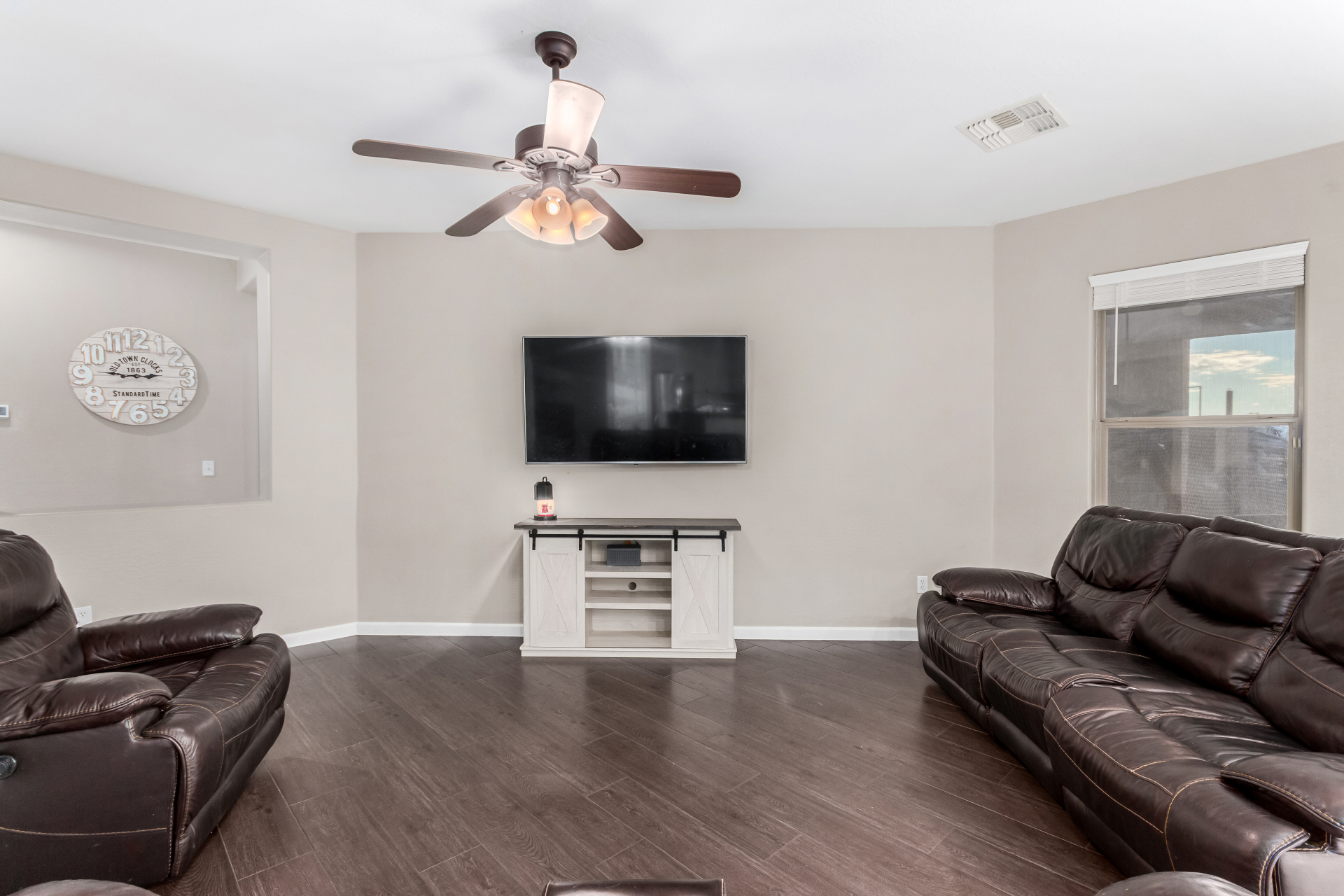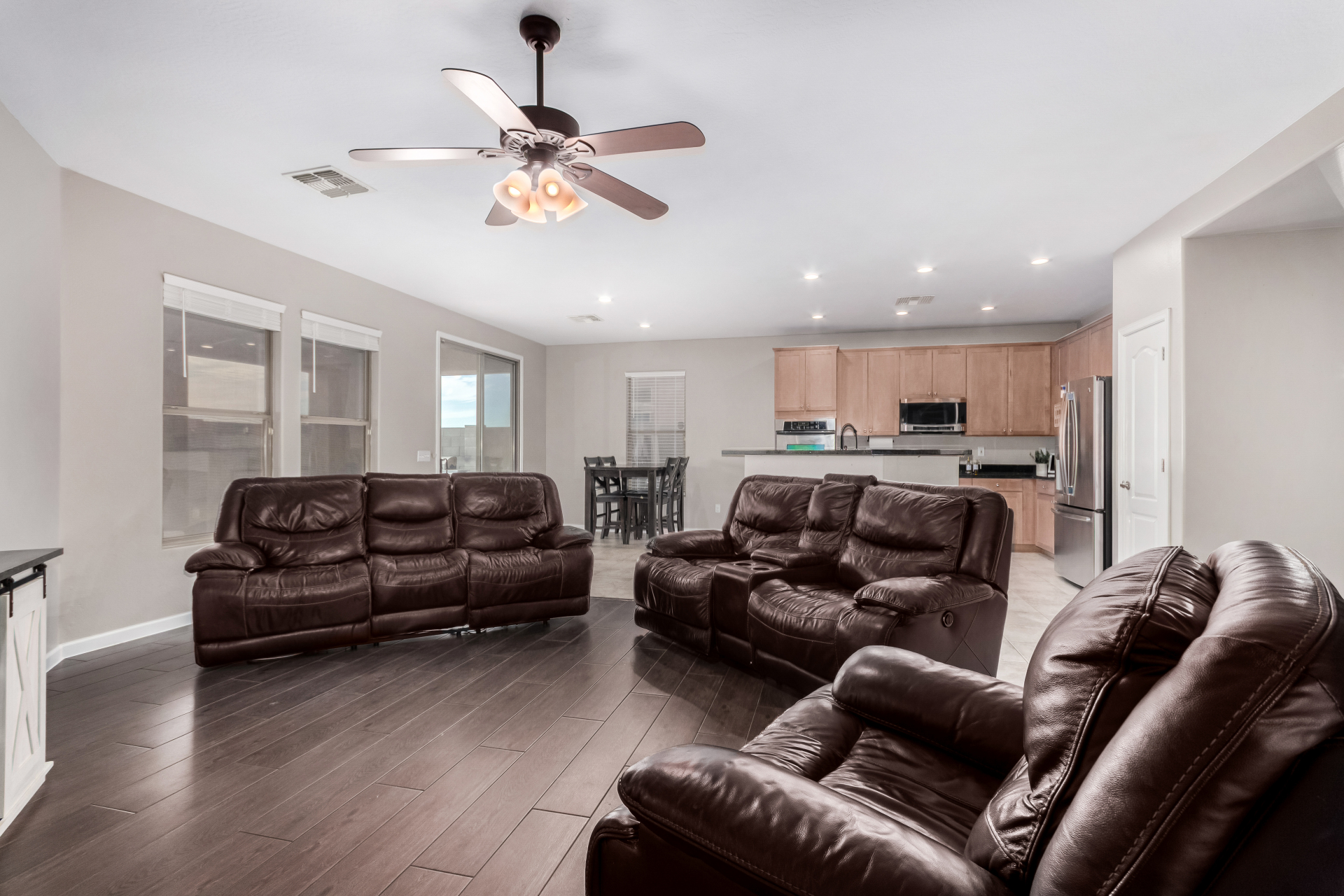 Welcome to this adorable home with an open floor plan, perfectly situated in a growing and desirable area of Surprise. Filled with natural light and finished in soft, neutral tones, this home offers three bedrooms plus a versatile office or playroom, along with formal living and dining spaces ideal for everyday living and entertaining. The heart of the home features a spacious kitchen with a large island and breakfast bar, granite countertops, gas stovetop, double ovens, and an eat-in area. Enjoy peace of mind with brand new carpet, new blinds, and a recently painted interior and exterior. A 10 ft. RV gate and rare 2.5 car garage provides extra room for storage and toys. Step outside to a backyard designed for Arizona living, complete with a large covered patio, a grassy area and a refreshing splash pad, perfect for cooling off during warm summer days.