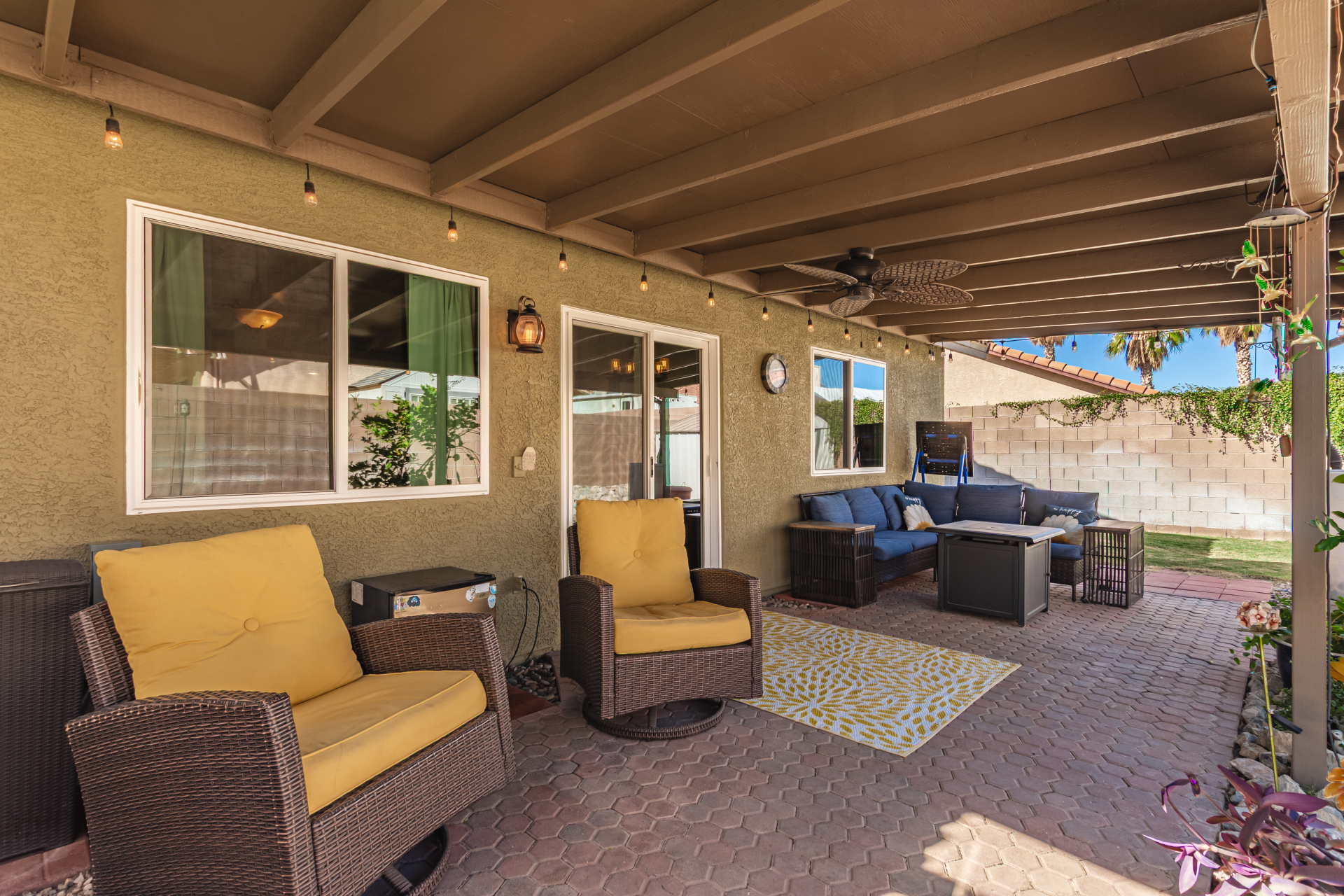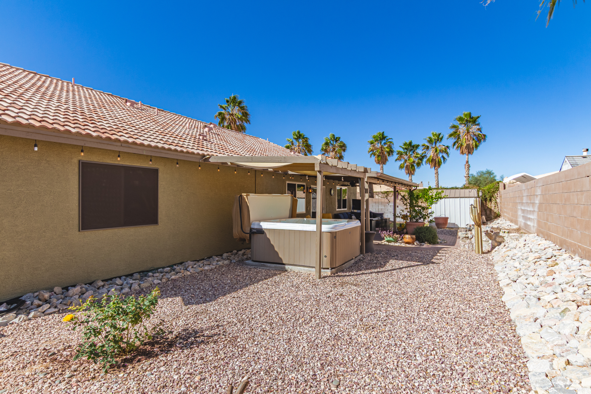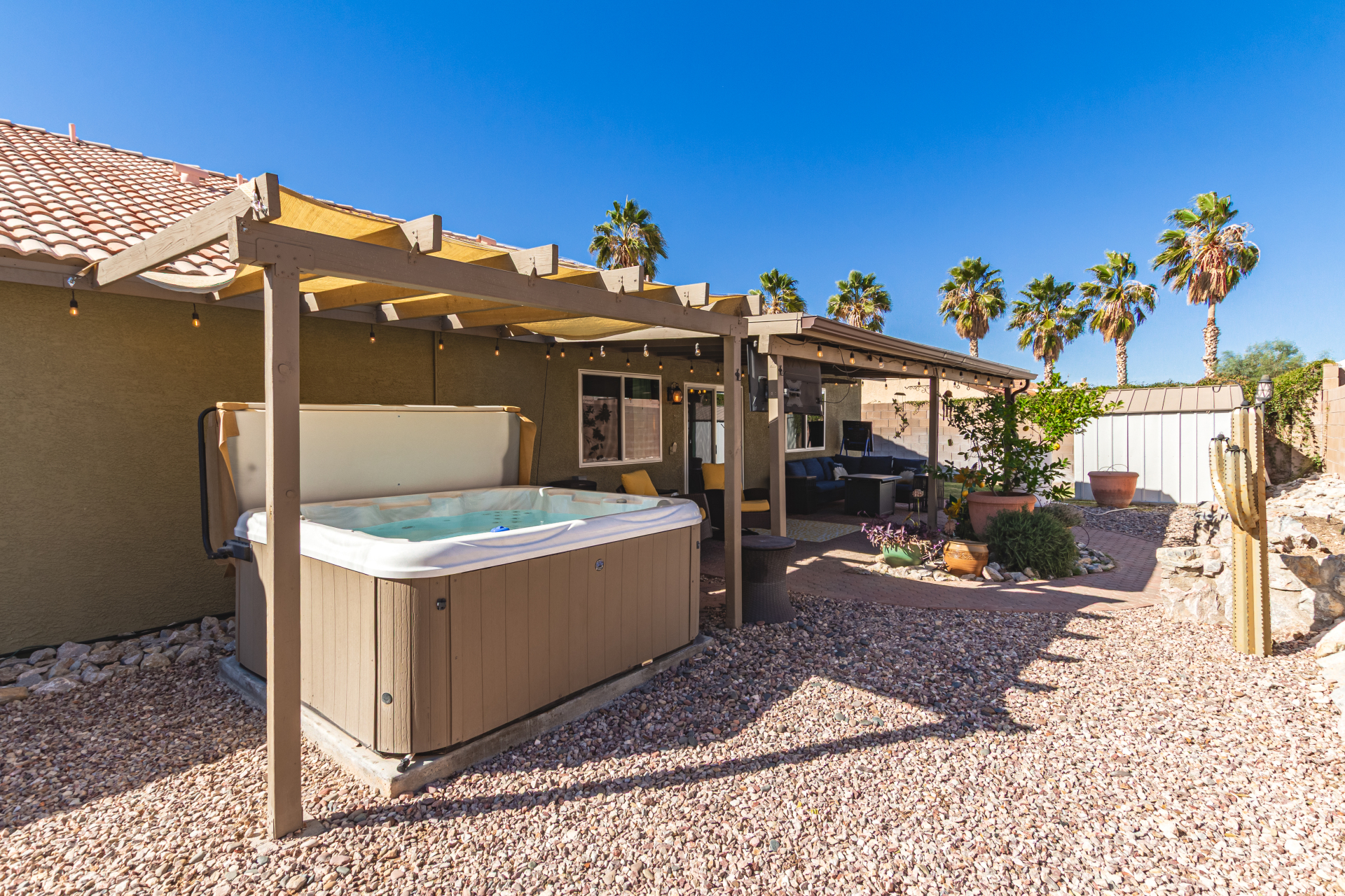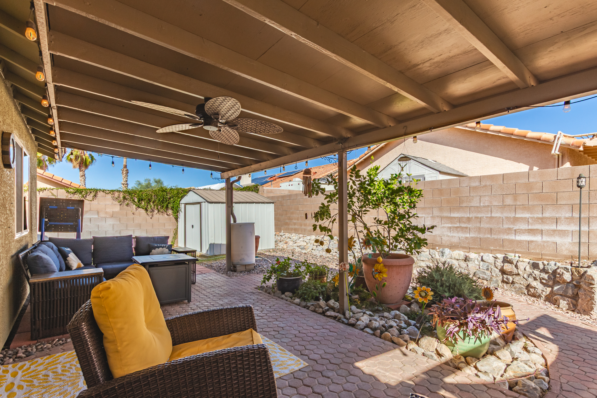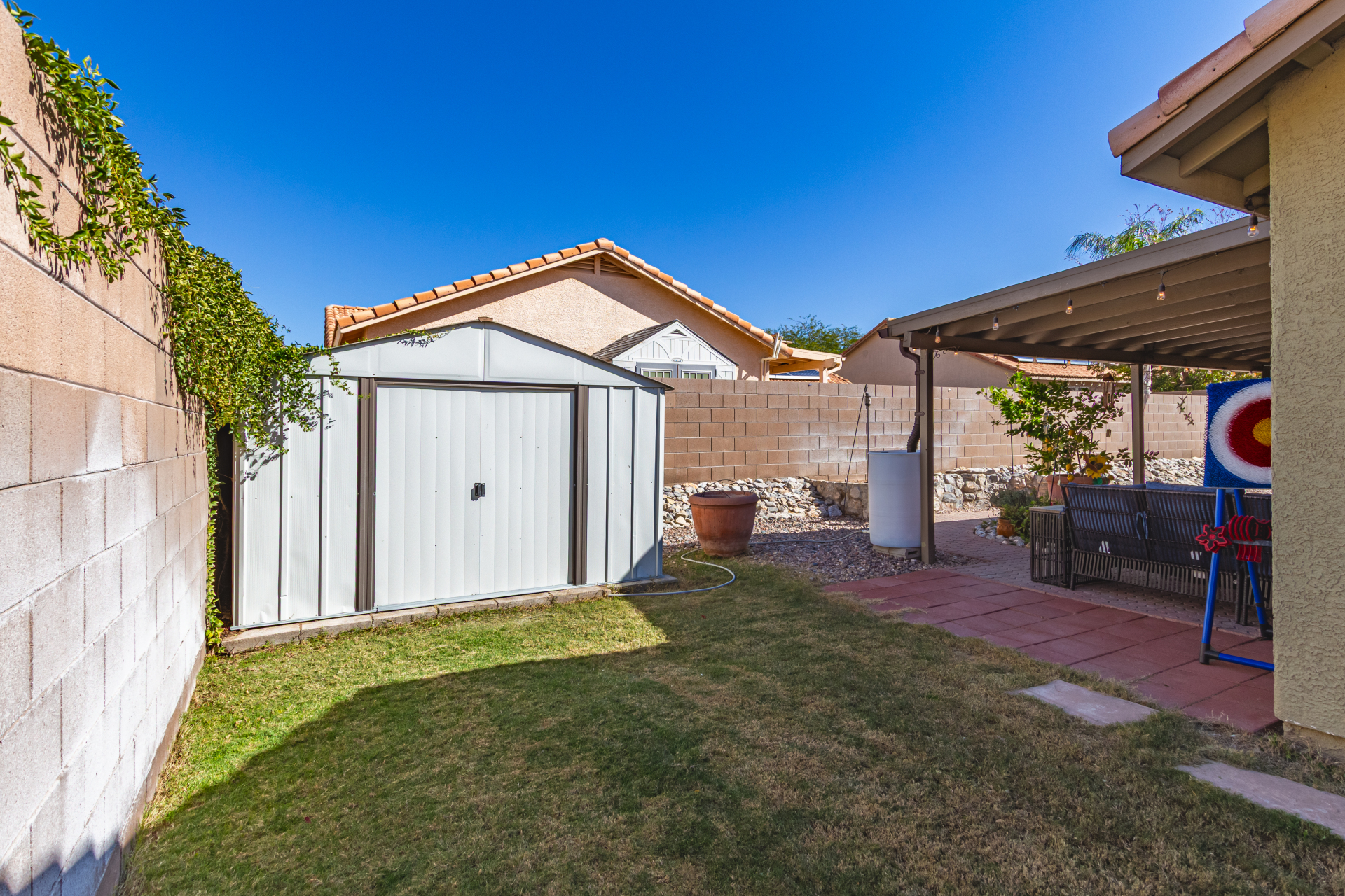 Inviting single-story home for SALE! The property welcomes you with a low-maintenance front yard & a convenient 2-car garage. Inside, tile flooring & vaulted ceilings enhance the bright great room, while the family room features a media niche. Beautiful kitchen showcases built-in appliances, Corian counters, a tile backsplash, recessed lighting, crown moulding in cabinets, a breakfast bar, & two pantries. The main bedroom has a walk-in closet & a charming barn-style sliding door that opens to the private bathroom, complete with dual sinks & a tiled shower. A spacious den with French glass doors adds flexibility. Charming backyard features a covered patio with a misting system, attractive pavers, a cozy fire pit, an above-ground spa, a storage shed, & a grassy area. Don't miss it!