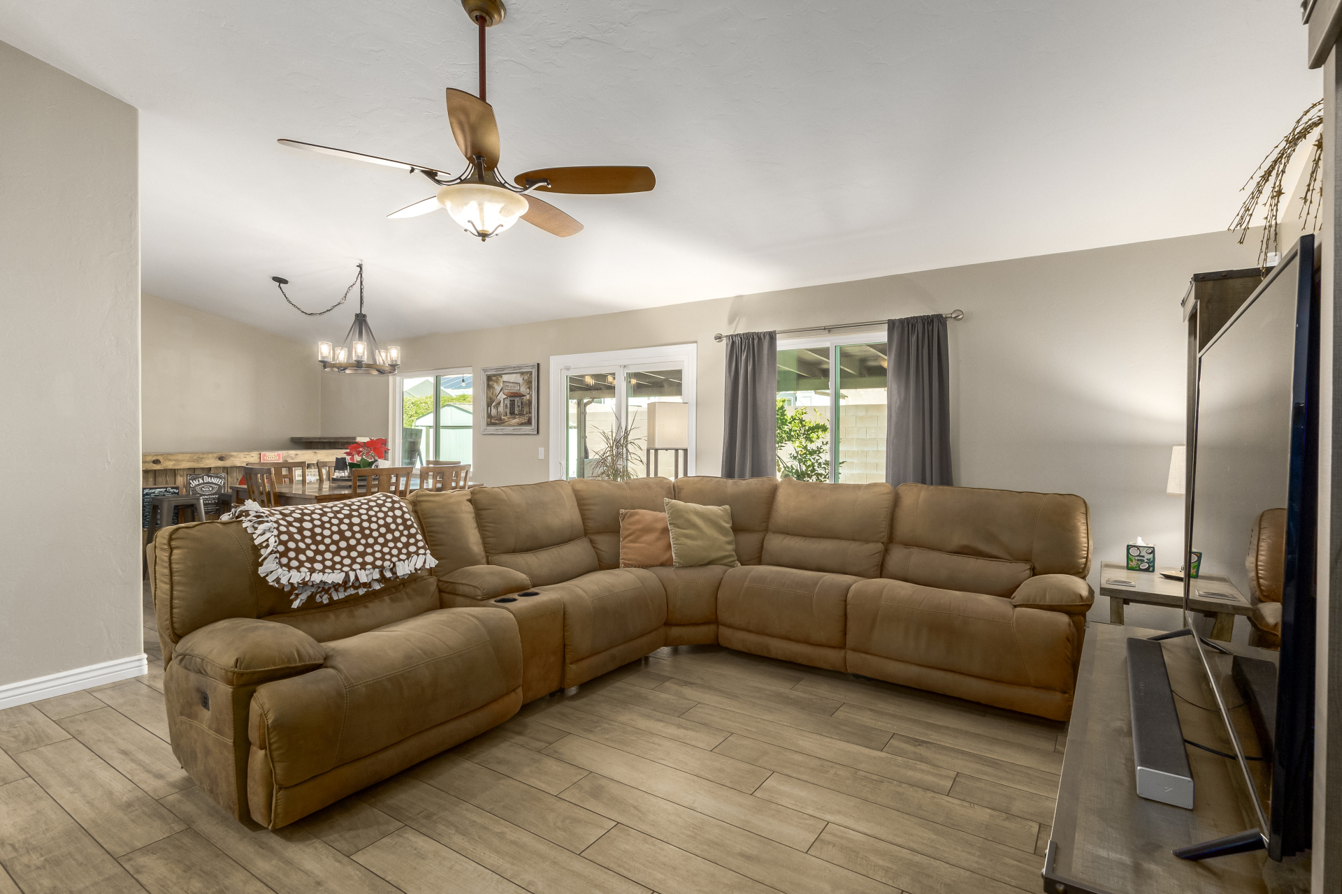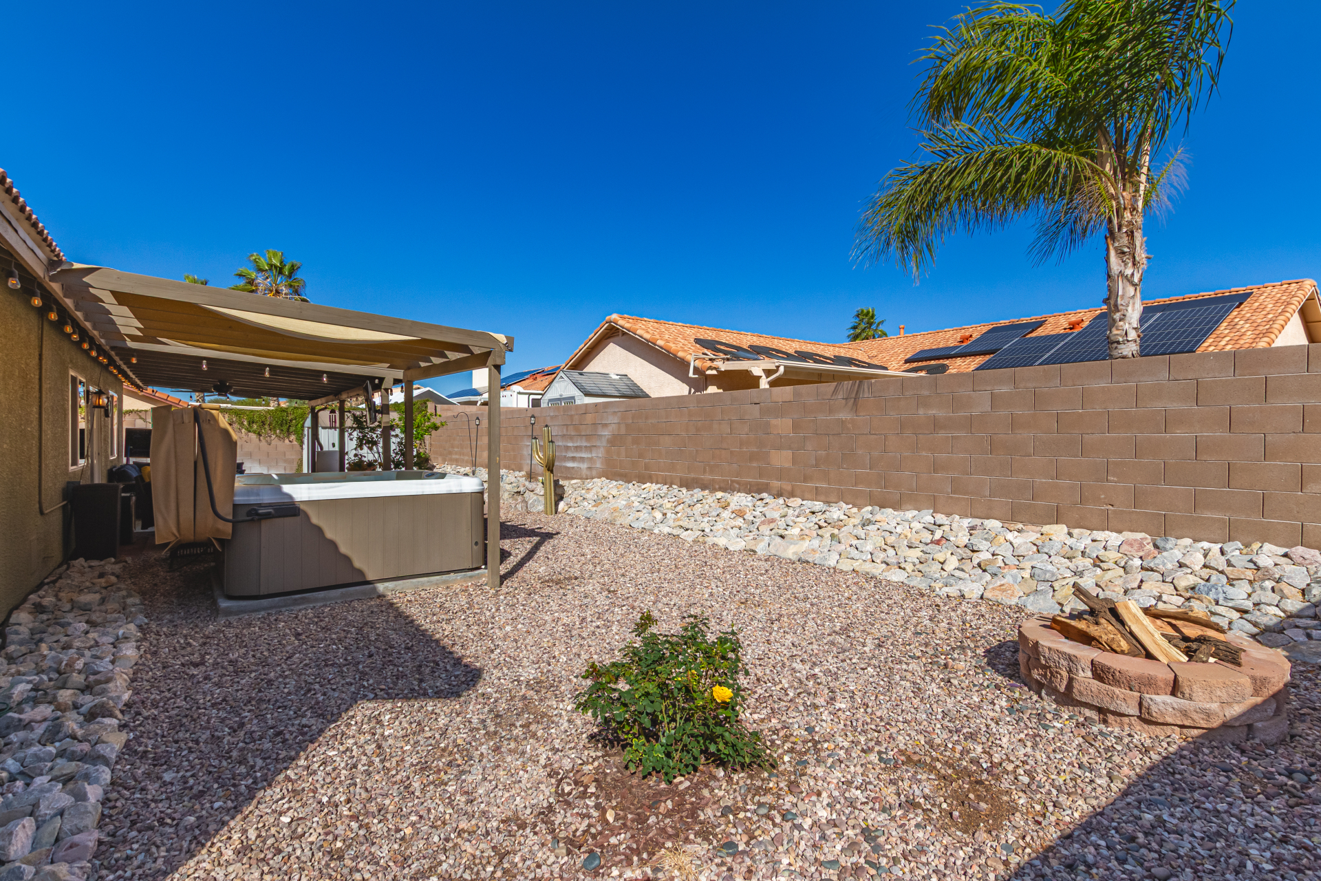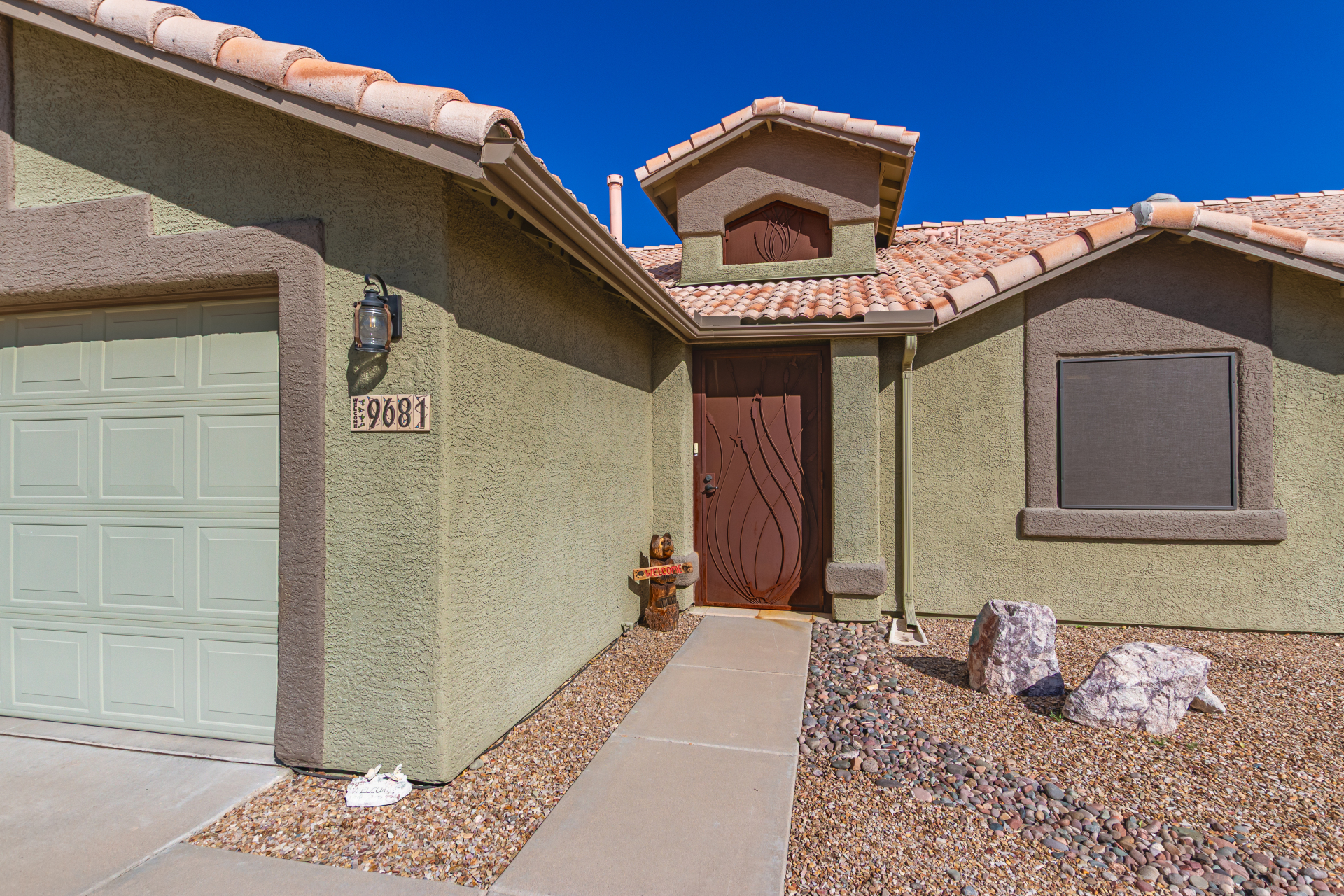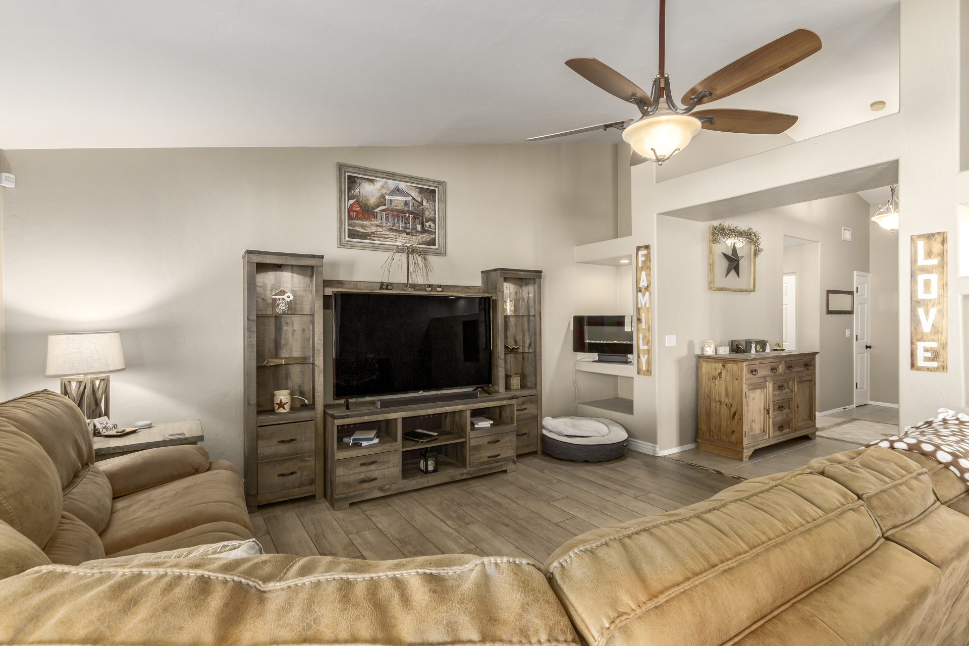 Inviting single-story home for SALE! The property welcomes you with a low-maintenance front yard & a convenient 2-car garage. Inside, tile flooring & vaulted ceilings enhance the bright great room, while the family room features a media niche. Beautiful kitchen showcases built-in appliances, Corian counters, a tile backsplash, recessed lighting, crown moulding in cabinets, a breakfast bar, & two pantries. The main bedroom has a walk-in closet & a charming barn-style sliding door that opens to the private bathroom, complete with dual sinks & a tiled shower. A spacious den with French glass doors adds flexibility. Charming backyard features a covered patio with a misting system, attractive pavers, a cozy fire pit, an above-ground spa, a storage shed, & a grassy area. Don't miss it!