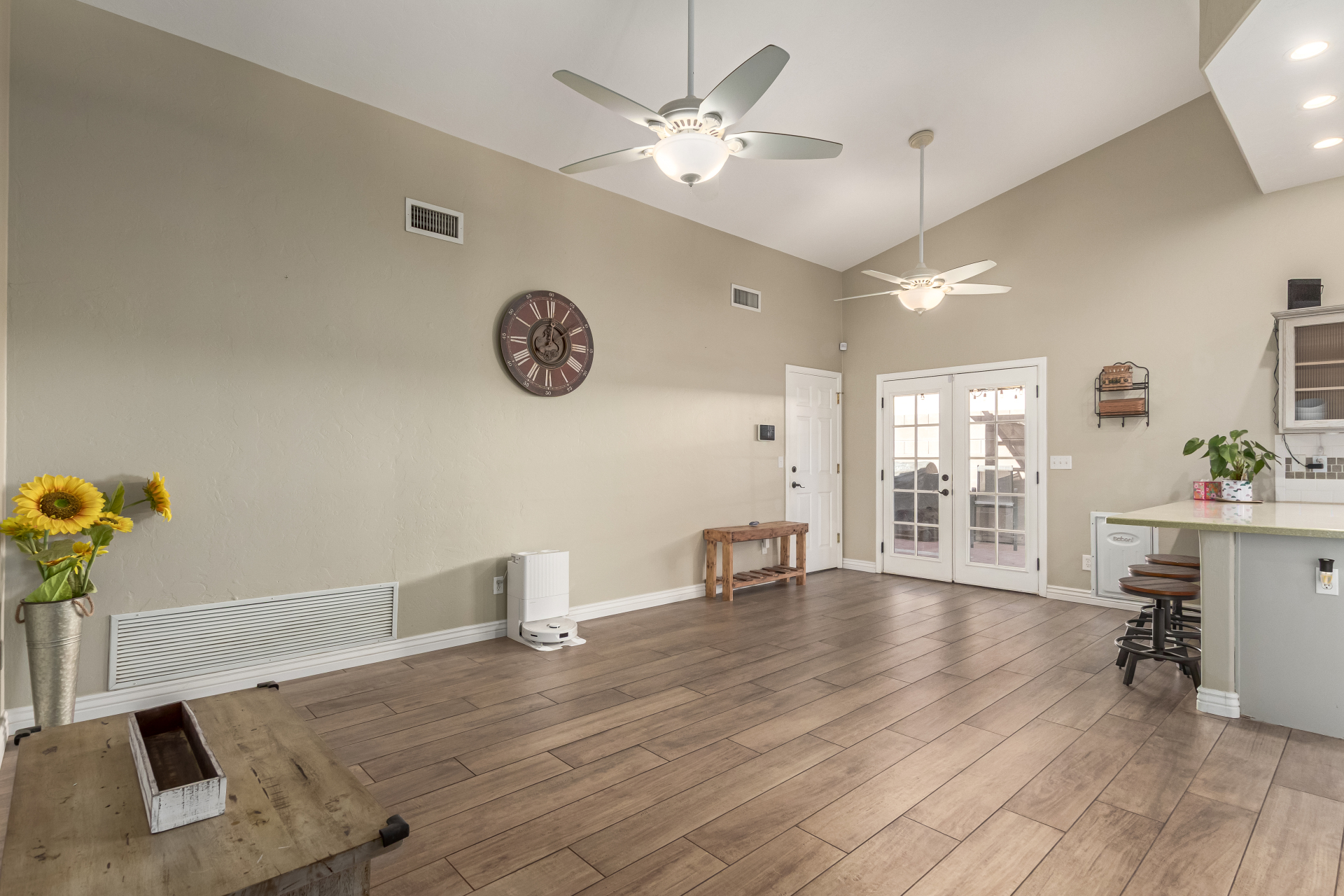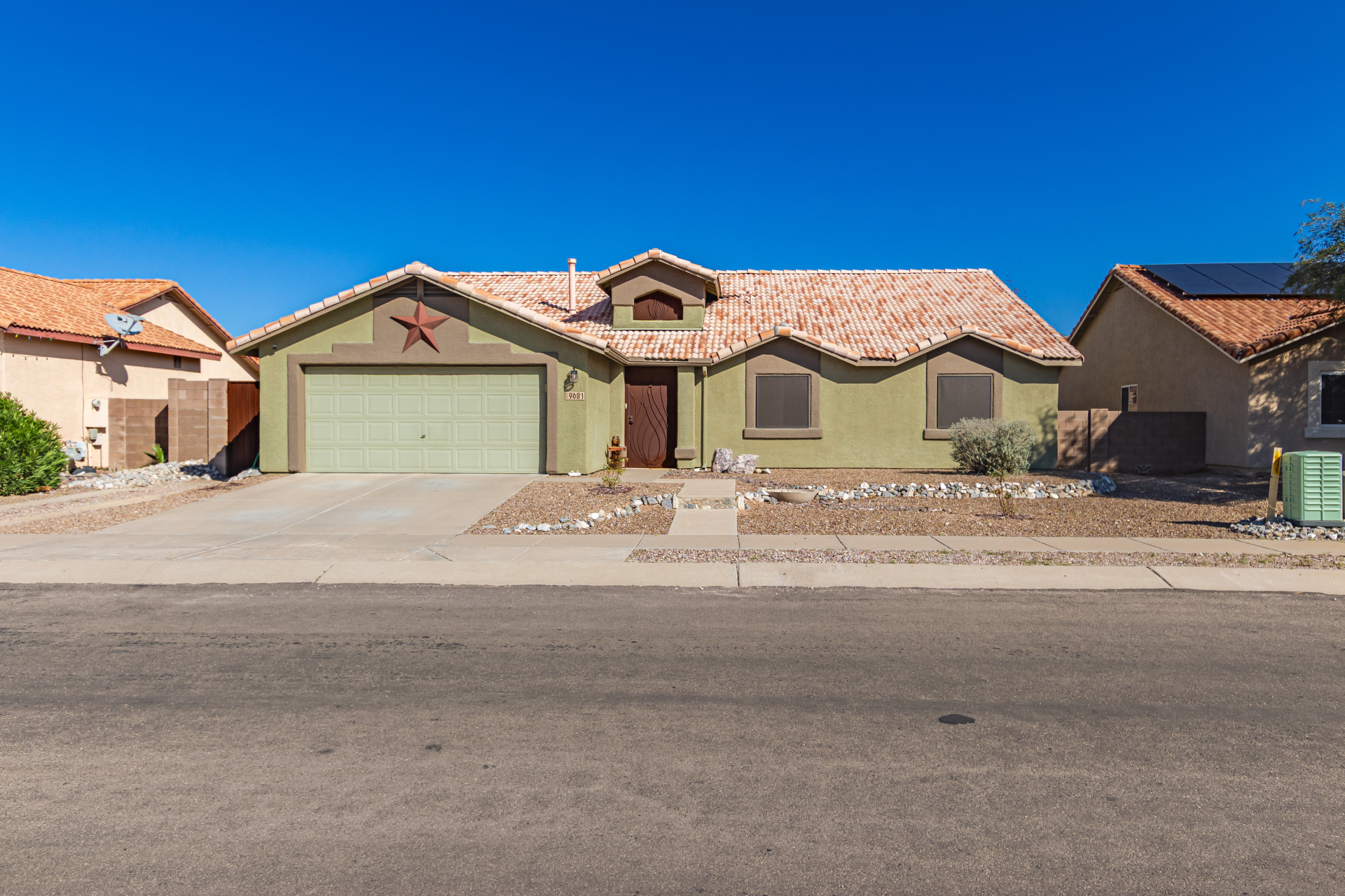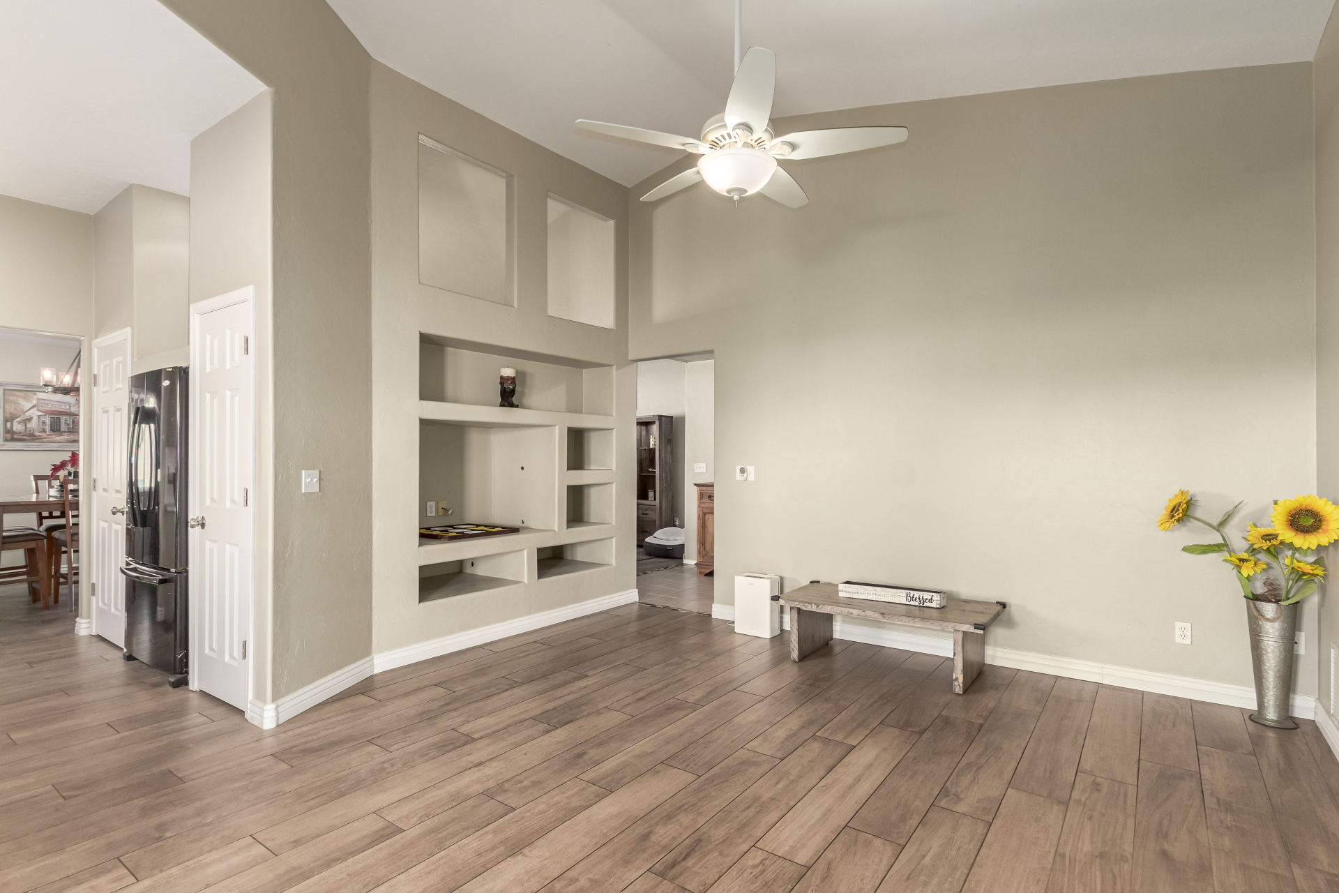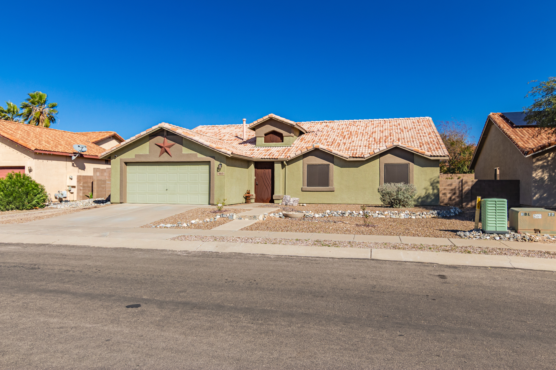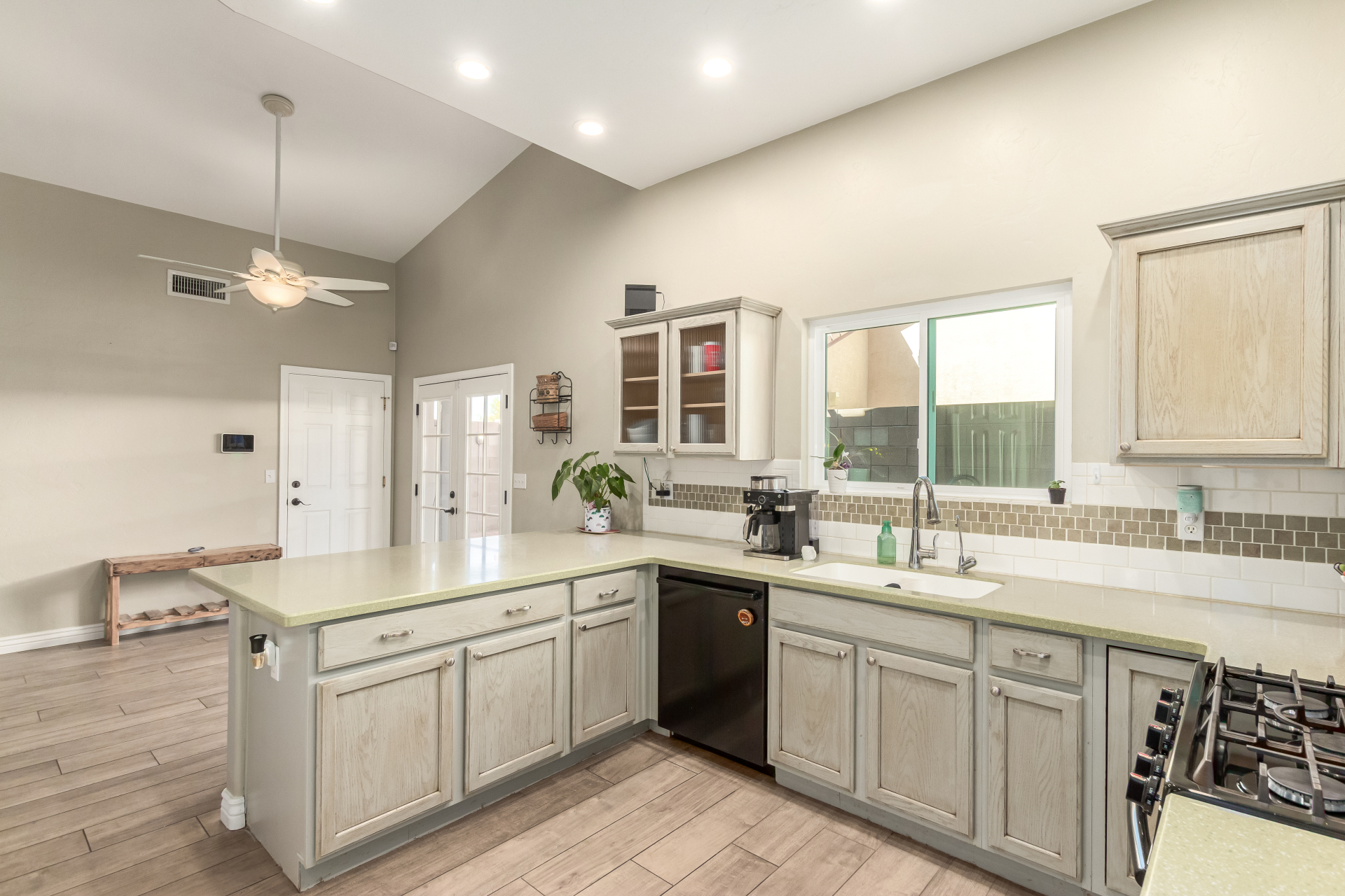 Inviting single-story home for SALE! The property welcomes you with a low-maintenance front yard & a convenient 2-car garage. Inside, tile flooring & vaulted ceilings enhance the bright great room, while the family room features a media niche. Beautiful kitchen showcases built-in appliances, Corian counters, a tile backsplash, recessed lighting, crown moulding in cabinets, a breakfast bar, & two pantries. The main bedroom has a walk-in closet & a charming barn-style sliding door that opens to the private bathroom, complete with dual sinks & a tiled shower. A spacious den with French glass doors adds flexibility. Charming backyard features a covered patio with a misting system, attractive pavers, a cozy fire pit, an above-ground spa, a storage shed, & a grassy area. Don't miss it!