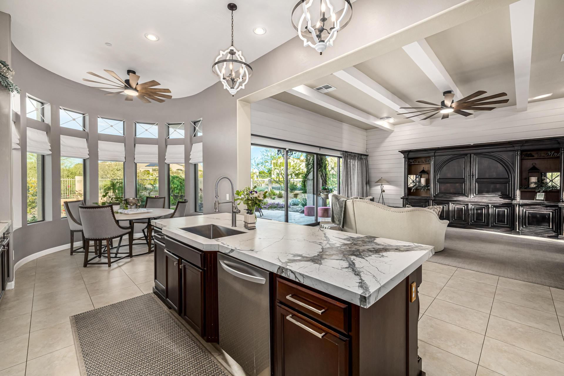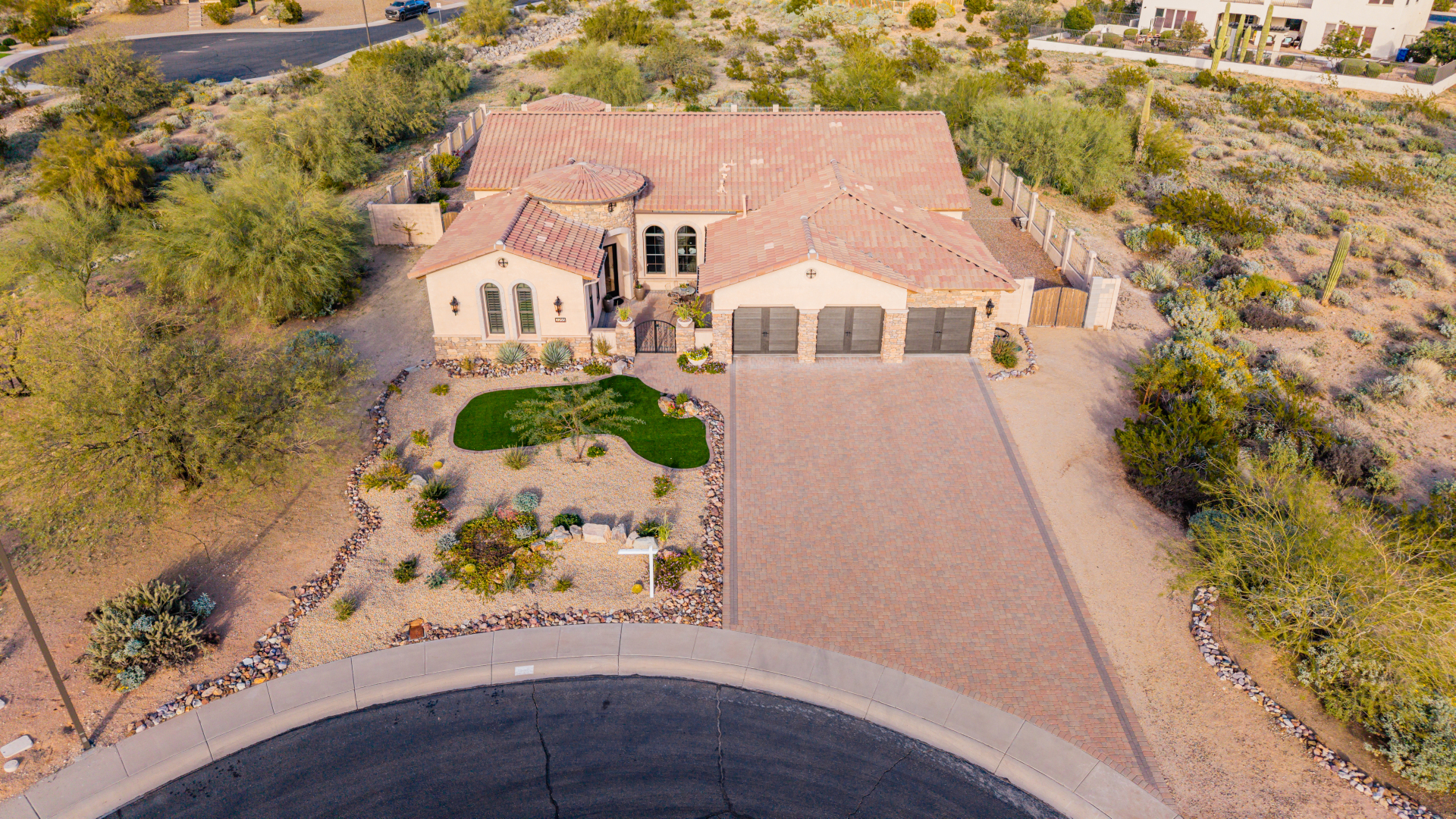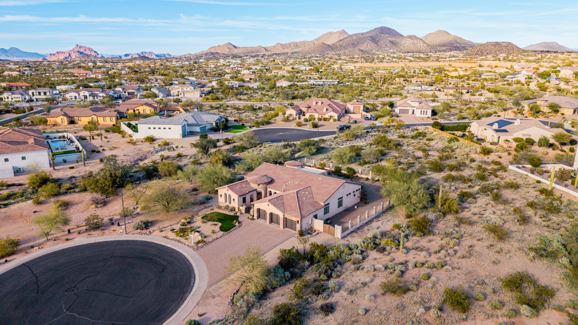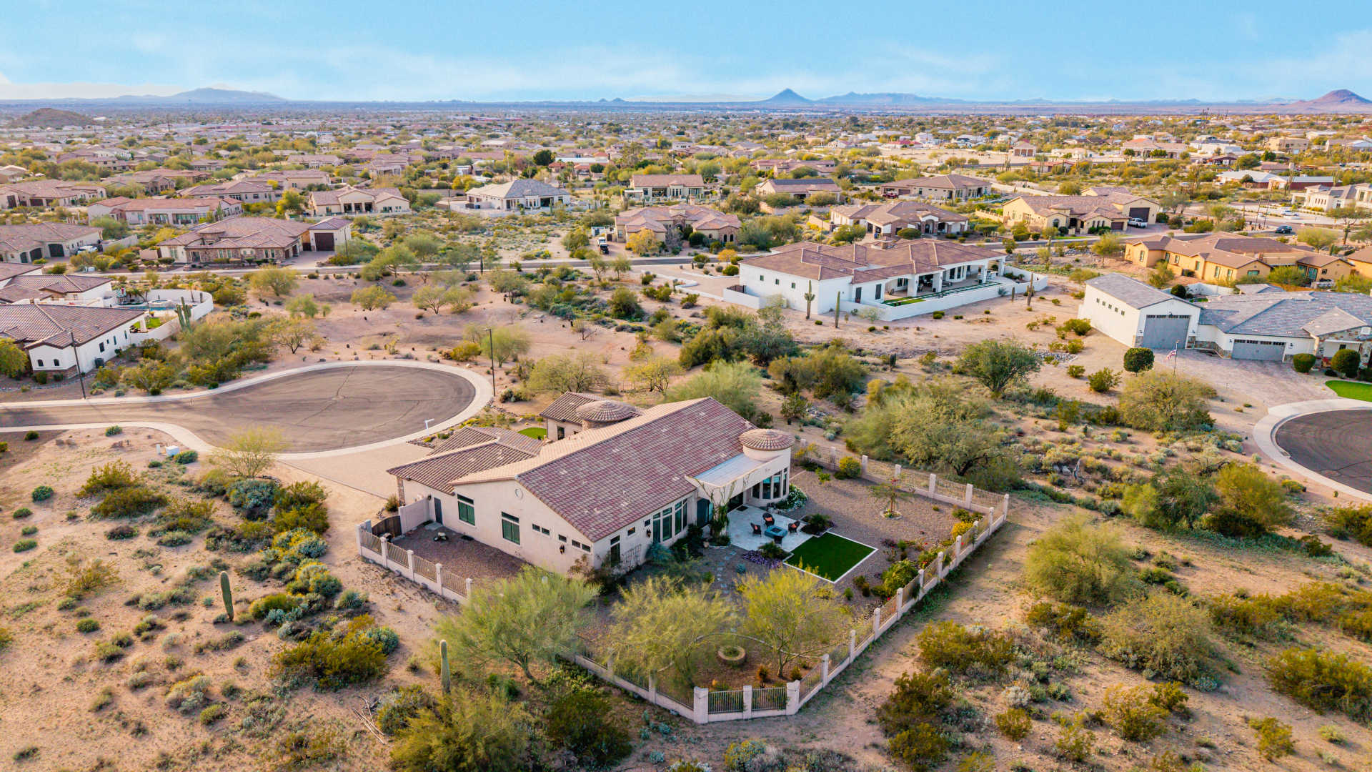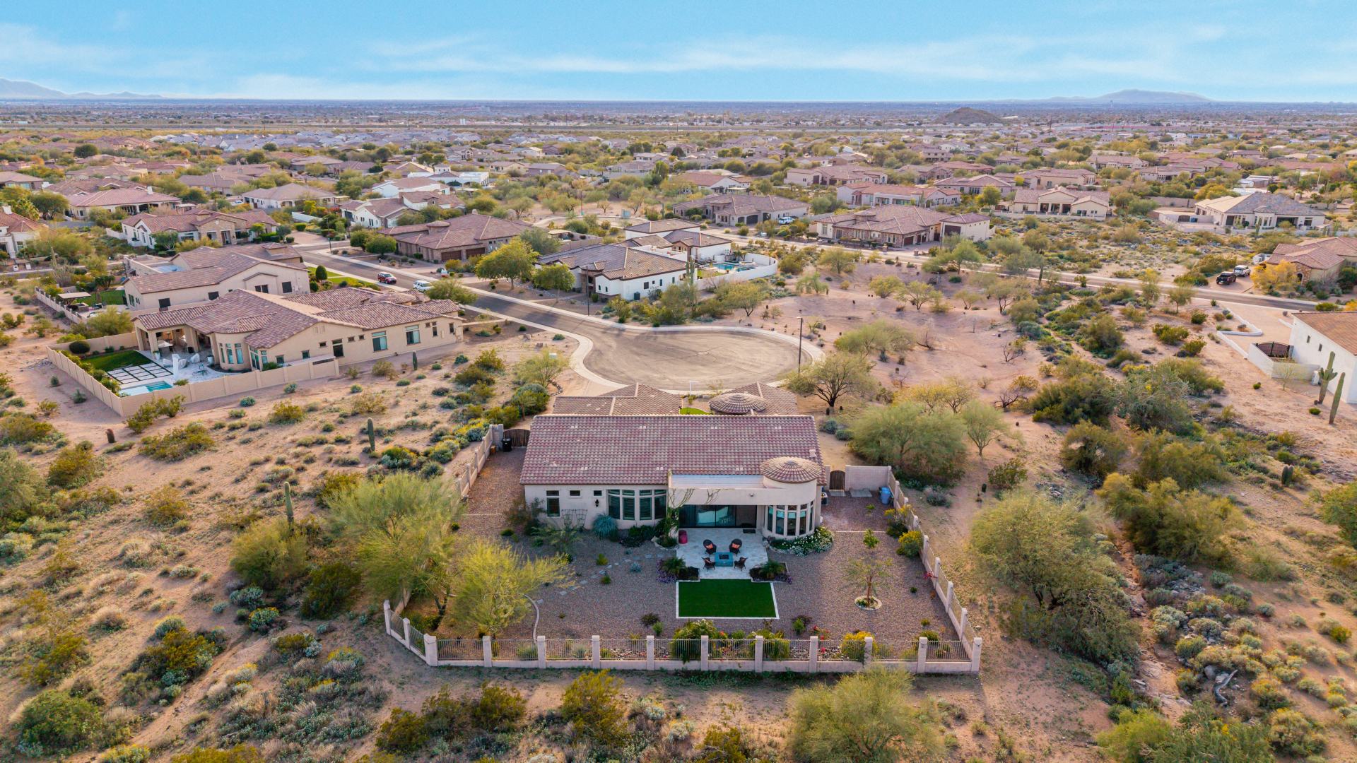 Exquisite semi-custom home on an expansive acre-plus lot, ideally positioned on a quiet cul-de-sac and surrounded by acres of pristine desert washes with breathtaking mountain views. Exceptional curb appeal sets the tone with modern custom garage doors, beautiful landscaping, and a private courtyard entry. This single-level residence offers 4 bedrooms and 3.5 baths, thoughtfully designed for privacy and functionality. Enter through the rotunda foyer, which provides access to the main home or the attached private casita—a full ensuite ideal for guests, multi-generational living, or a comfortable in-law suite. The main home showcases impressive upgrades throughout, including coffered ceilings, shiplap accent walls, plantation shutters, & designer lighting. Elegant formal living & dining areas create inviting spaces for entertaining.