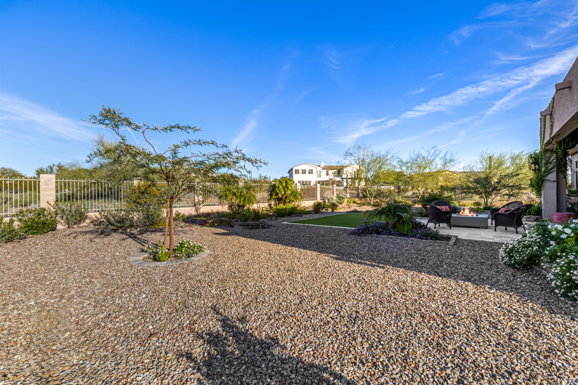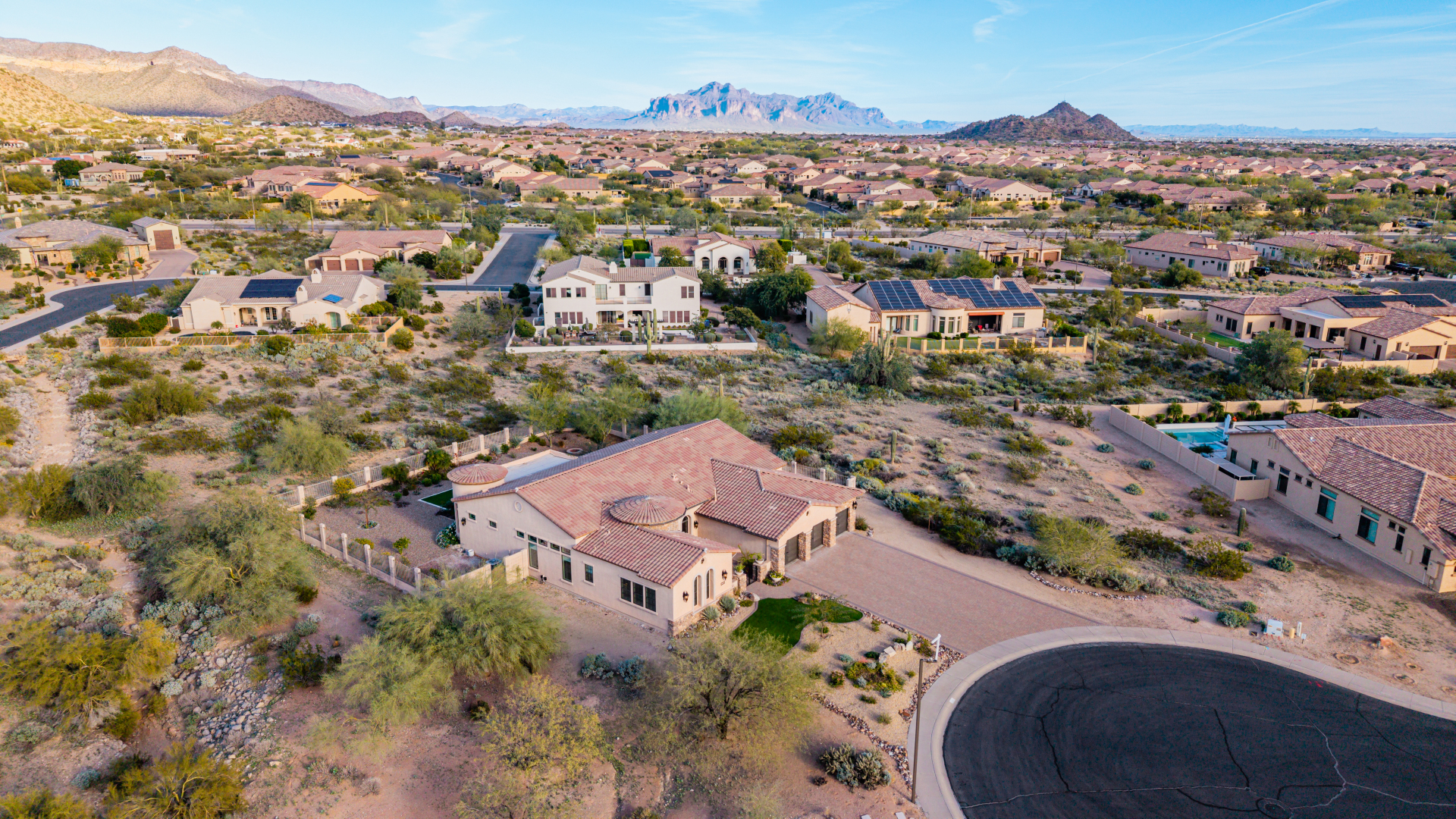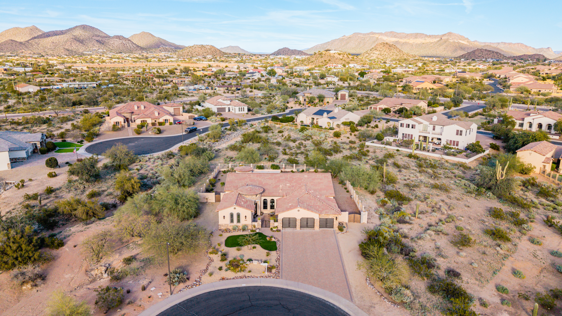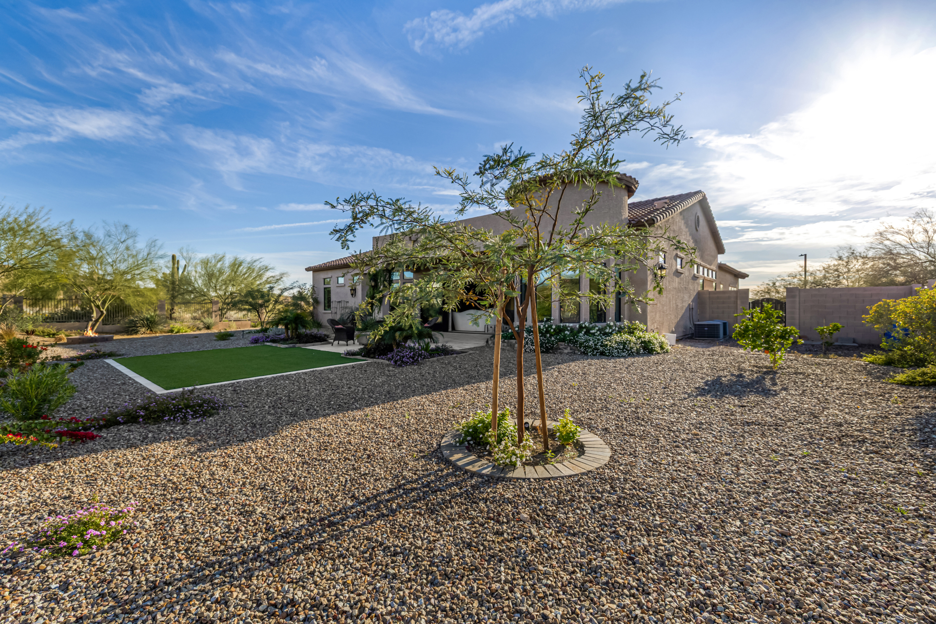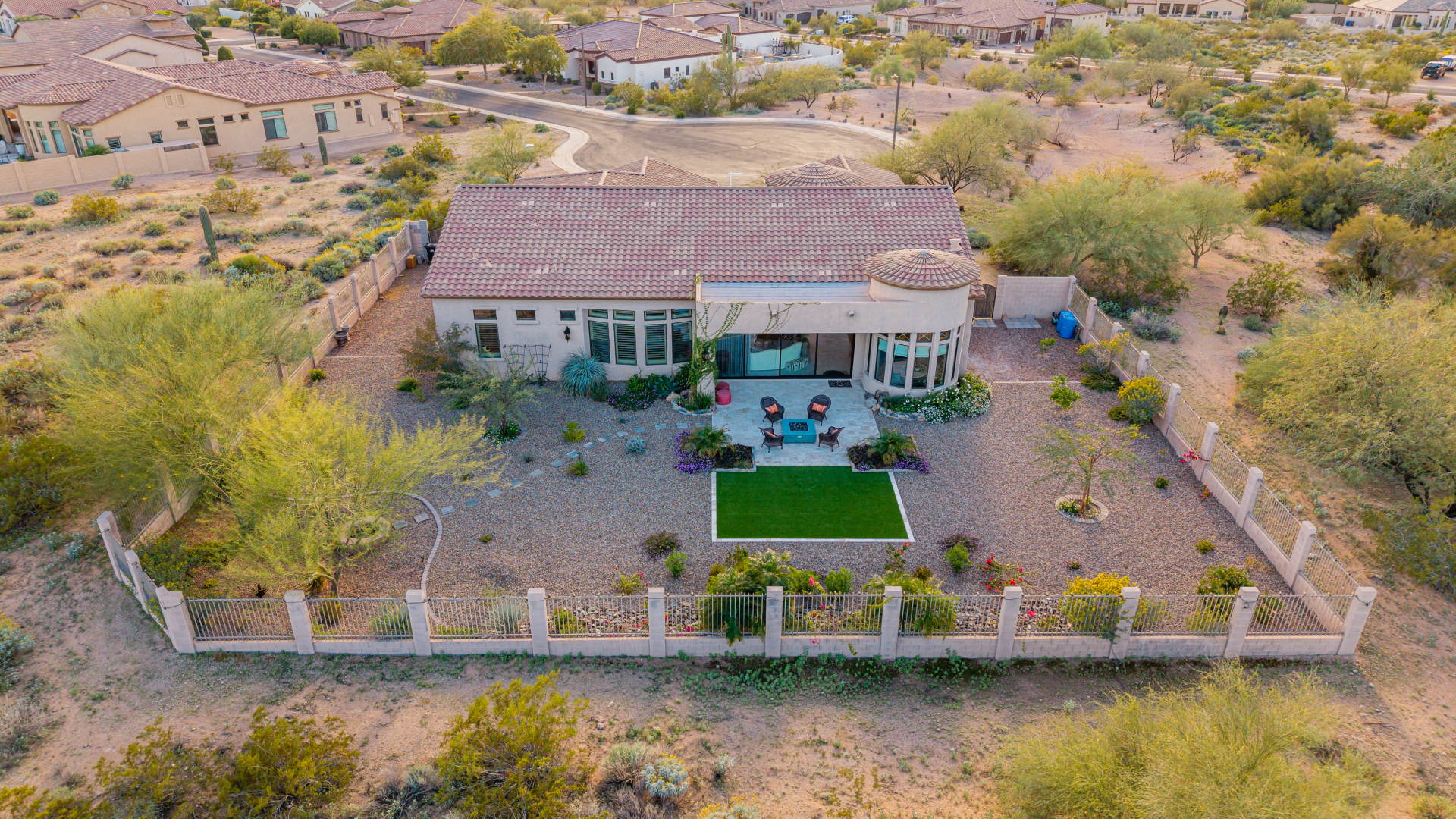 Exquisite semi-custom home on an expansive acre-plus lot, ideally positioned on a quiet cul-de-sac and surrounded by acres of pristine desert washes with breathtaking mountain views. Exceptional curb appeal sets the tone with modern custom garage doors, beautiful landscaping, and a private courtyard entry. This single-level residence offers 4 bedrooms and 3.5 baths, thoughtfully designed for privacy and functionality. Enter through the rotunda foyer, which provides access to the main home or the attached private casita—a full ensuite ideal for guests, multi-generational living, or a comfortable in-law suite. The main home showcases impressive upgrades throughout, including coffered ceilings, shiplap accent walls, plantation shutters, & designer lighting. Elegant formal living & dining areas create inviting spaces for entertaining.