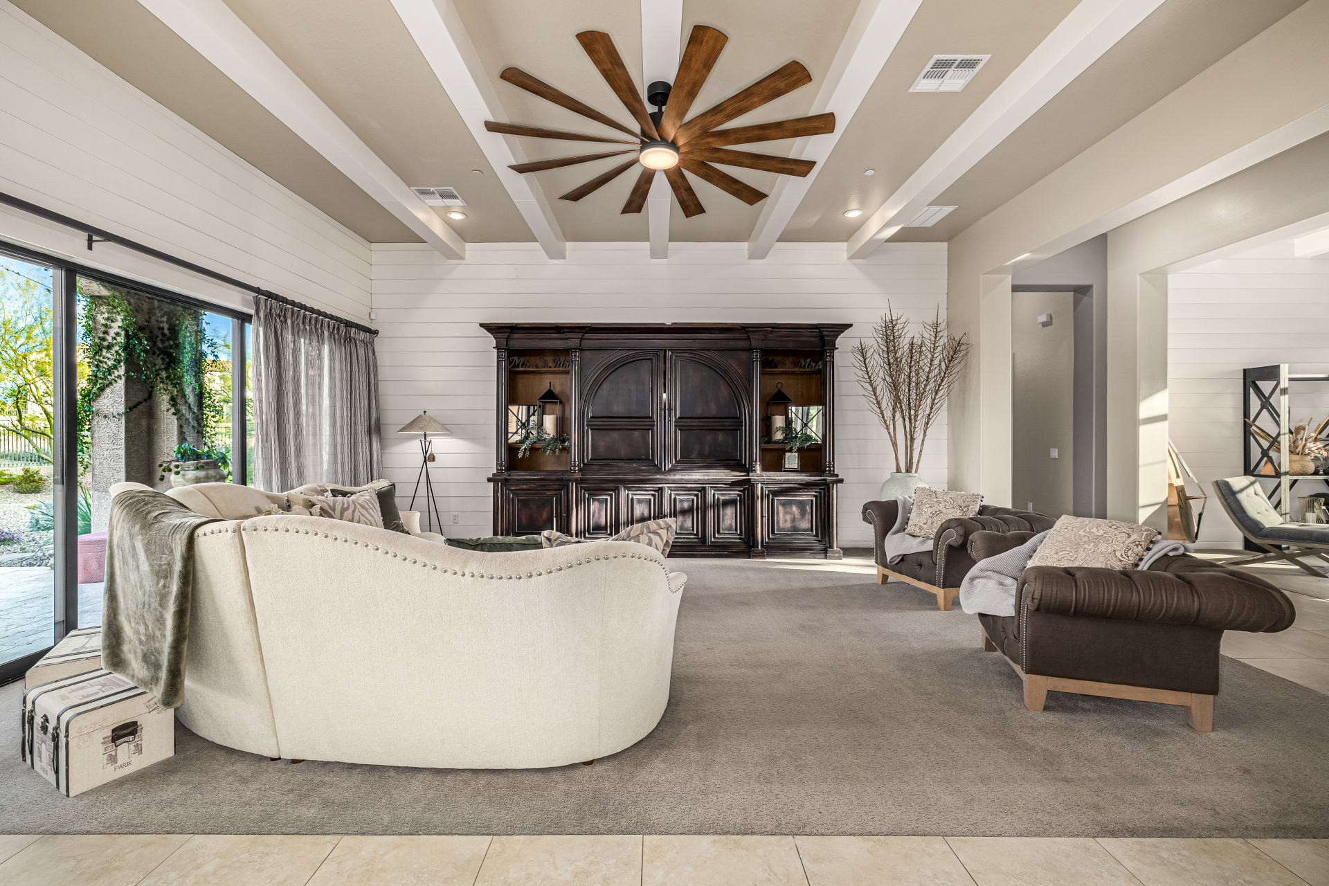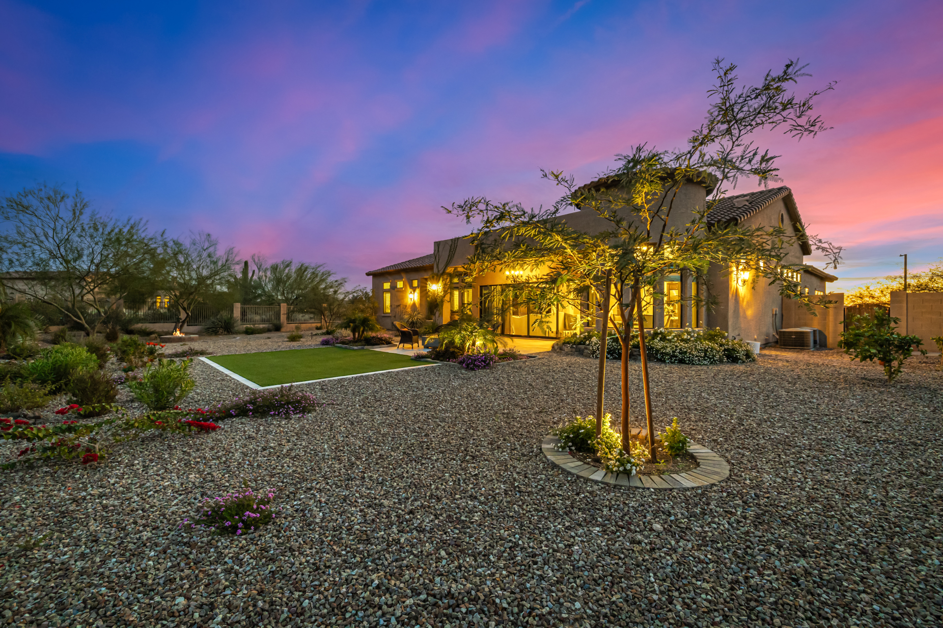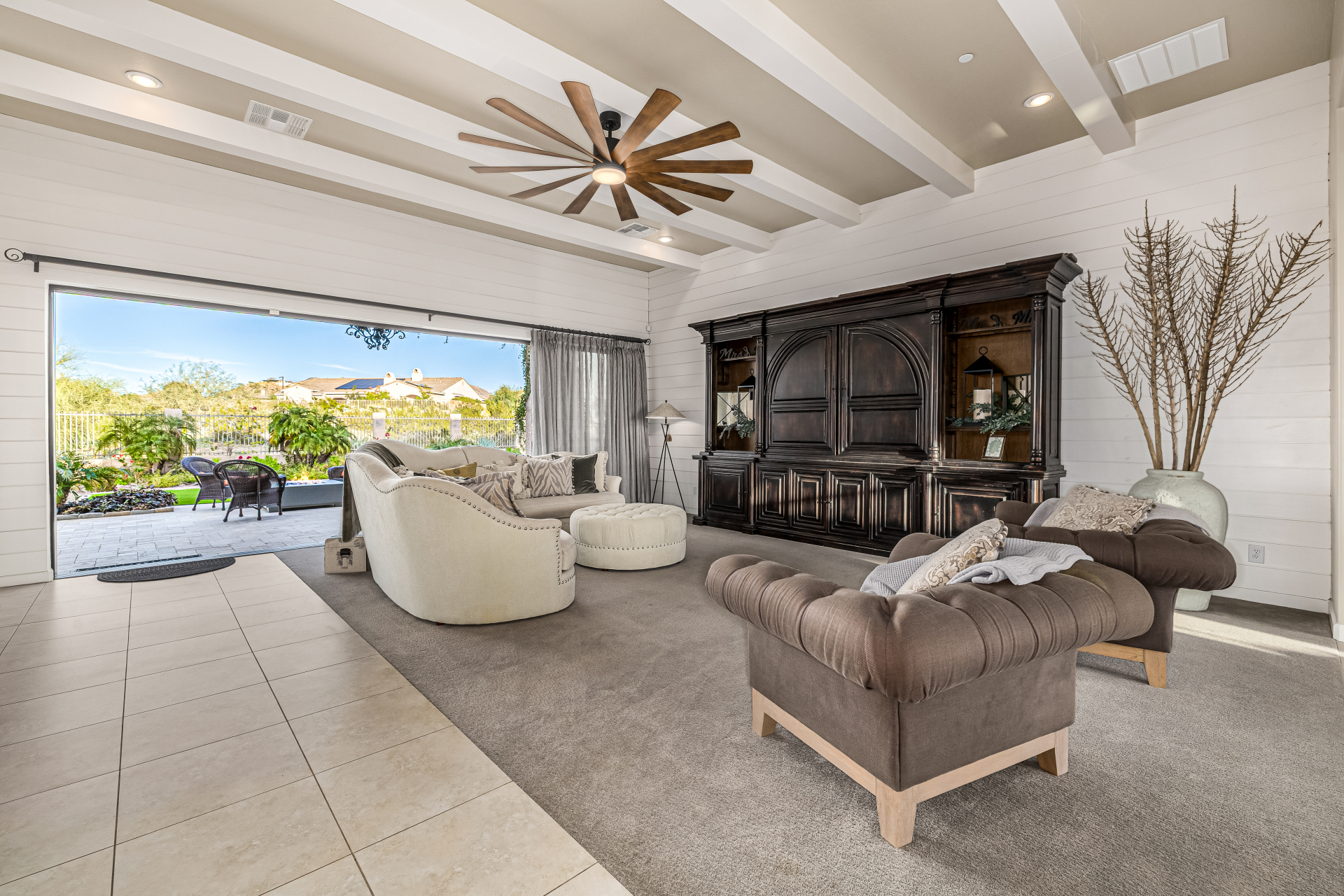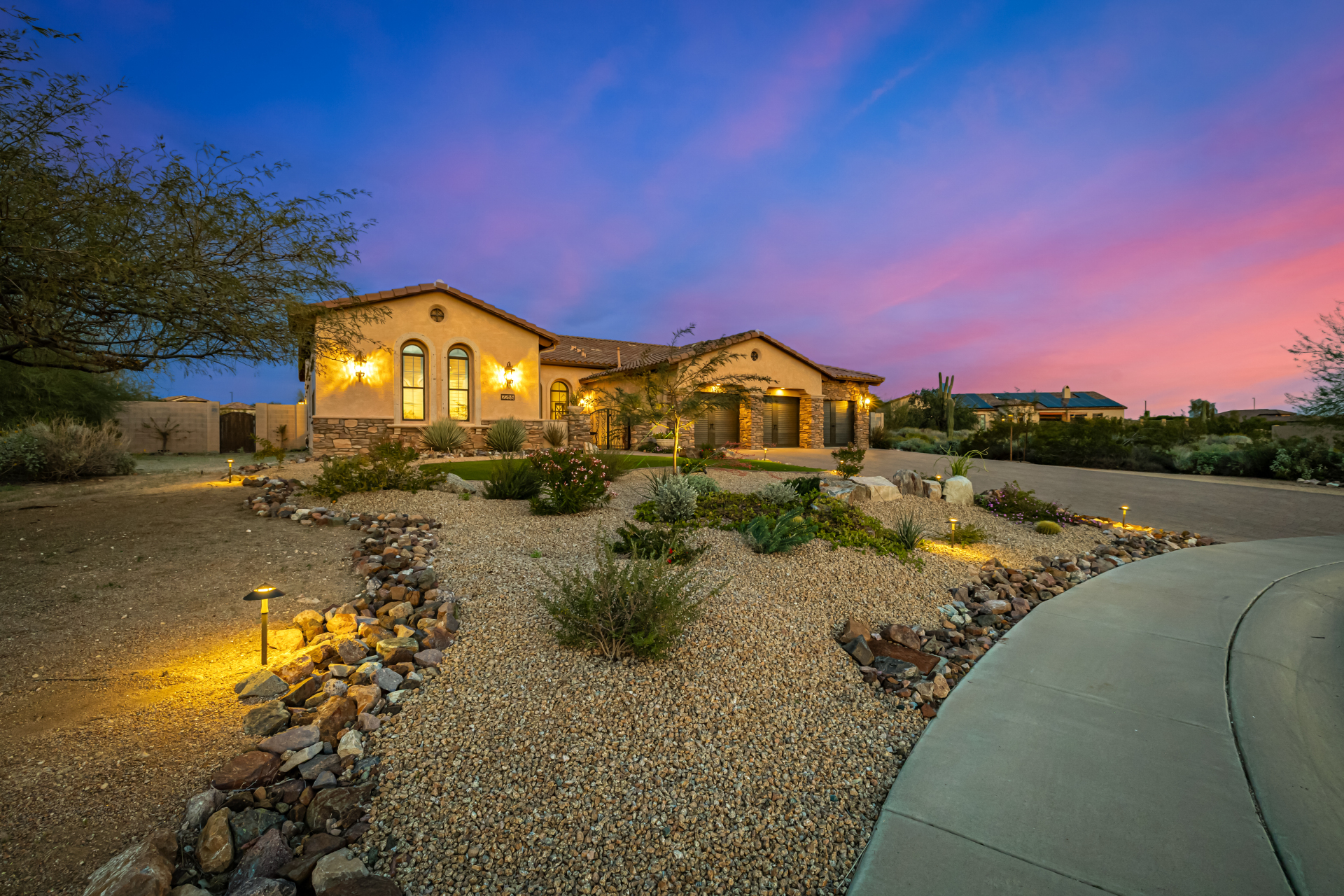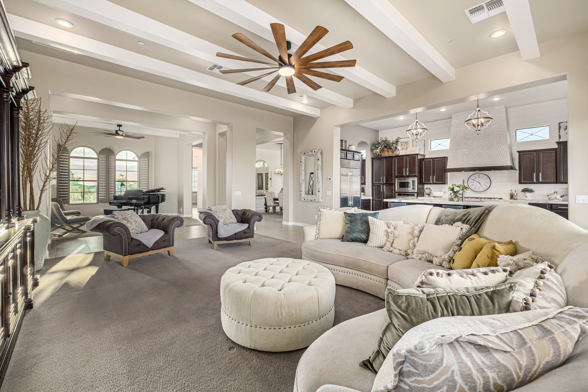 Exquisite semi-custom home on an expansive acre-plus lot, ideally positioned on a quiet cul-de-sac and surrounded by acres of pristine desert washes with breathtaking mountain views. Exceptional curb appeal sets the tone with modern custom garage doors, beautiful landscaping, and a private courtyard entry. This single-level residence offers 4 bedrooms and 3.5 baths, thoughtfully designed for privacy and functionality. Enter through the rotunda foyer, which provides access to the main home or the attached private casita—a full ensuite ideal for guests, multi-generational living, or a comfortable in-law suite. The main home showcases impressive upgrades throughout, including coffered ceilings, shiplap accent walls, plantation shutters, & designer lighting. Elegant formal living & dining areas create inviting spaces for entertaining.