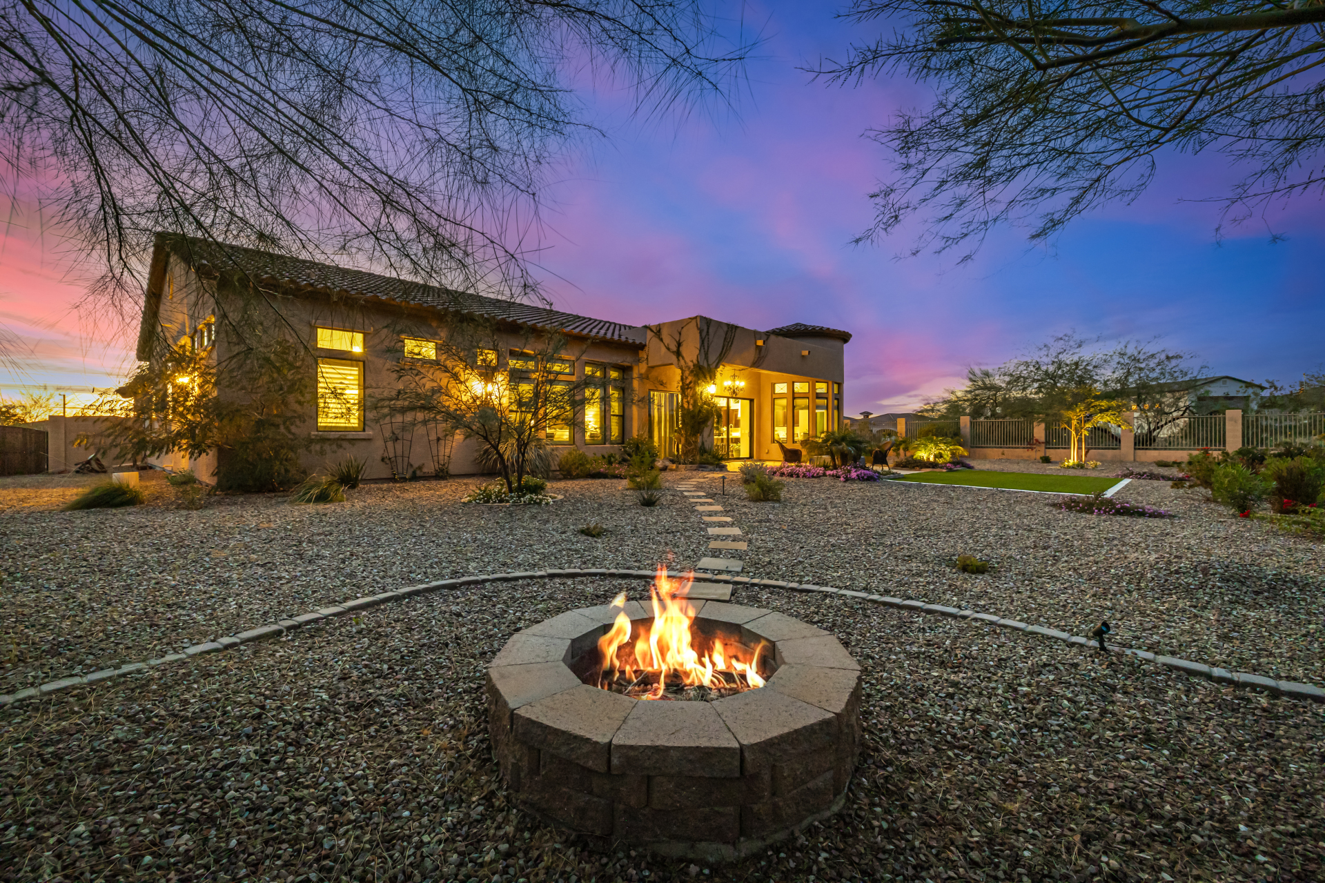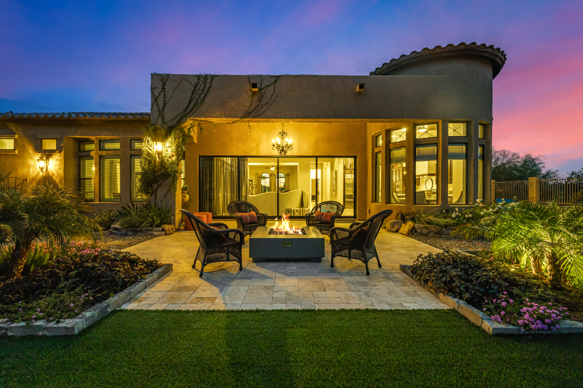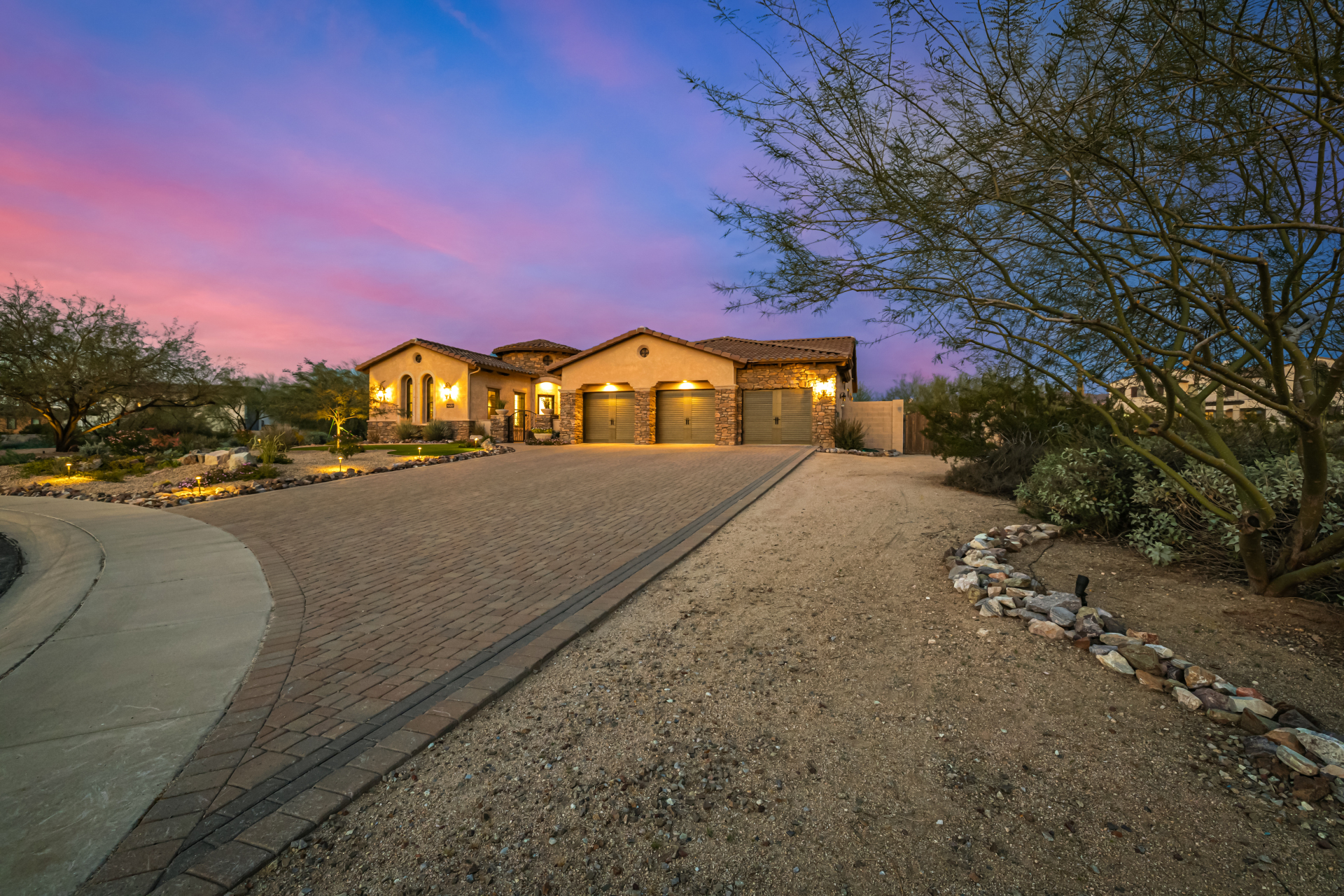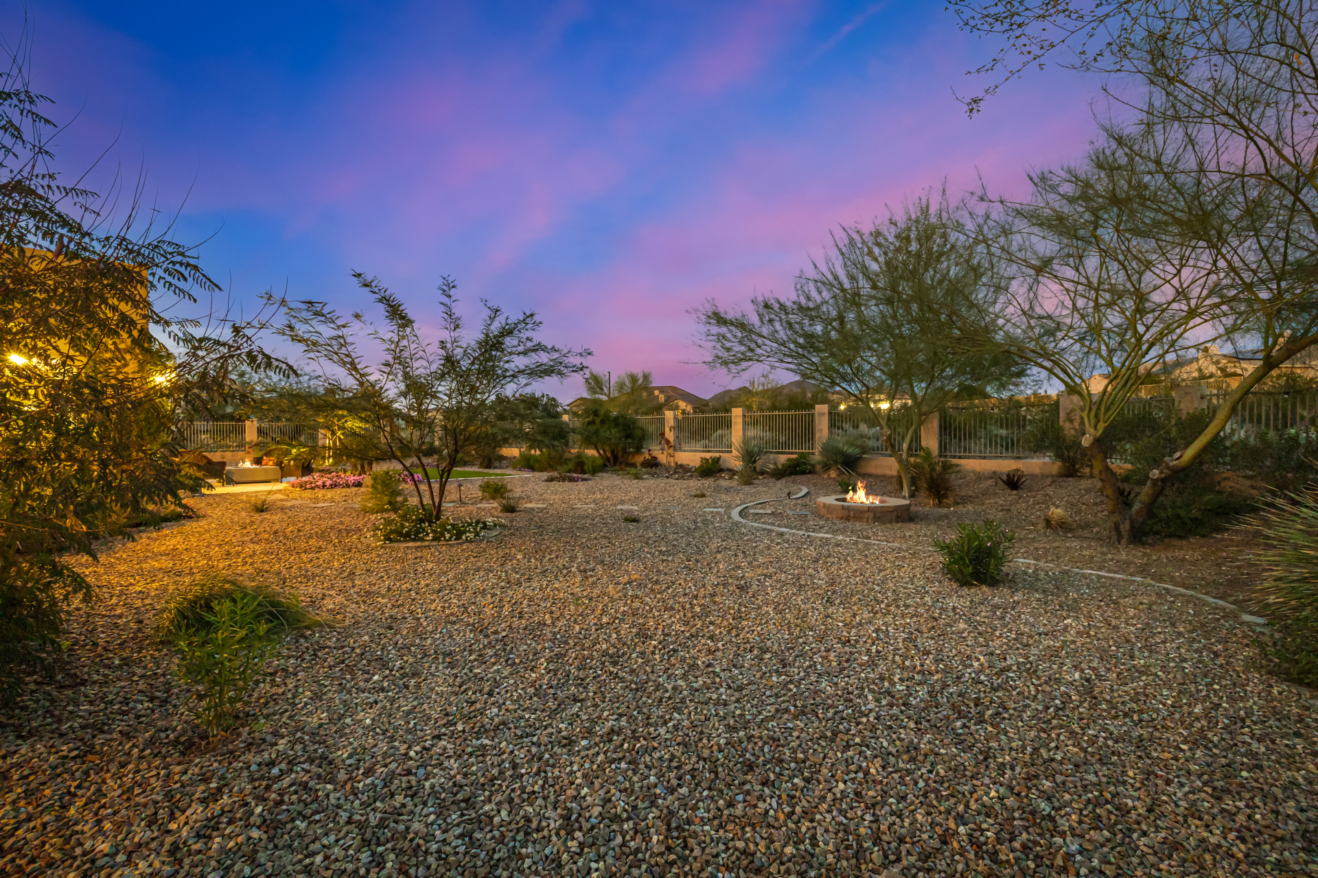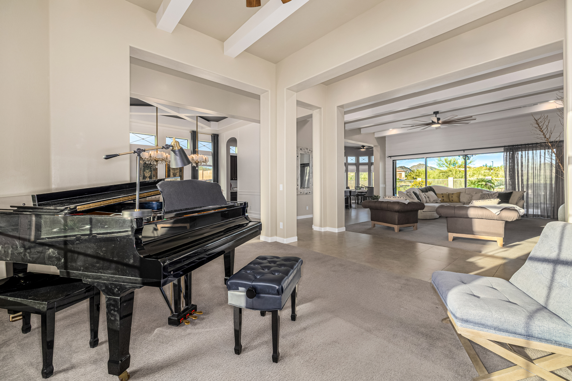 Exquisite semi-custom home on an expansive acre-plus lot, ideally positioned on a quiet cul-de-sac and surrounded by acres of pristine desert washes with breathtaking mountain views. Exceptional curb appeal sets the tone with modern custom garage doors, beautiful landscaping, and a private courtyard entry. This single-level residence offers 4 bedrooms and 3.5 baths, thoughtfully designed for privacy and functionality. Enter through the rotunda foyer, which provides access to the main home or the attached private casita—a full ensuite ideal for guests, multi-generational living, or a comfortable in-law suite. The main home showcases impressive upgrades throughout, including coffered ceilings, shiplap accent walls, plantation shutters, & designer lighting. Elegant formal living & dining areas create inviting spaces for entertaining.