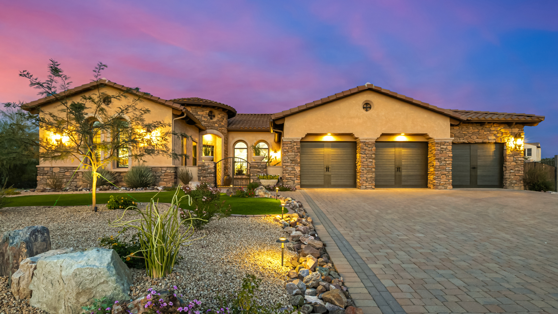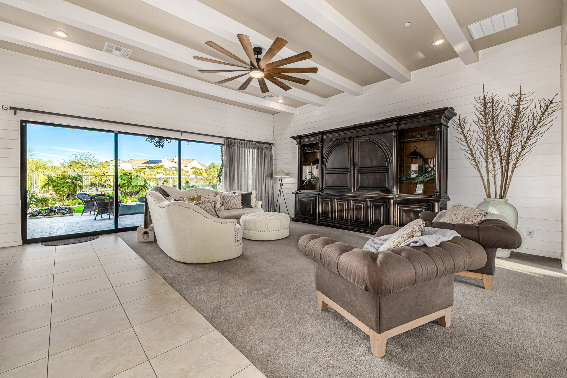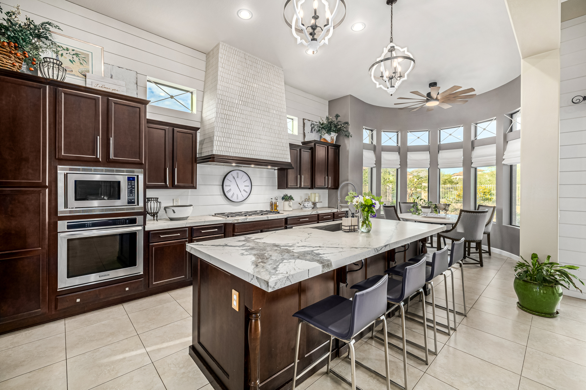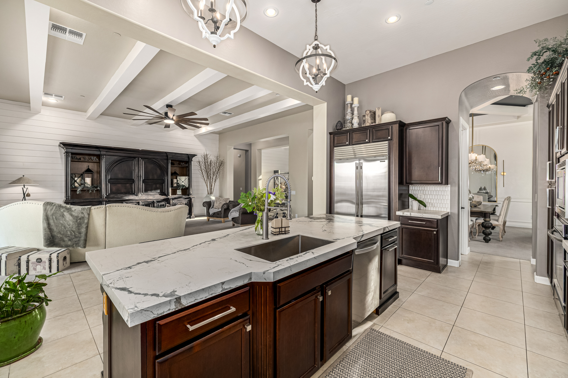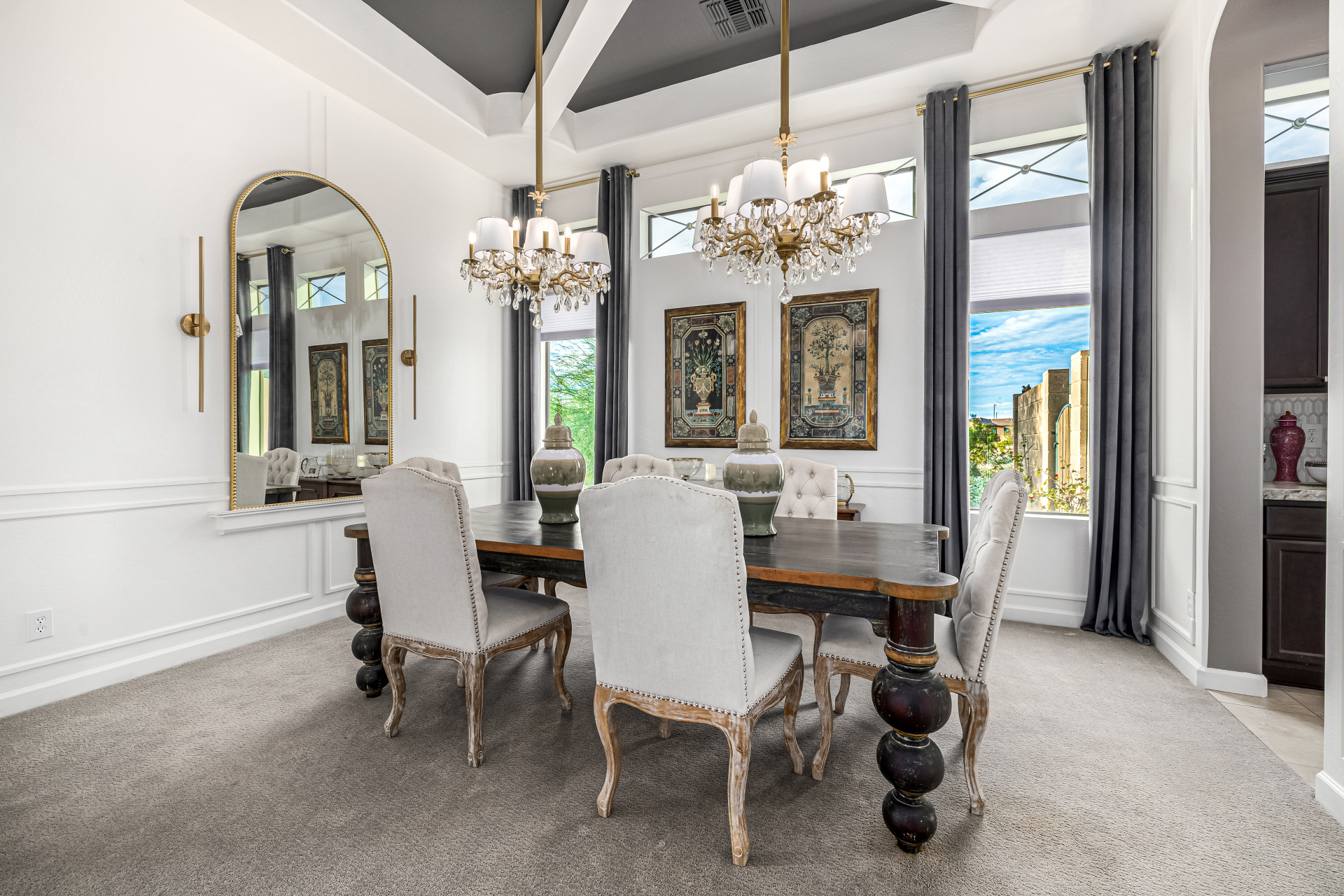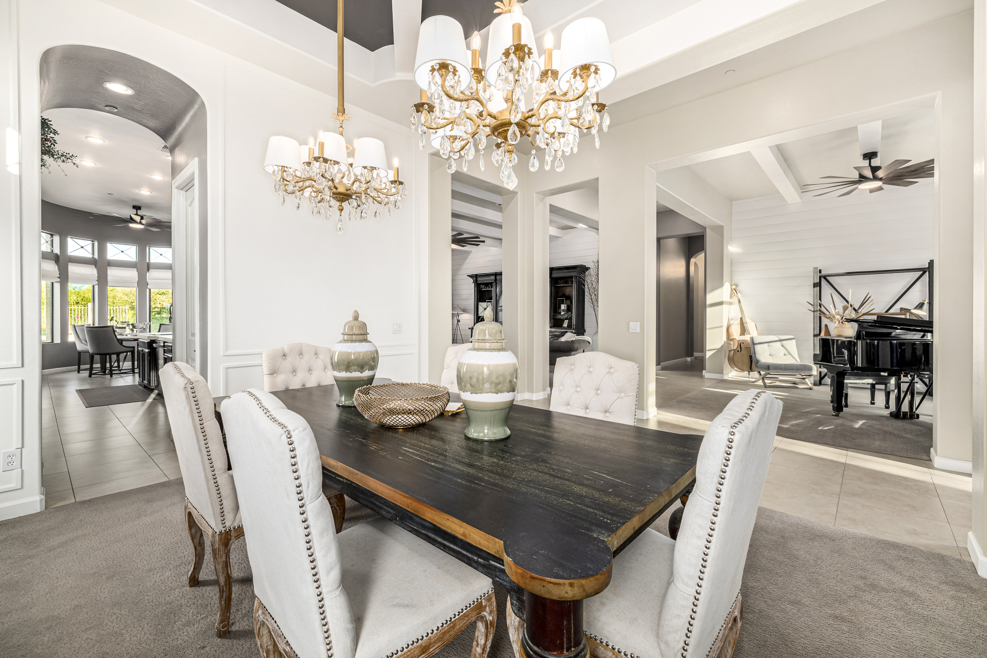 Exquisite semi-custom home on an expansive acre-plus lot, ideally positioned on a quiet cul-de-sac and surrounded by acres of pristine desert washes with breathtaking mountain views. Exceptional curb appeal sets the tone with modern custom garage doors, beautiful landscaping, and a private courtyard entry. This single-level residence offers 4 bedrooms and 3.5 baths, thoughtfully designed for privacy and functionality. Enter through the rotunda foyer, which provides access to the main home or the attached private casita—a full ensuite ideal for guests, multi-generational living, or a comfortable in-law suite. The main home showcases impressive upgrades throughout, including coffered ceilings, shiplap accent walls, plantation shutters, & designer lighting. Elegant formal living & dining areas create inviting spaces for entertaining.