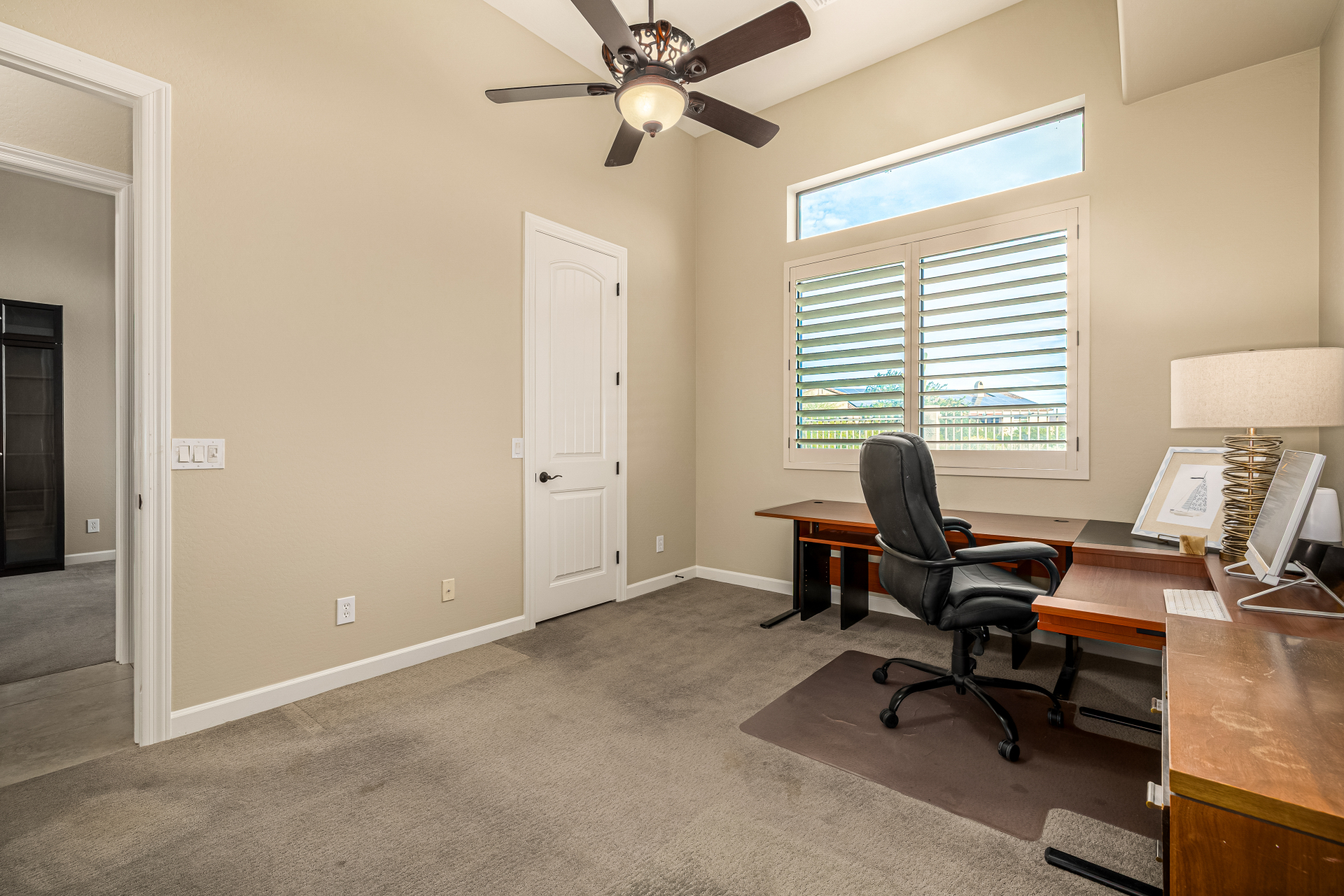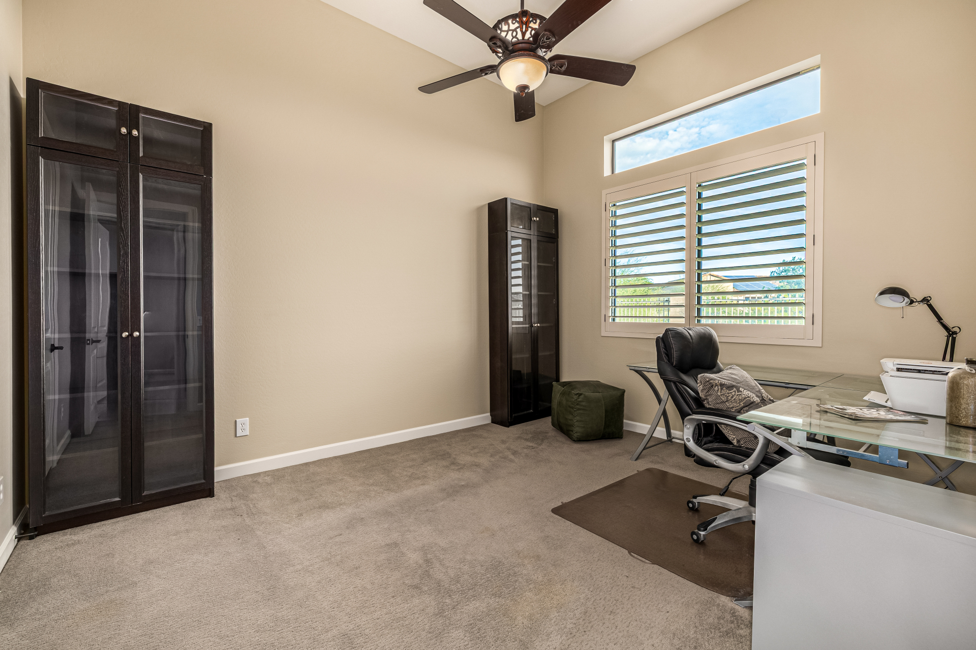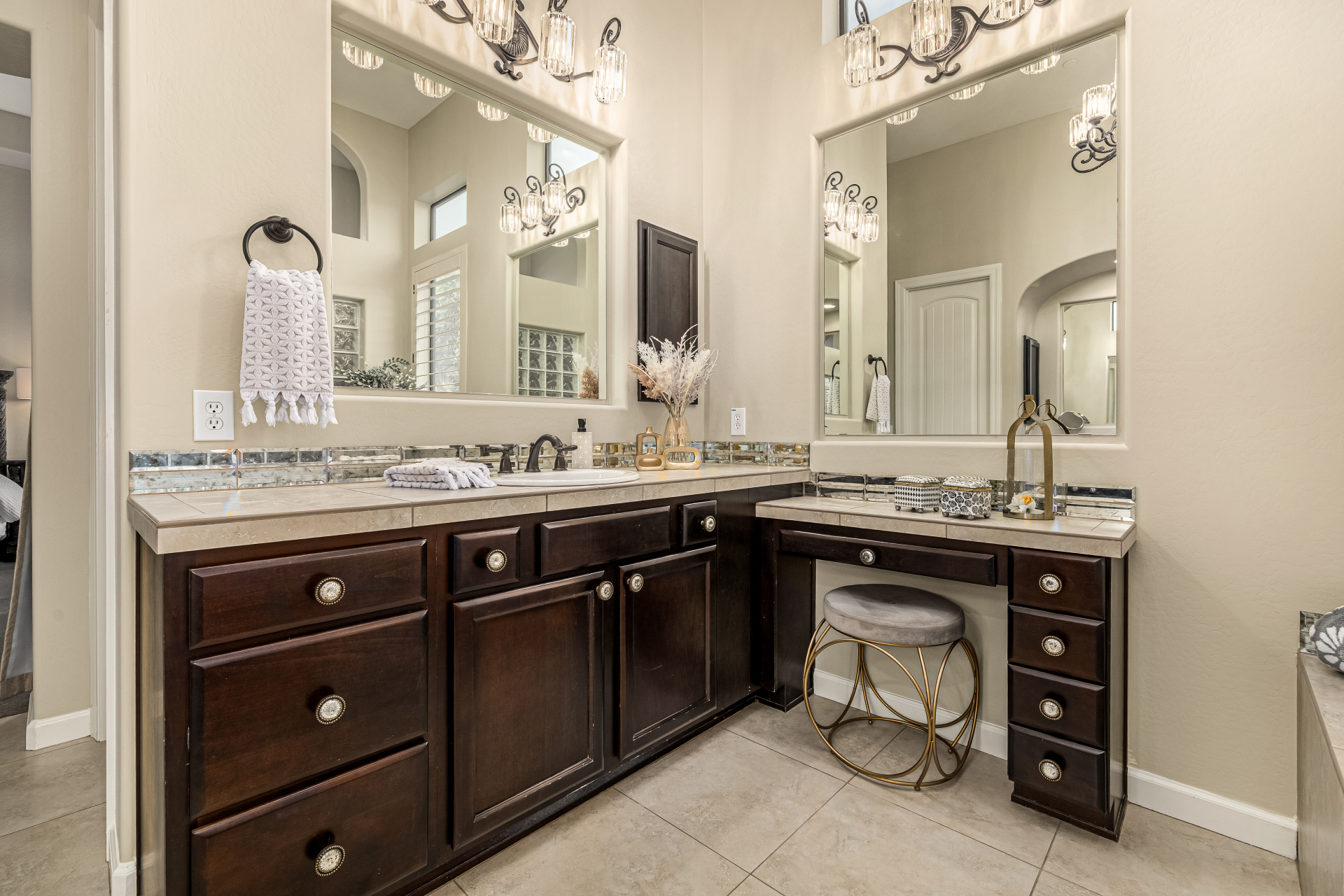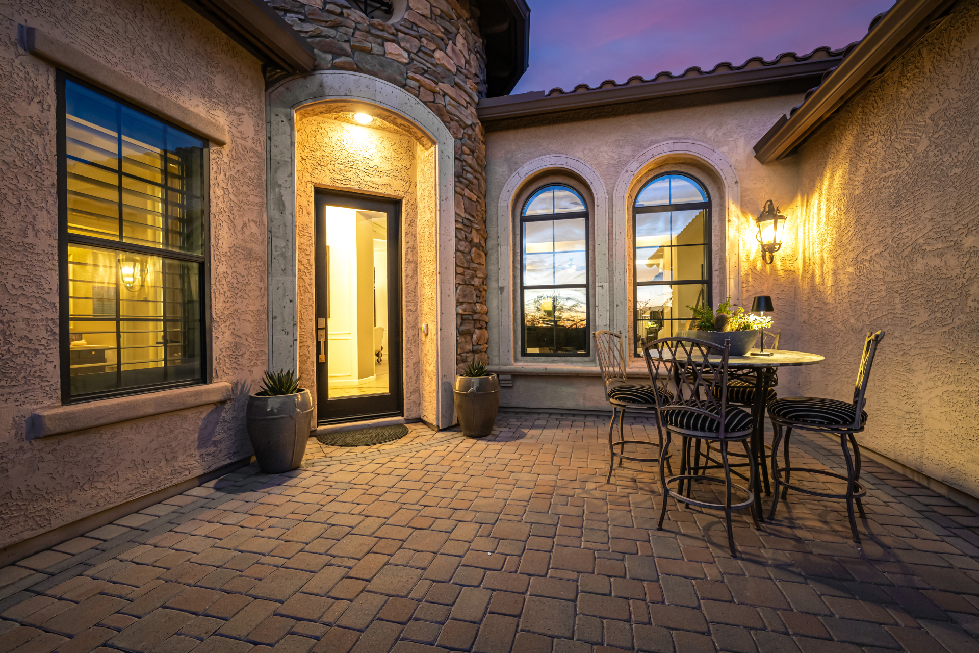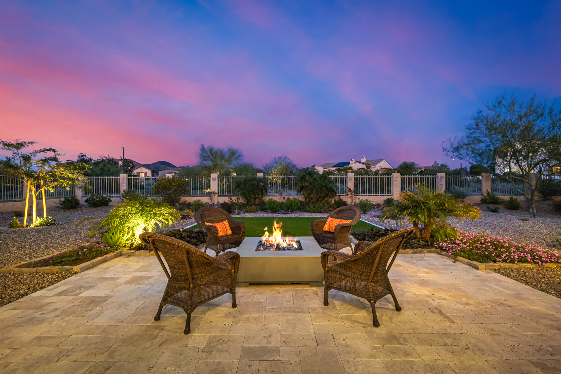Exquisite semi-custom home on an expansive acre-plus lot, ideally positioned on a quiet cul-de-sac and surrounded by acres of pristine desert washes with breathtaking mountain views. Exceptional curb appeal sets the tone with modern custom garage doors, beautiful landscaping, and a private courtyard entry. This single-level residence offers 4 bedrooms and 3.5 baths, thoughtfully designed for privacy and functionality. Enter through the rotunda foyer, which provides access to the main home or the attached private casita—a full ensuite ideal for guests, multi-generational living, or a comfortable in-law suite. The main home showcases impressive upgrades throughout, including coffered ceilings, shiplap accent walls, plantation shutters, & designer lighting. Elegant formal living & dining areas create inviting spaces for entertaining.