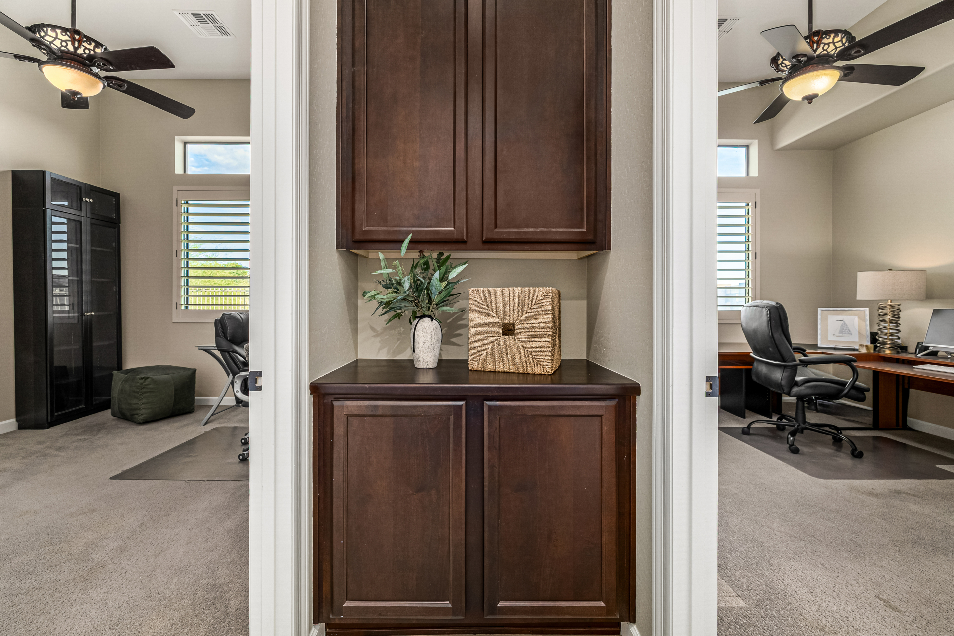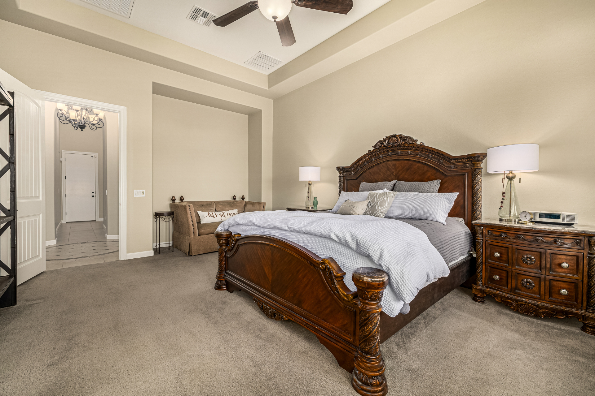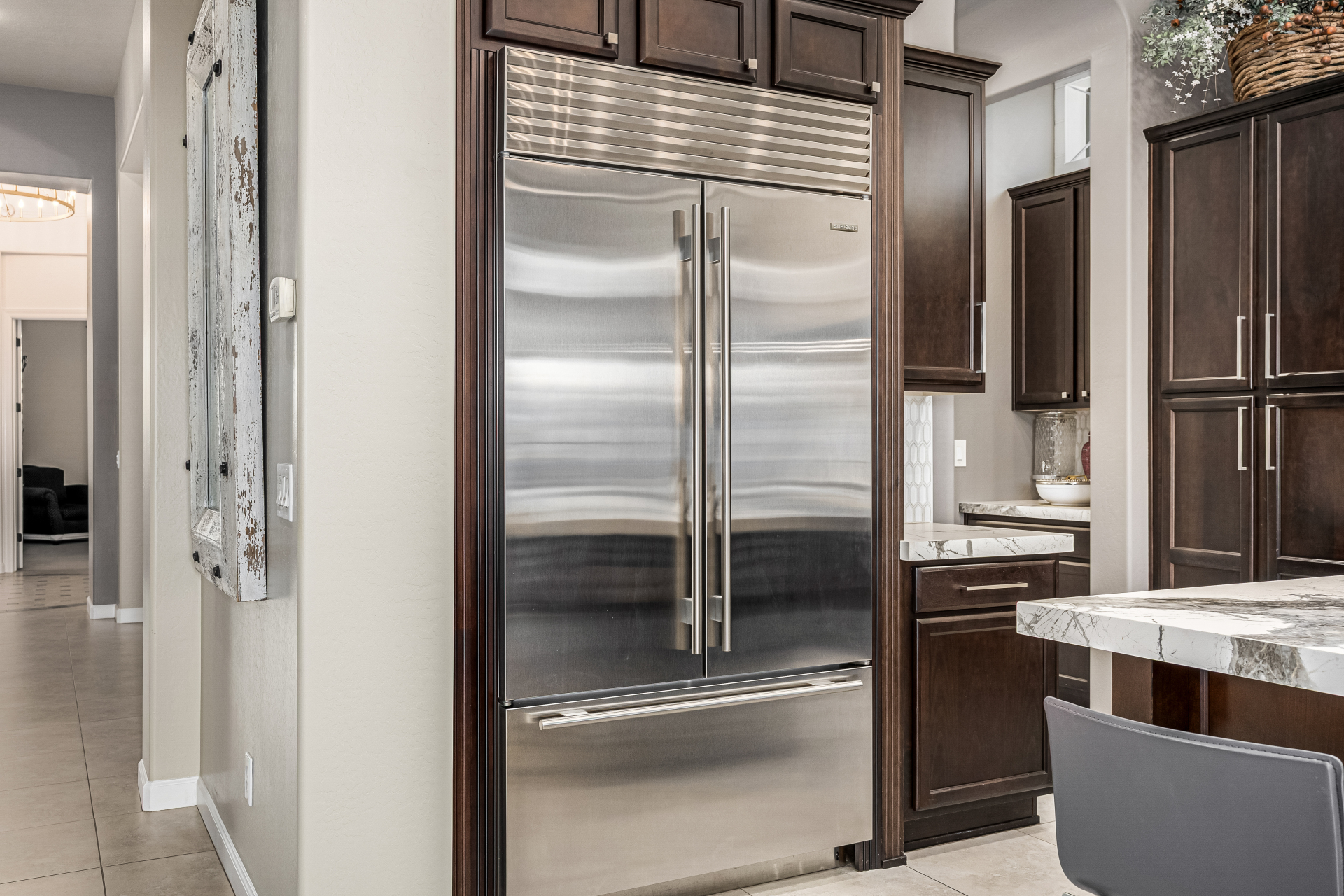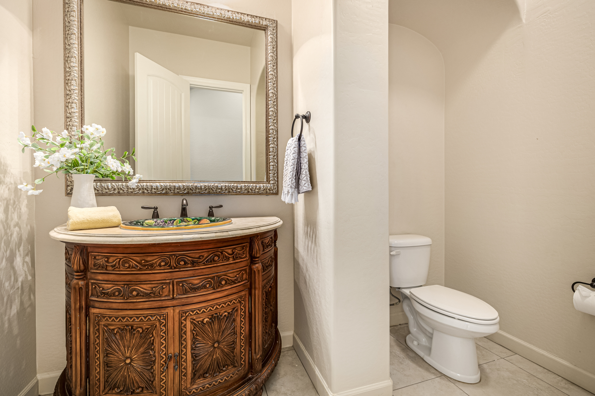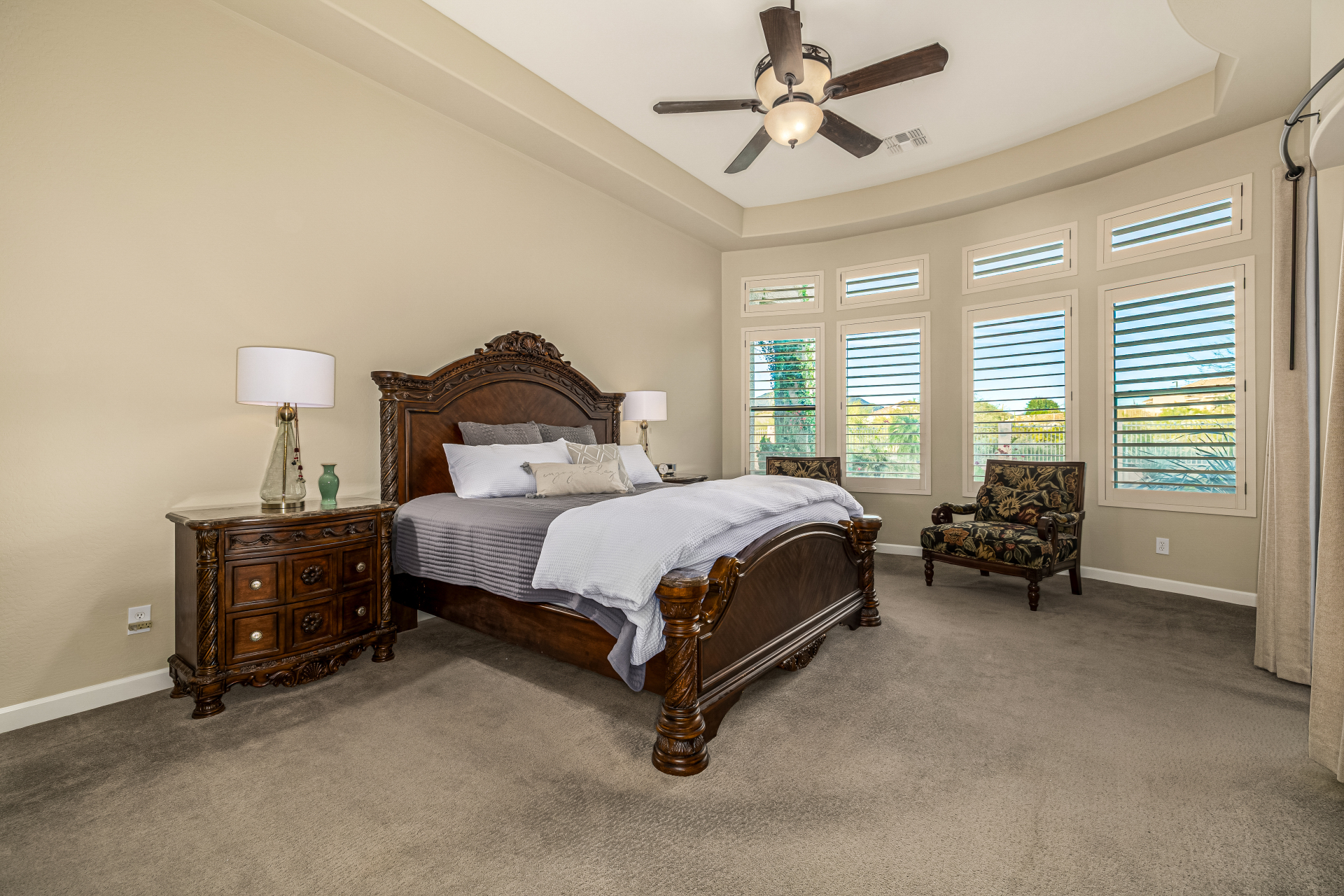 Exquisite semi-custom home on an expansive acre-plus lot, ideally positioned on a quiet cul-de-sac and surrounded by acres of pristine desert washes with breathtaking mountain views. Exceptional curb appeal sets the tone with modern custom garage doors, beautiful landscaping, and a private courtyard entry. This single-level residence offers 4 bedrooms and 3.5 baths, thoughtfully designed for privacy and functionality. Enter through the rotunda foyer, which provides access to the main home or the attached private casita—a full ensuite ideal for guests, multi-generational living, or a comfortable in-law suite. The main home showcases impressive upgrades throughout, including coffered ceilings, shiplap accent walls, plantation shutters, & designer lighting. Elegant formal living & dining areas create inviting spaces for entertaining.