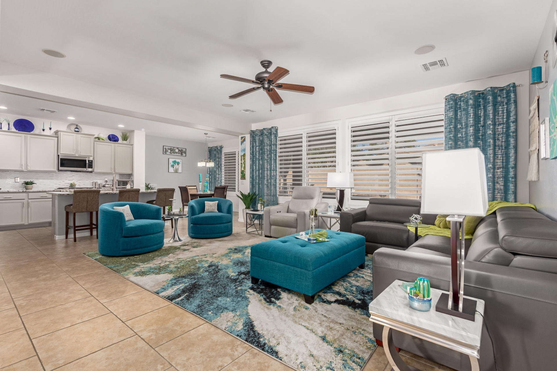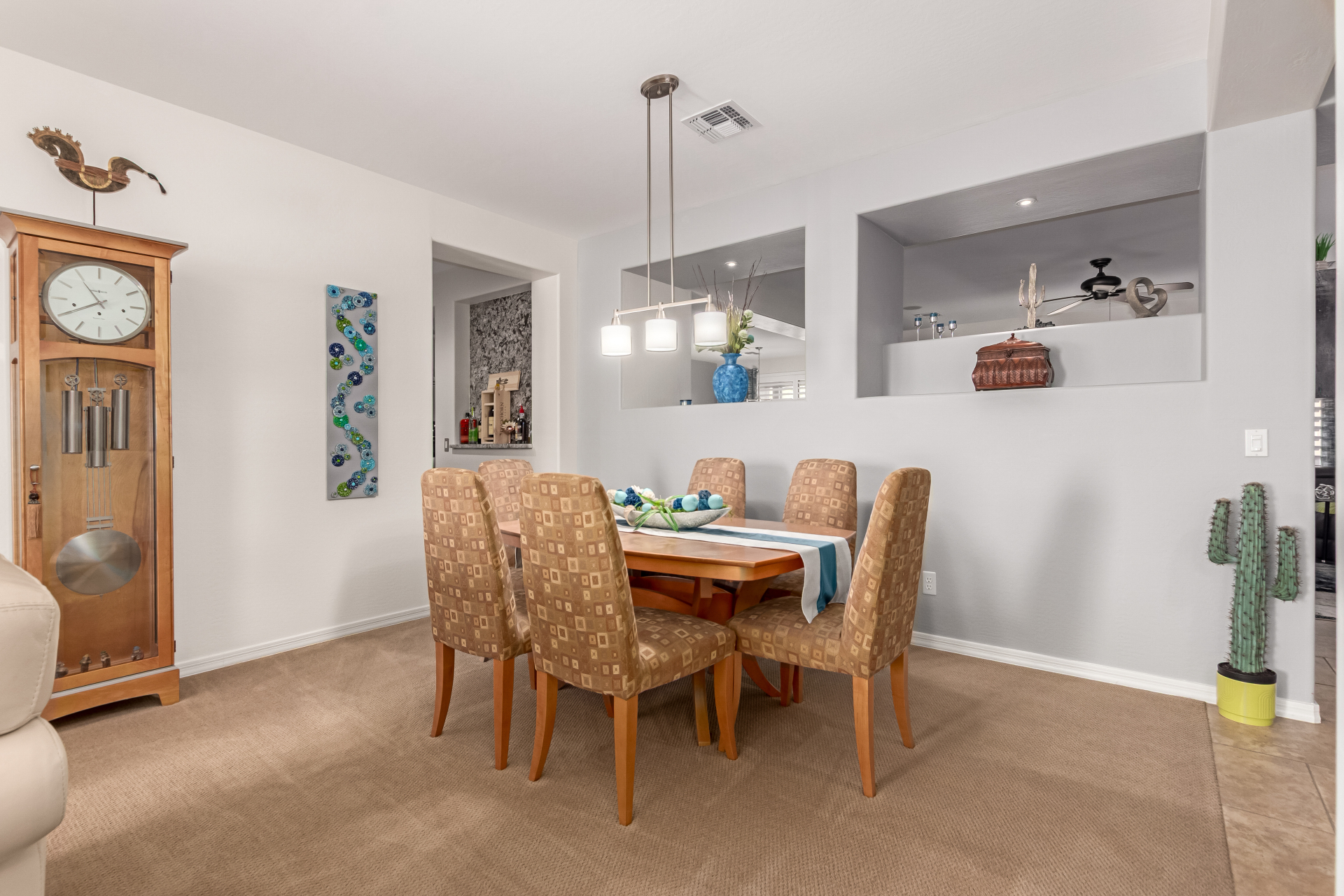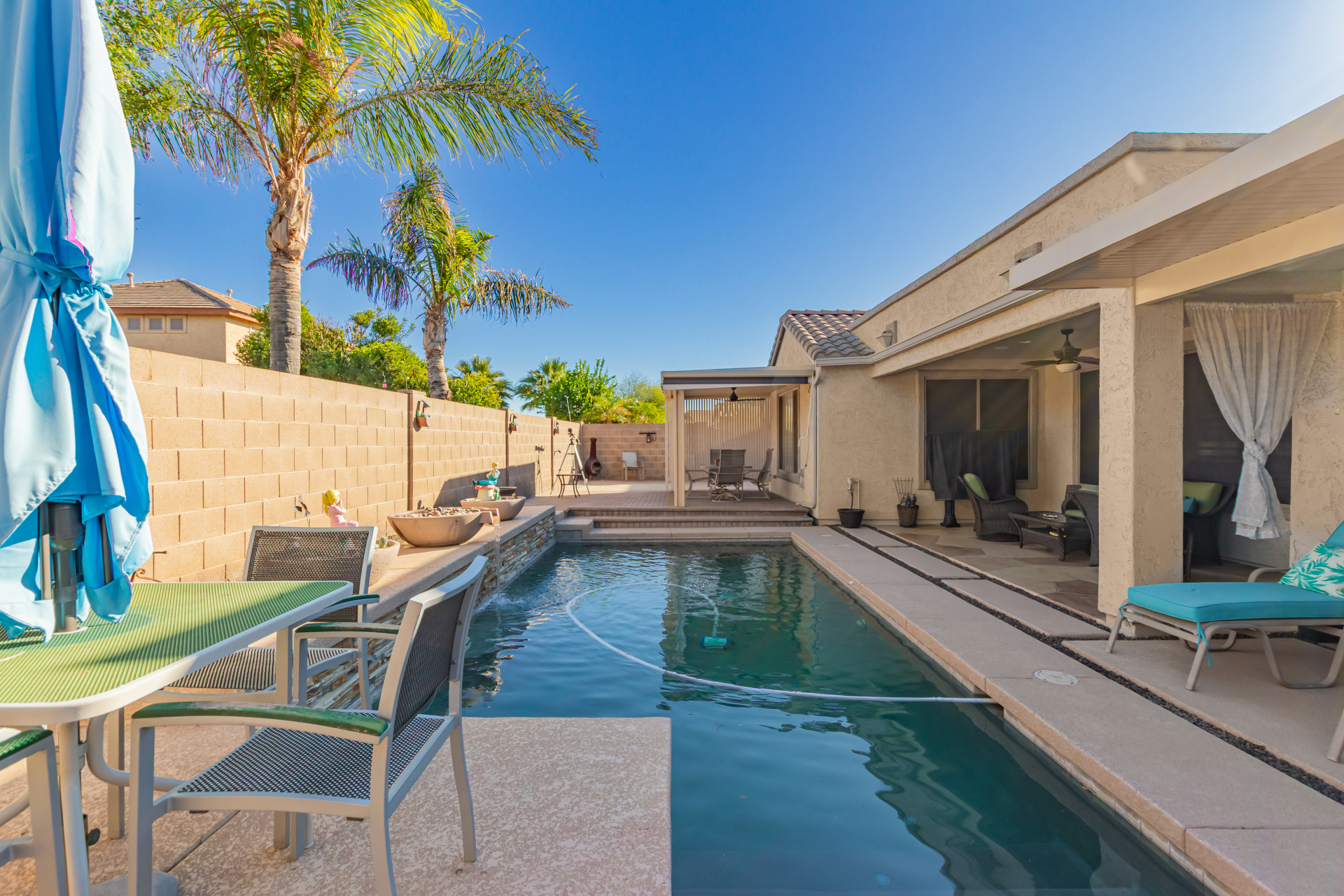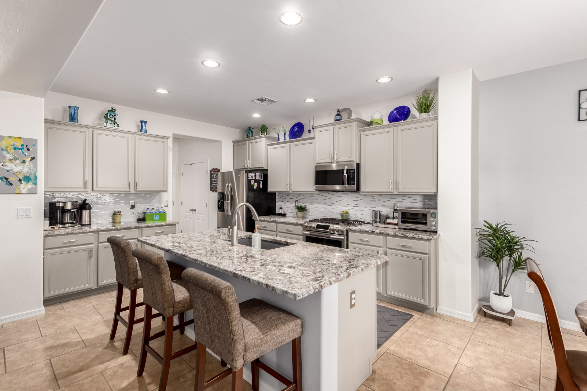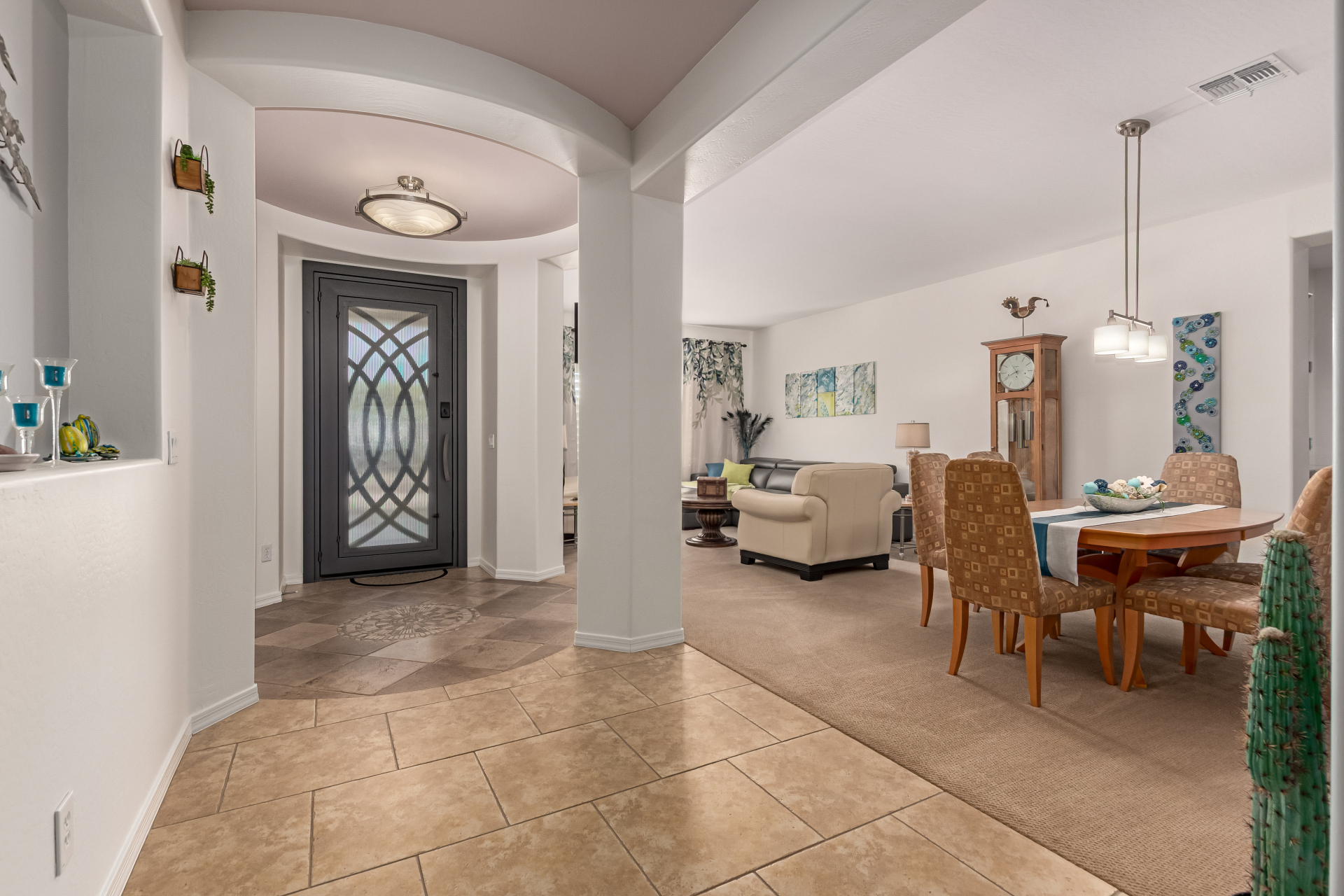 Located in the highly desirable community of Sanalina ~ This immaculate stunning home is has been extremely well kept & updated ~ Starting at the front entry a custom 1-of-a-kind metal & glass door welcomes you to a grand round foyer with a mosaic medallion tile floor & decorative niches ~ Large living/dining area can also be an amazing games room ~ Custom built-in entertainment center separates these rooms from the spacious family room & kitchen ~ Staggered cabinetry, beautiful granite slab counters & glass tile backsplashes, stainless appliances, upgraded gas range, eat-in nook, a fabulous butler's pantry that passes through to the formal dining area are some of the features of this incredible entertainer's dream kitchen ~ Family room overlooks the backyard pool & patios ~