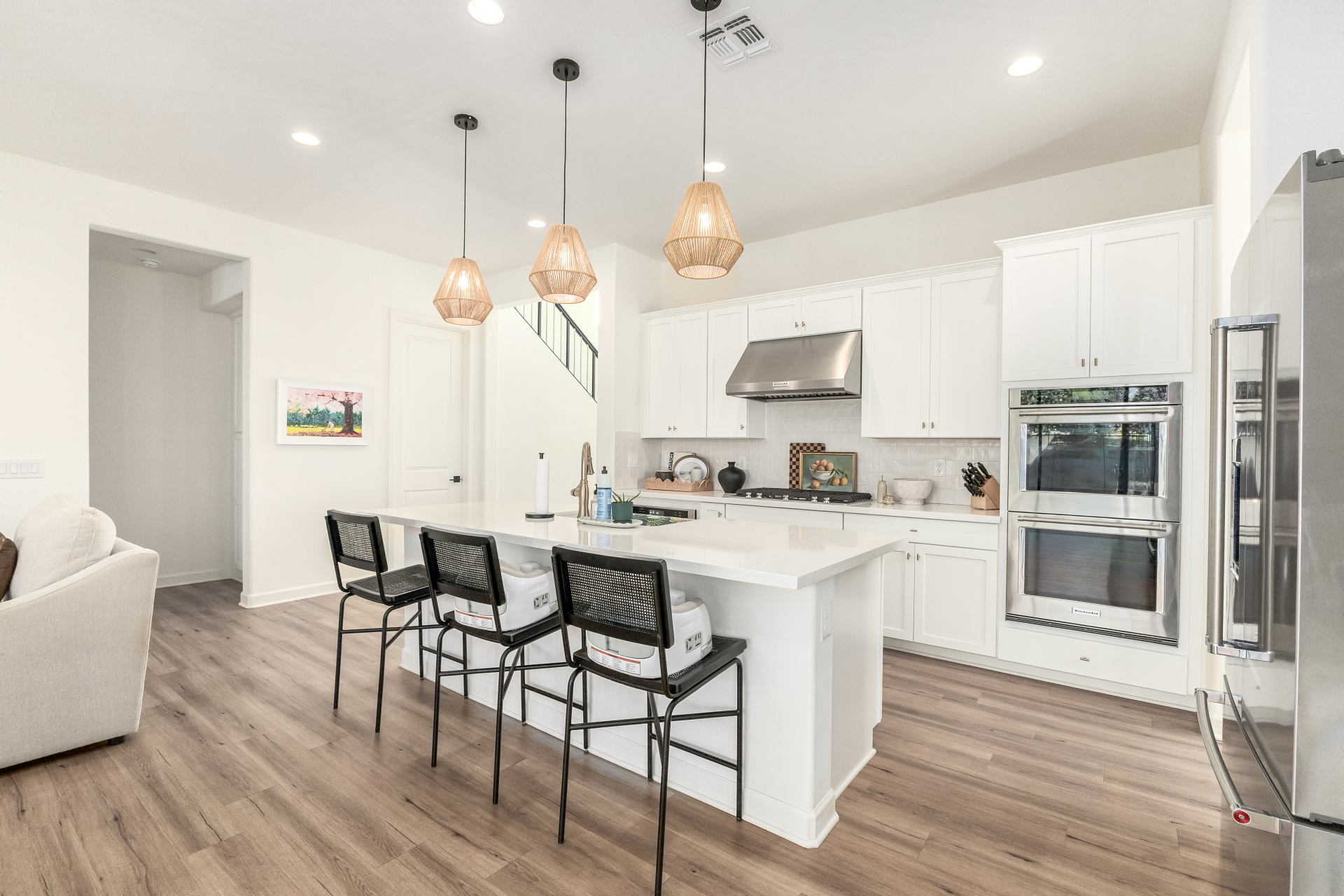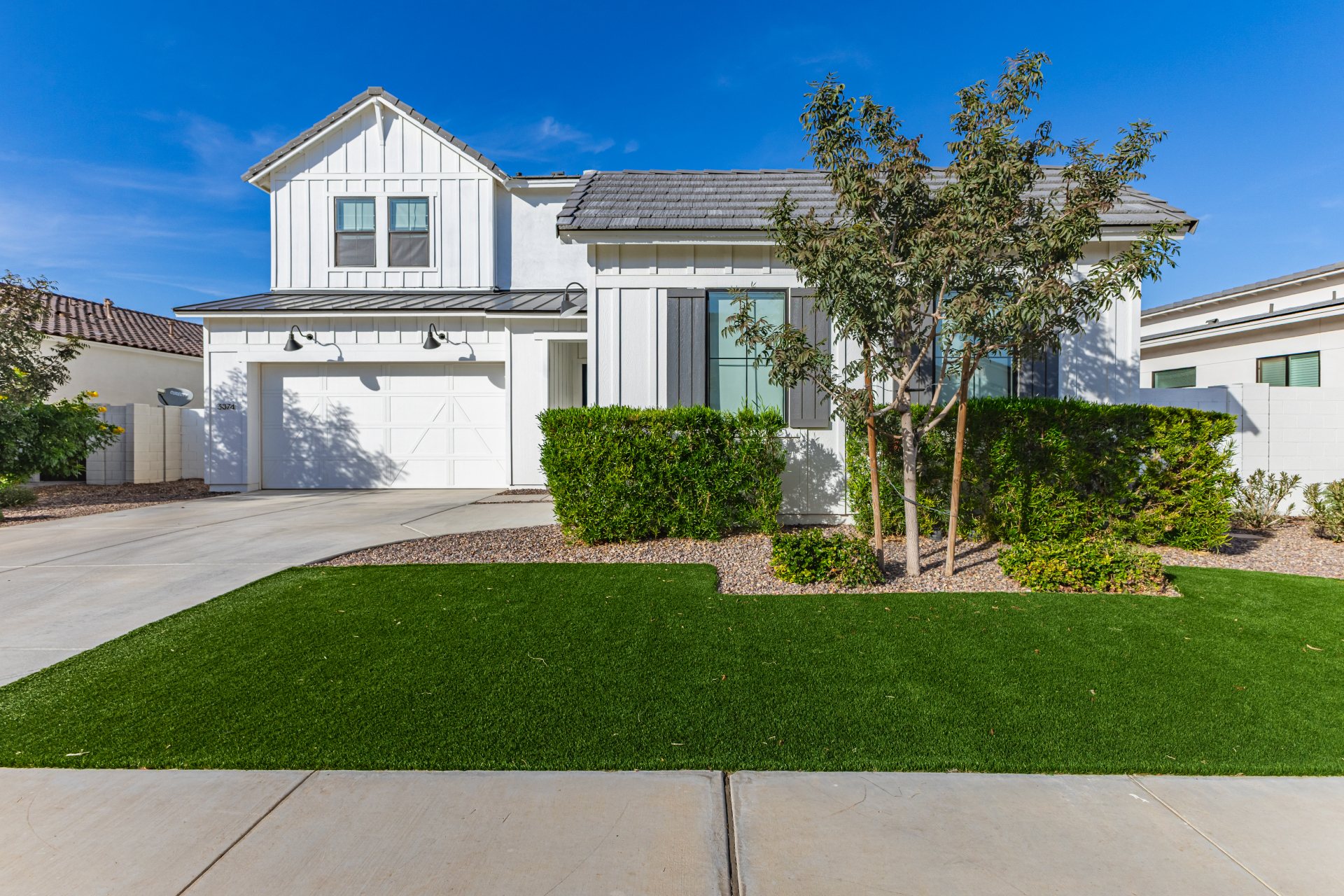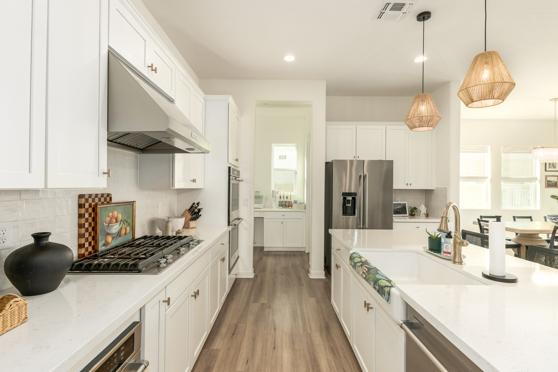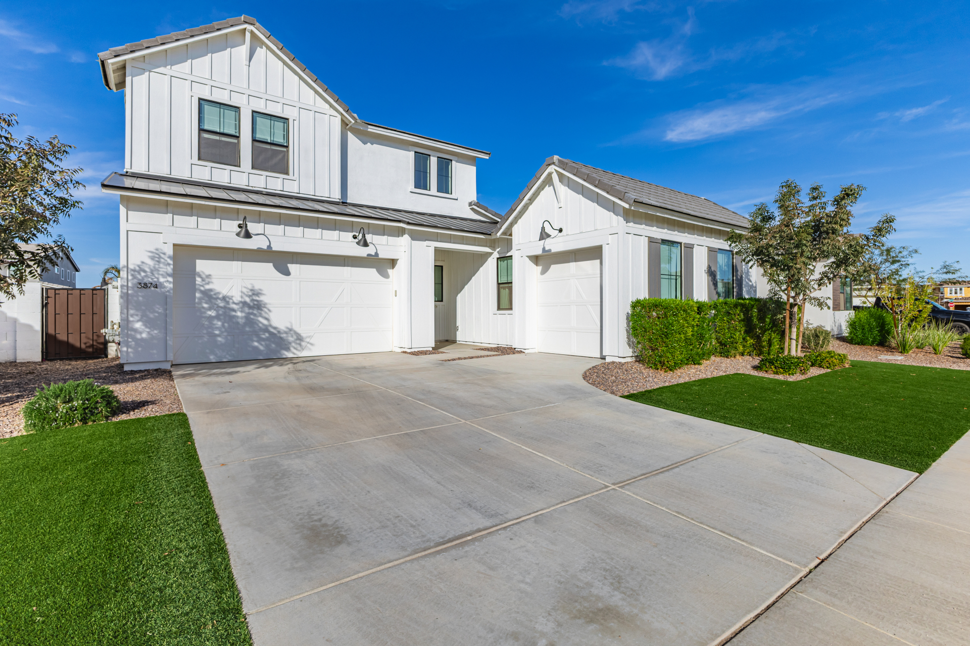 You don't want to miss this stunning 2-story gem with a 3-car garage with EV charger! The 3rd car which is separate is set up as a gym also has AC! Inside, gorgeous wood-look floors flow through a spacious great room designed for both everyday living and entertaining. The sleek kitchen is a showstopper, featuring stainless steel appliances with double wall ovens, quartz countertops, abundant white cabinetry, a center island with breakfast bar, and a walk-in pantry. The downstairs primary retreat offers a private bath with dual sinks and a generous walk-in closet. Also downstairs is a bedroom and full bathroom great for guests. Upstairs the versatile loft is ideal for a media center, while an additional cozy nook works perfectly as a home office or creative studio with built in desk.