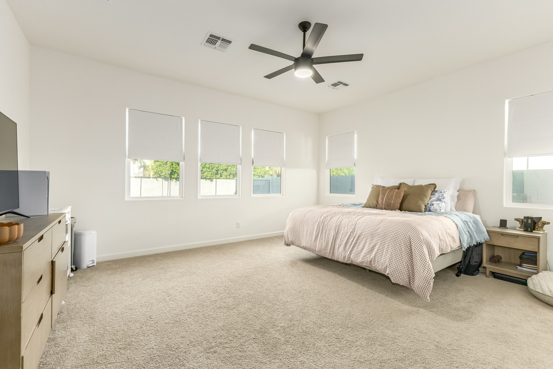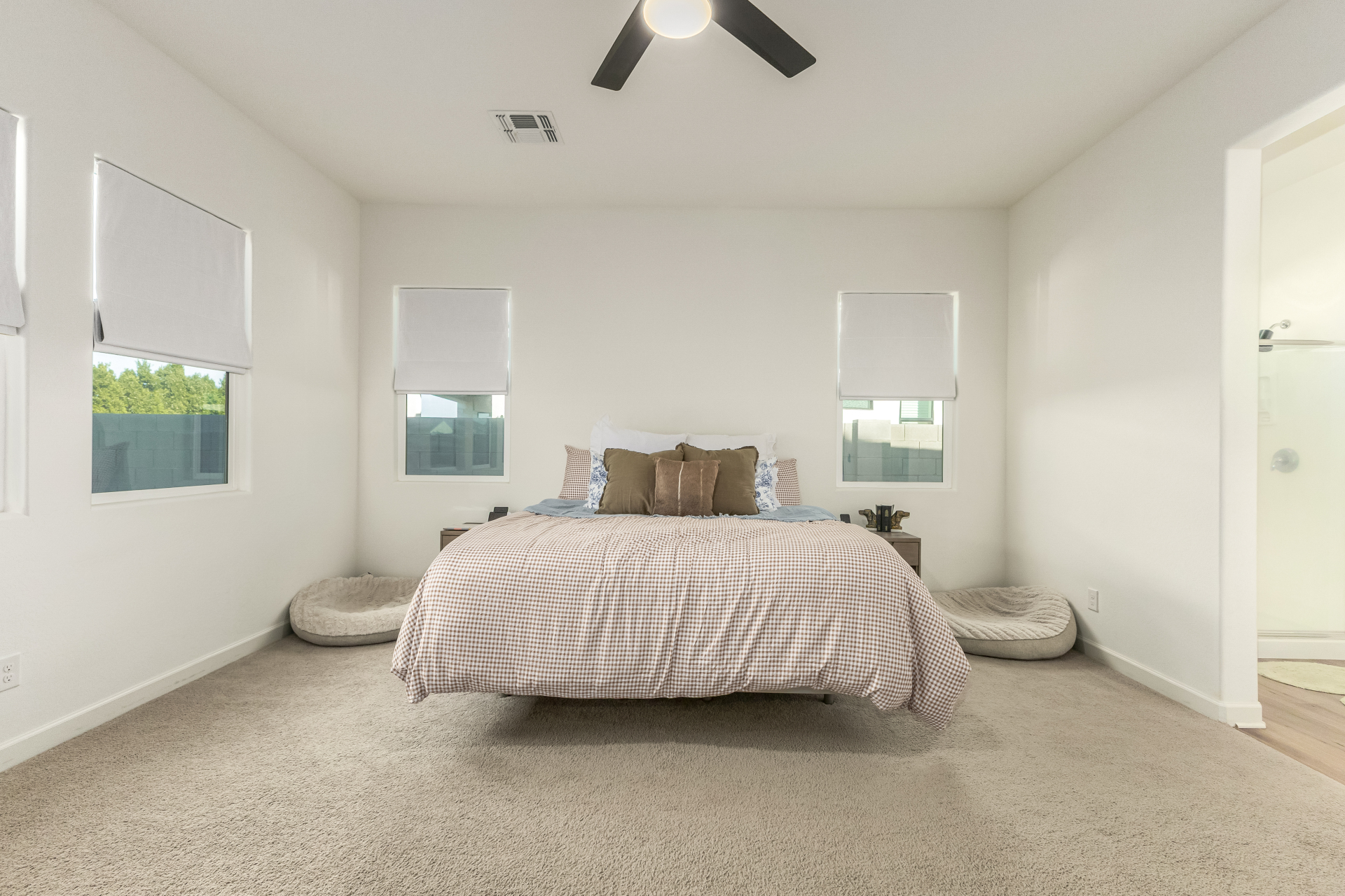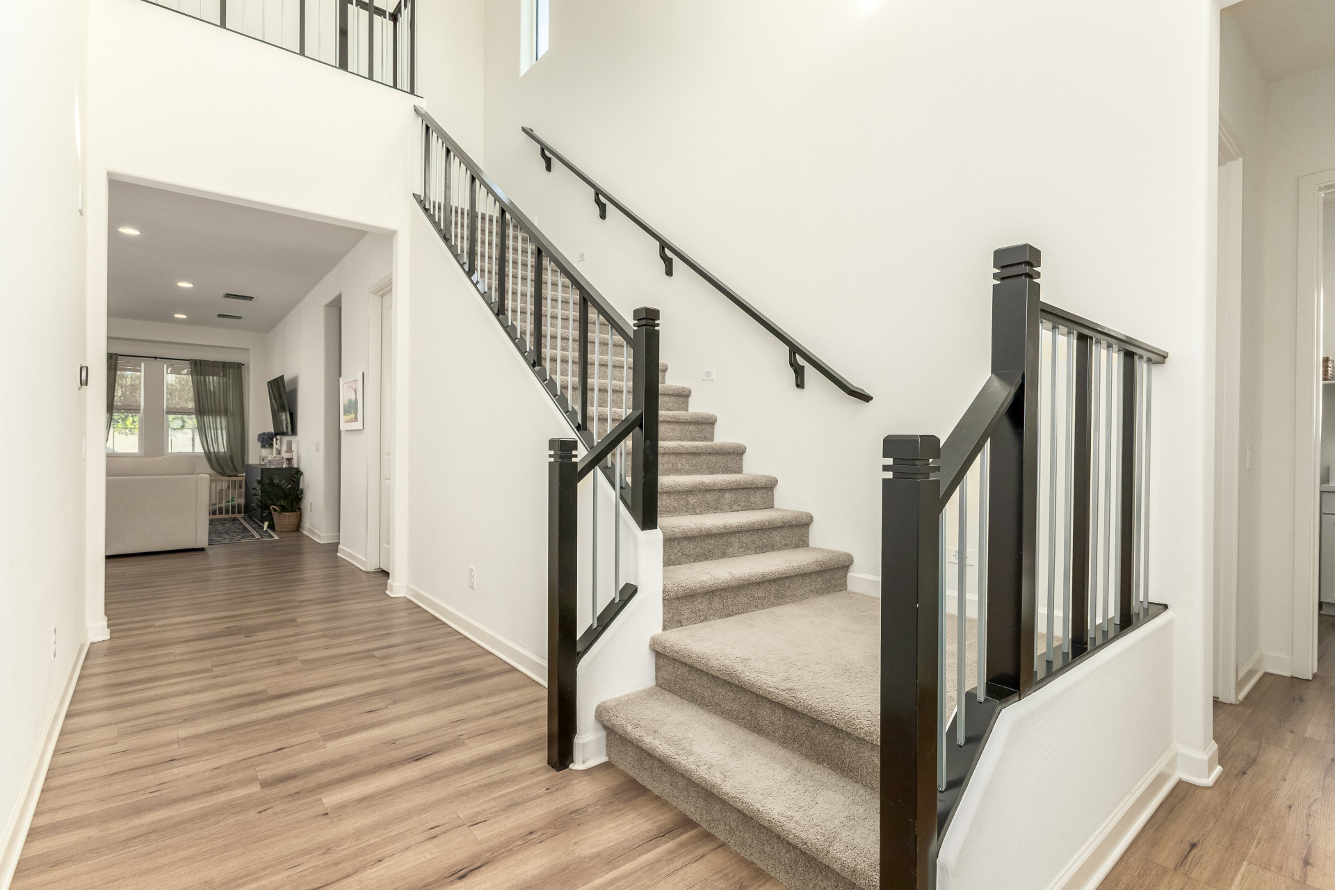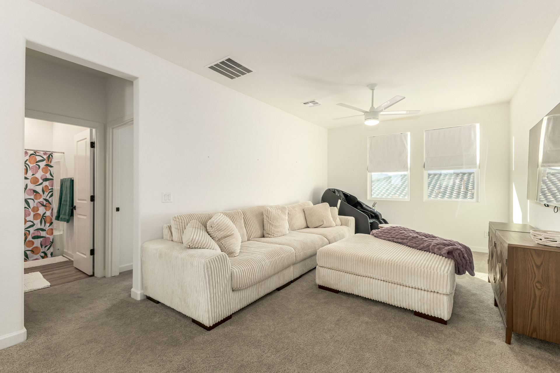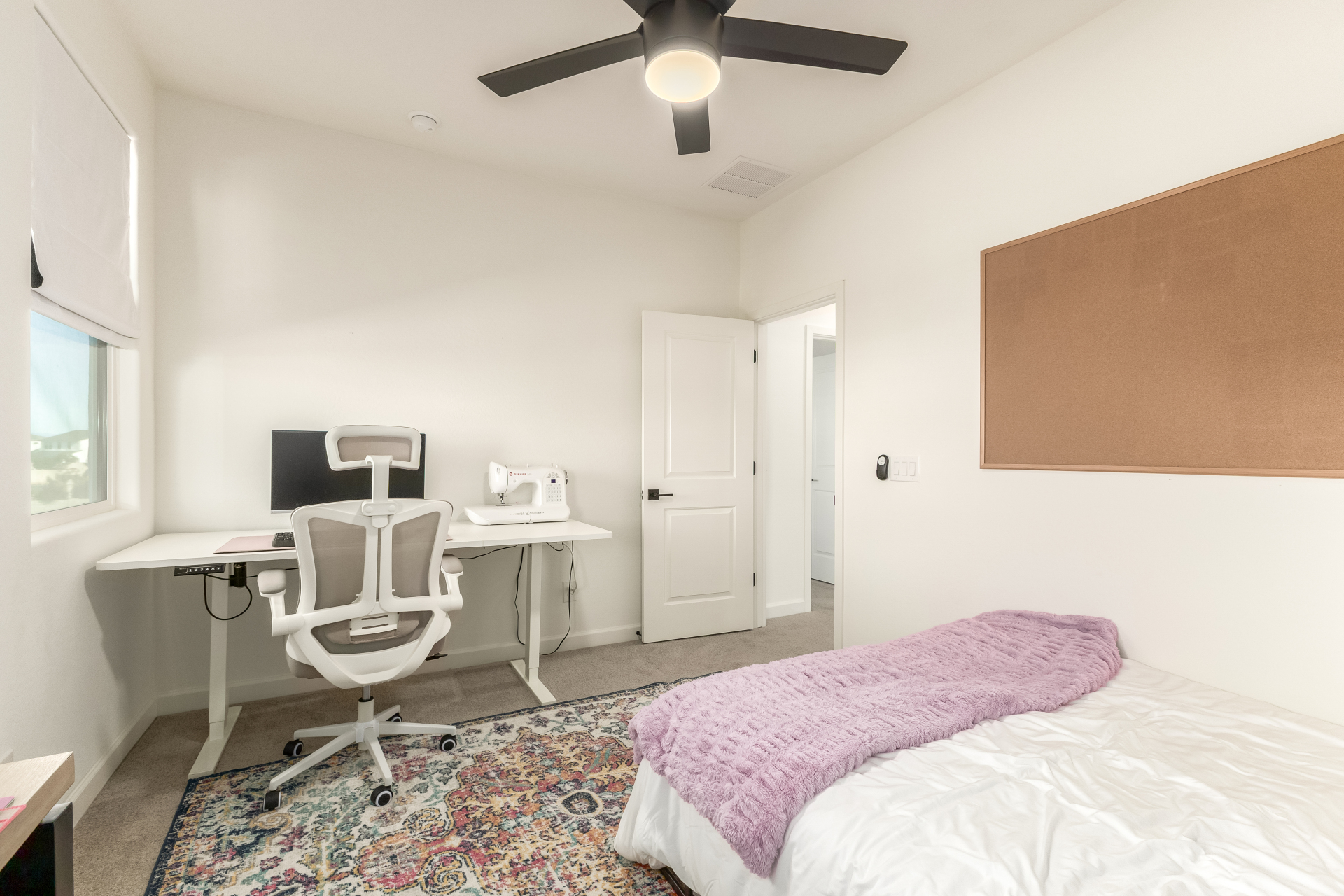 You don't want to miss this stunning 2-story gem with a 3-car garage with EV charger! The 3rd car which is separate is set up as a gym also has AC! Inside, gorgeous wood-look floors flow through a spacious great room designed for both everyday living and entertaining. The sleek kitchen is a showstopper, featuring stainless steel appliances with double wall ovens, quartz countertops, abundant white cabinetry, a center island with breakfast bar, and a walk-in pantry. The downstairs primary retreat offers a private bath with dual sinks and a generous walk-in closet. Also downstairs is a bedroom and full bathroom great for guests. Upstairs the versatile loft is ideal for a media center, while an additional cozy nook works perfectly as a home office or creative studio with built in desk.