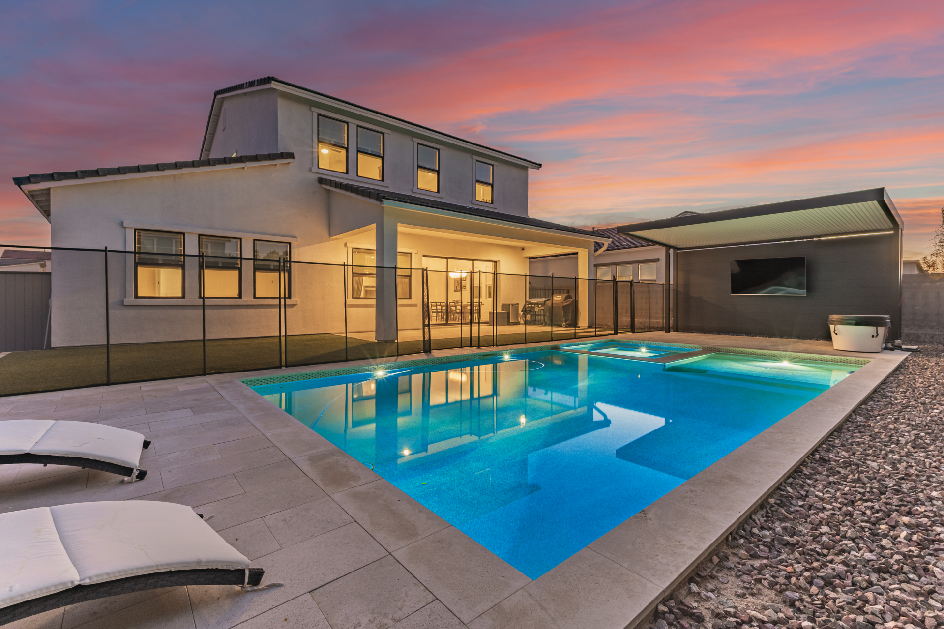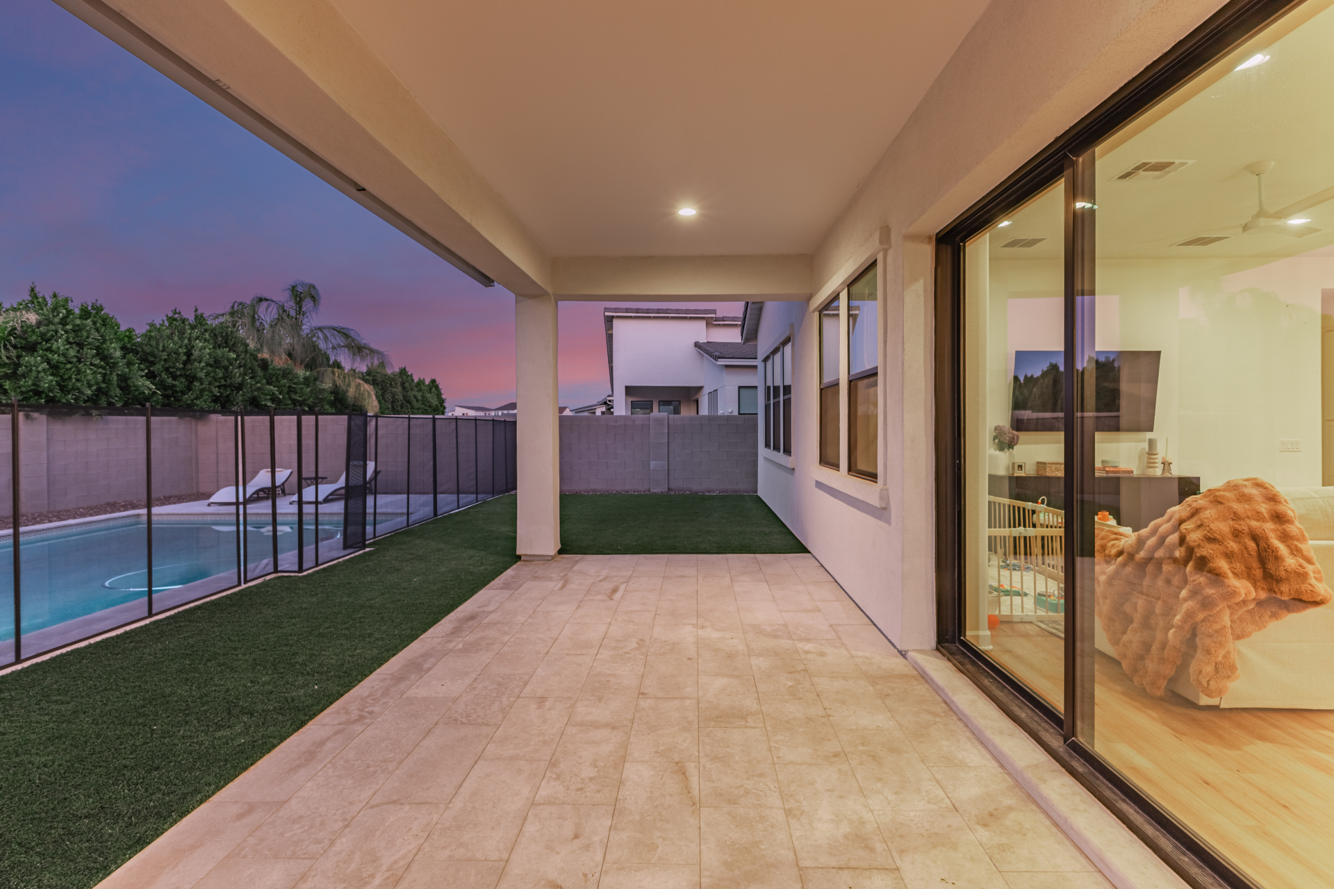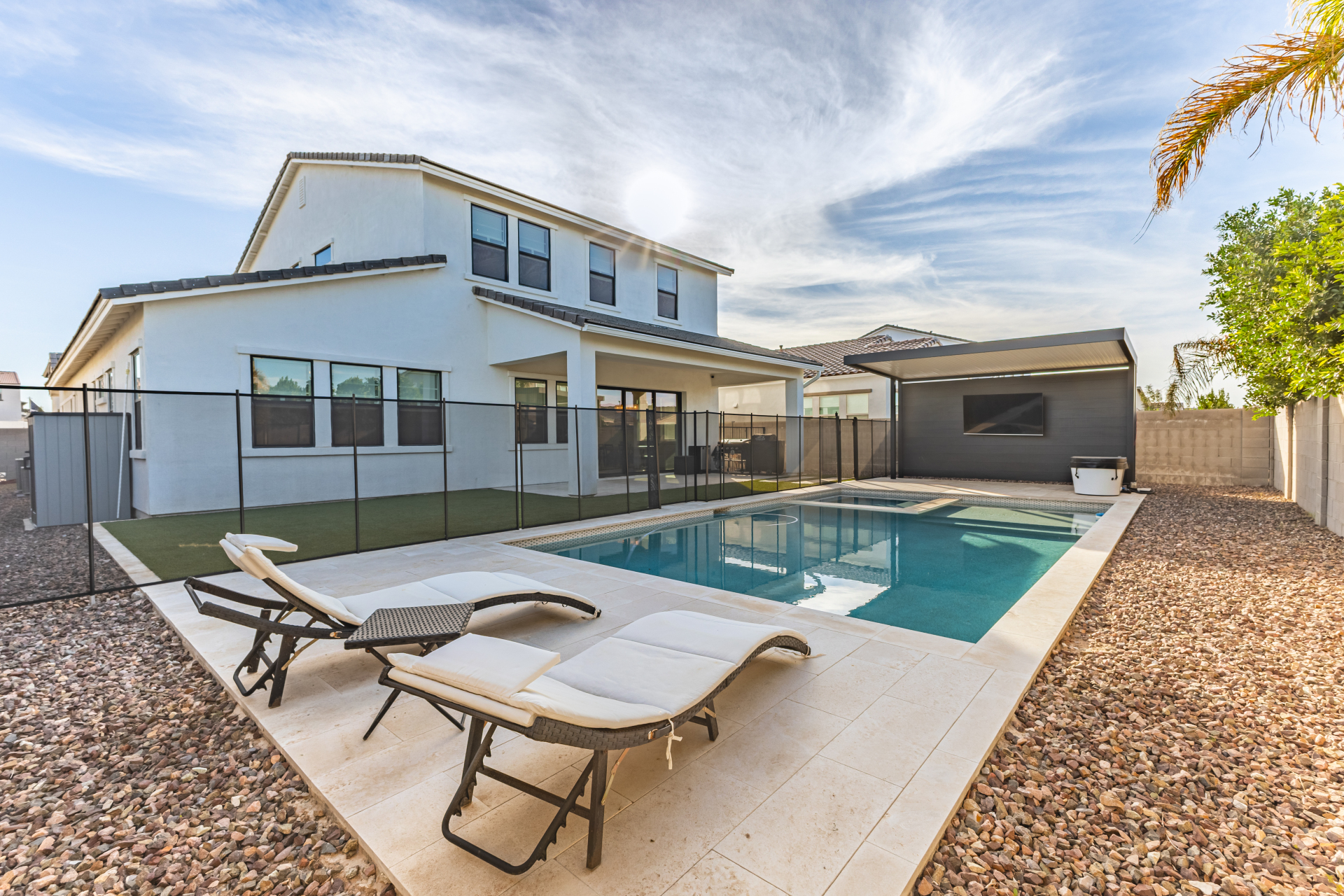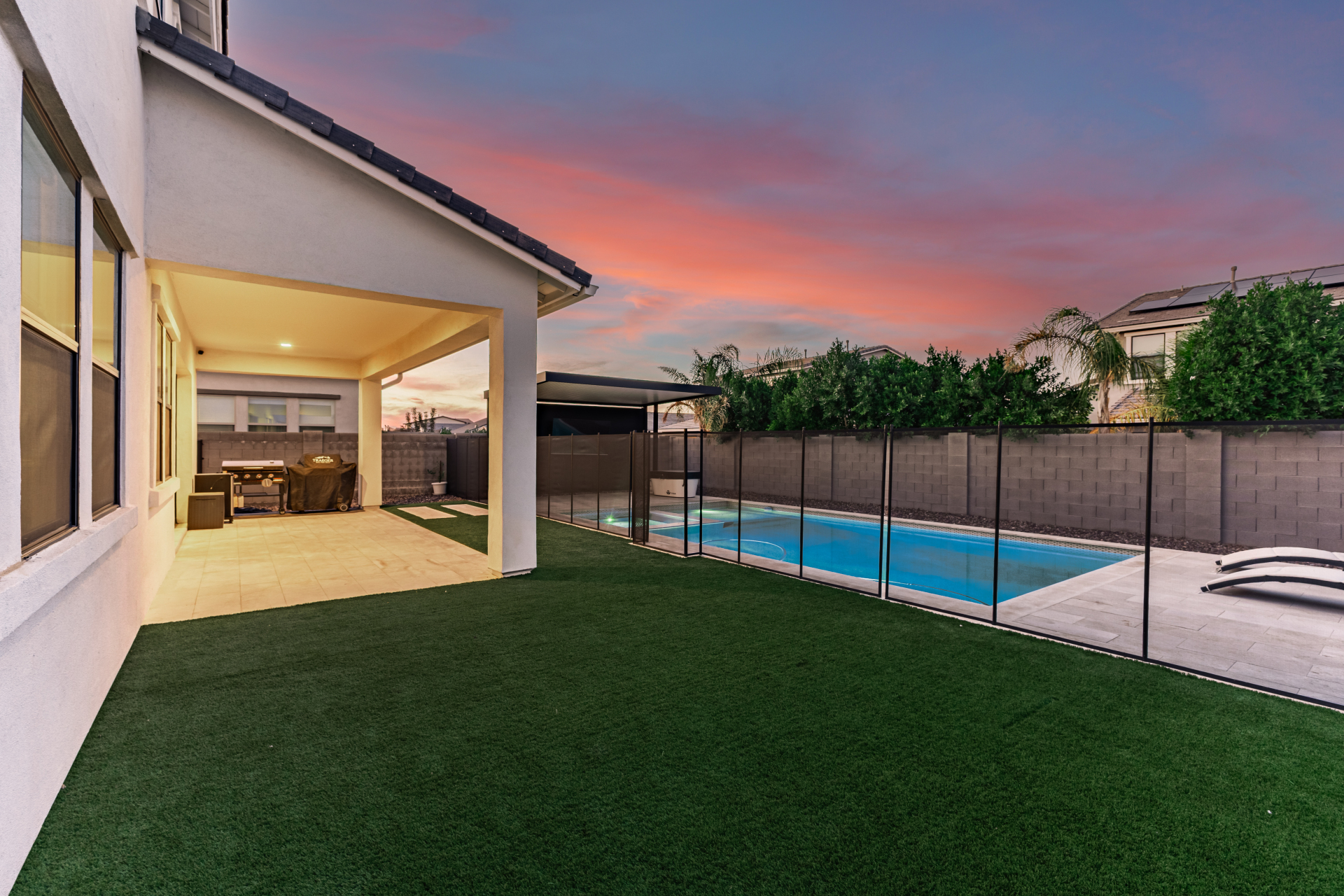 Six rooms all together and 4 baths one being a half bath for visitors so 3 full bathrooms. Out back, unwind under the covered patio, enjoy the low-maintenance artificial turf, timeless travertine, and cool off in the fenced-in pool.