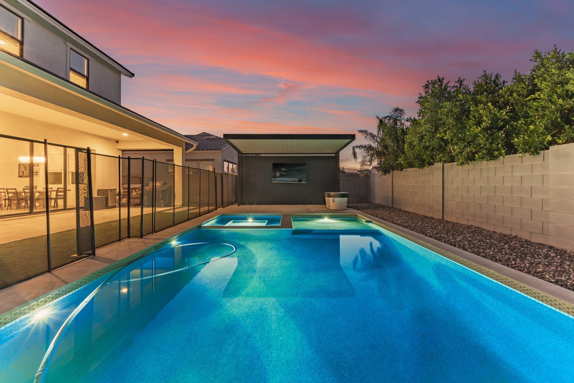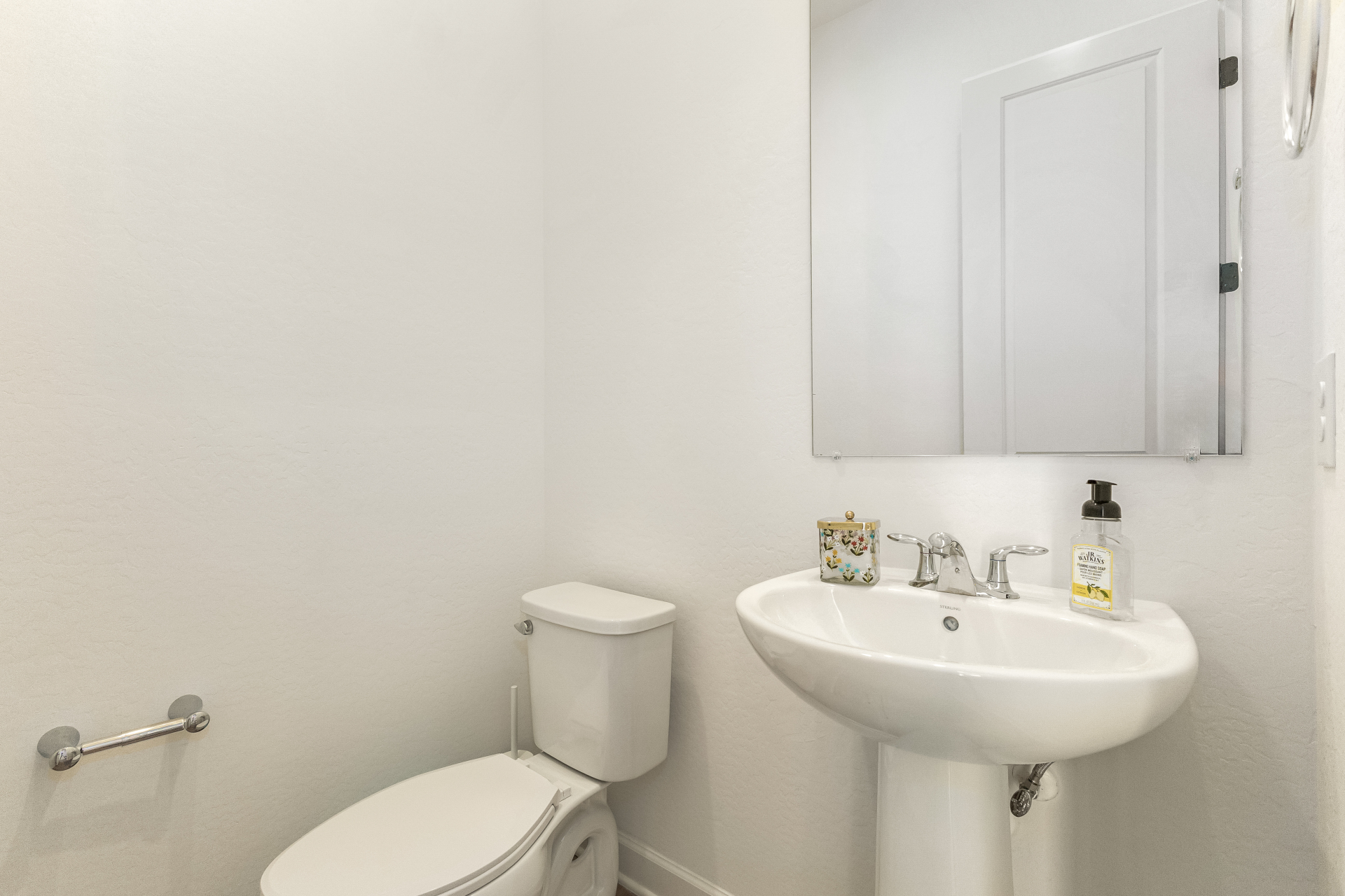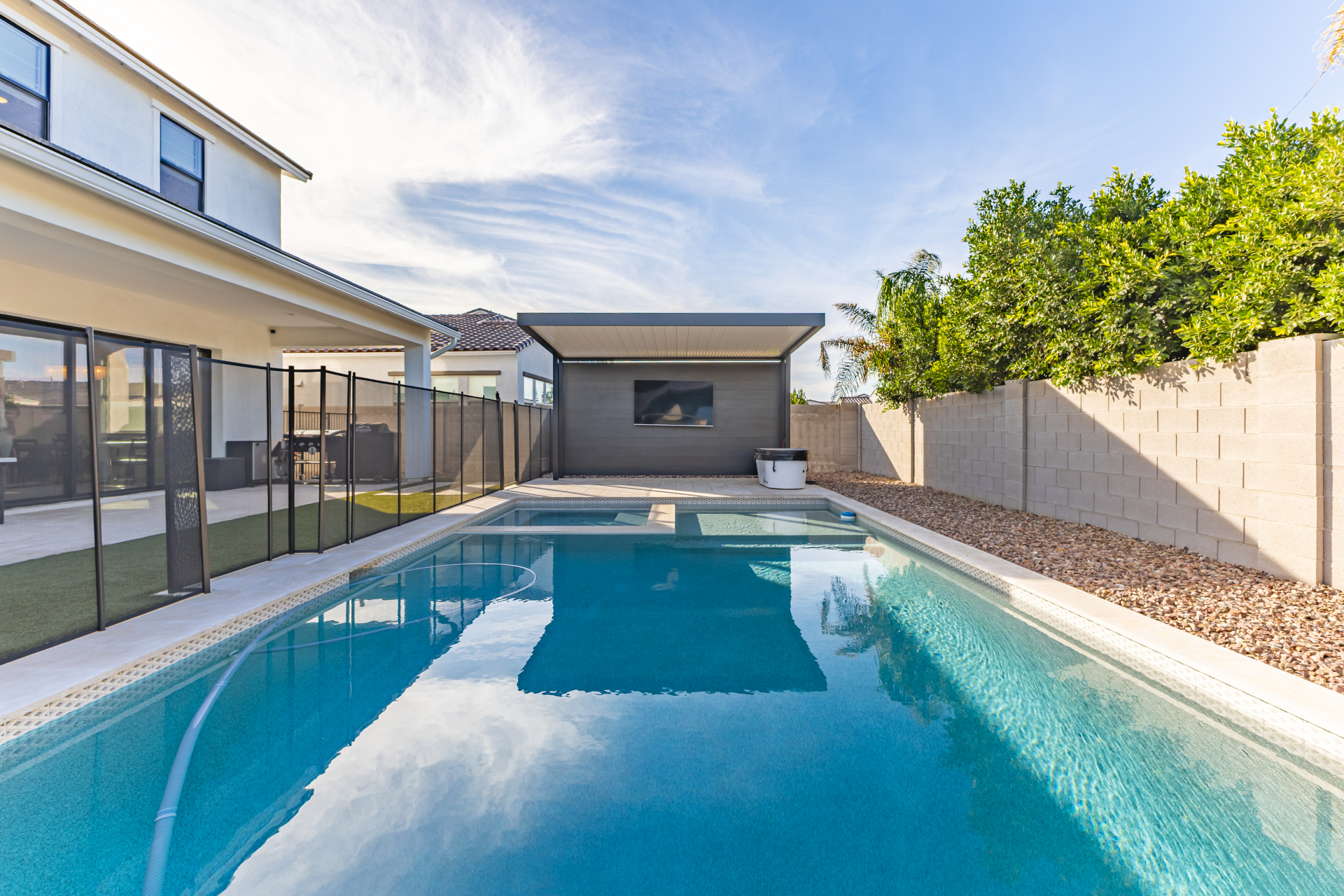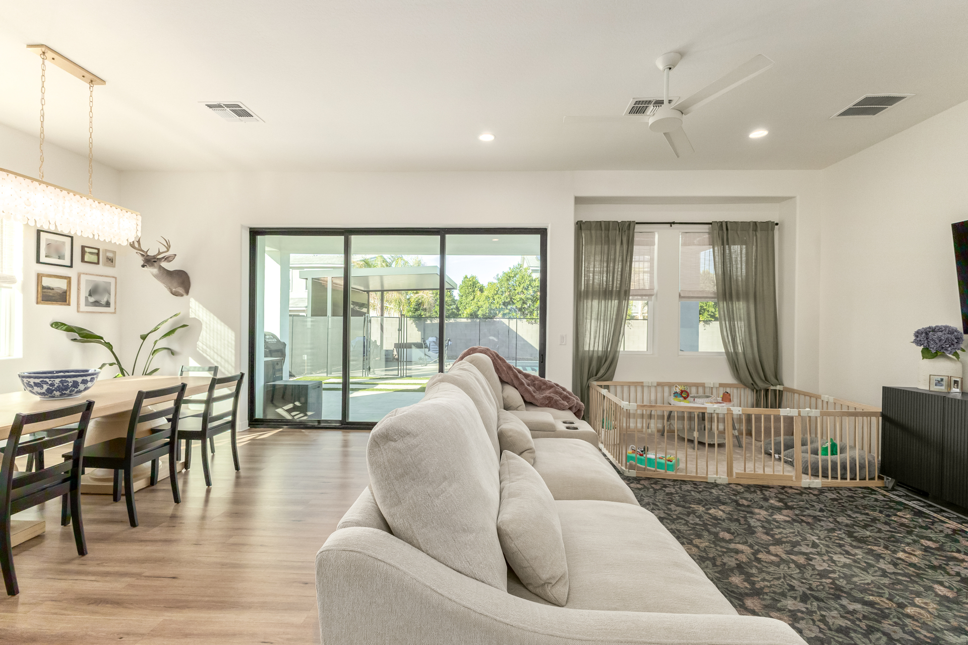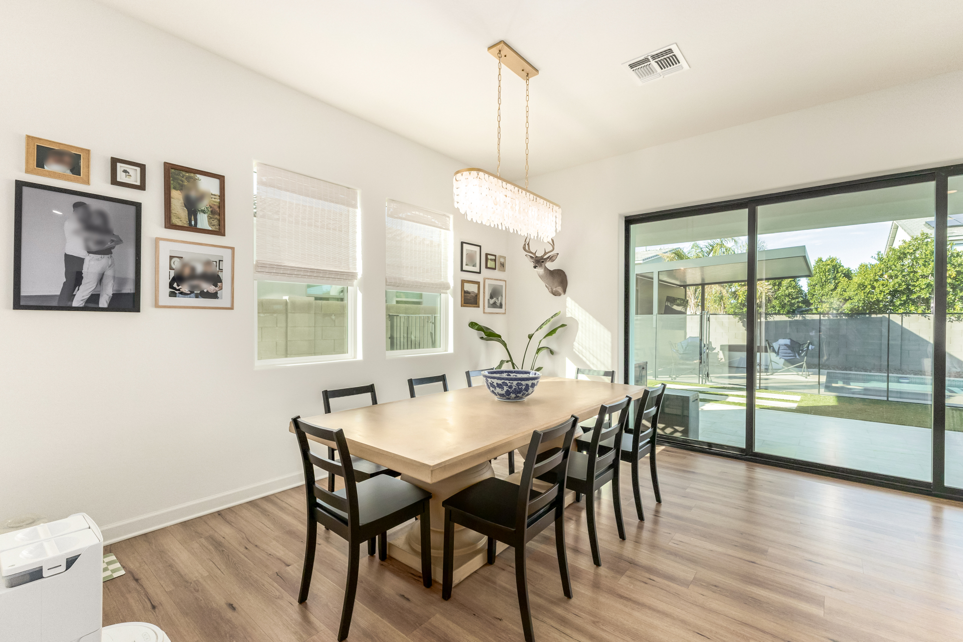 Six rooms all together and 4 baths one being a half bath for visitors so 3 full bathrooms. Out back, unwind under the covered patio, enjoy the low-maintenance artificial turf, timeless travertine, and cool off in the fenced-in pool.