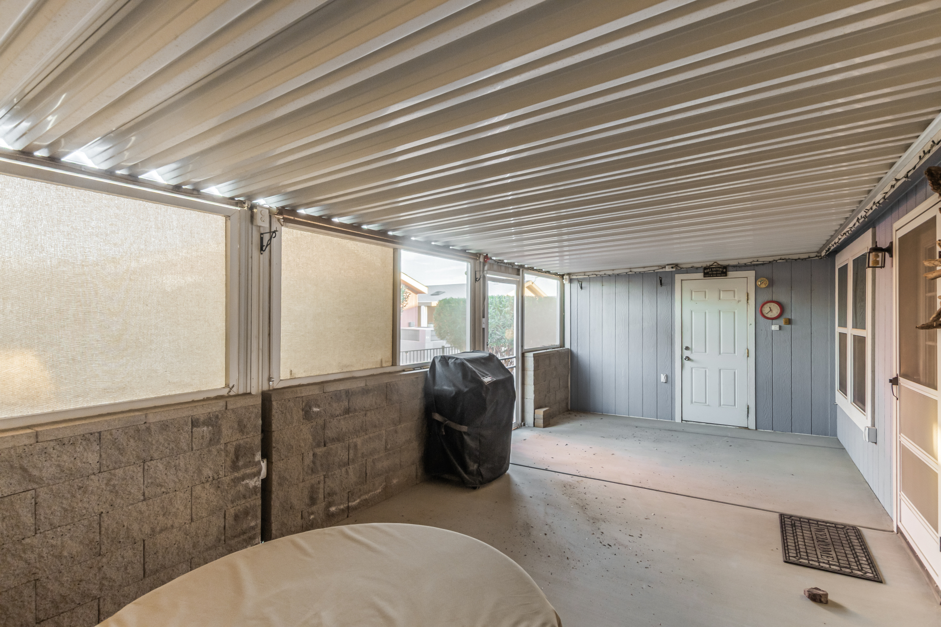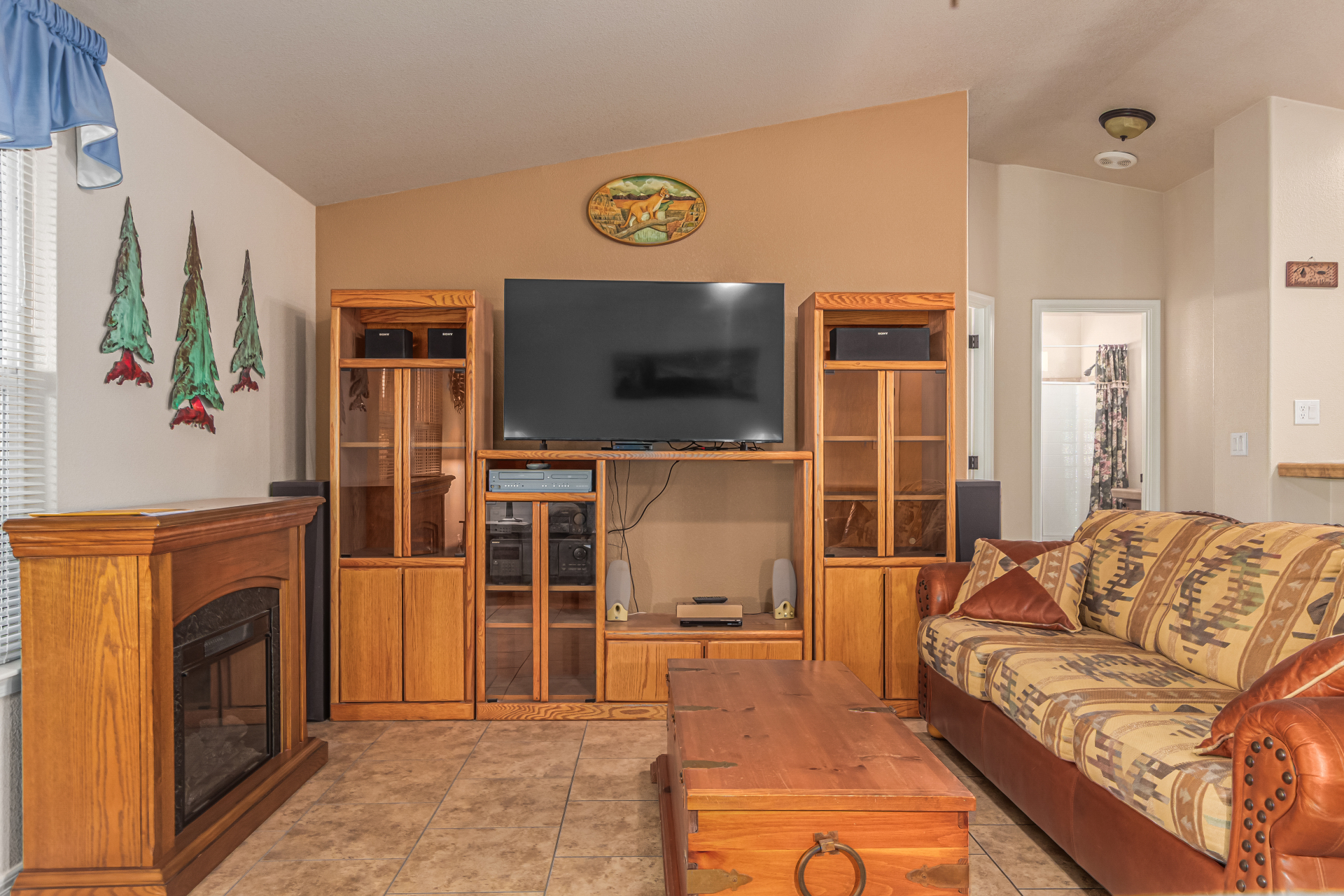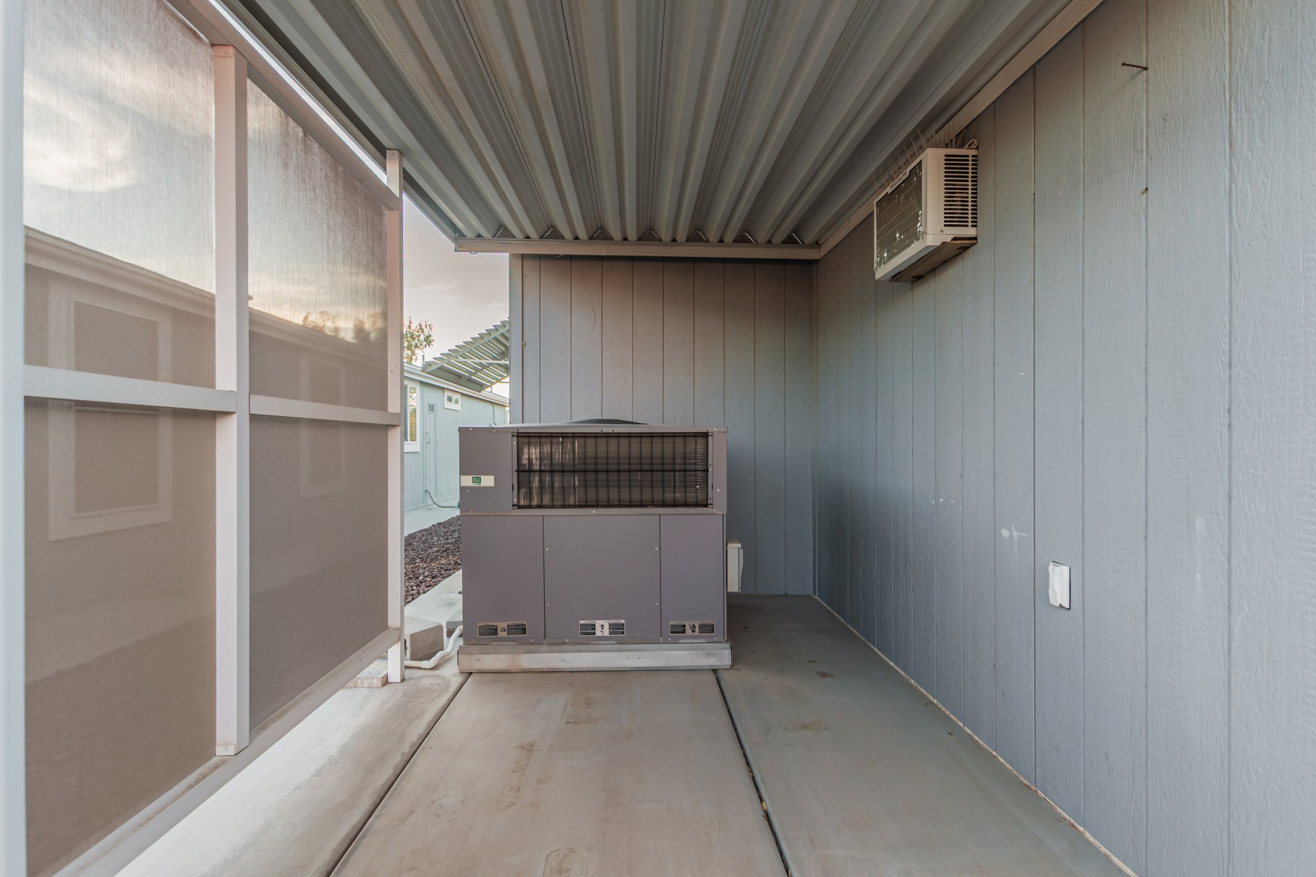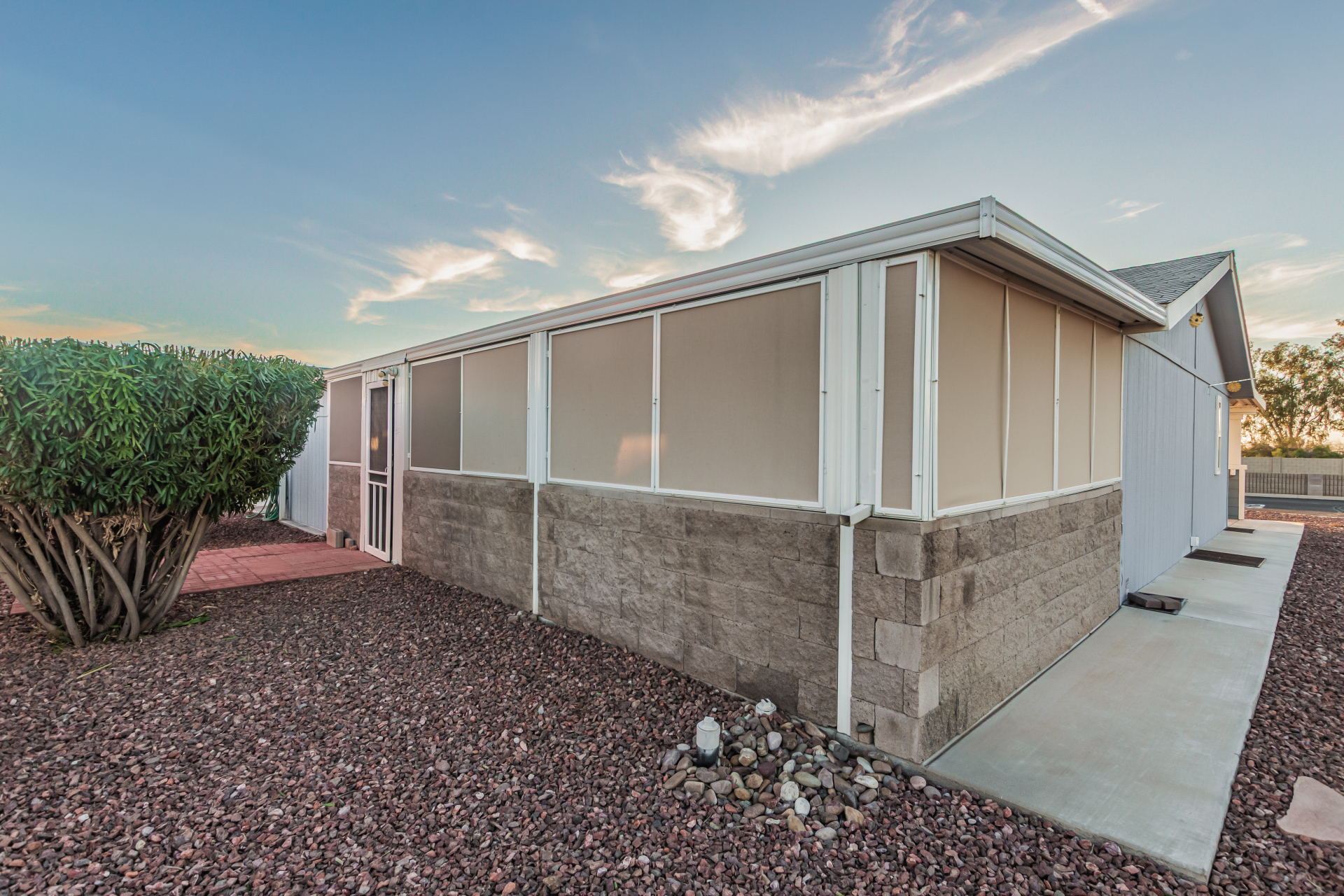 Welcome to this lovely 2-bedroom mobile home! Offering convenient carport parking and a cozy front porch. Inside, you'll find a spacious layout with tile flooring, vaulted ceilings, and an earthy palette that creates a warm and comfortable ambiance. The well-appointed kitchen boasts cabinets adorned with crown molding, ample counter space, and built-in appliances for a seamless cooking experience. Enjoy a good rest in the main bedroom, complete with a bathroom with double vanities and a walk-in closet. The screened-in patio is perfect for entertaining and relaxation. Out back, you'll have a covered patio perfect for morning coffee and a space for storage/workshop. Check it out before it's too late!
