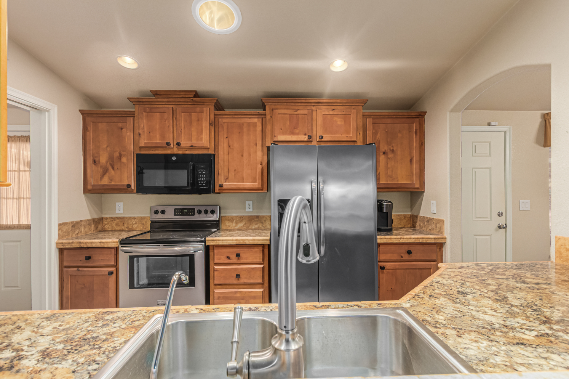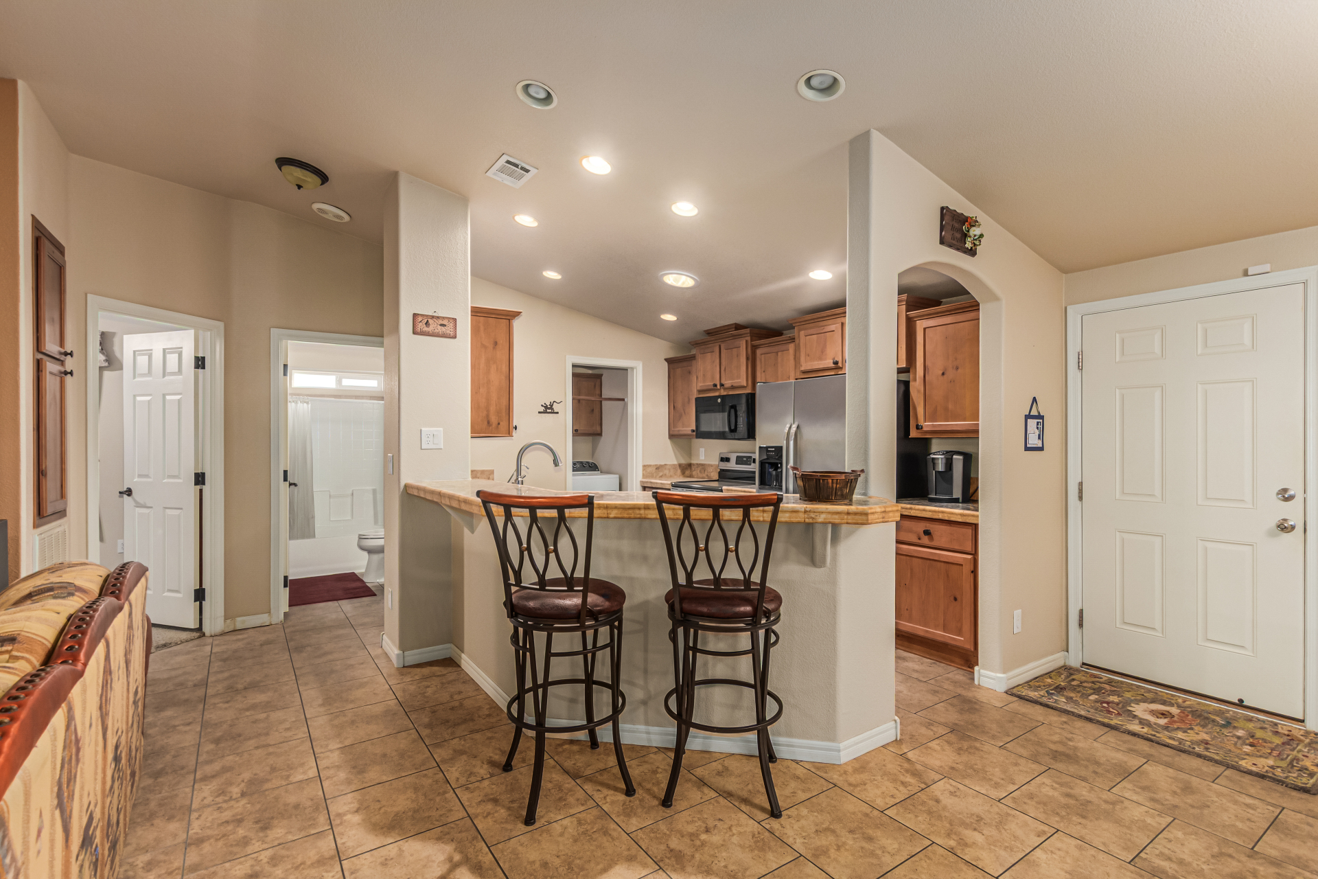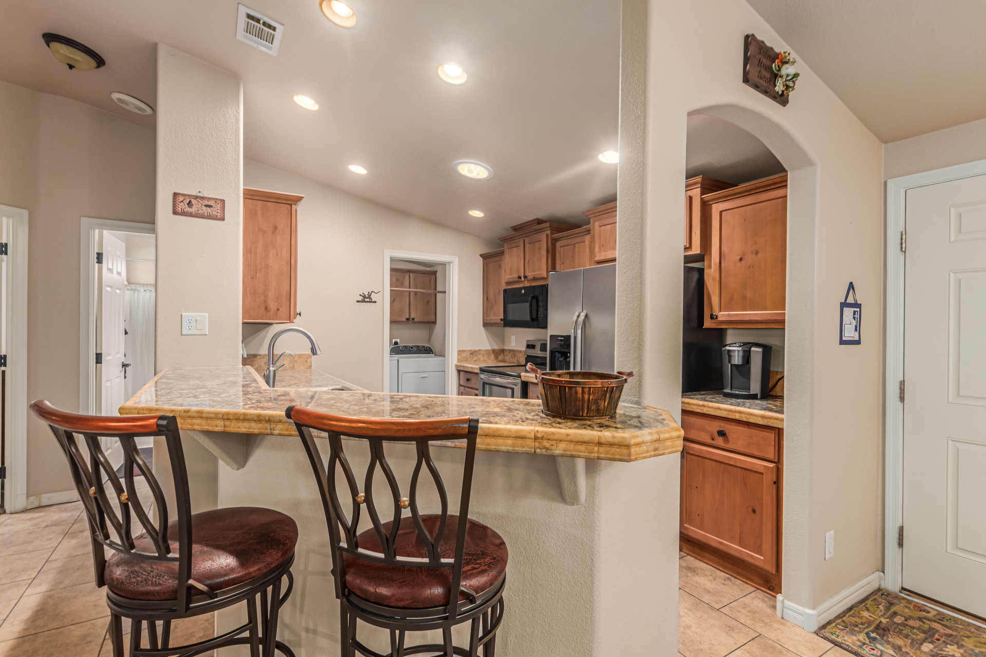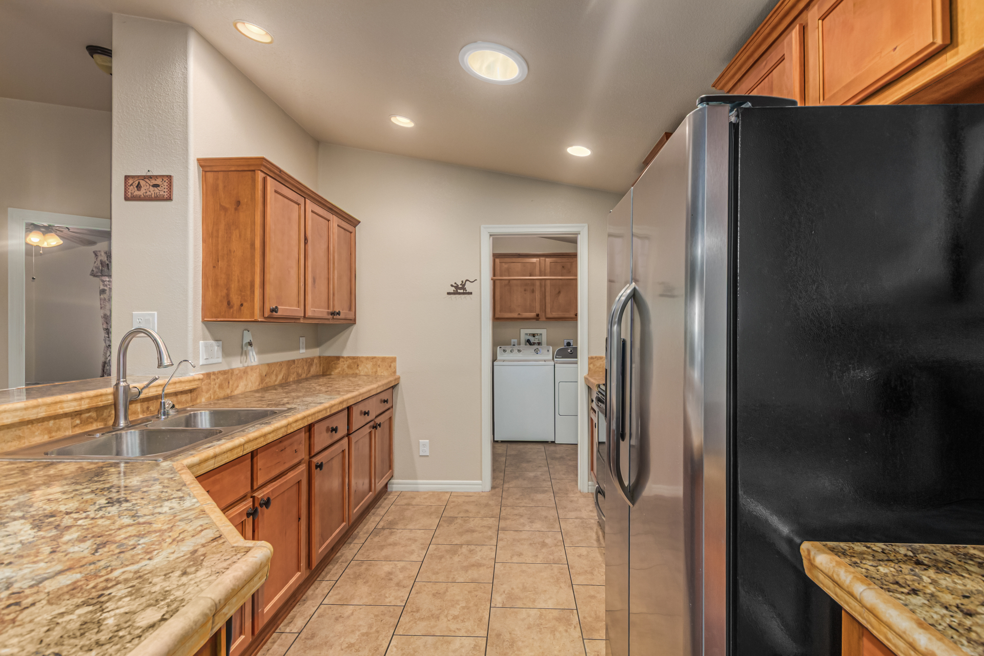 Welcome to this lovely 2-bedroom mobile home! Offering convenient carport parking and a cozy front porch. Inside, you'll find a spacious layout with tile flooring, vaulted ceilings, and an earthy palette that creates a warm and comfortable ambiance. The well-appointed kitchen boasts cabinets adorned with crown molding, ample counter space, and built-in appliances for a seamless cooking experience. Enjoy a good rest in the main bedroom, complete with a bathroom with double vanities and a walk-in closet. The screened-in patio is perfect for entertaining and relaxation. Out back, you'll have a covered patio perfect for morning coffee and a space for storage/workshop. Check it out before it's too late!