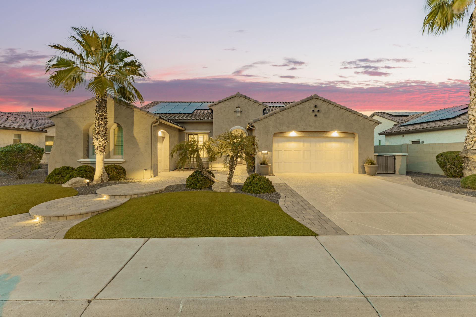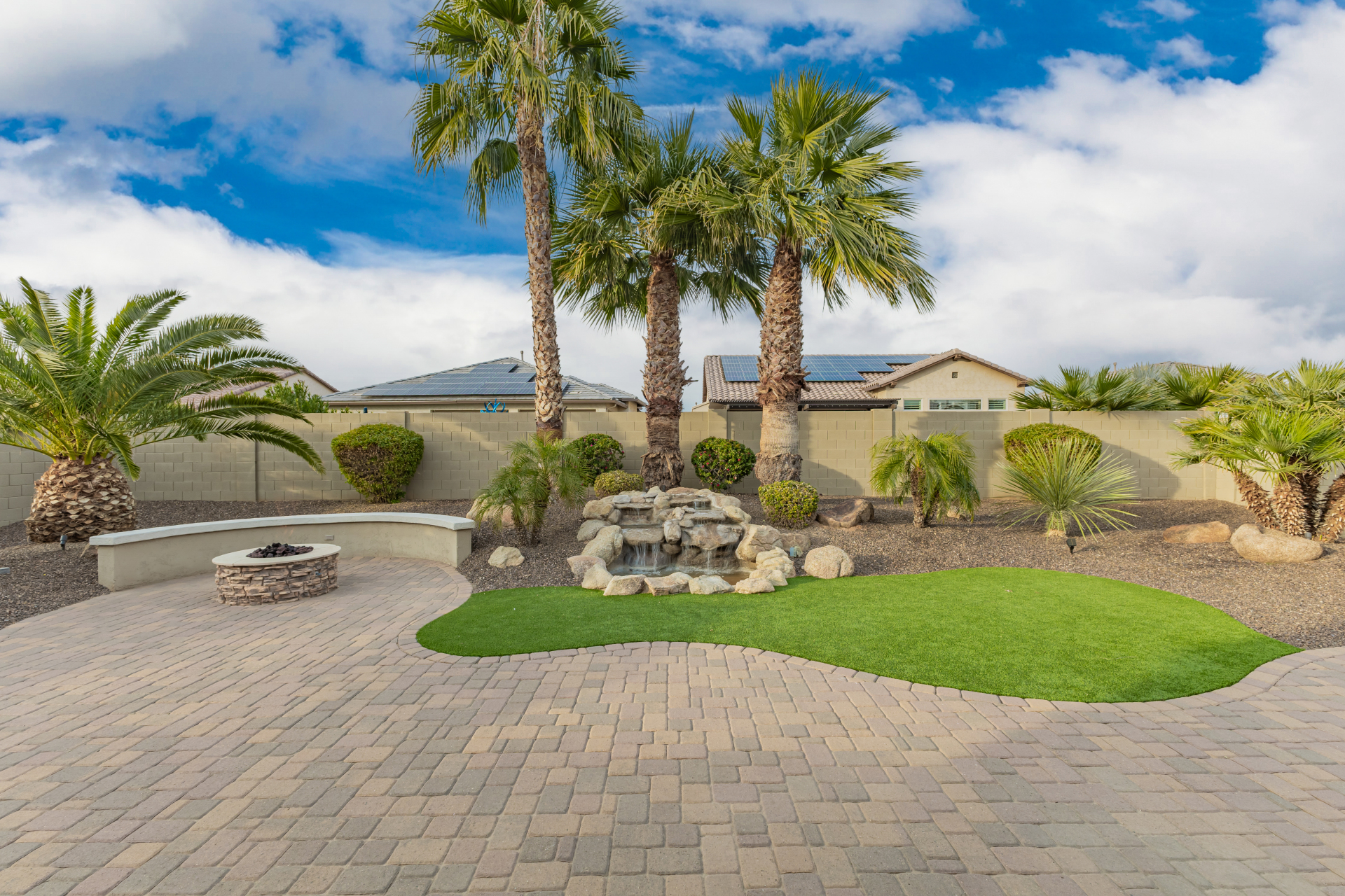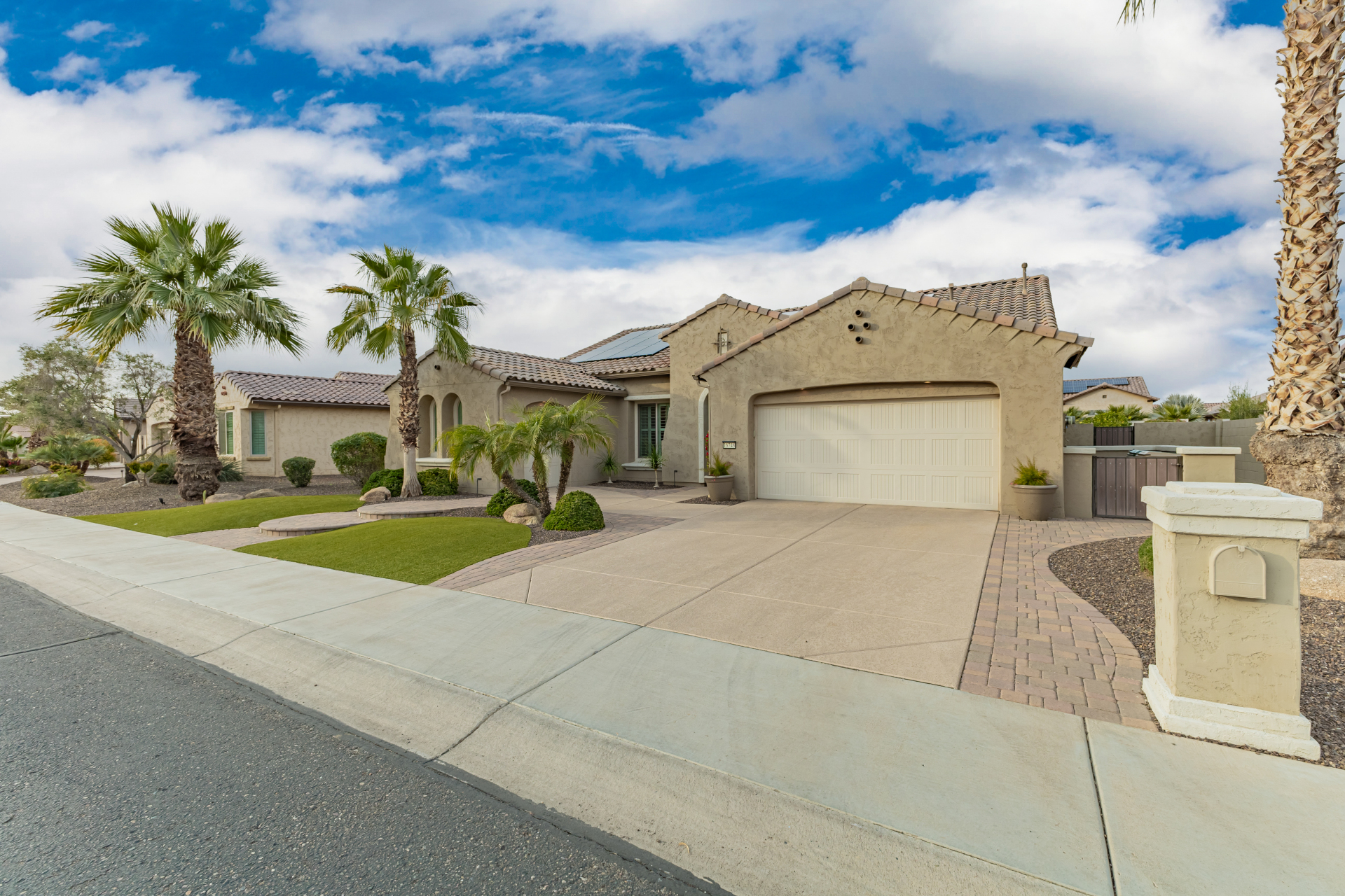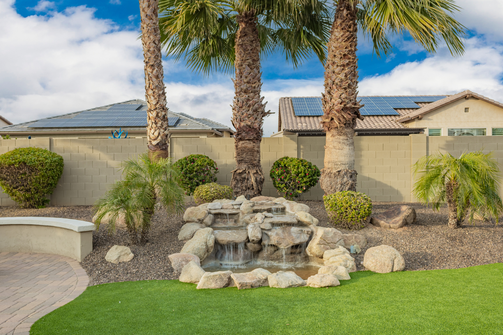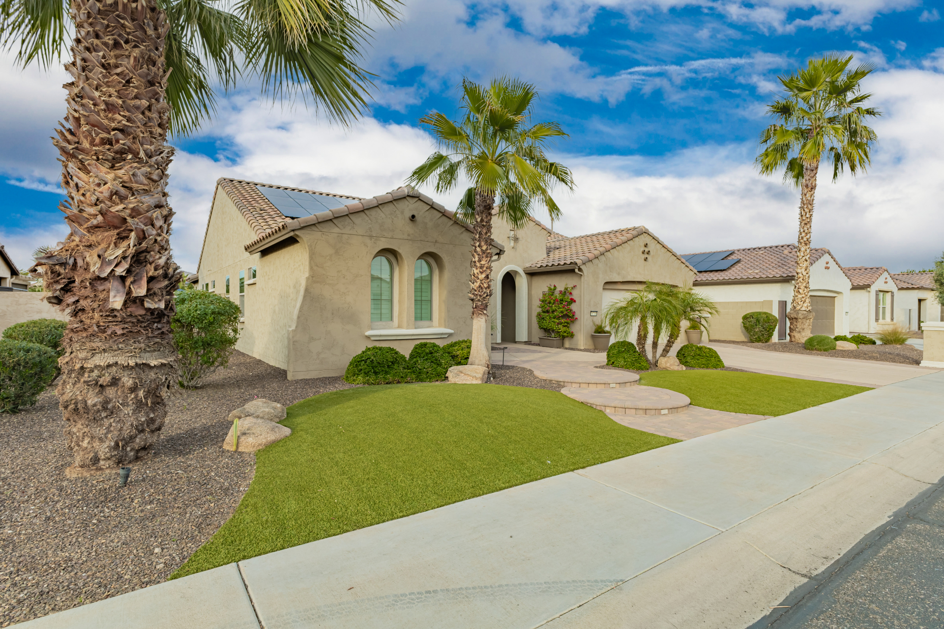 Welcome to this beautifully adorned, meticulously maintained home in PebbleCreek Golf Community. NEW Tesla Inverter and Solar Panels!! This extended Treviso model has it all! The gorgeous professional front landscape leads to the warmth of the front foyer to the open living area which allows you to take in the resort style back yard. A gourmet kitchen with large island, walk in pantry, & extended eat in kitchen makes entertaining family and friends easy! The spacious floor plan boasts 24'' tile floors throughout, Plantation Shutters, custom stacked stone feature wall with surround sound throughout the home, custom espresso kitchen cabinets with mosaic tile black splash, GE Monogram gas cook top, new refrigerator & more. Additional features include the newer garage cabinetry, epoxy garage floors, addt'l overhead storage & extended garages! OWNED SOLAR is another PLUS! Enjoy the professionally landscaped PRIVATE back yard, boasting a large covered patio with cobblestone pavers, serene rock waterfall.