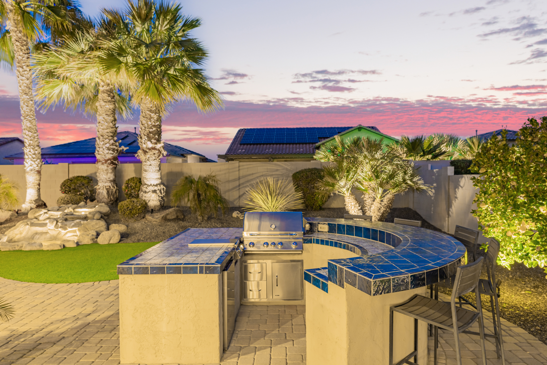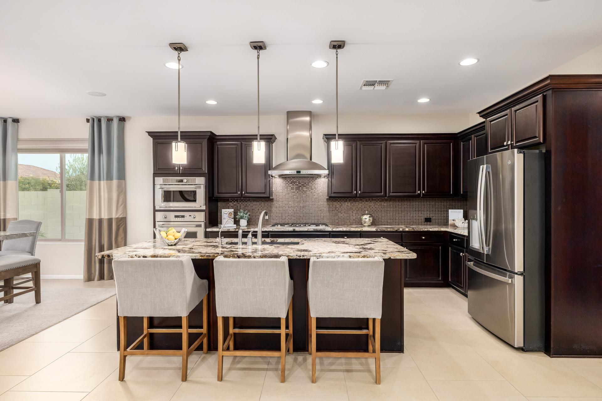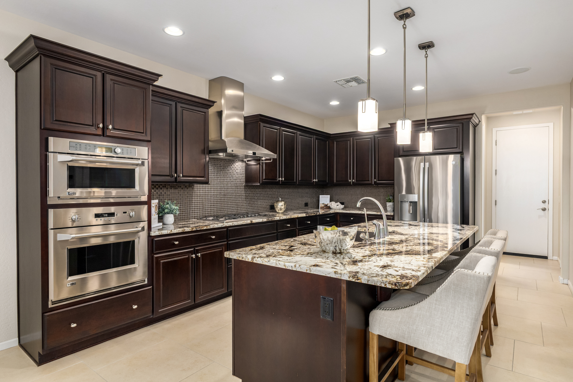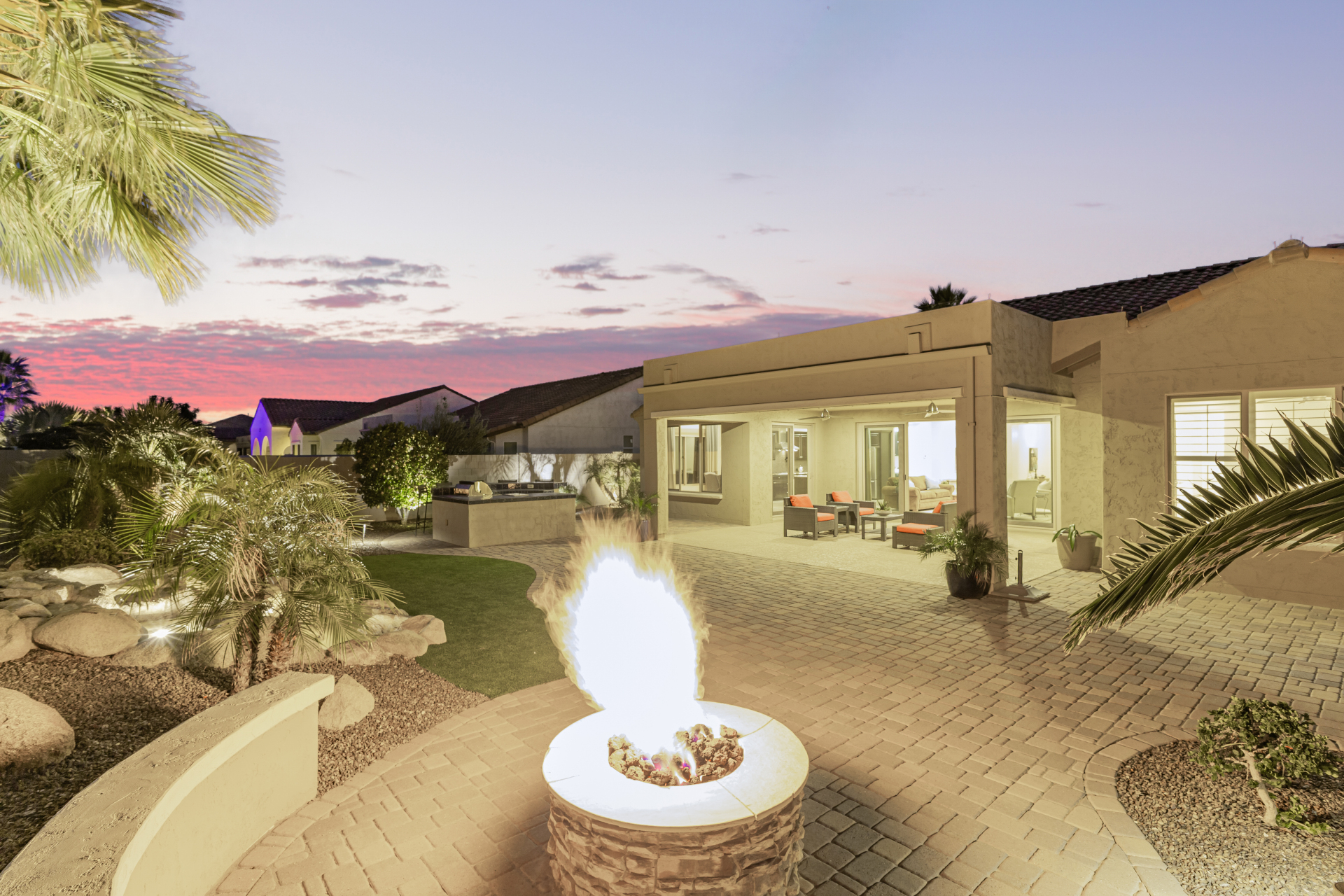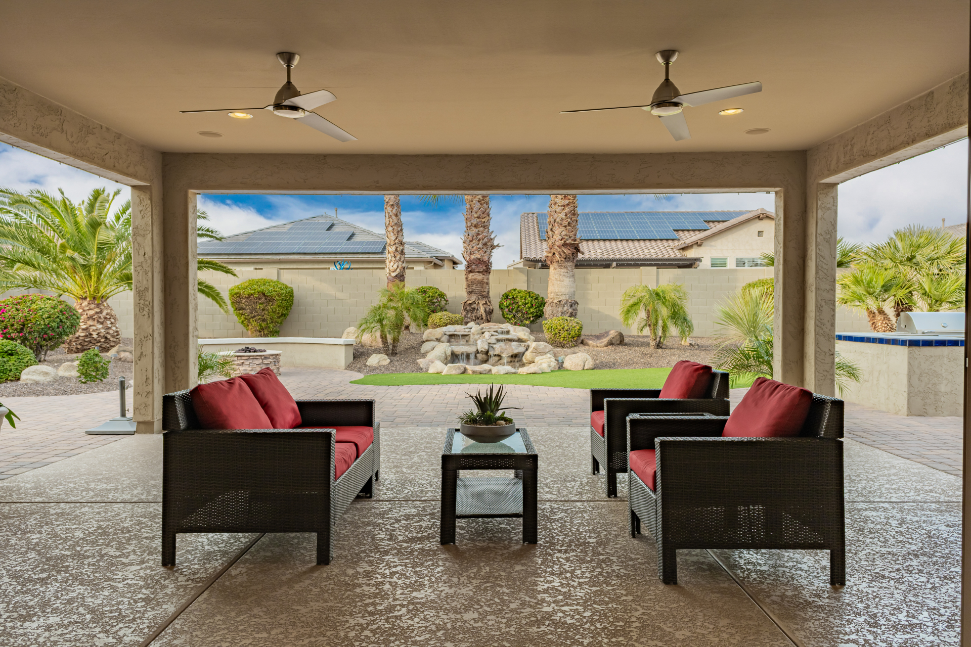 Welcome to this beautifully adorned, meticulously maintained home in PebbleCreek Golf Community. NEW Tesla Inverter and Solar Panels!! This extended Treviso model has it all! The gorgeous professional front landscape leads to the warmth of the front foyer to the open living area which allows you to take in the resort style back yard. A gourmet kitchen with large island, walk in pantry, & extended eat in kitchen makes entertaining family and friends easy! The spacious floor plan boasts 24'' tile floors throughout, Plantation Shutters, custom stacked stone feature wall with surround sound throughout the home, custom espresso kitchen cabinets with mosaic tile black splash, GE Monogram gas cook top, new refrigerator & more. Additional features include the newer garage cabinetry, epoxy garage floors, addt'l overhead storage & extended garages! OWNED SOLAR is another PLUS! Enjoy the professionally landscaped PRIVATE back yard, boasting a large covered patio with cobblestone pavers, serene rock waterfall.